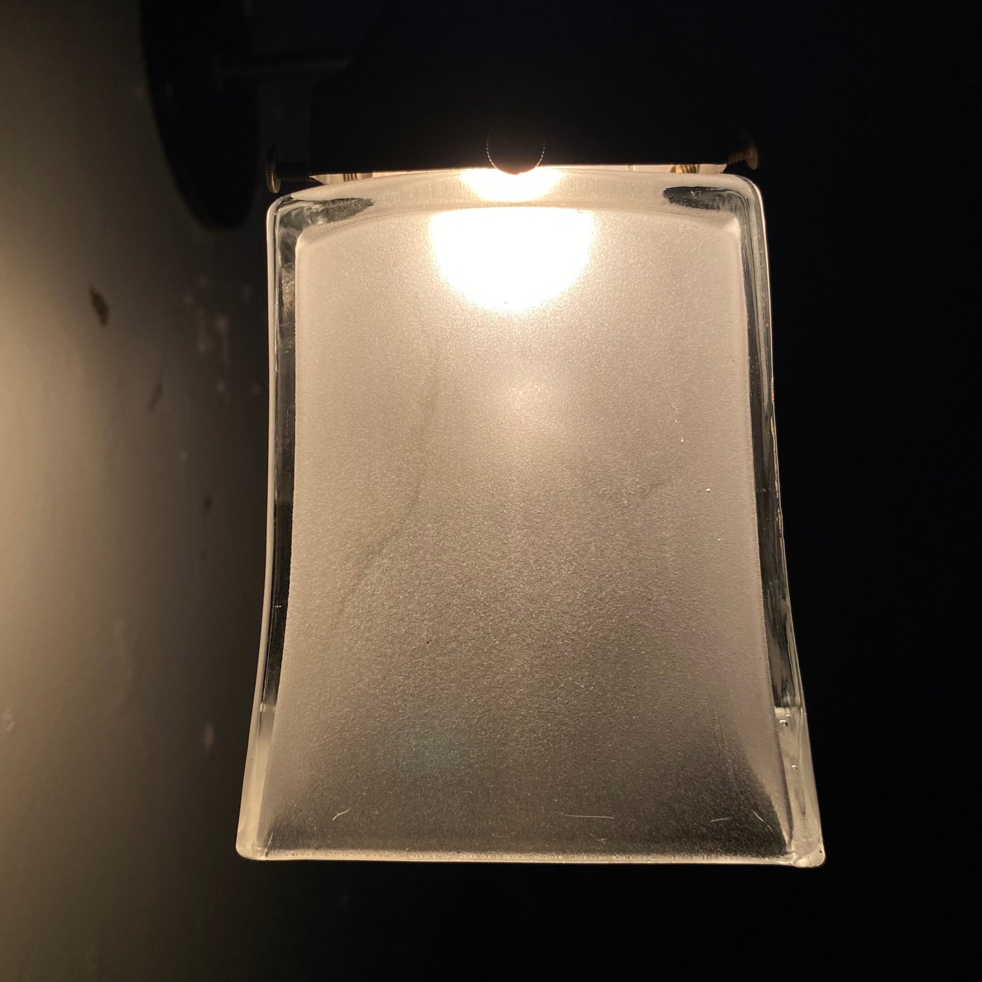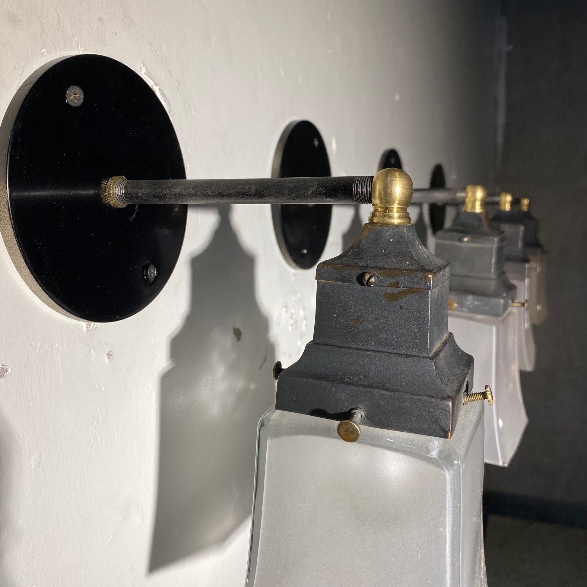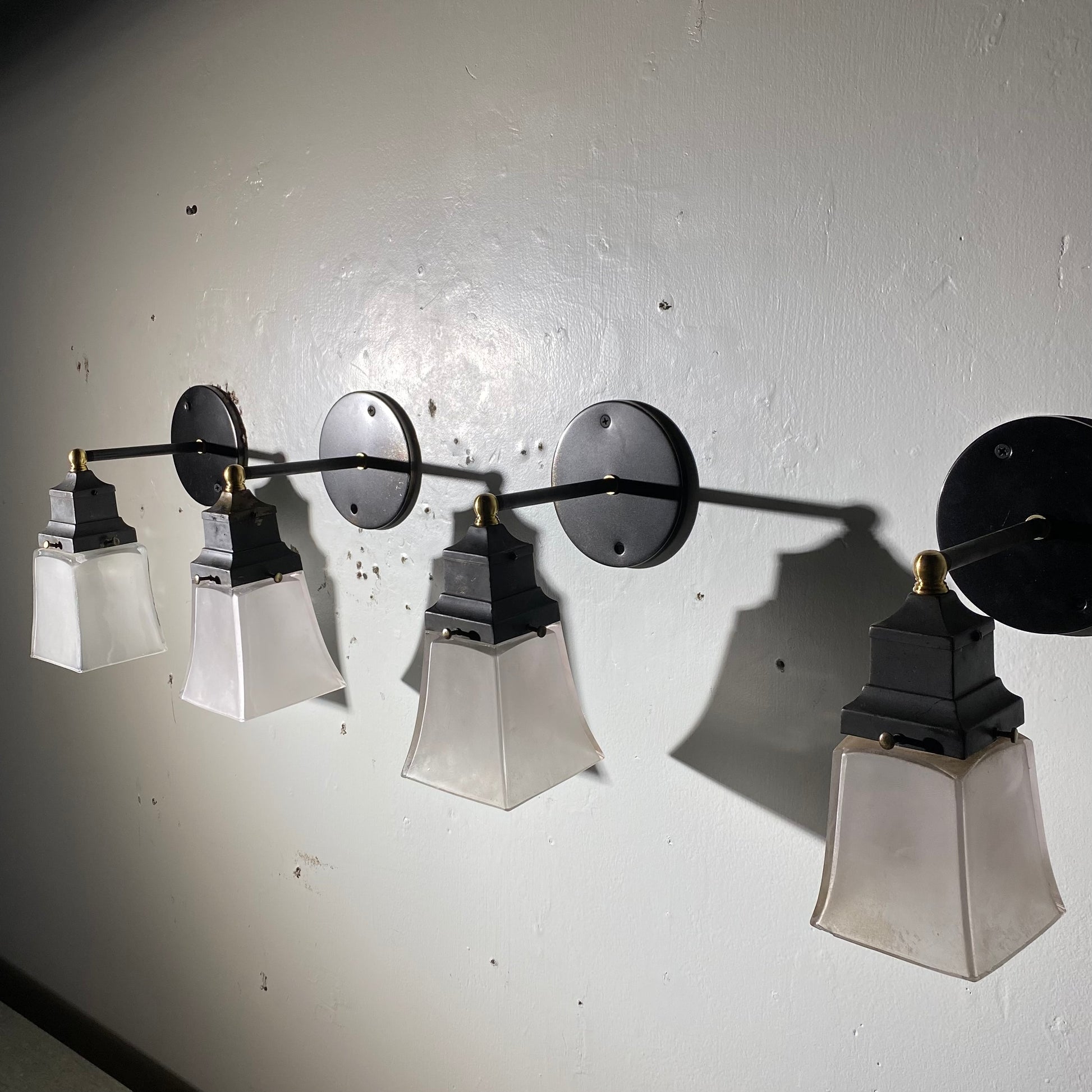 Features Black & Brass details with a frosted glass shade. We have a set of four.