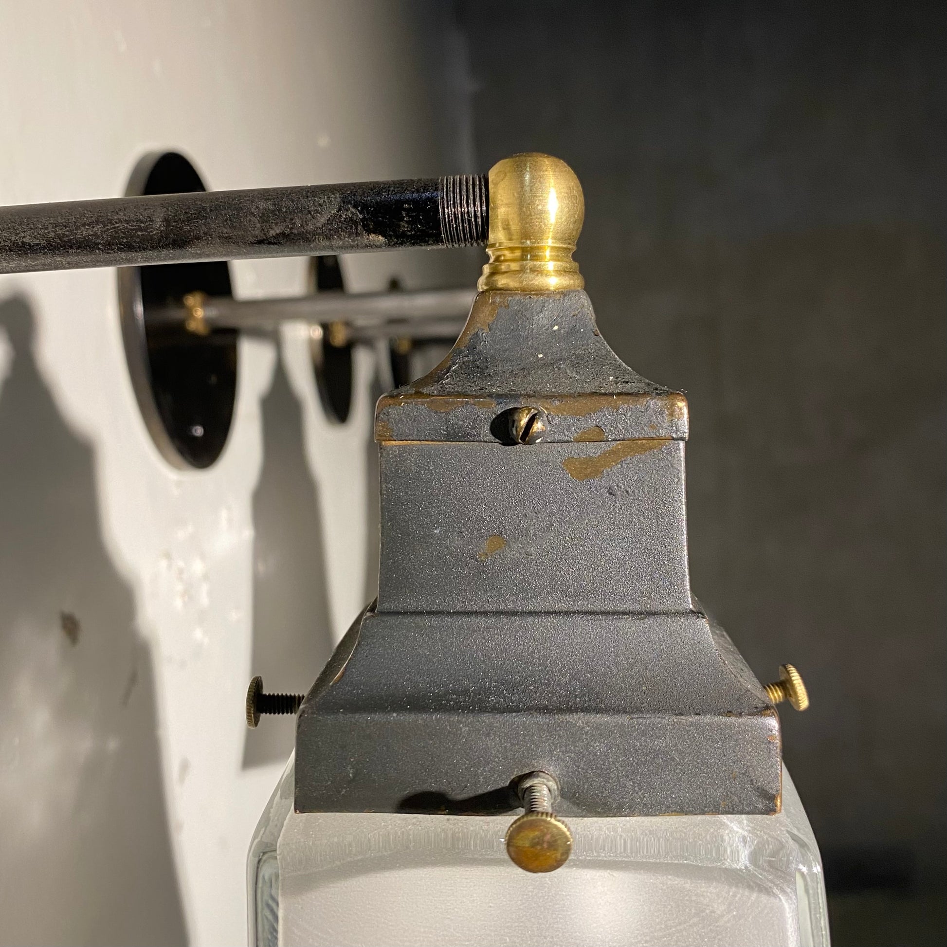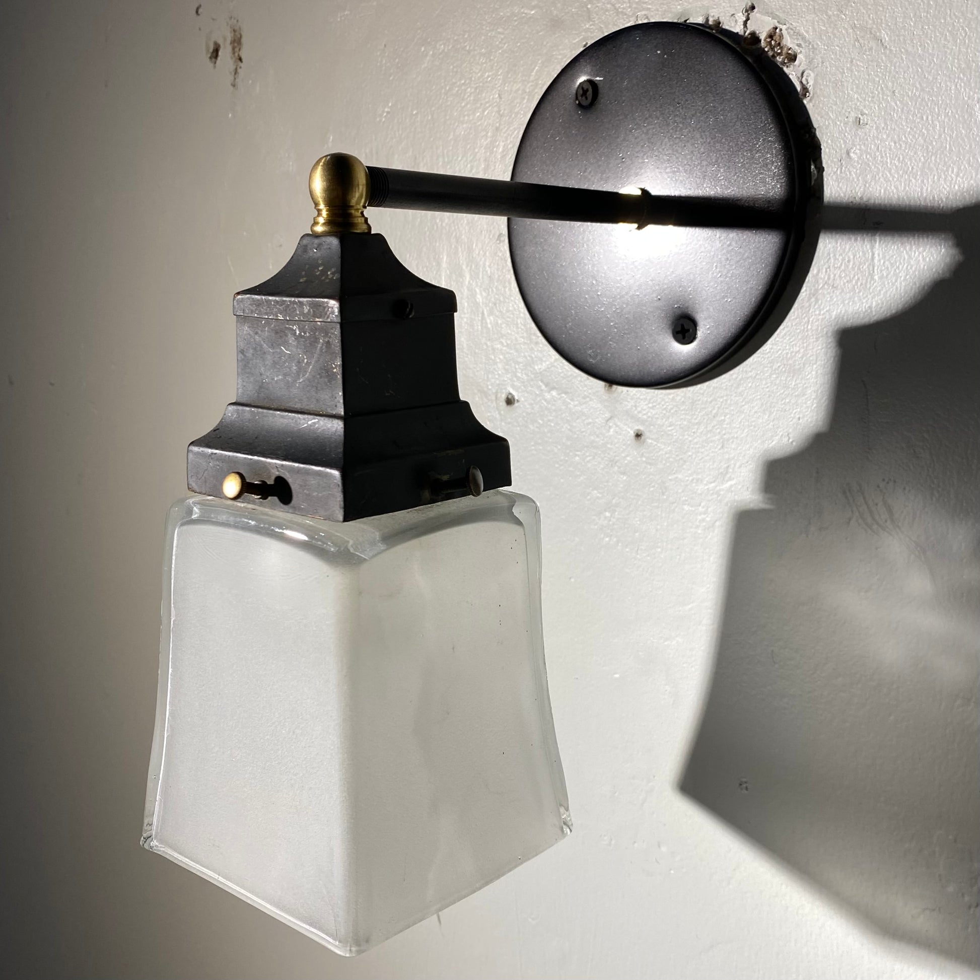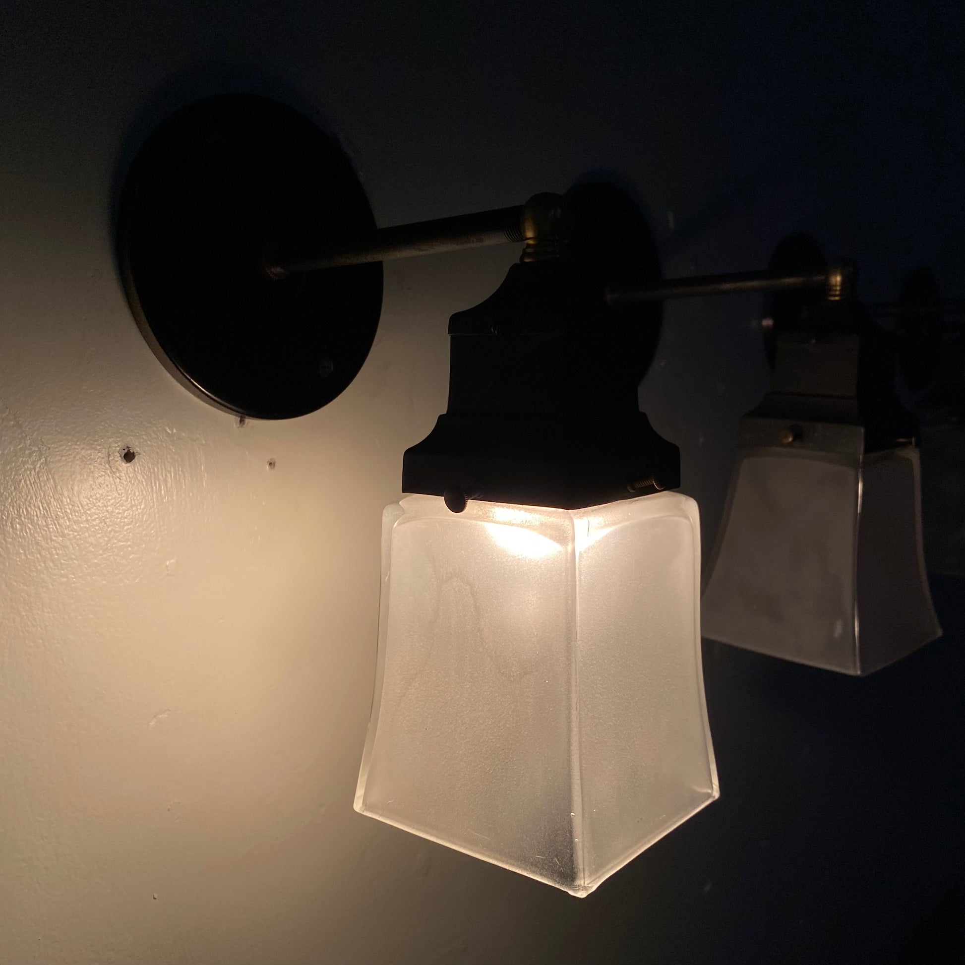Features Black & Brass details with a frosted glass shade. We have a set of four.