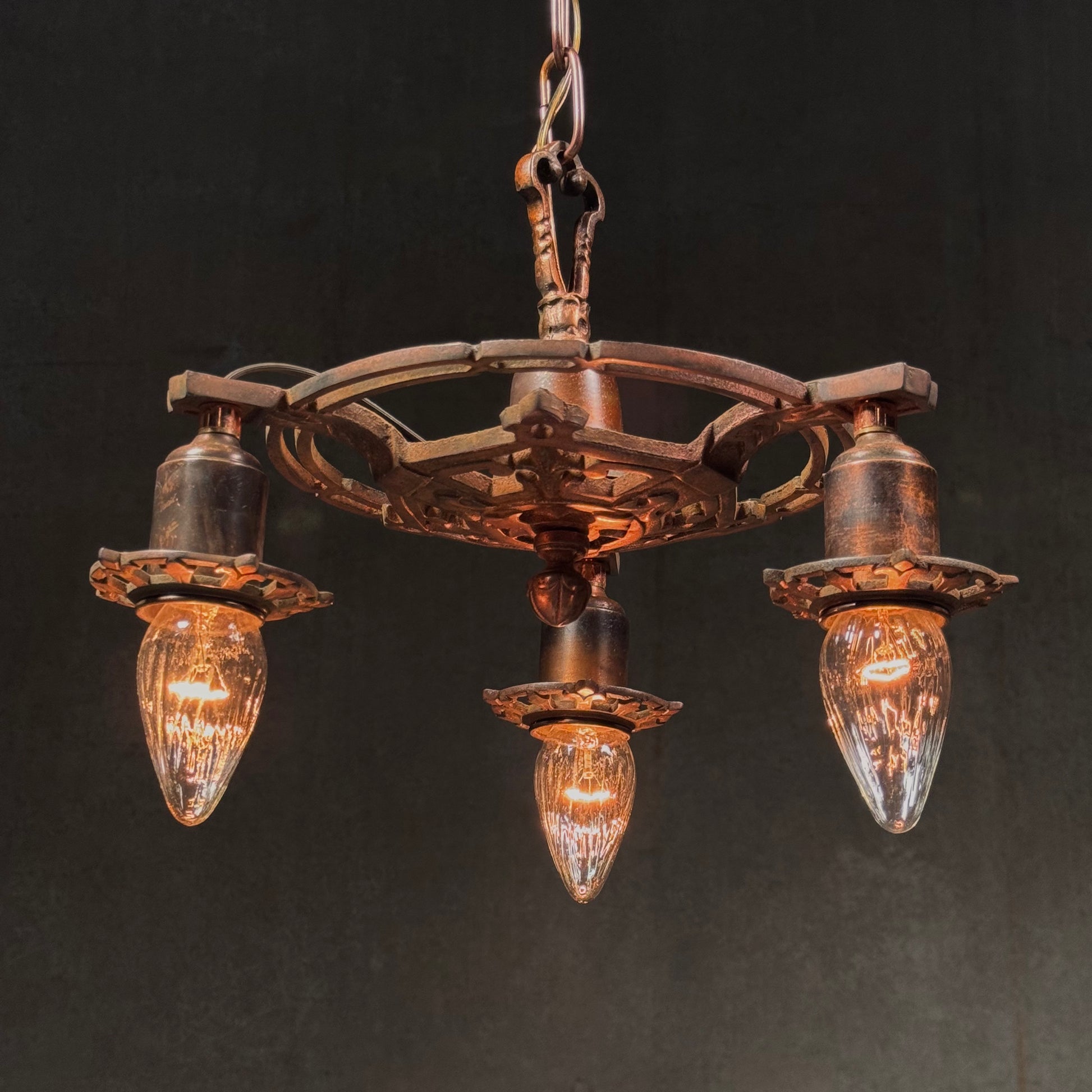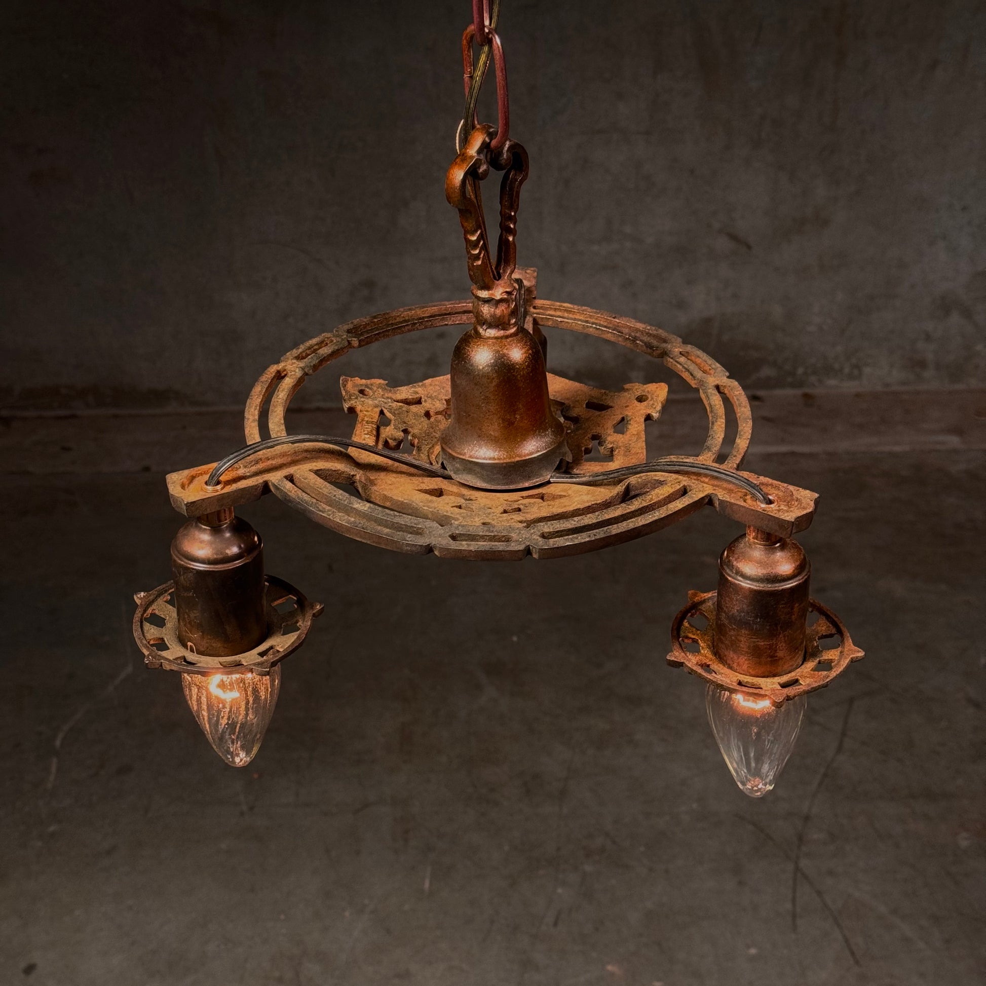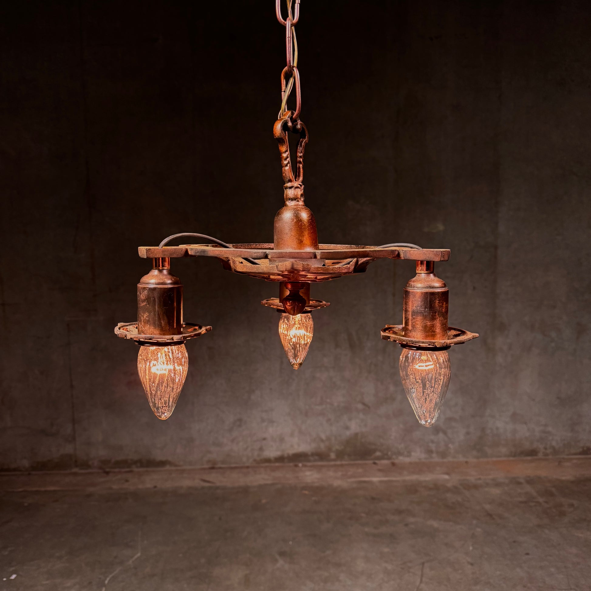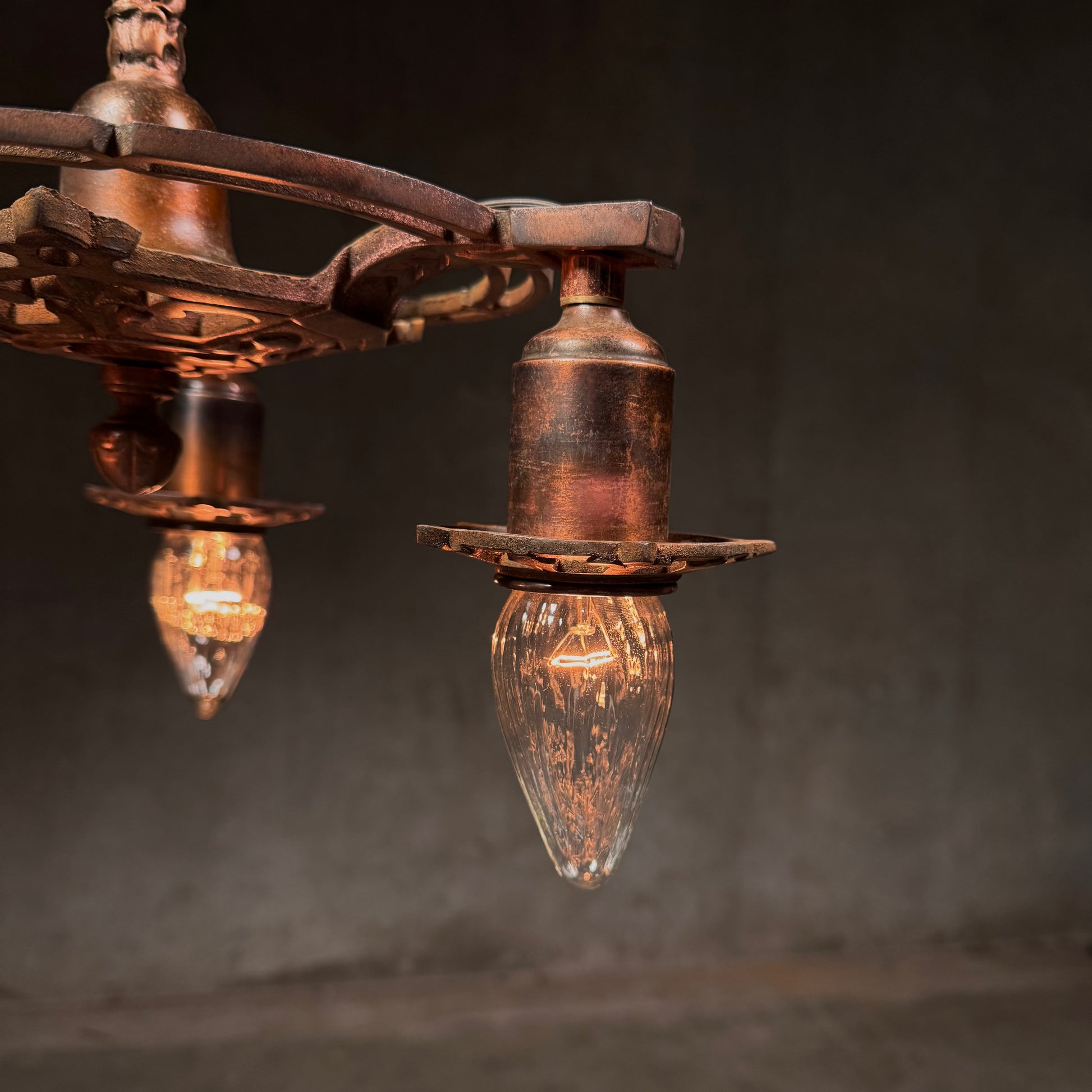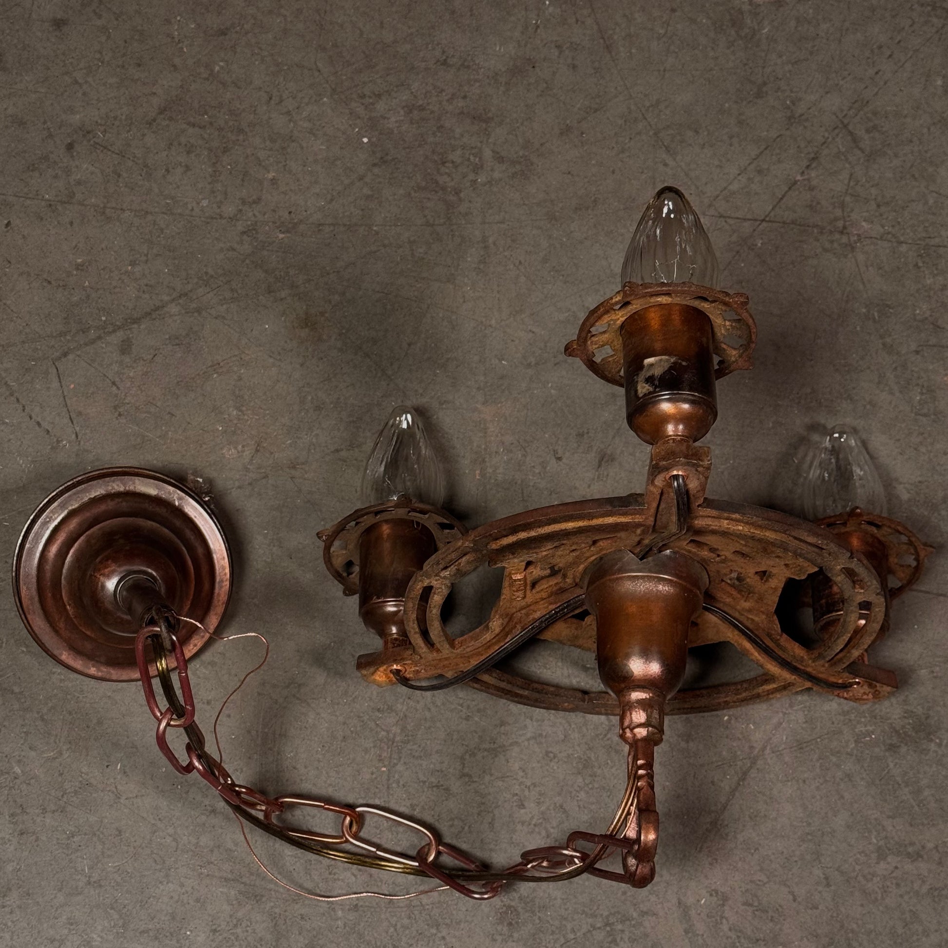 A very nice deco cast copper chandelier style pendant light. This unusual copper casting is a good quality fixture, rewired, nice patina, and ready for install.