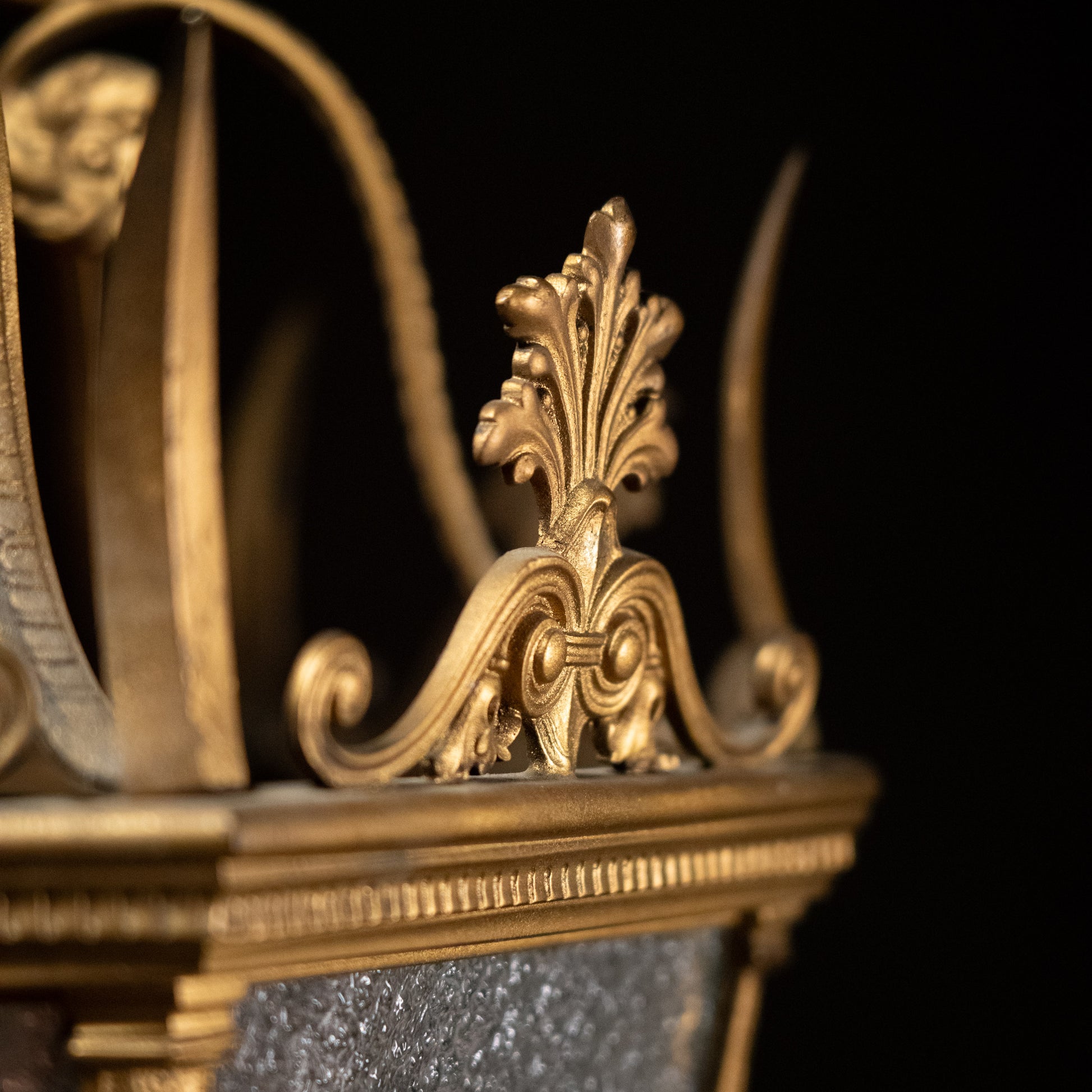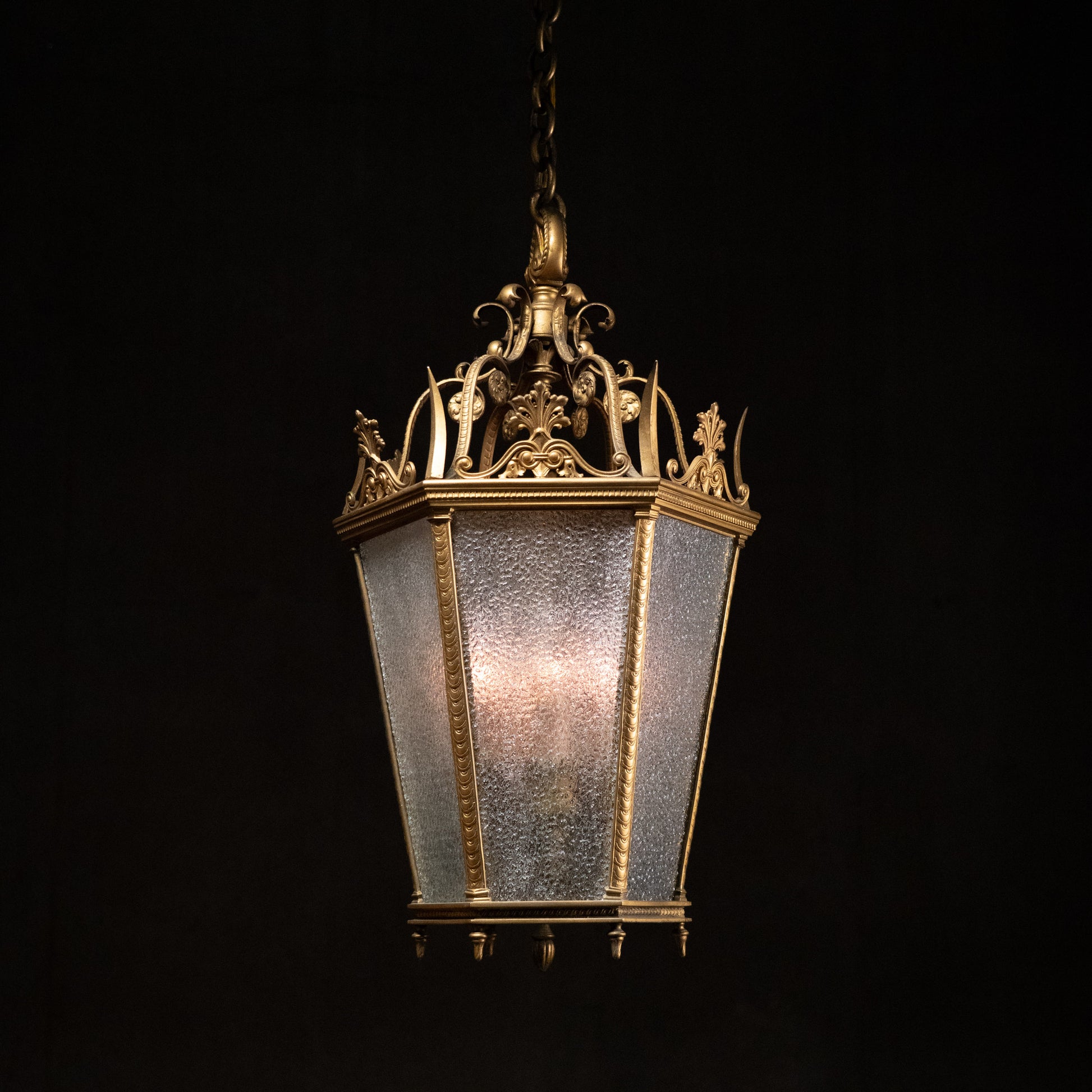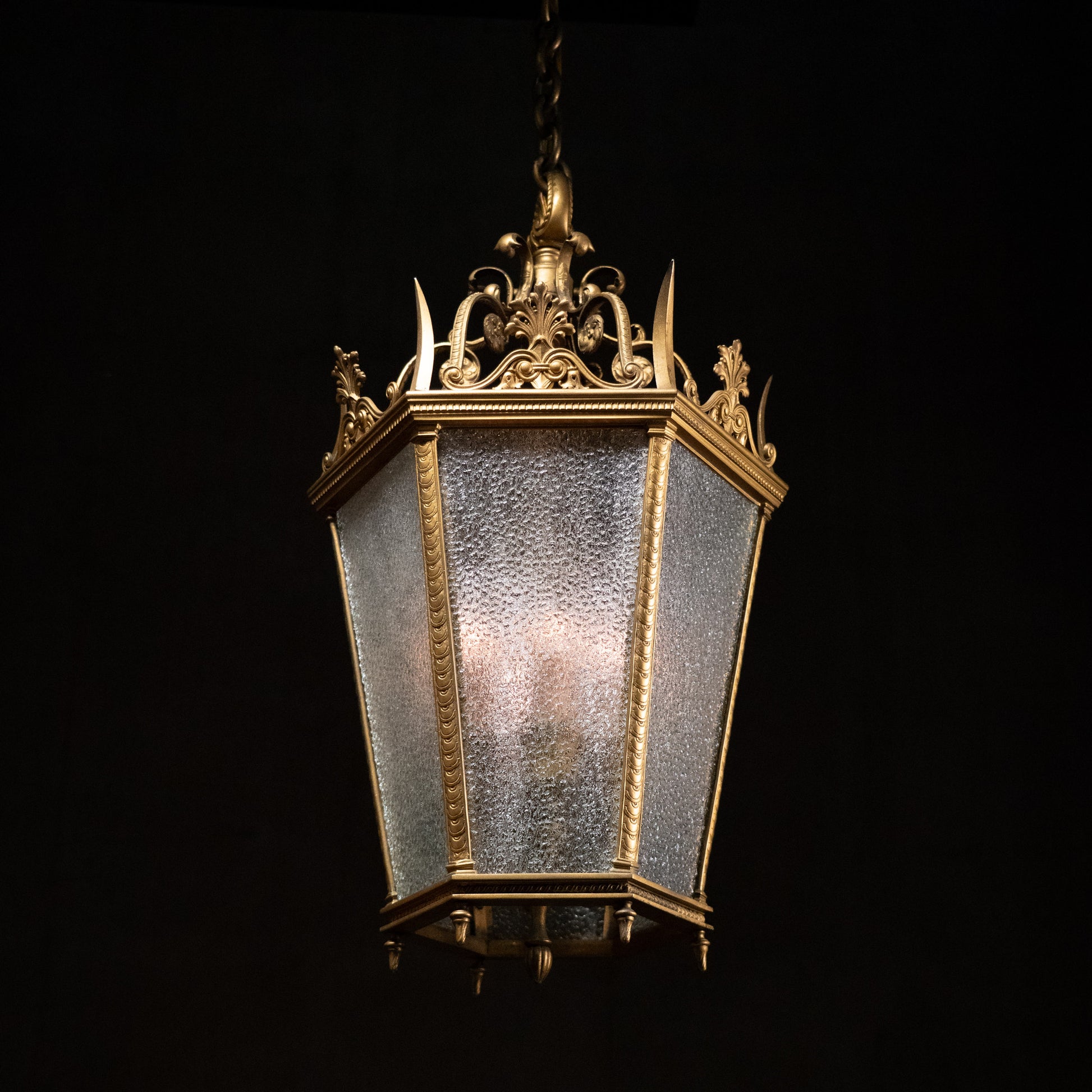 Very high quality light fixture in a gothic style lantern with incredible details. This was found in a bank building in Chicago.