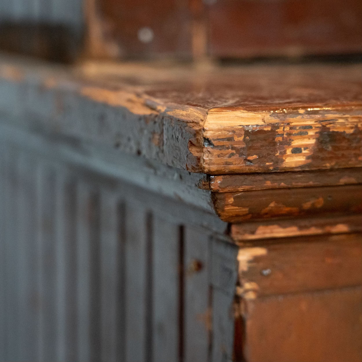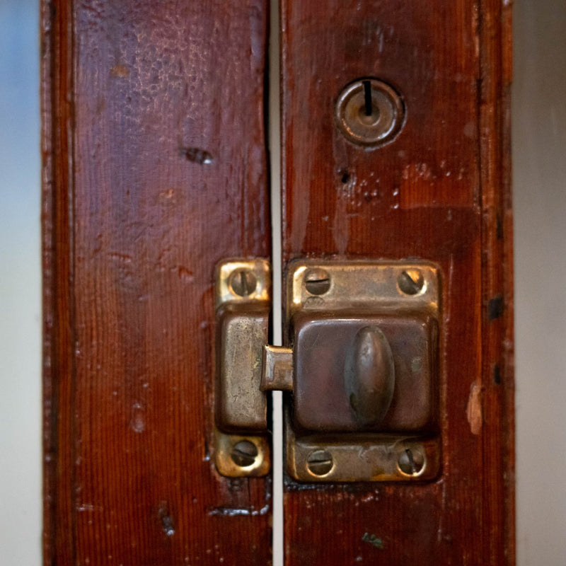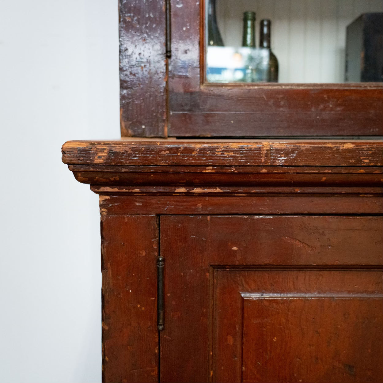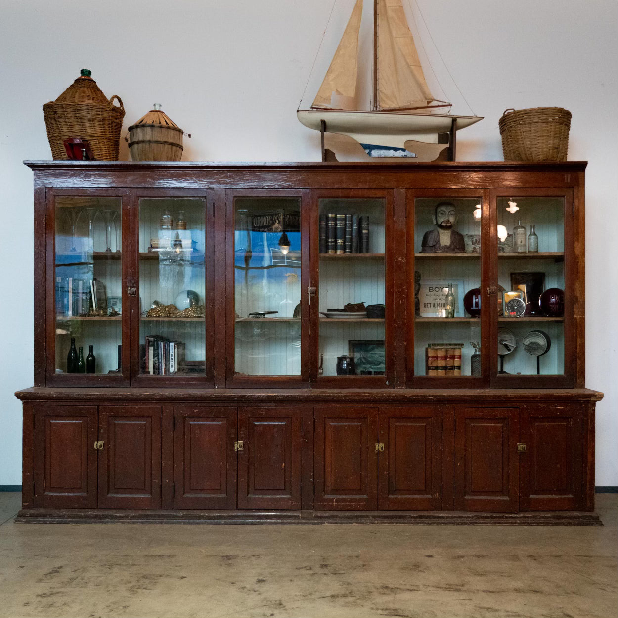 A fine example of a well built West Coast general store cabinet USED FOR DISPLAY AND MERCHANDISING. This piece was found in PNW, all in it's original old finish, with multi panels, brass hardware & first growth Fir. This is a two piece cabinet with a 29 inch depth on base and 22” on top. This is a great rare example.