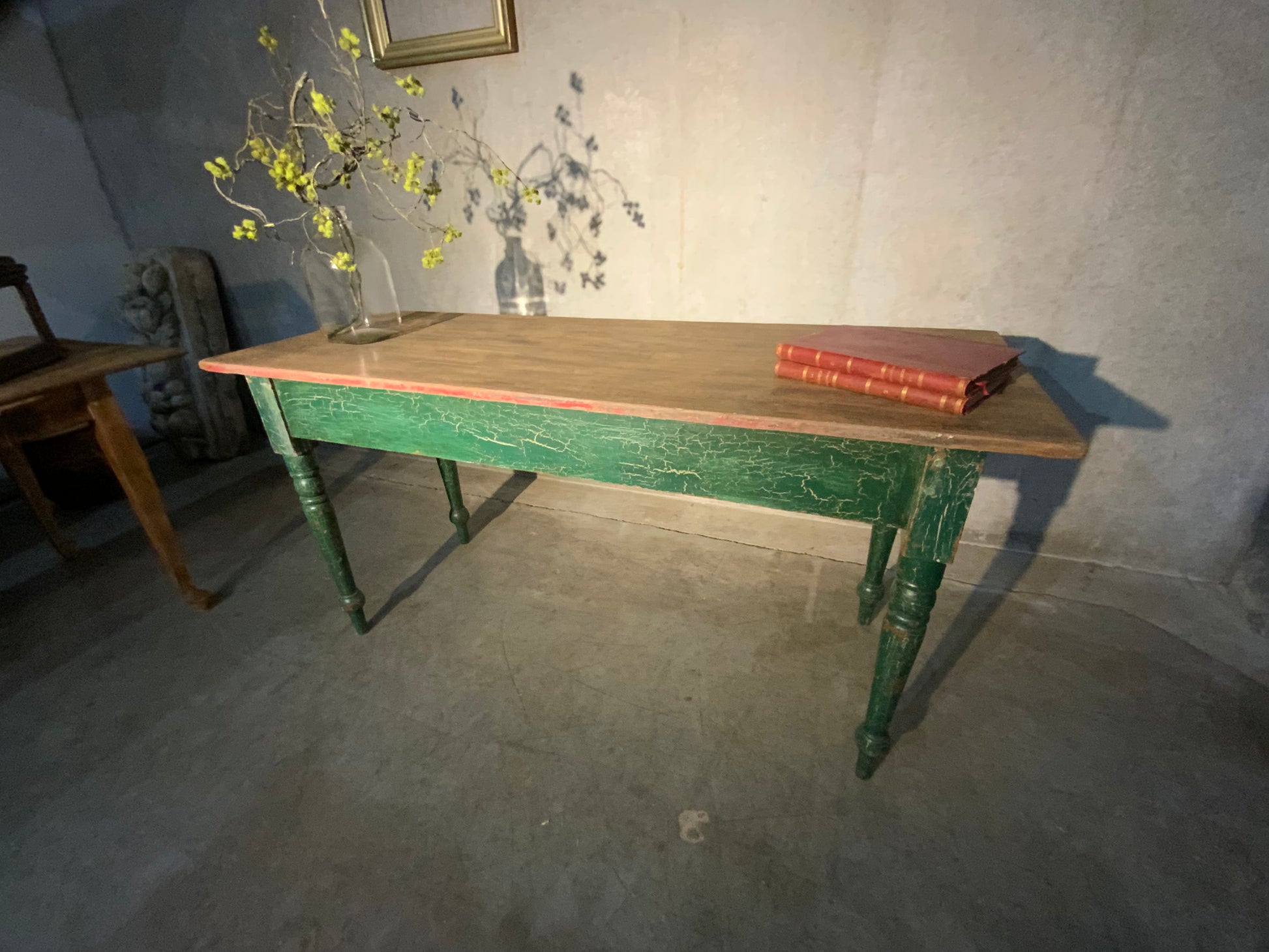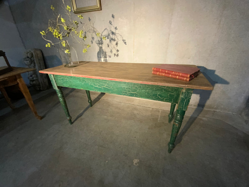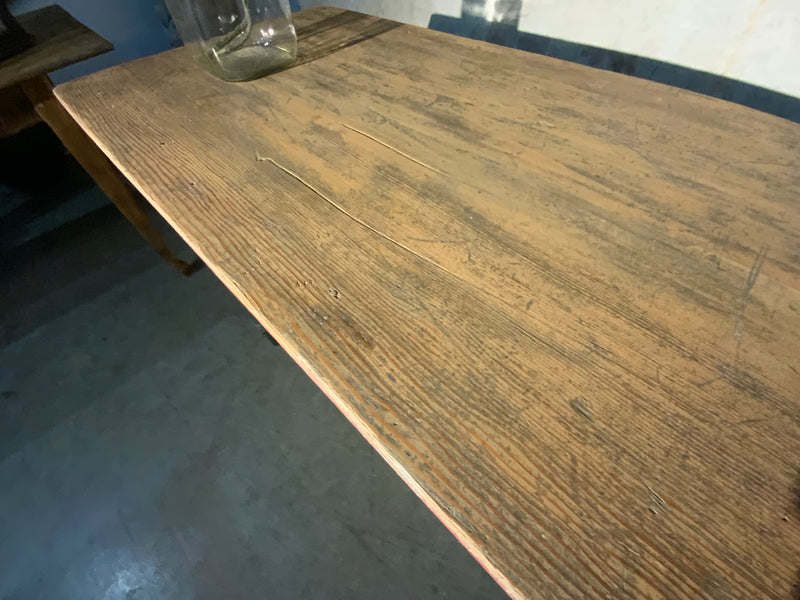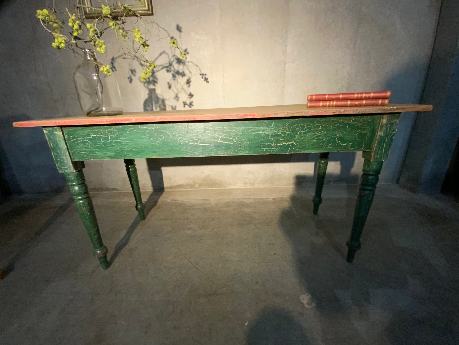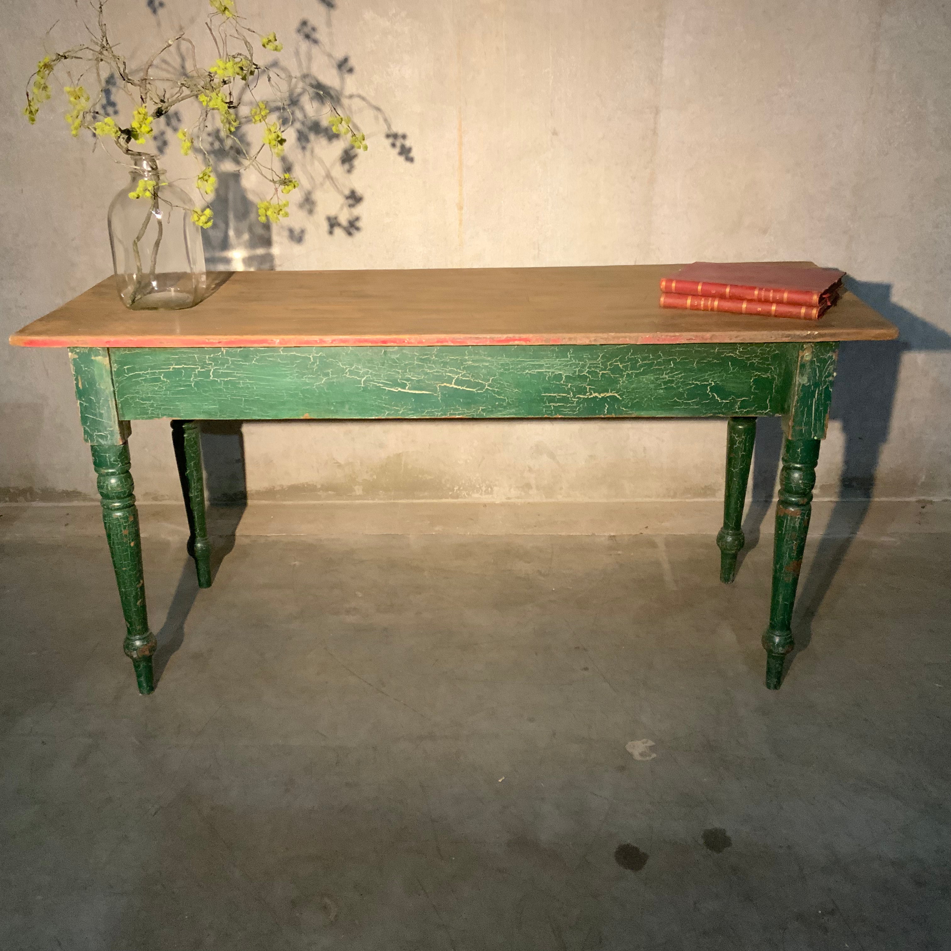 Nice country farm table in old paint with scrubbed top found on the prairies . This example is typical of settler furniture made by local craftsman’s during that period . This example retained old finish with a clear worn top. C1890-1910.