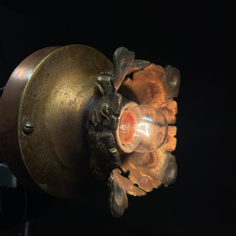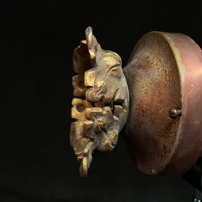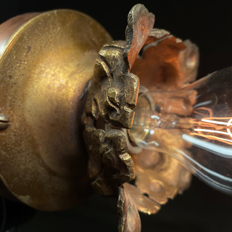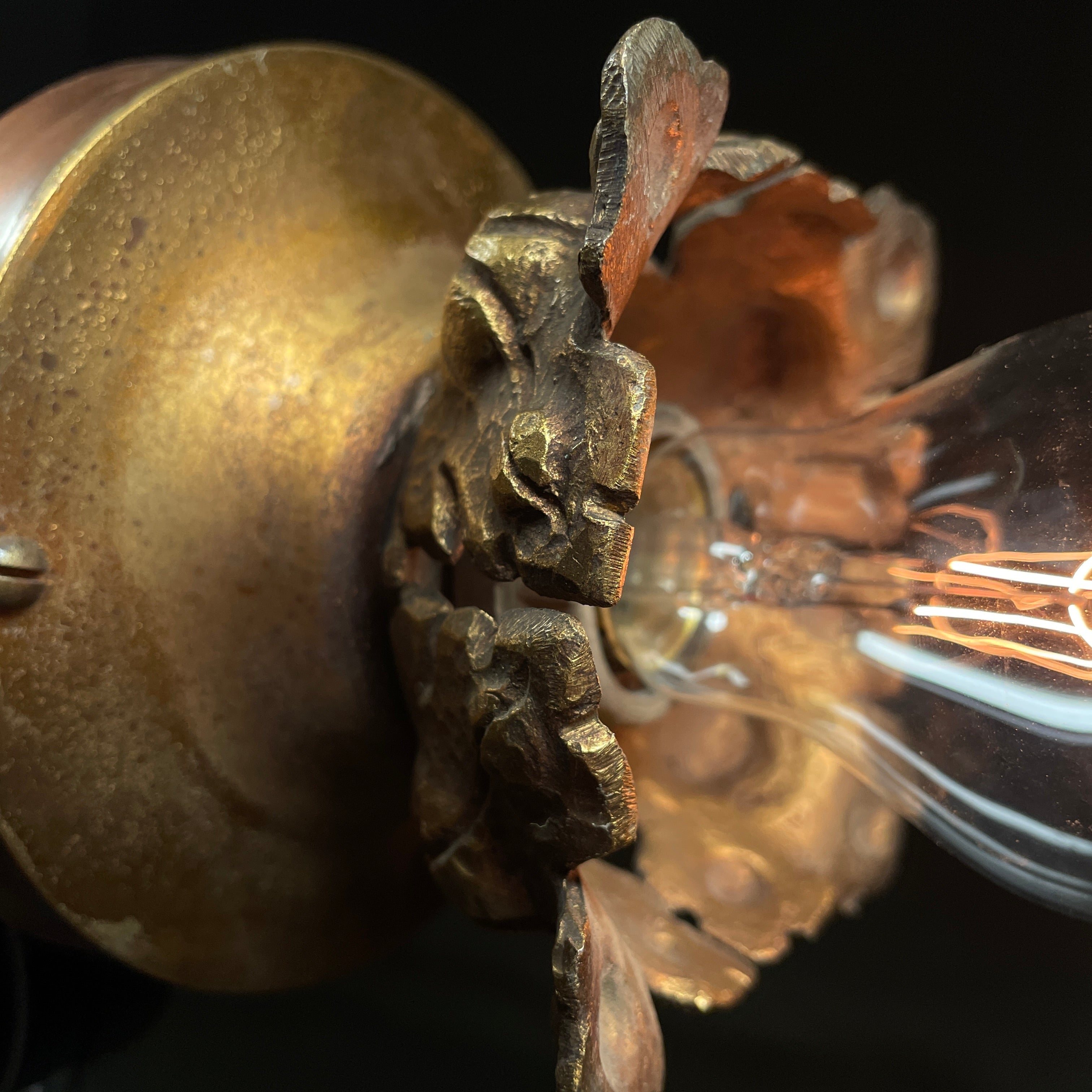 A very rare unique set of 14 sconces made of cast brass with solid copper fitter acquired in a old demolition years ago in Pittsburgh. I’ve never seen them before, we think they could be great in a grouping or as sconces. They are very well made.