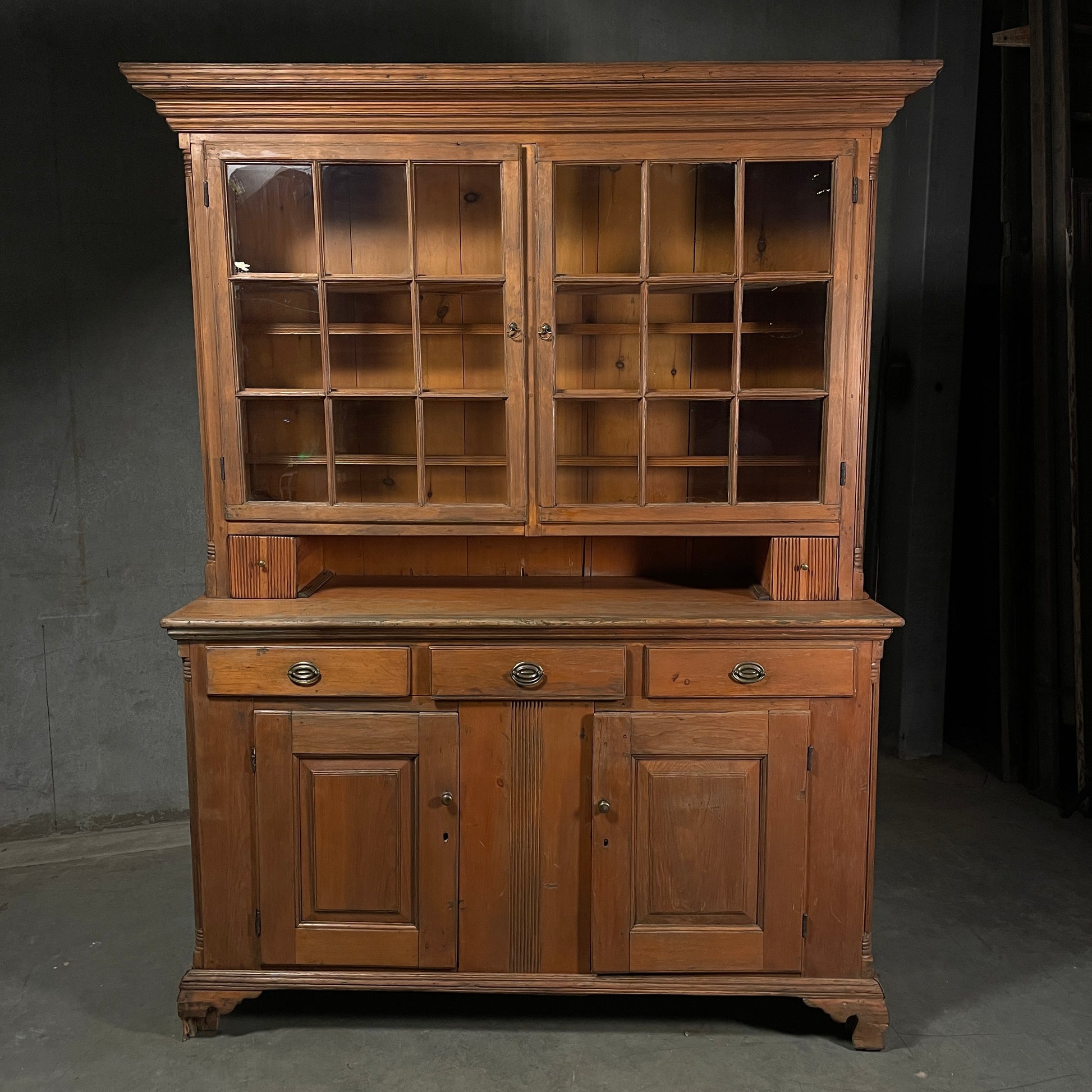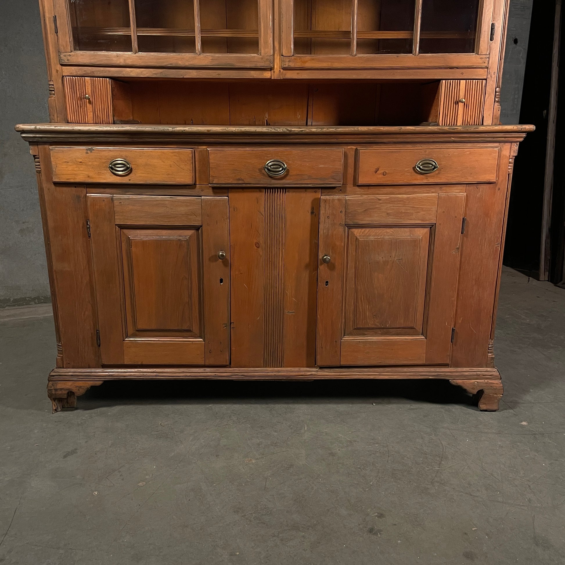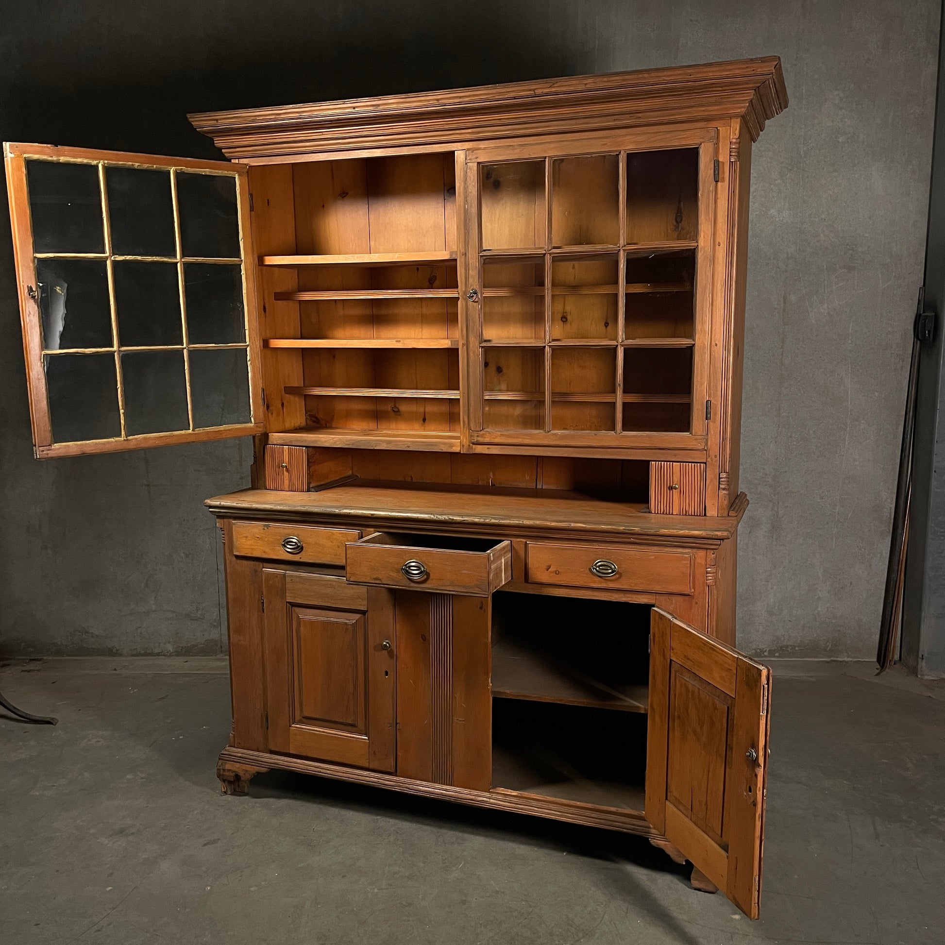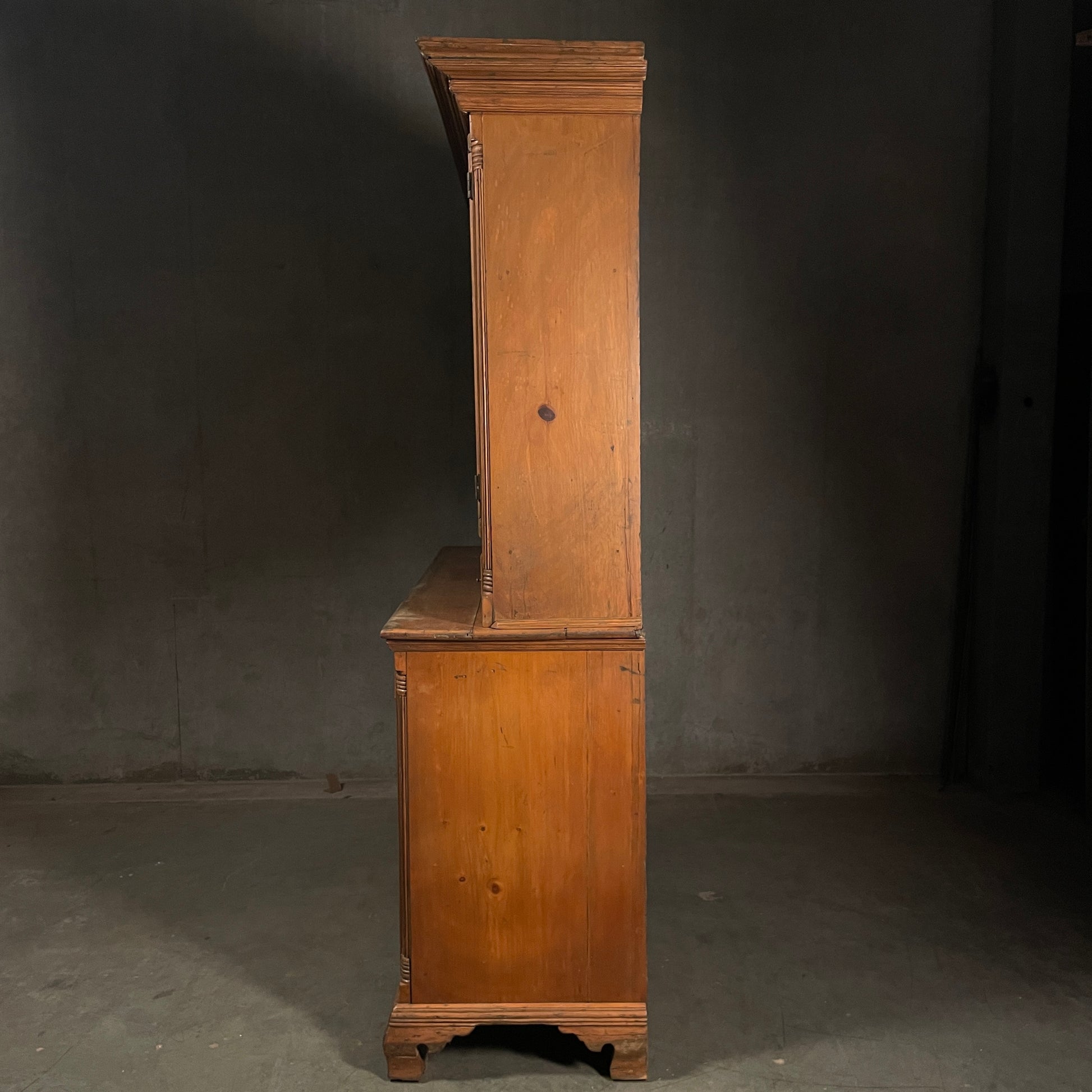 An incredible example of a two piece, 200+ year old, formal country cabinet with overlapping doors and drawers, reeded details, ogre bracket foot, original glass all in an extra wide format.