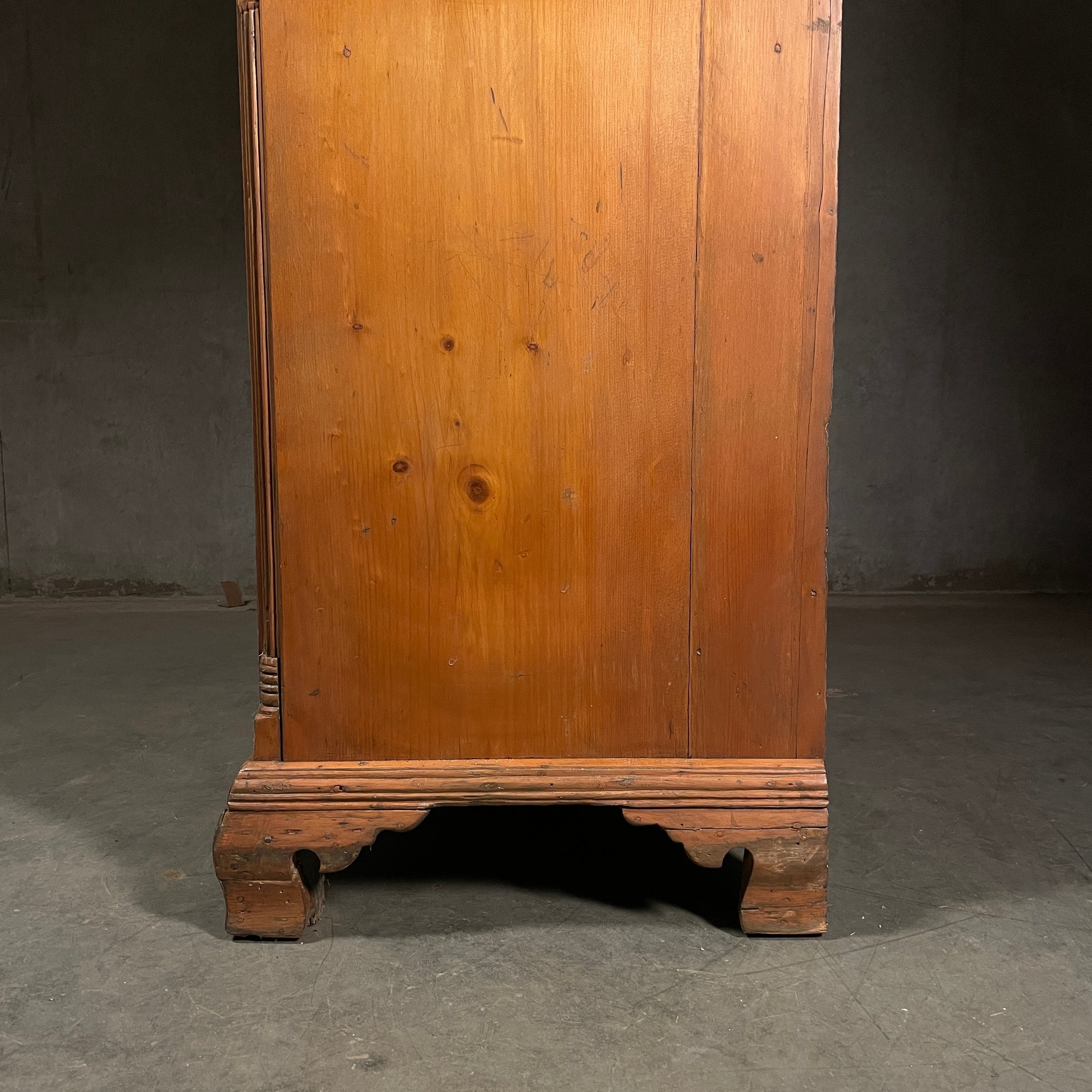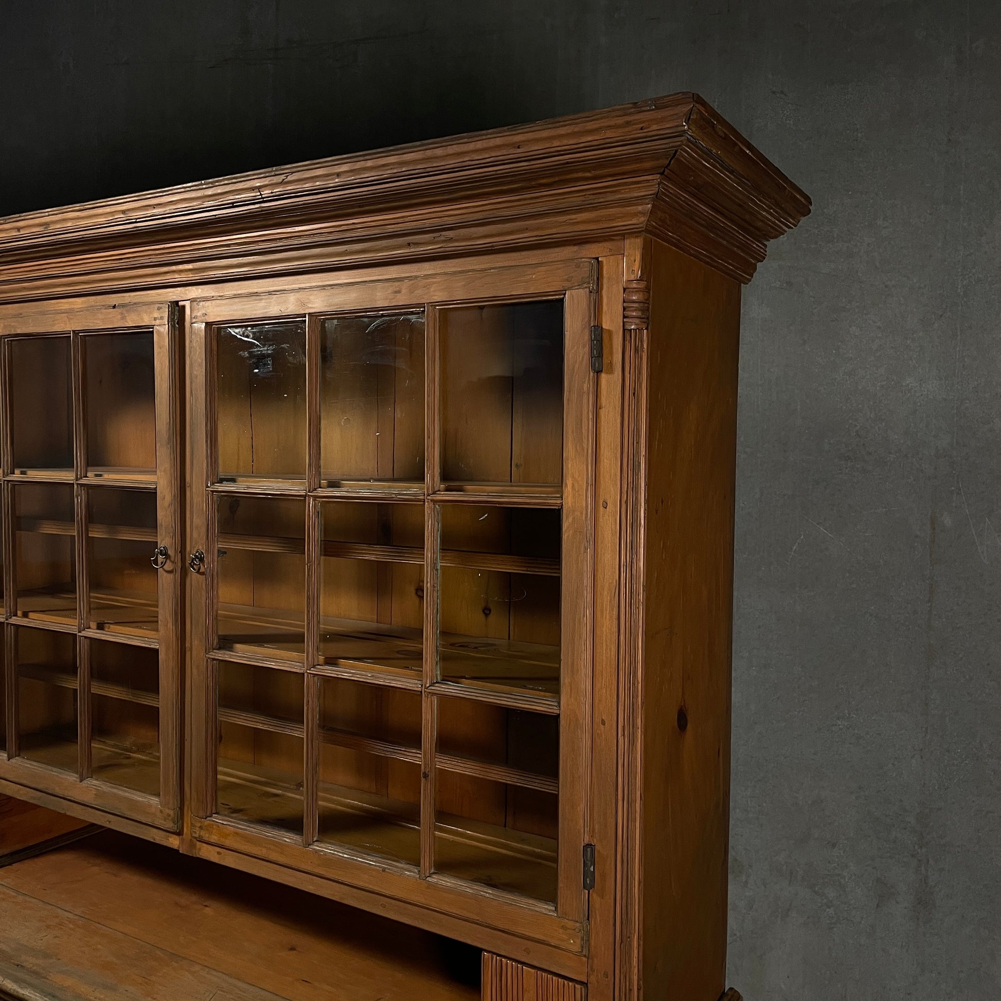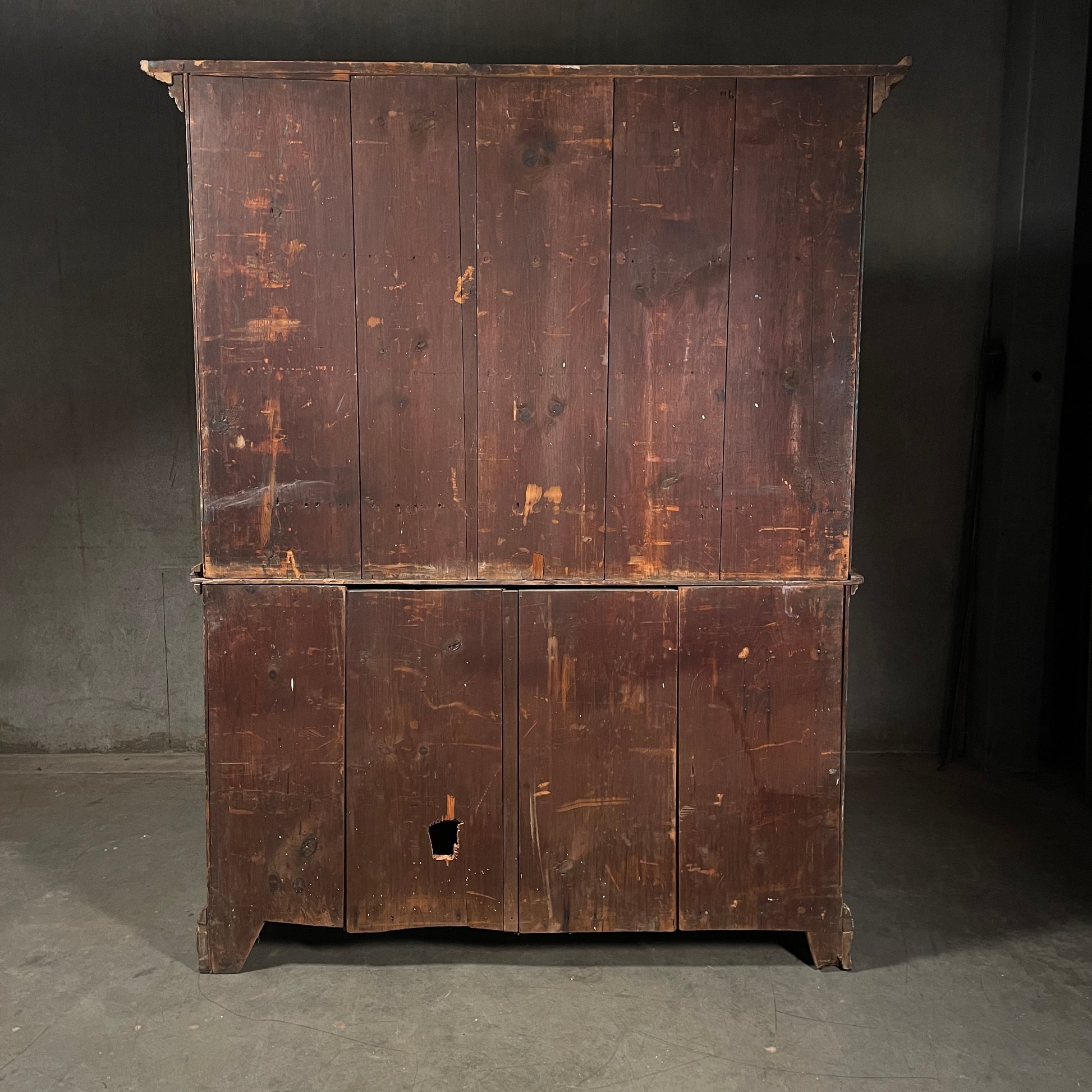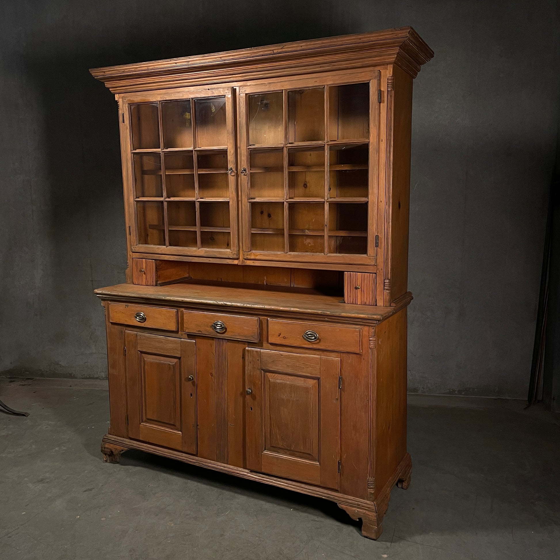 An incredible example of a two piece, 200+ year old, formal country cabinet with overlapping doors and drawers, reeded details, ogre bracket foot, original glass all in an extra wide format.