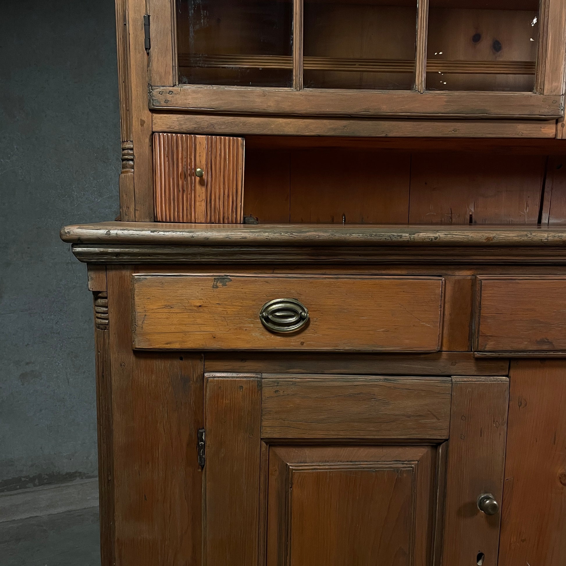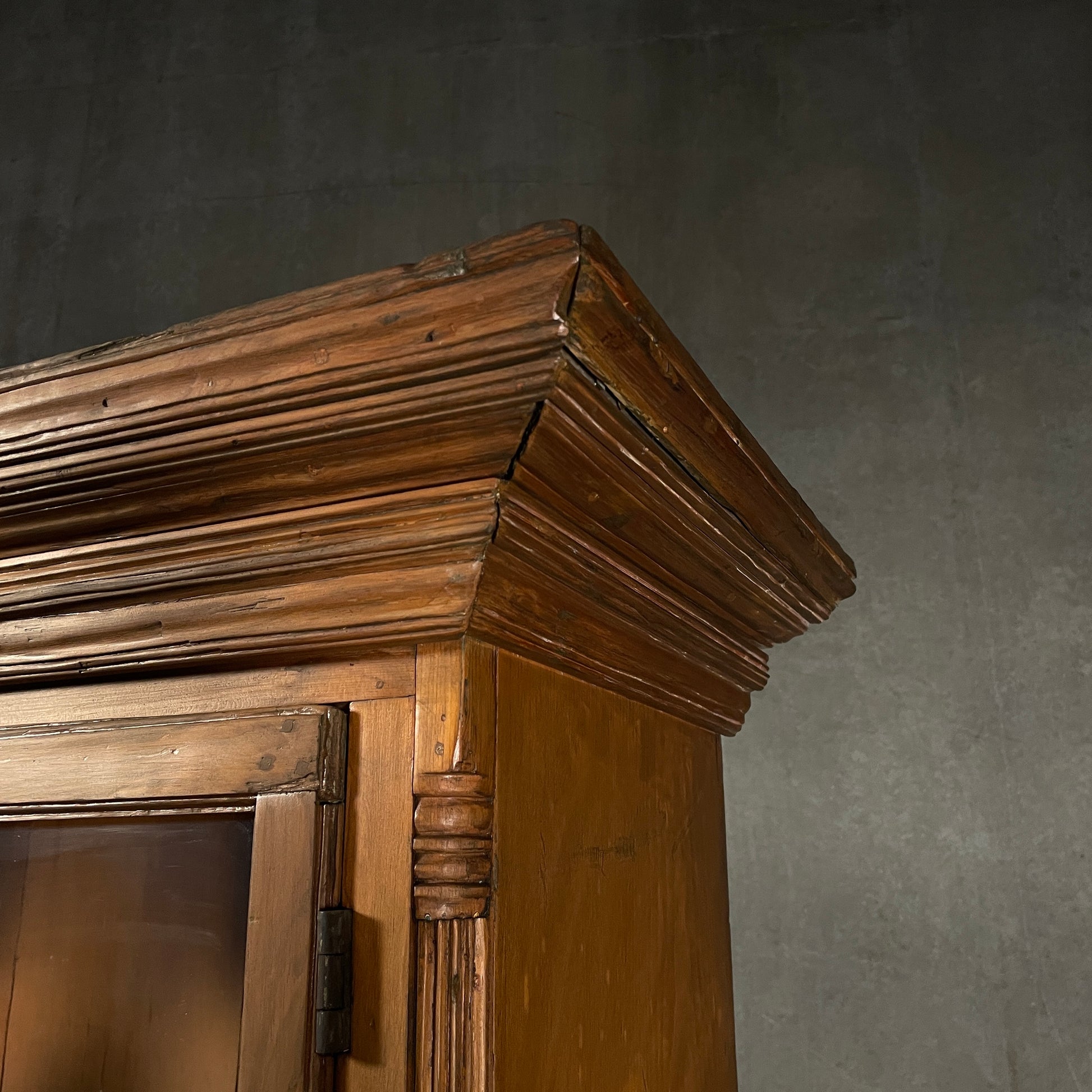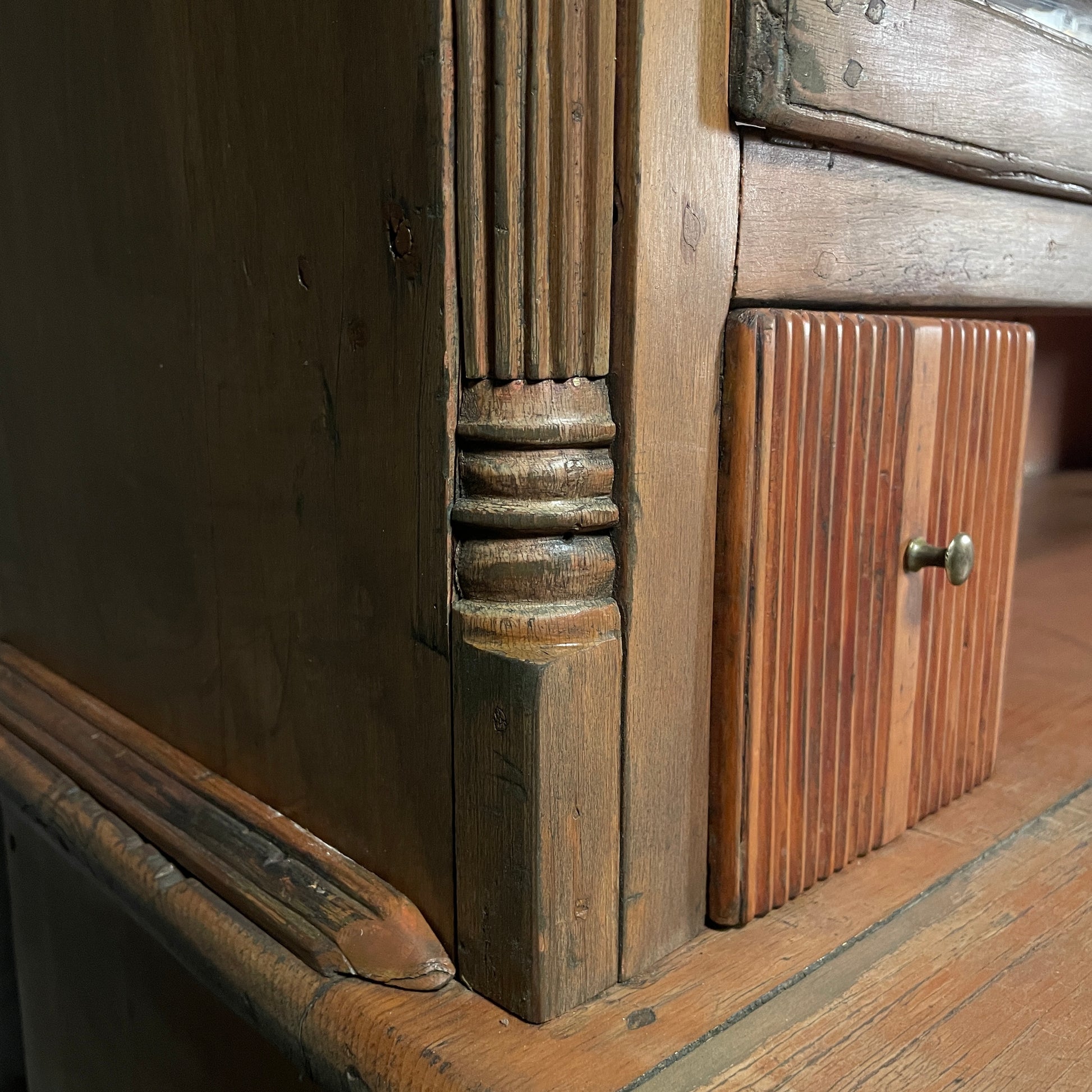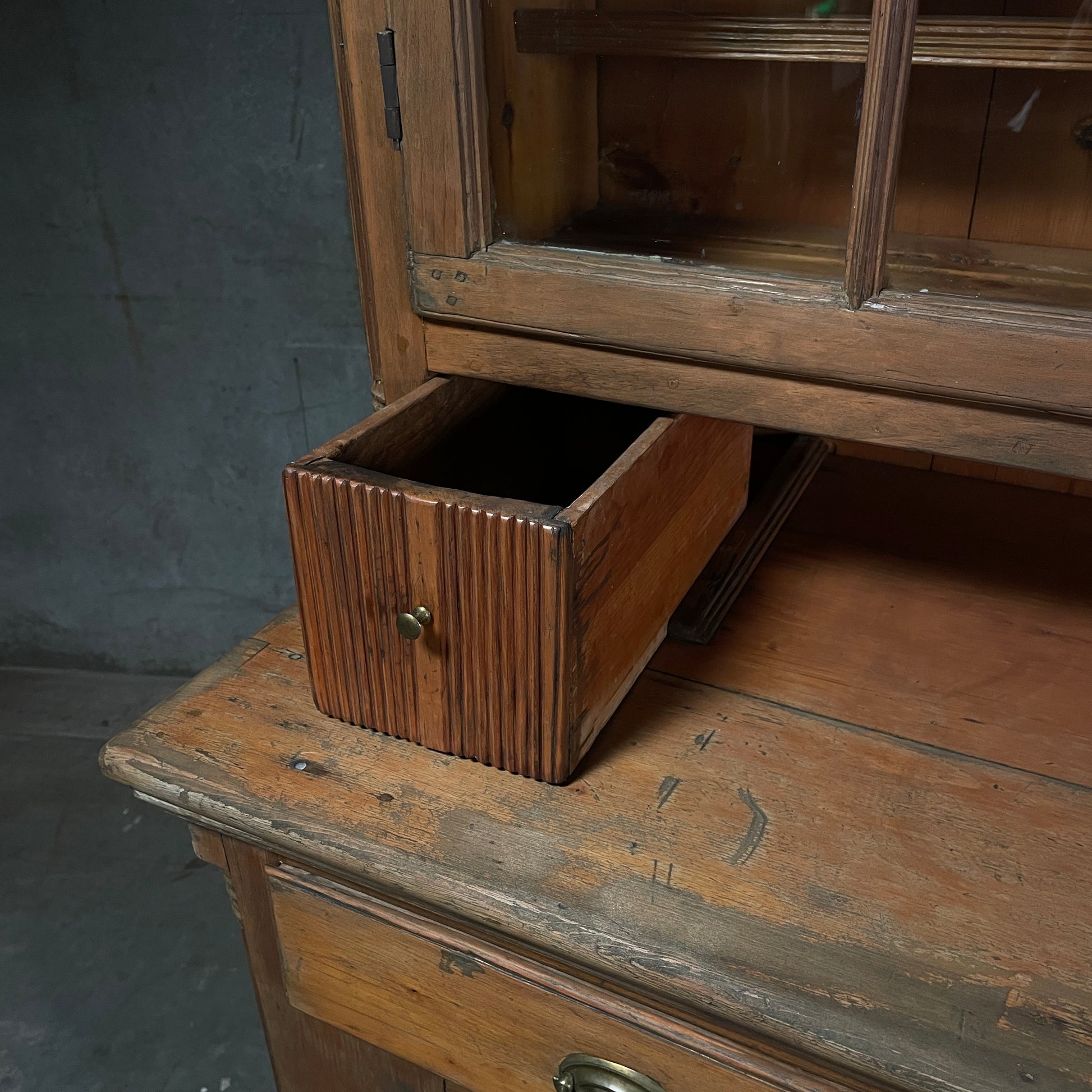An incredible example of a two piece, 200+ year old, formal country cabinet with overlapping doors and drawers, reeded details, ogre bracket foot, original glass all in an extra wide format.