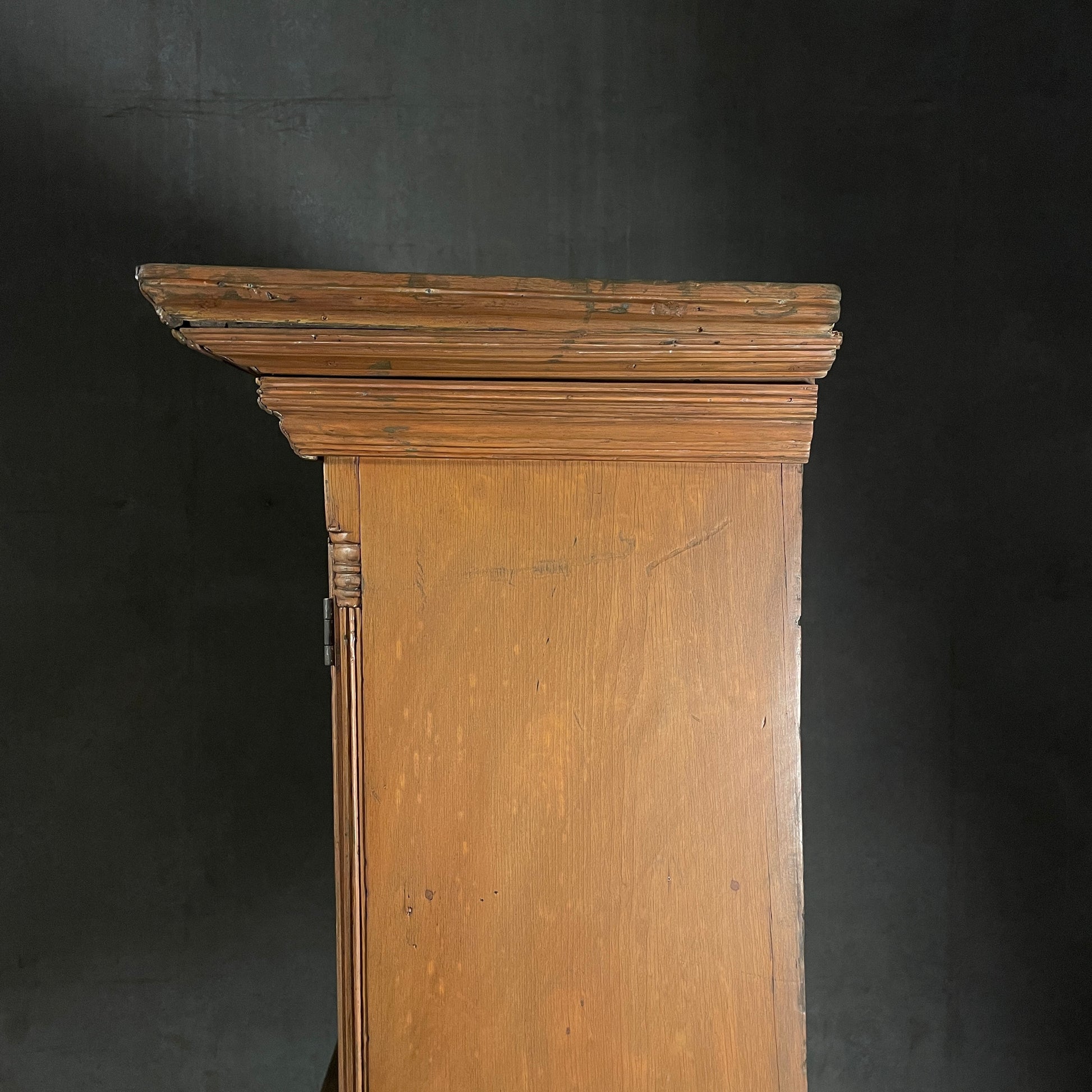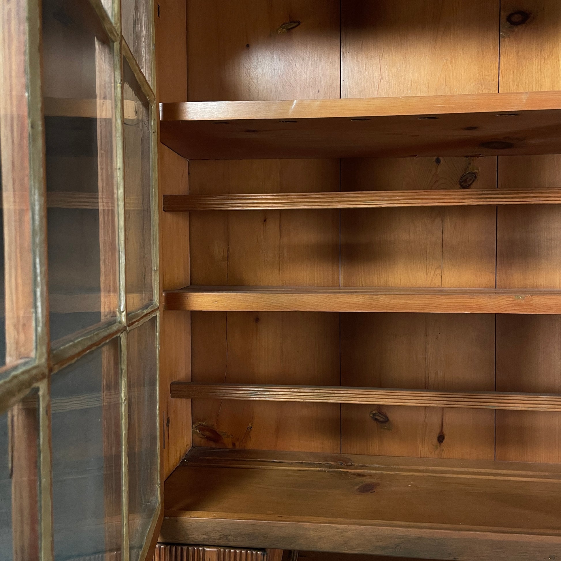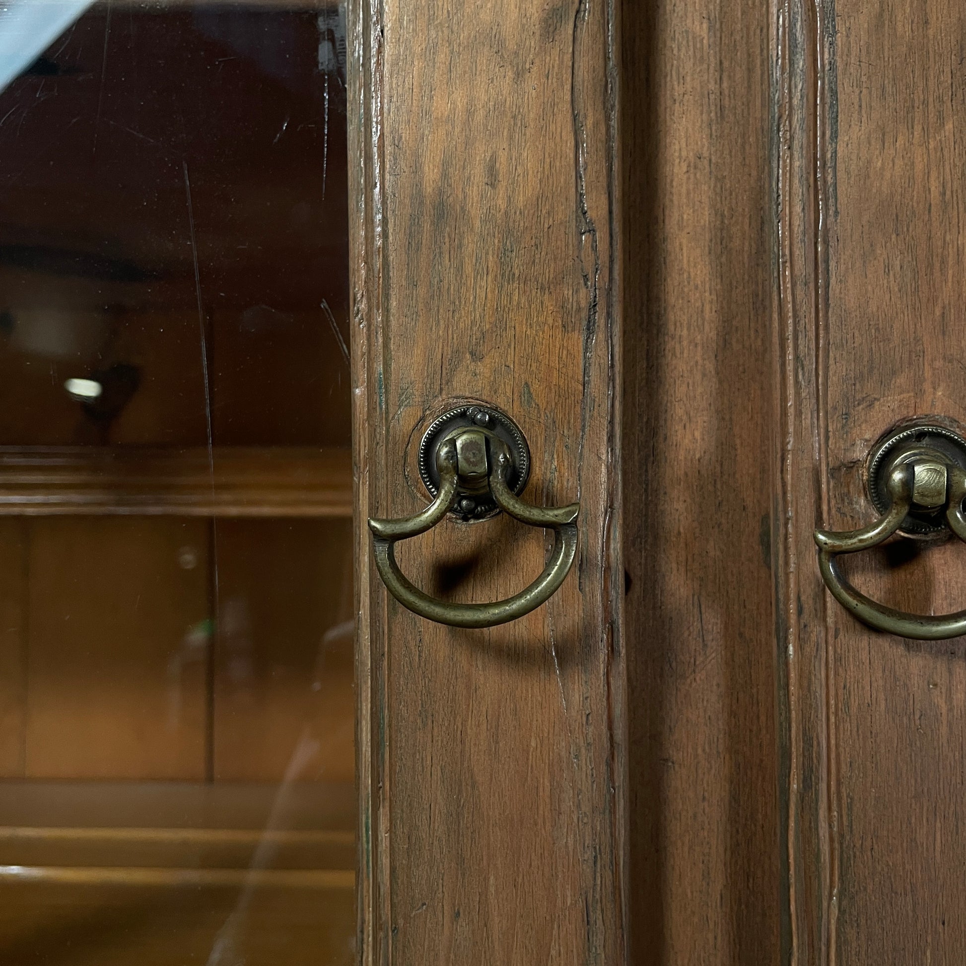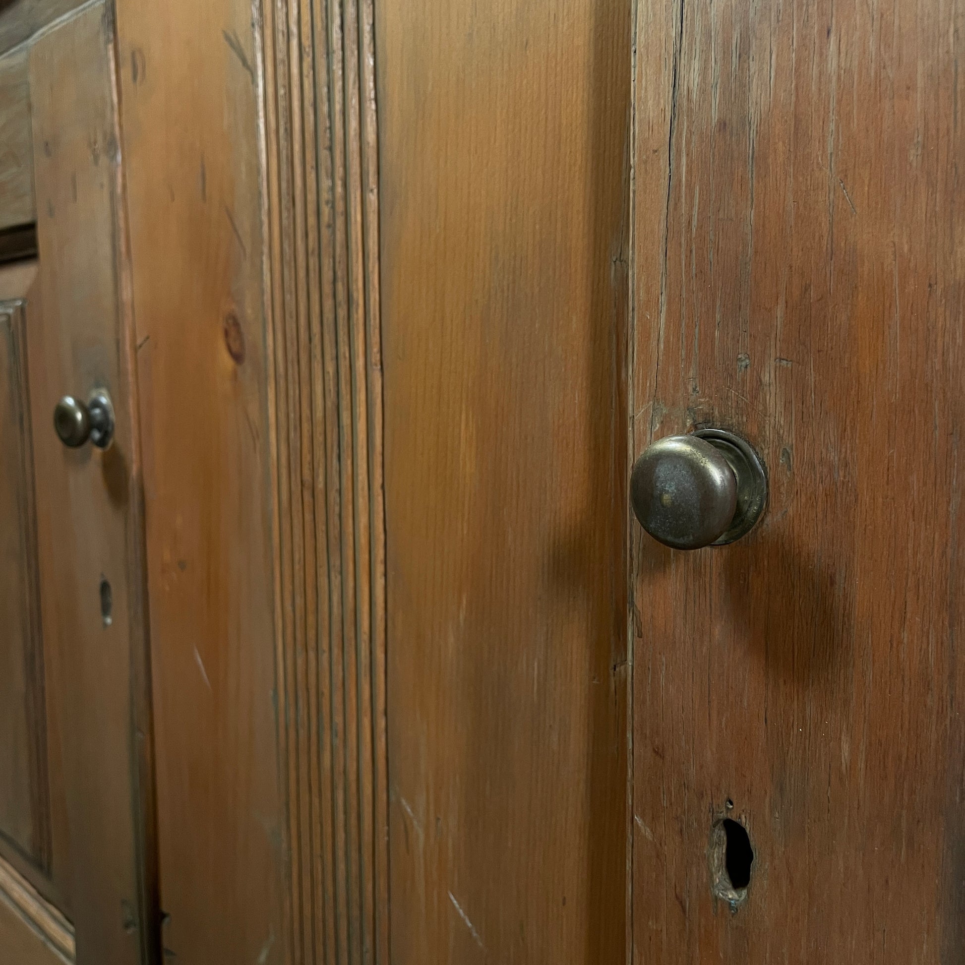 An incredible example of a two piece, 200+ year old, formal country cabinet with overlapping doors and drawers, reeded details, ogre bracket foot, original glass all in an extra wide format.