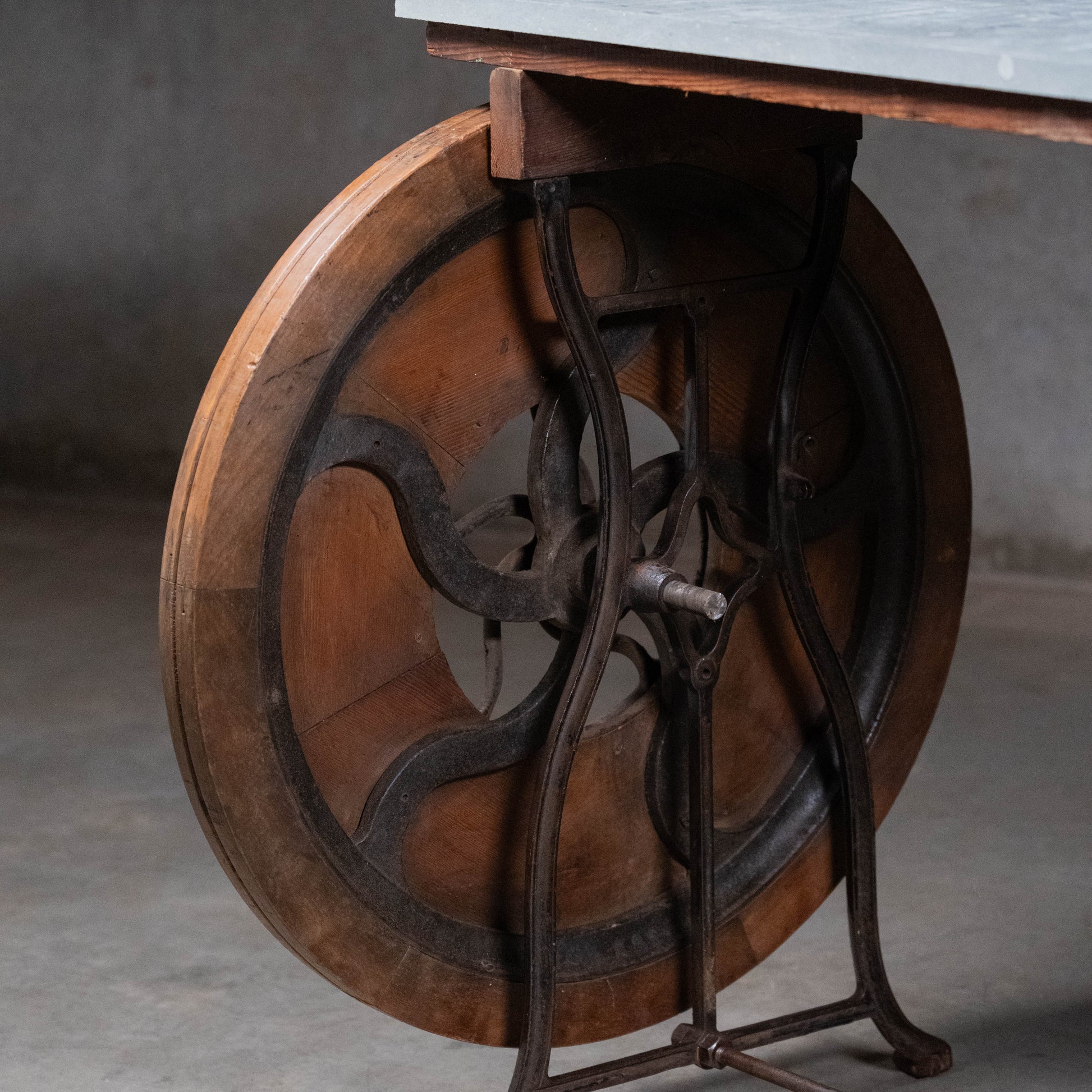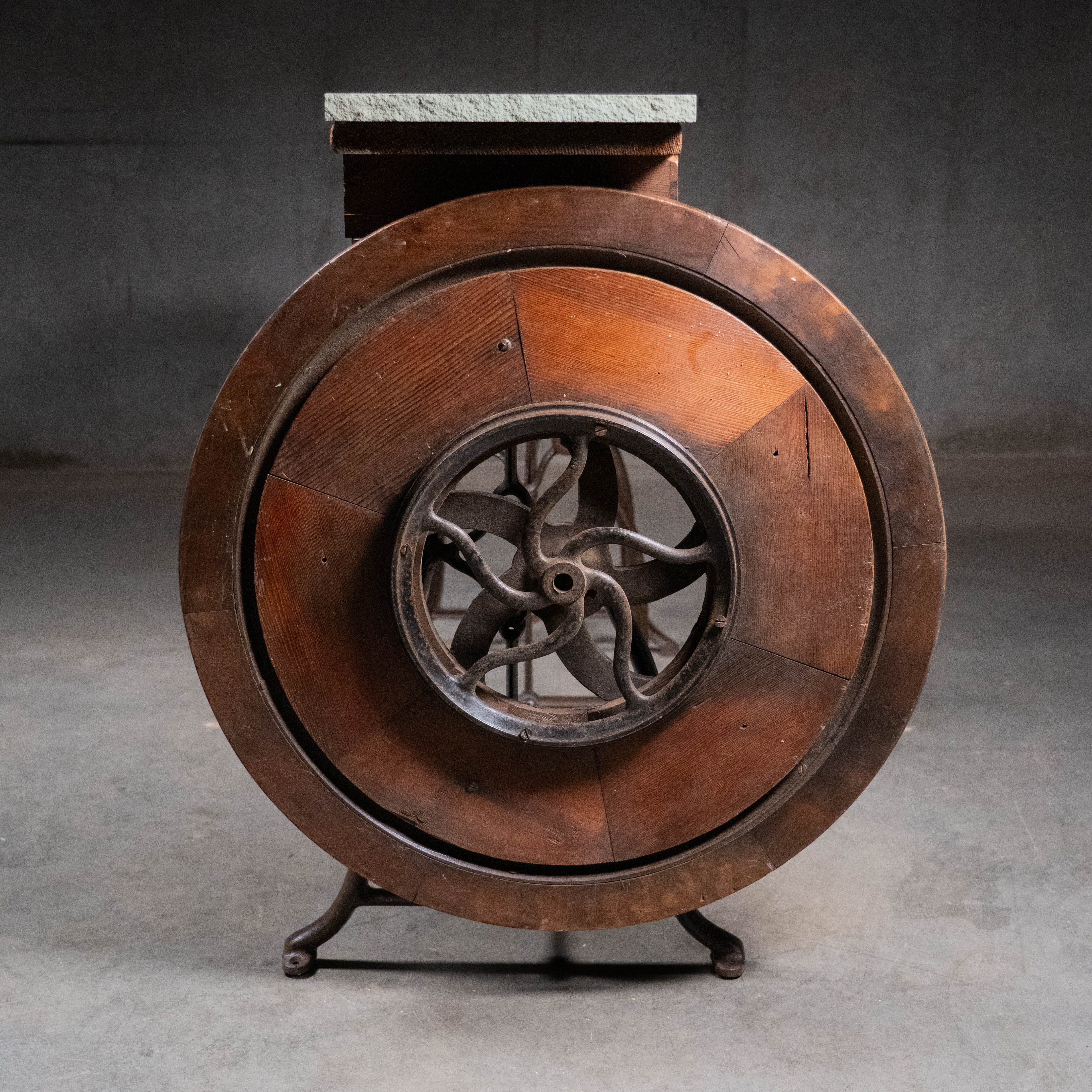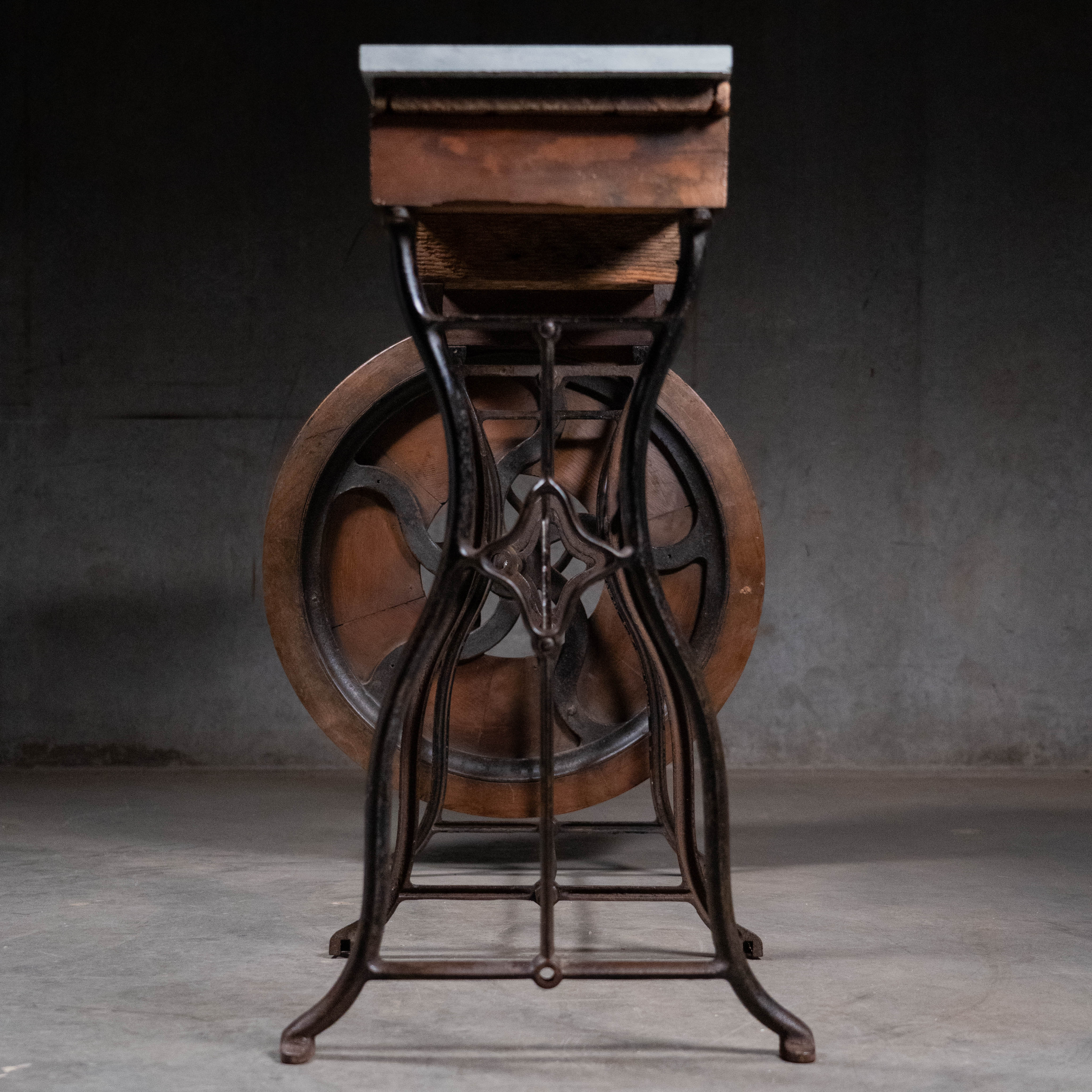 Found in PNW. A rare iron base used on a foot pedal table lathe, with unique hand made decorative wheel. Great piece that offers several options for tops that can be discussed. This current example has a grey marble top.