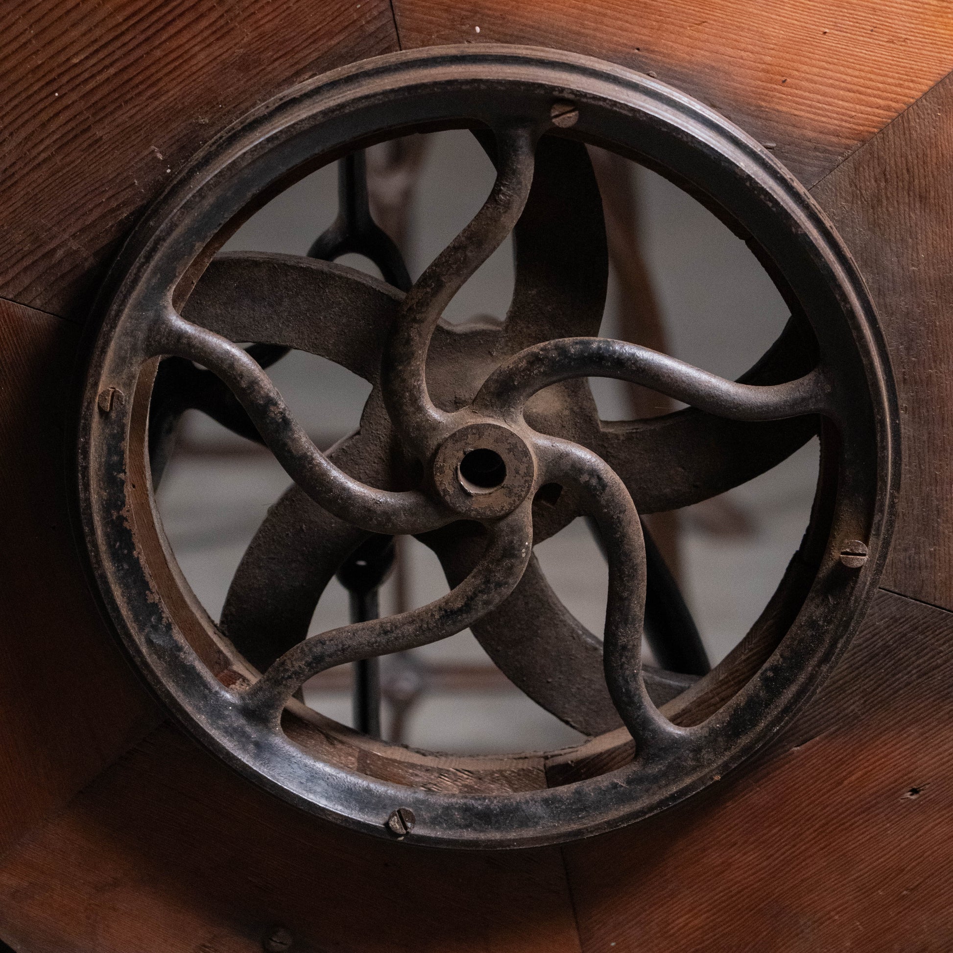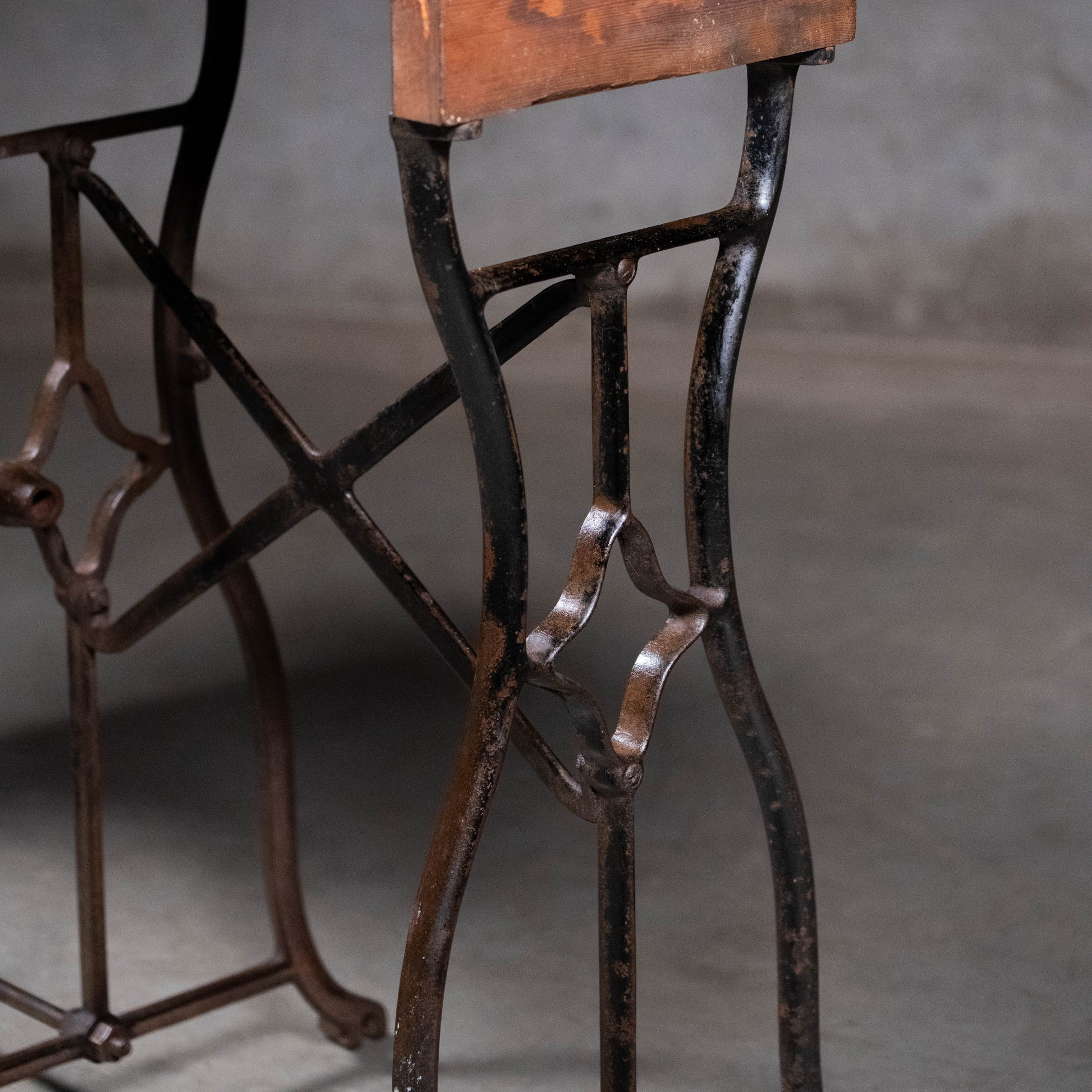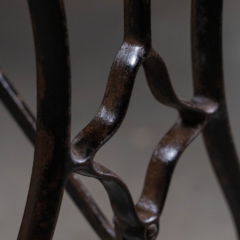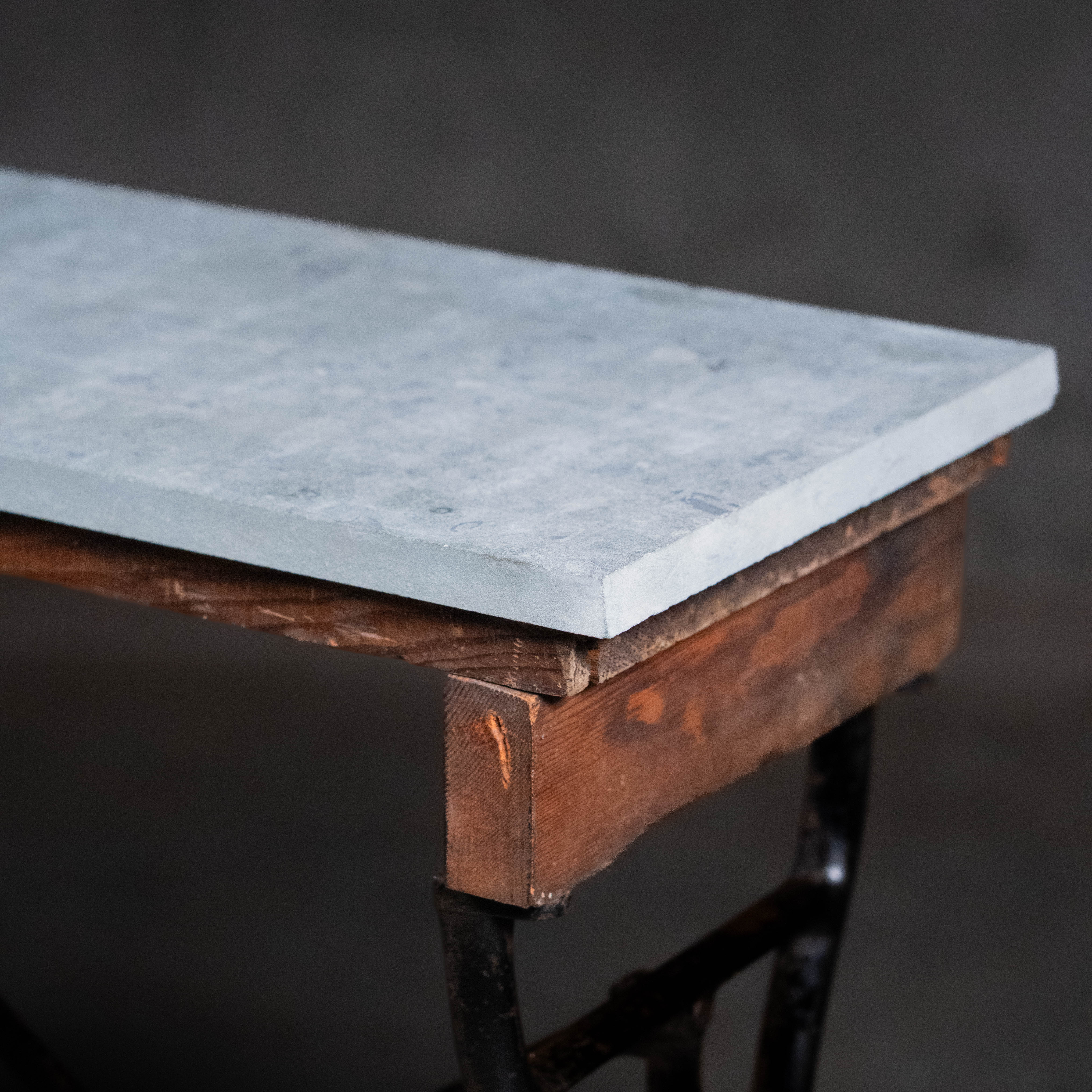 Found in PNW. A rare iron base used on a foot pedal table lathe, with unique hand made decorative wheel. Great piece that offers several options for tops that can be discussed. This current example has a grey marble top.