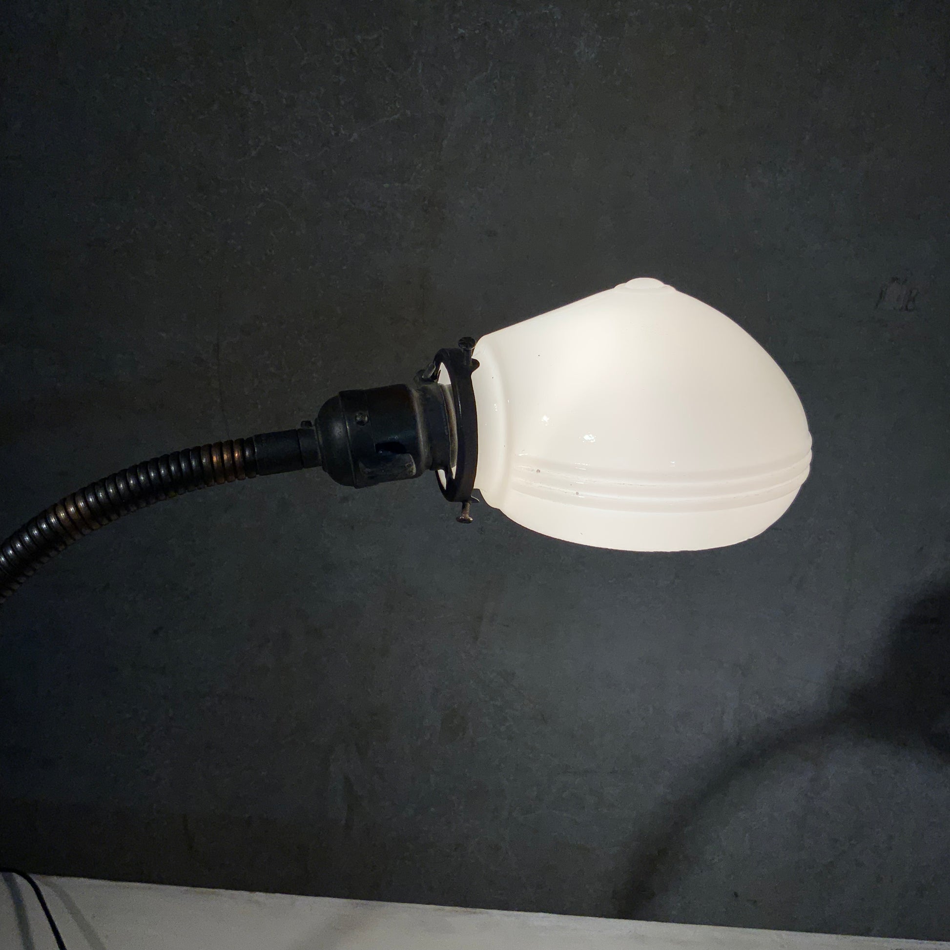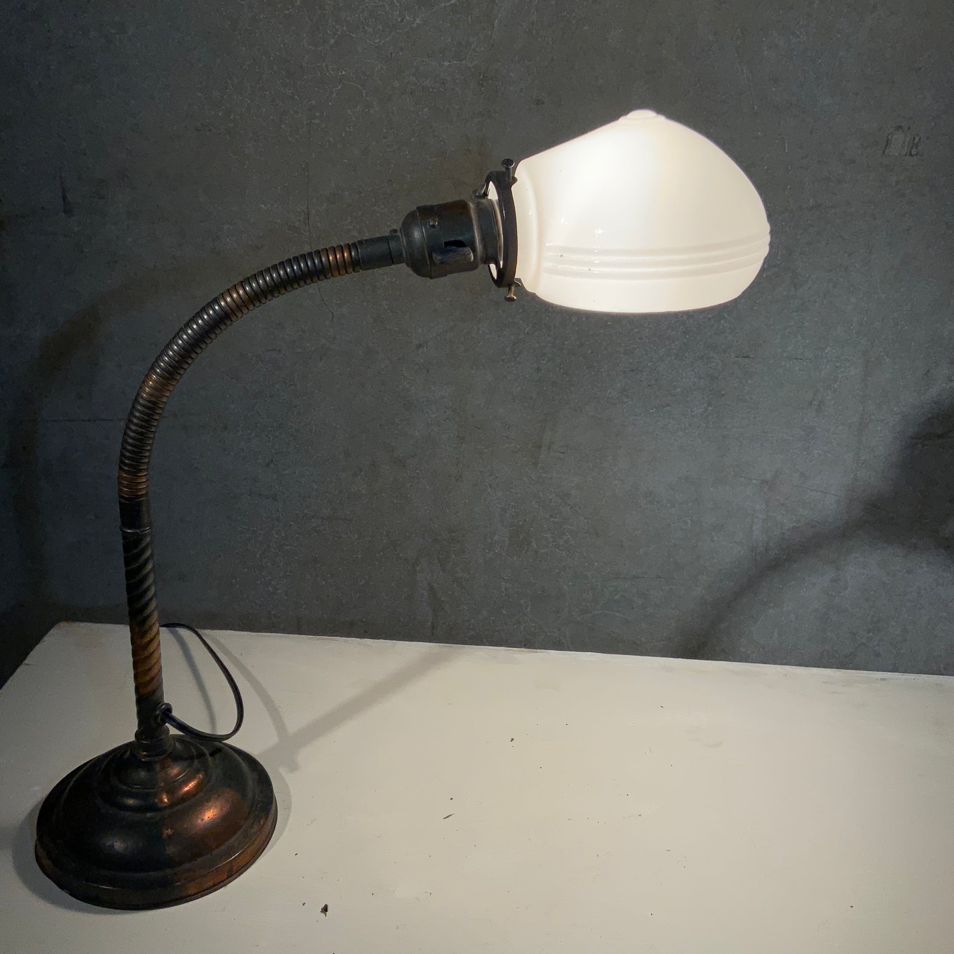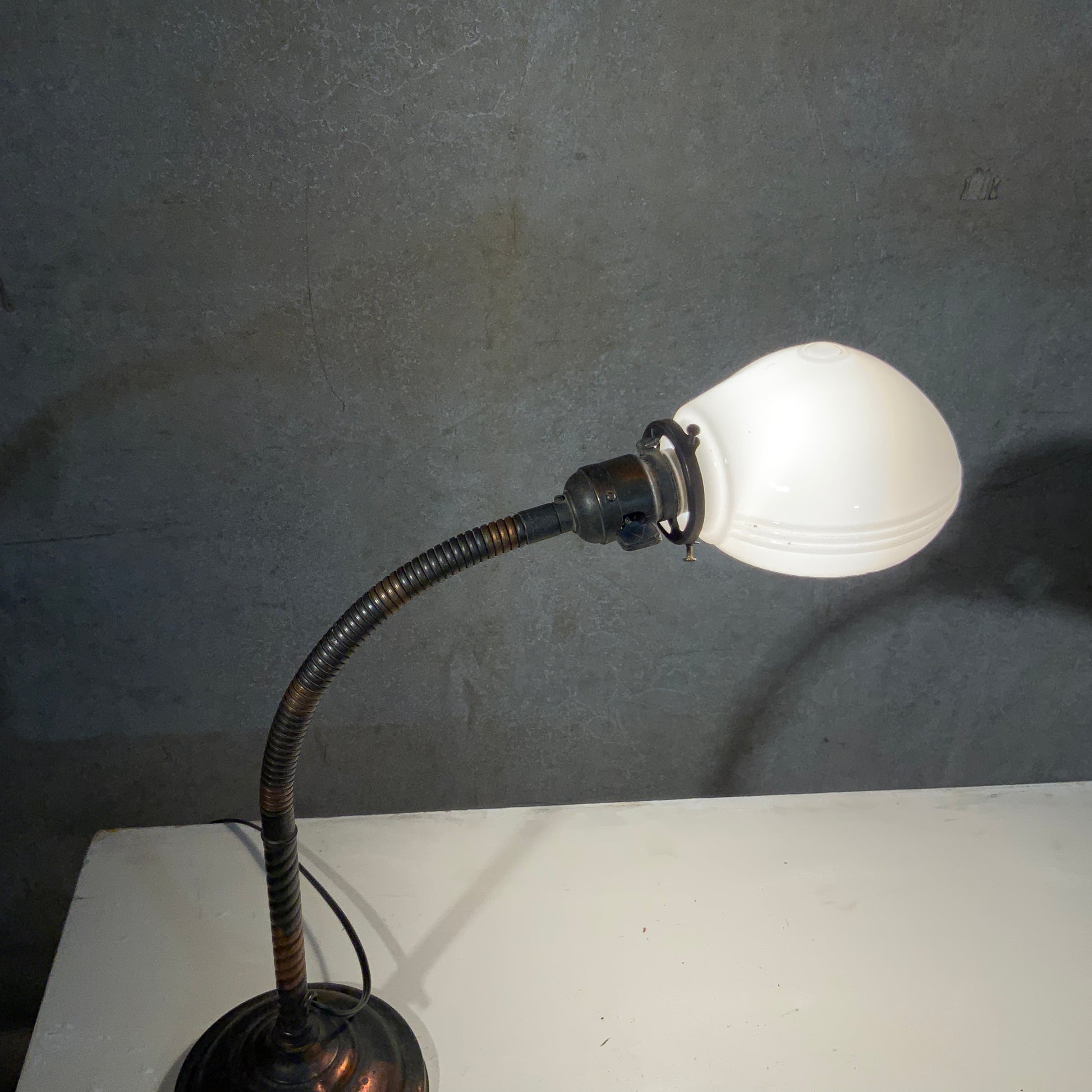 Early 20th century fully adjustable brass gooseneck table lamp in japaned finish, designed and fabricated by the faries mfg. co., DECATUR, ILL..