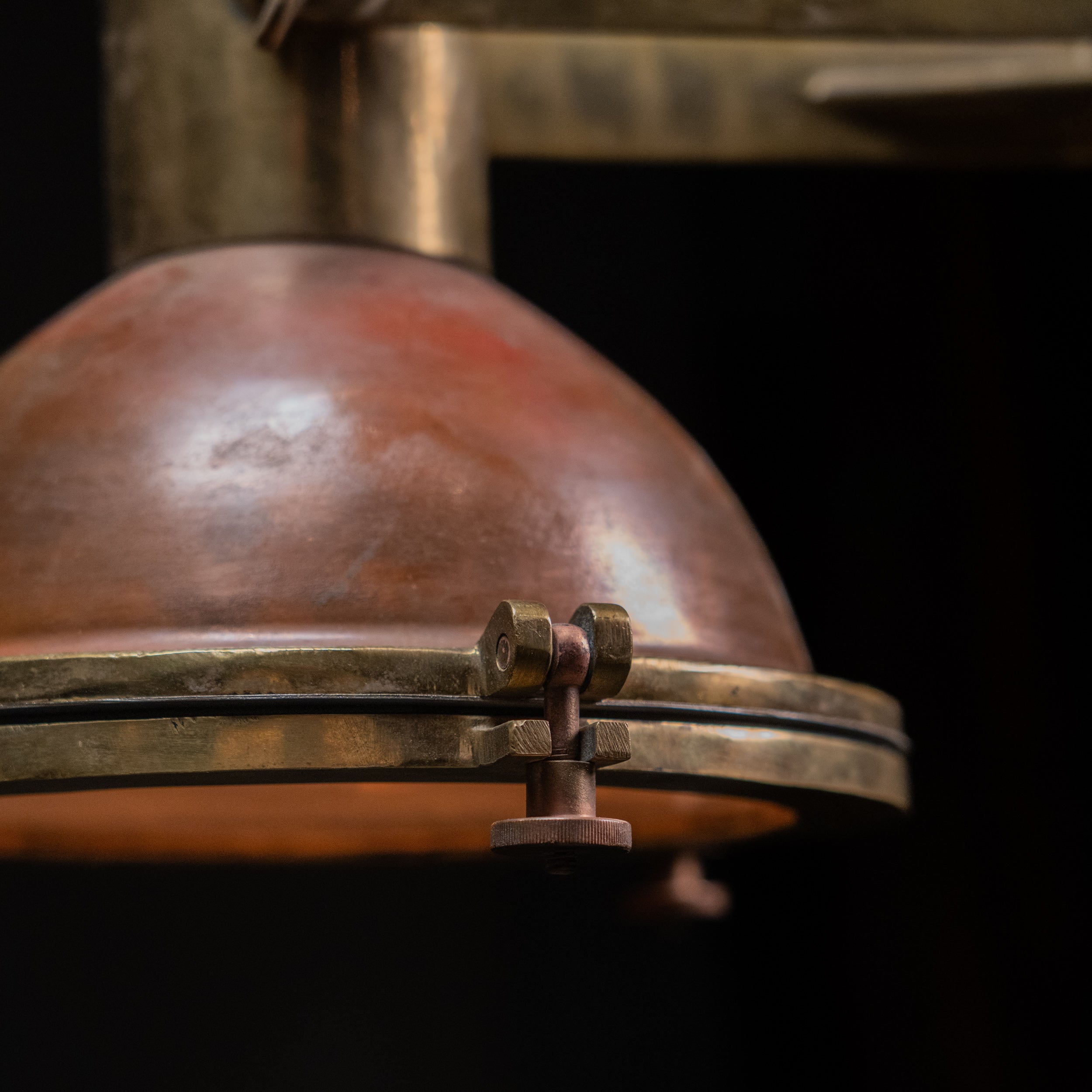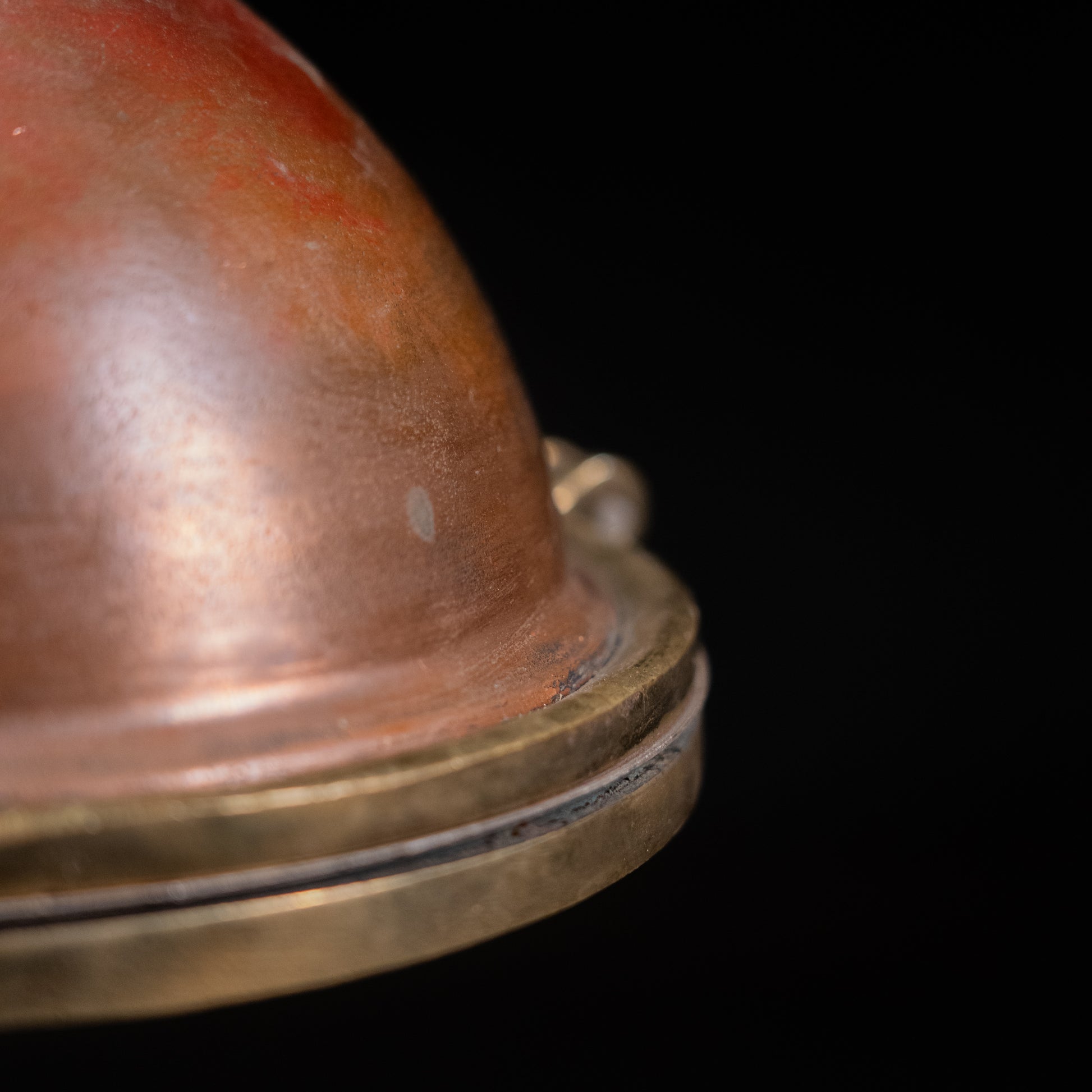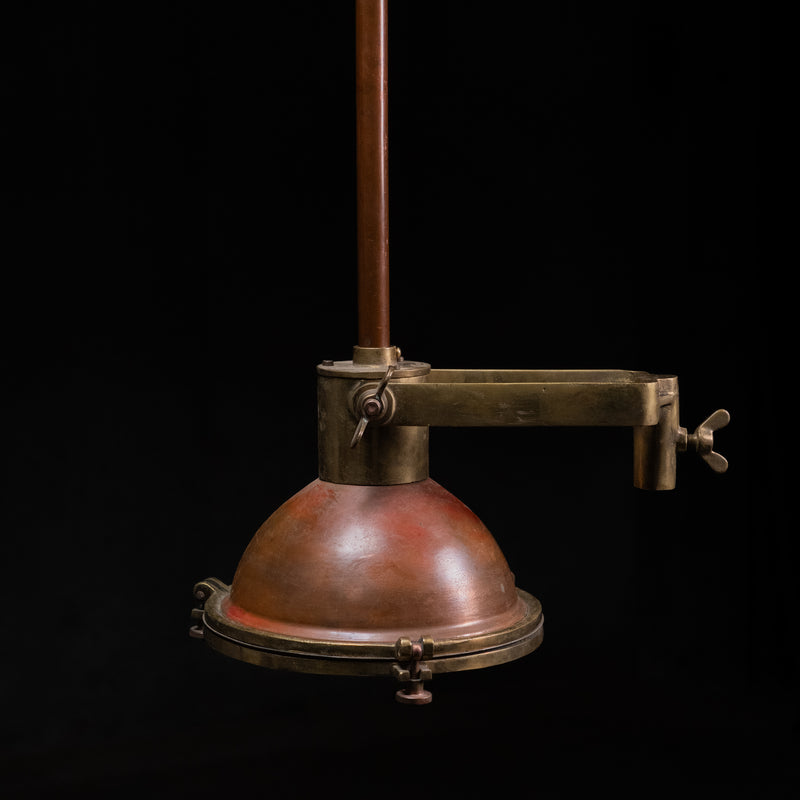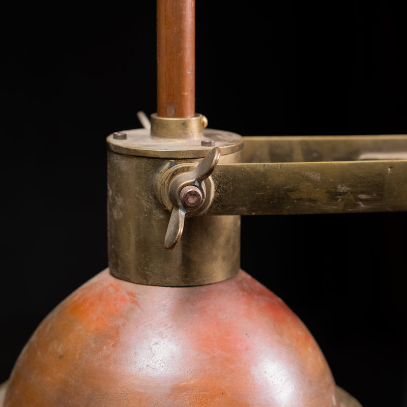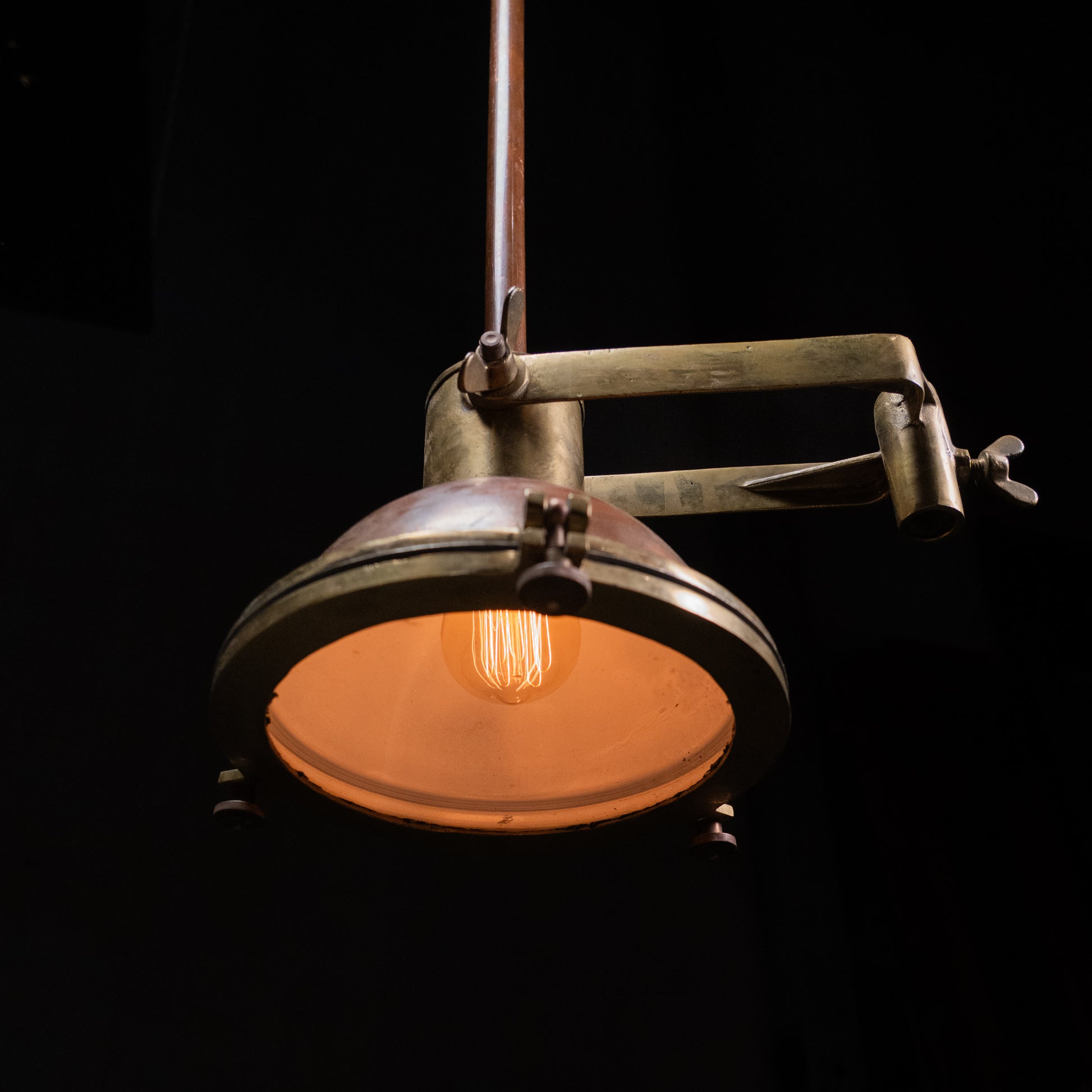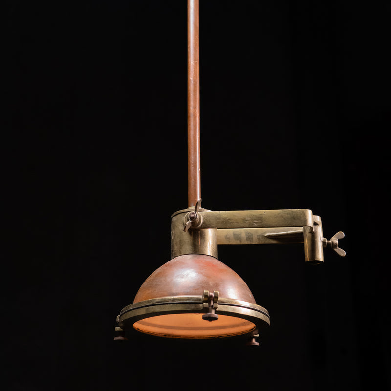Salvaged from an old ship, this solid brass and copper light with a glass protector, is extremely well made. With its original pivoting arm that we chose to leave attached for a bit more authenticity. It was likely used as a search light converted to usable pendant light.