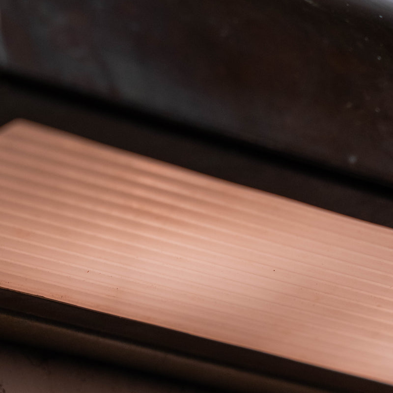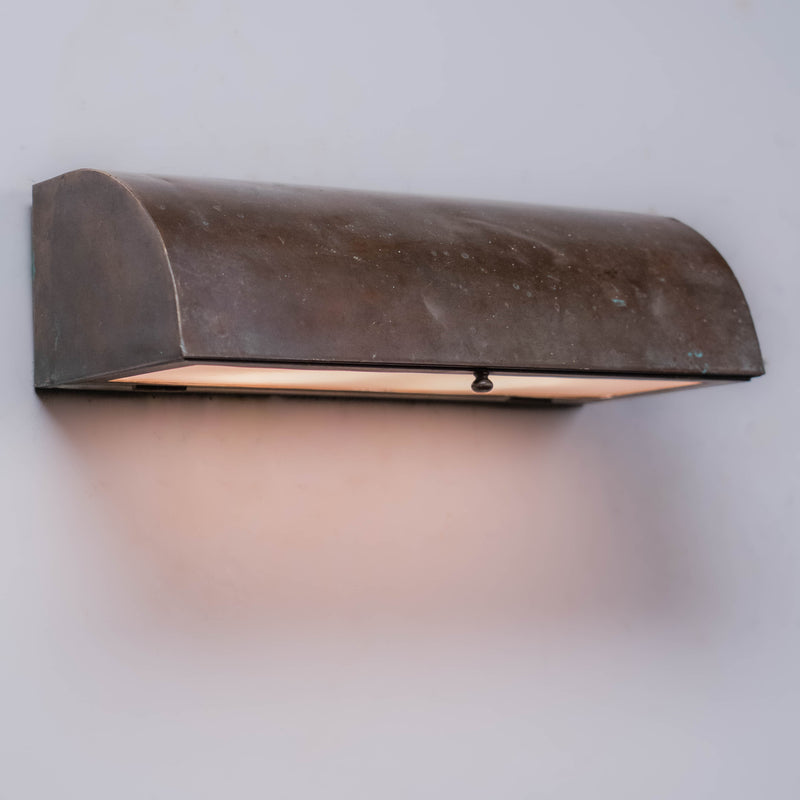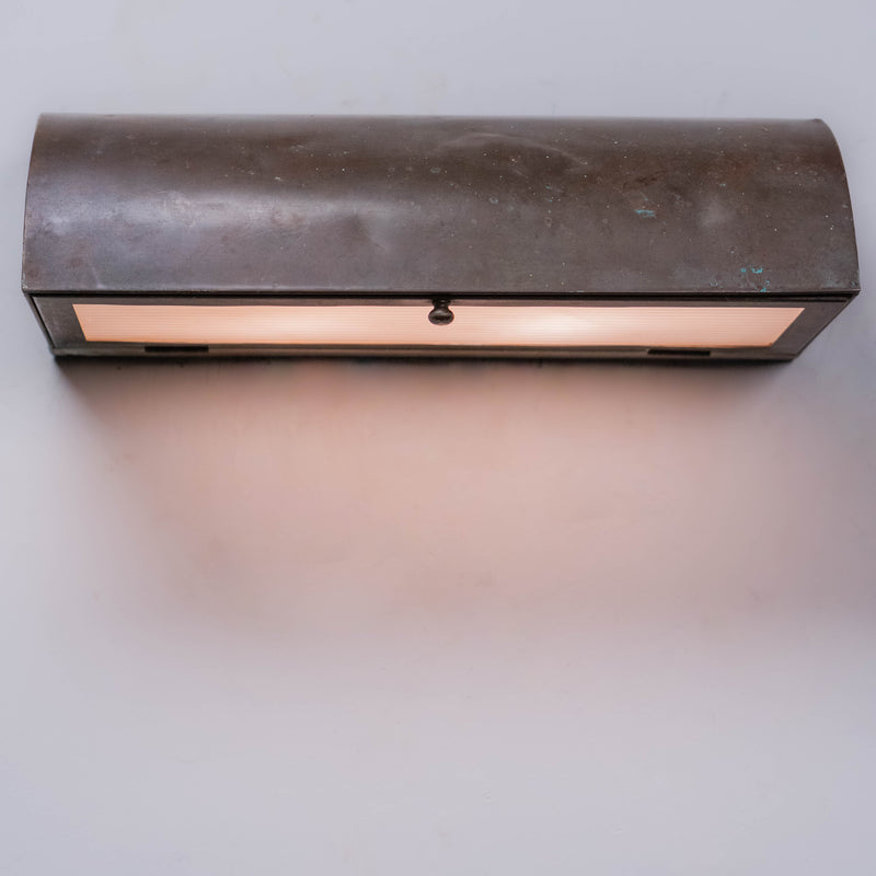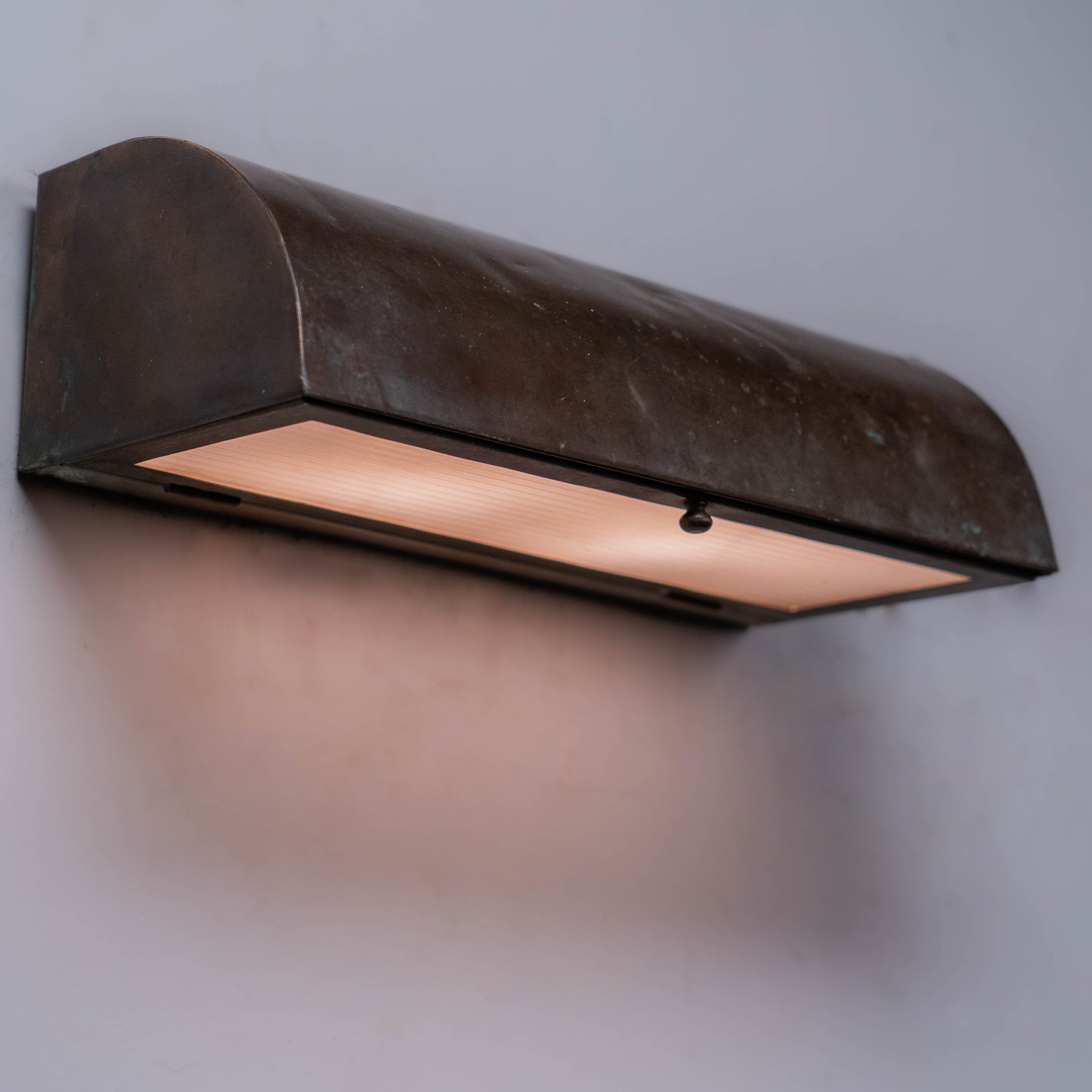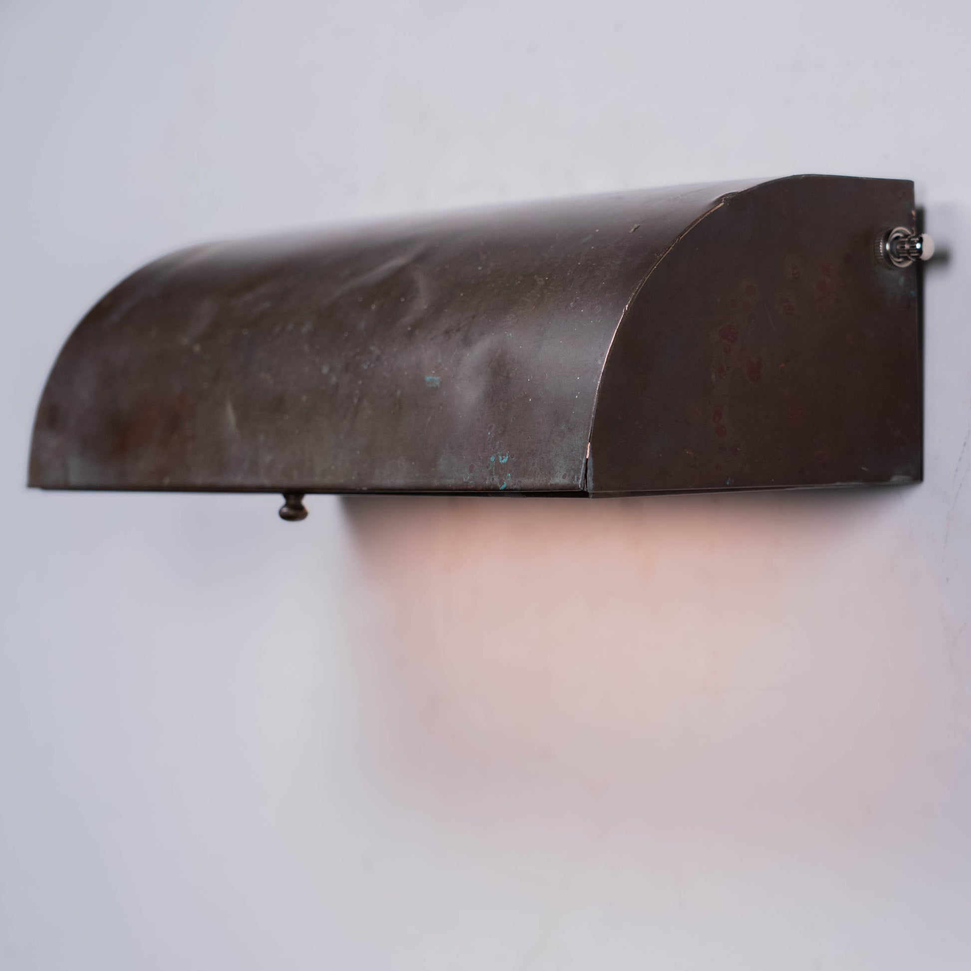 A early 20th-century wall-mounted picture or vanity light, featuring a gracefully arched oxidized copper hood with a naturally aged patina. The fixture has a strong architectural presence—clean, purposeful, and beautifully proportioned—designed to cast an even, downward wash of light. Perfect example of industrial sconce.