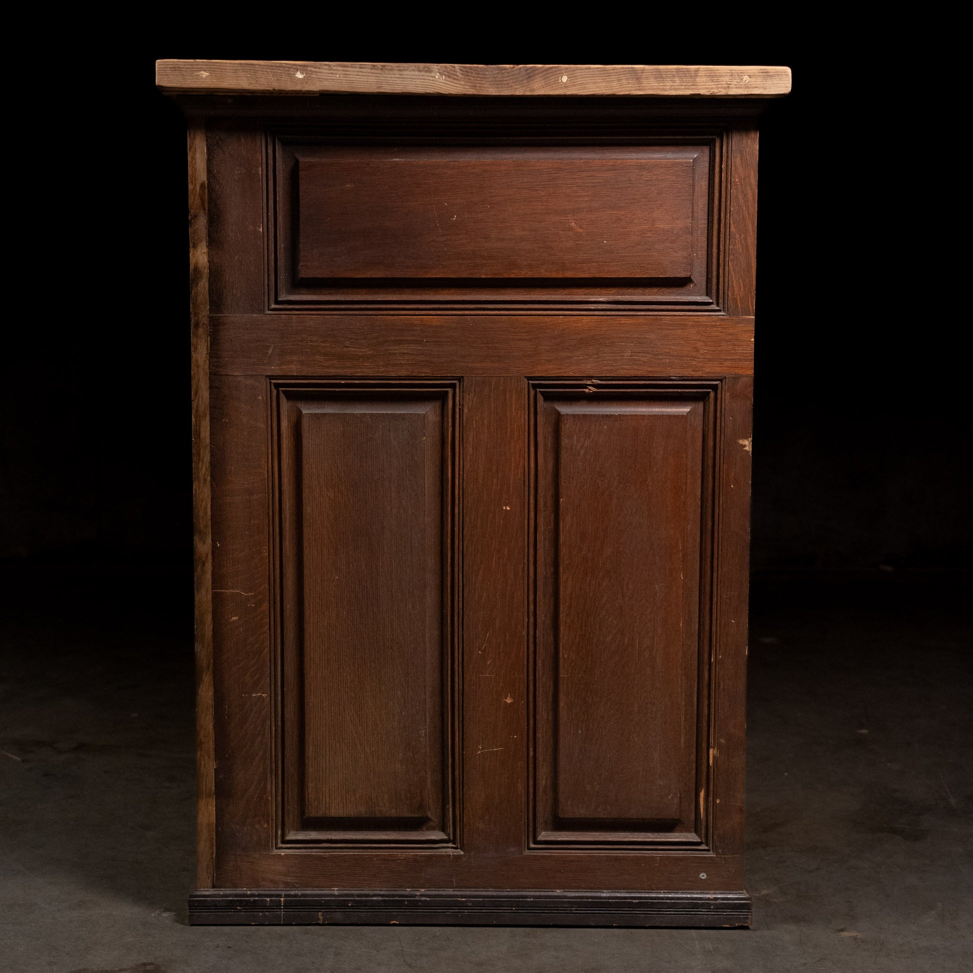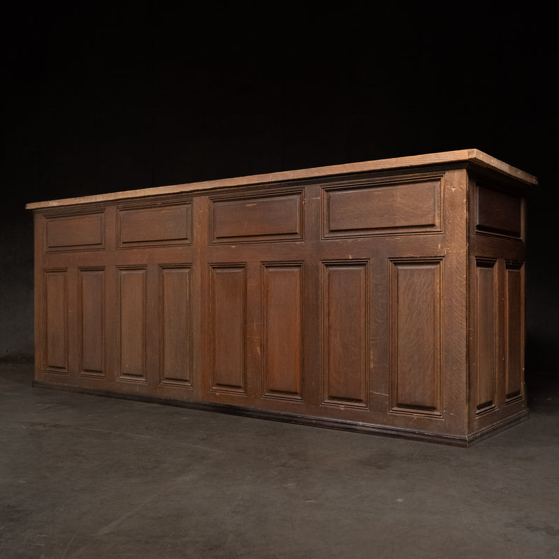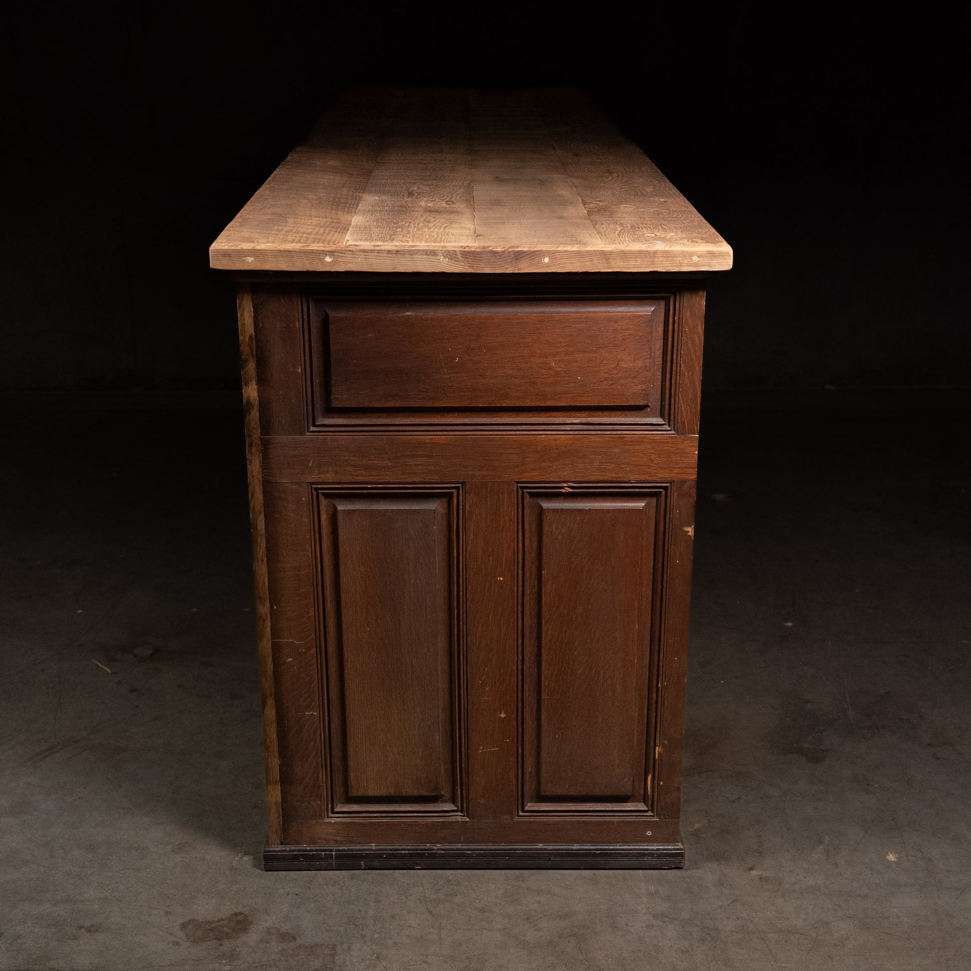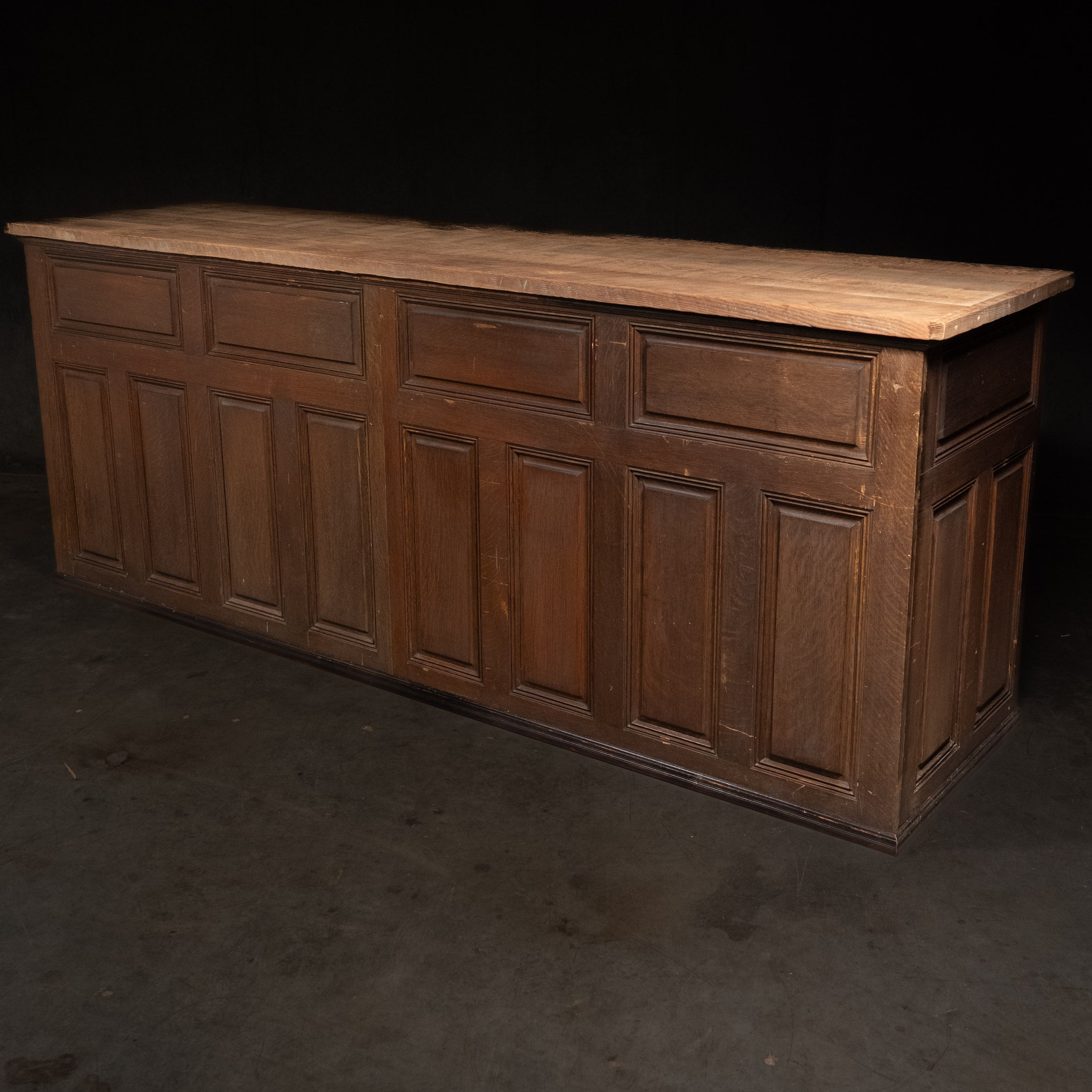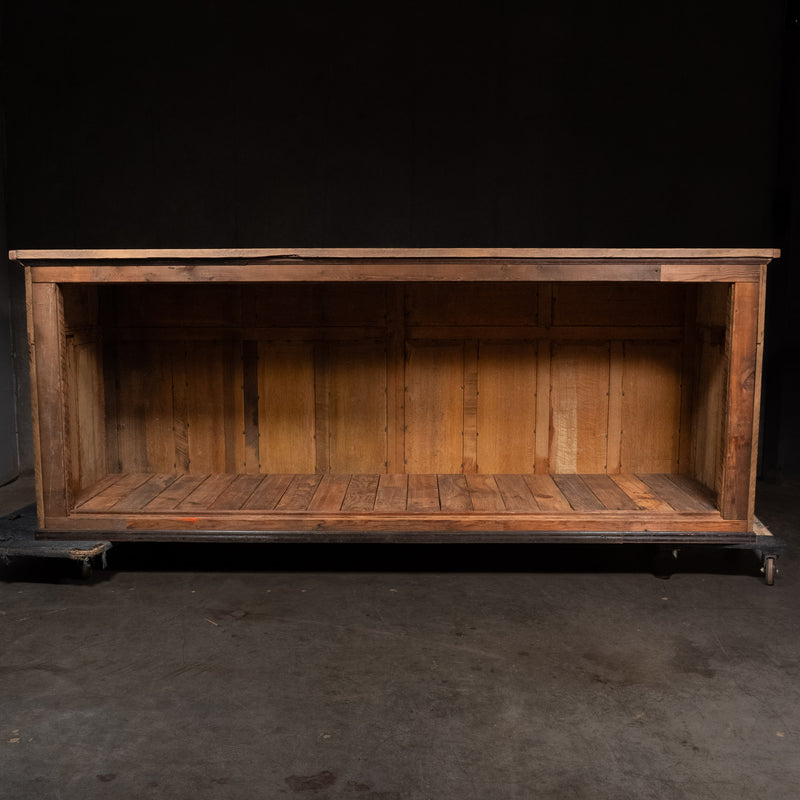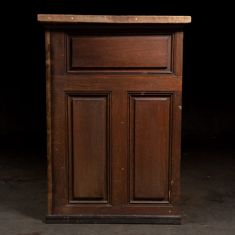 Multi panel oak counter found in a building on 27th Ave in Manhattan. We were required to take the piece apart in order to get it out of the building. Panels retain an old finish with a new solid reclaimed wood top.