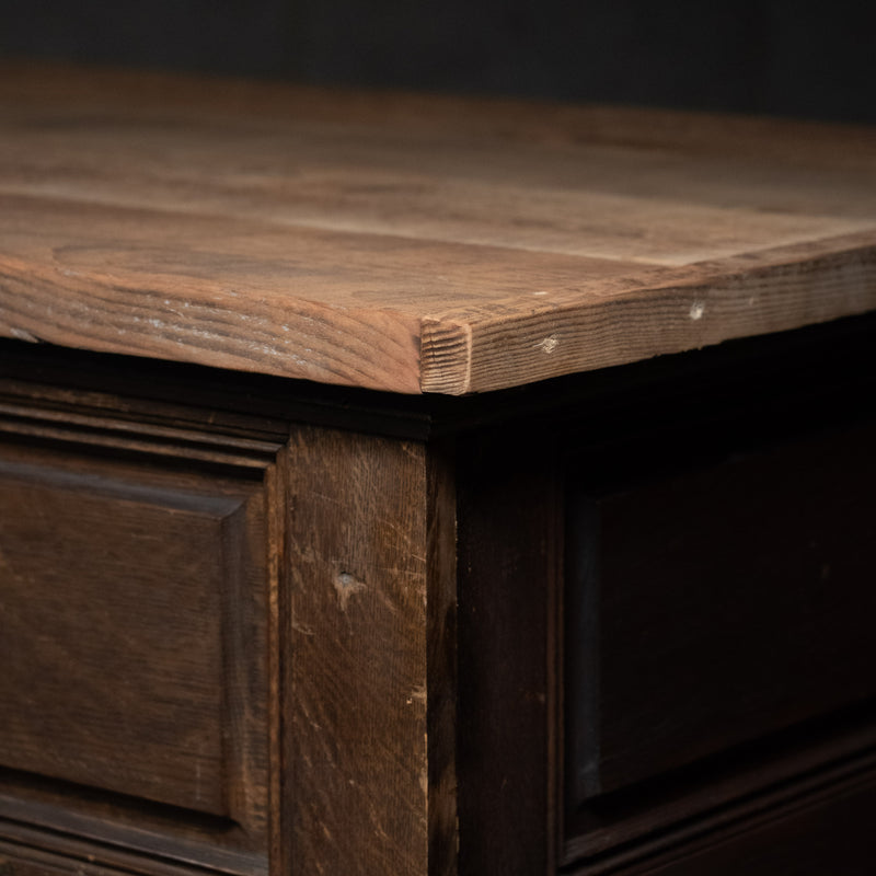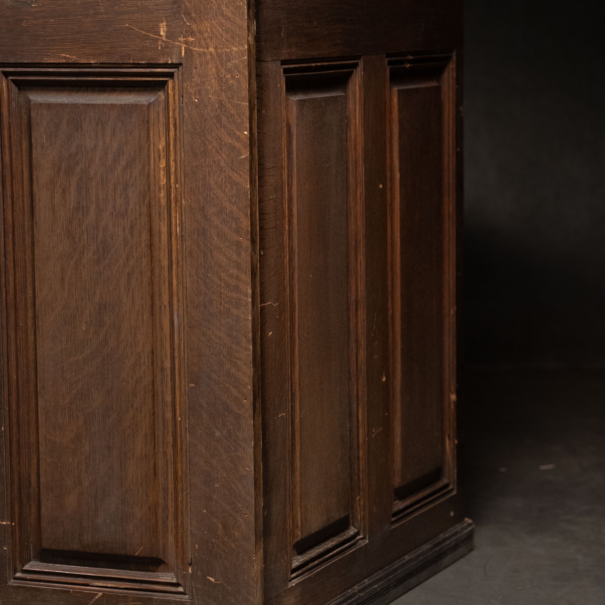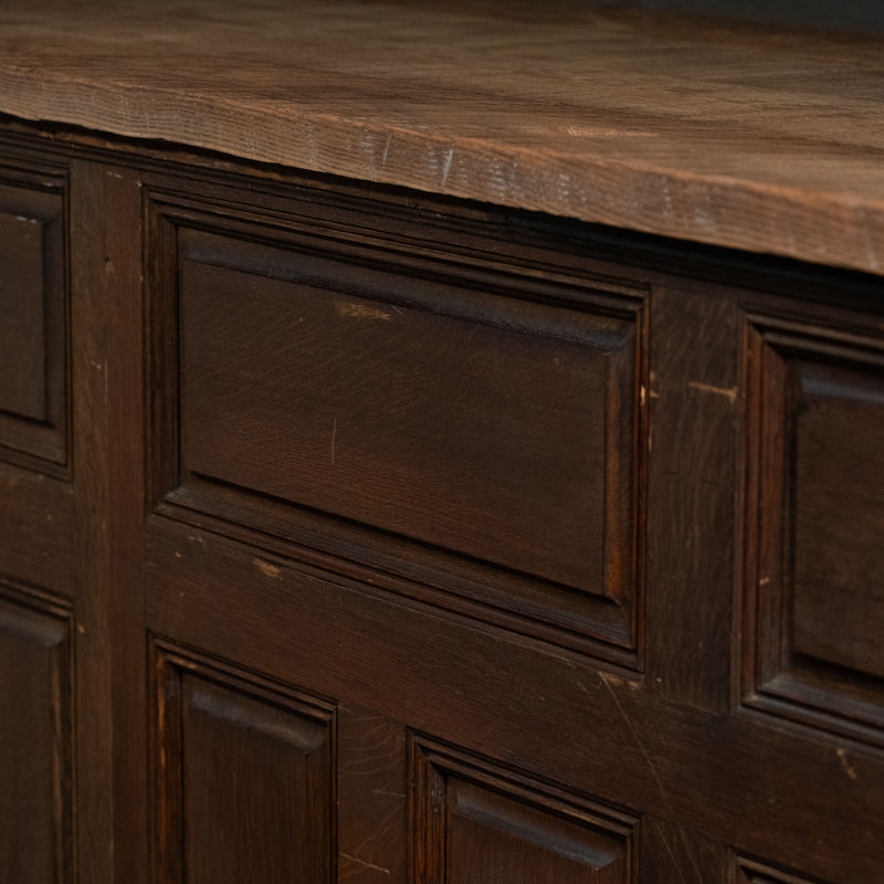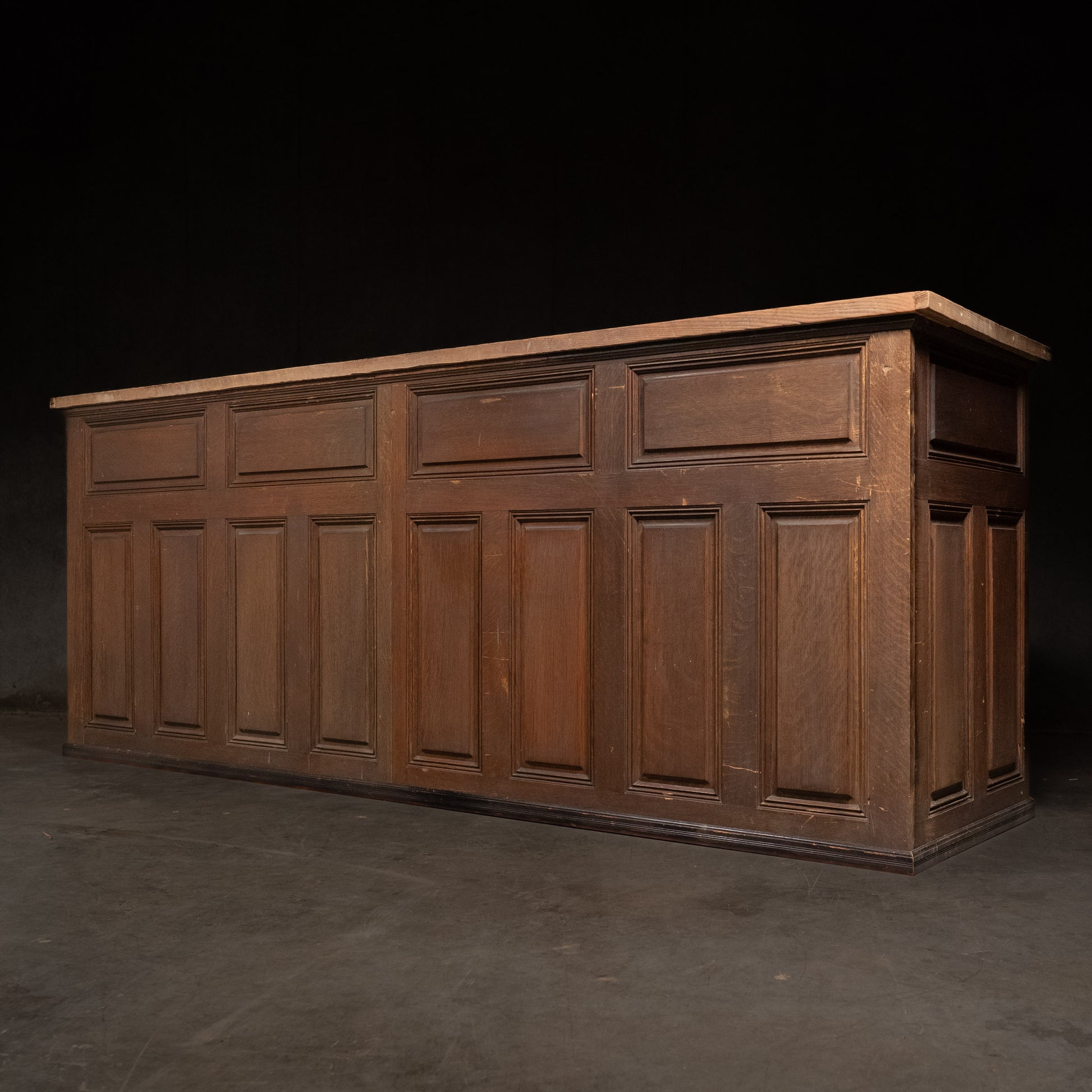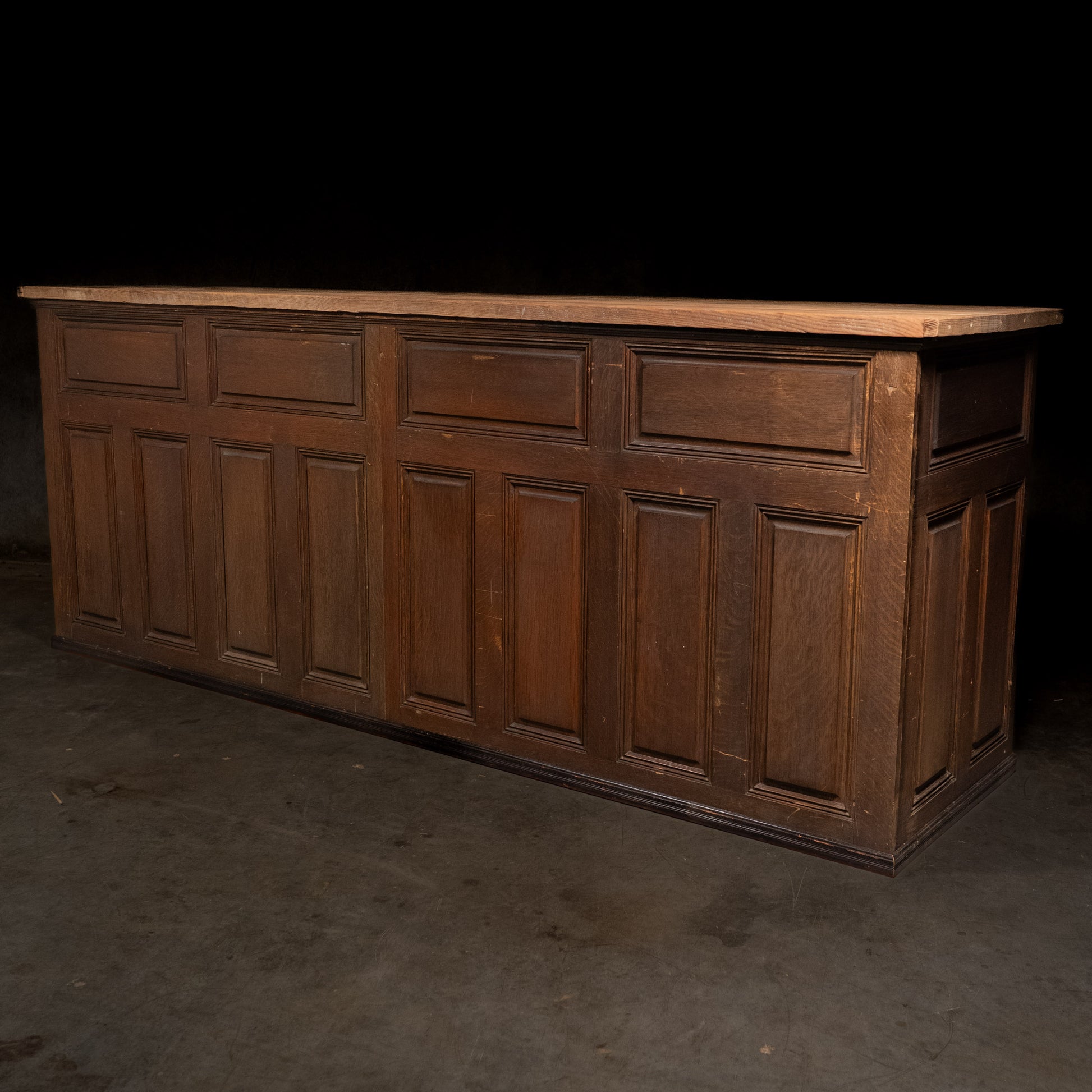 Multi panel oak counter found in a building on 27th Ave in Manhattan. We were required to take the piece apart in order to get it out of the building. Panels retain an old finish with a new solid reclaimed wood top.
