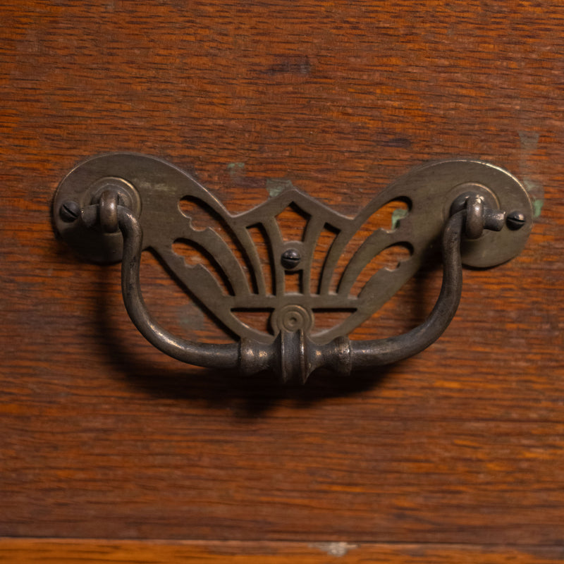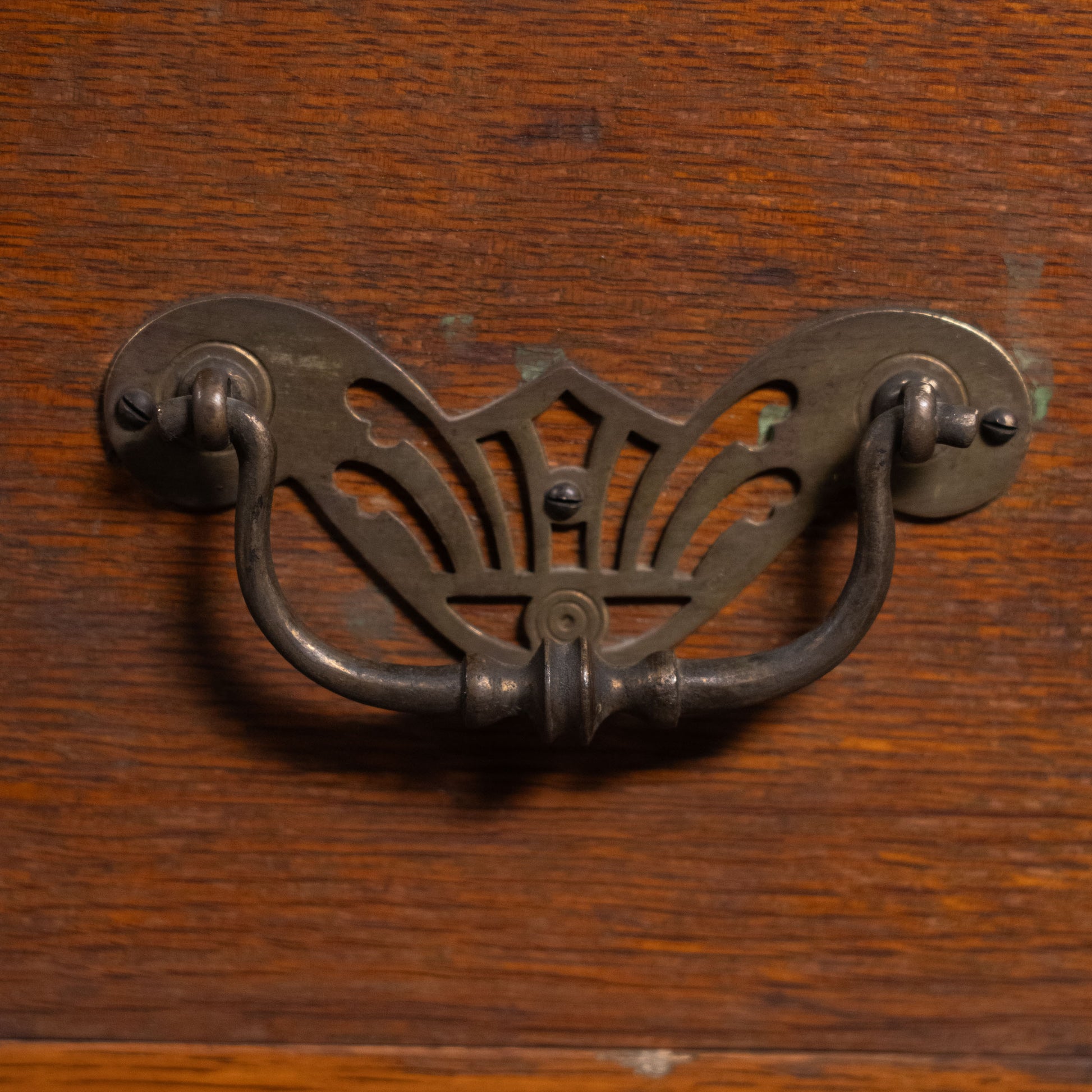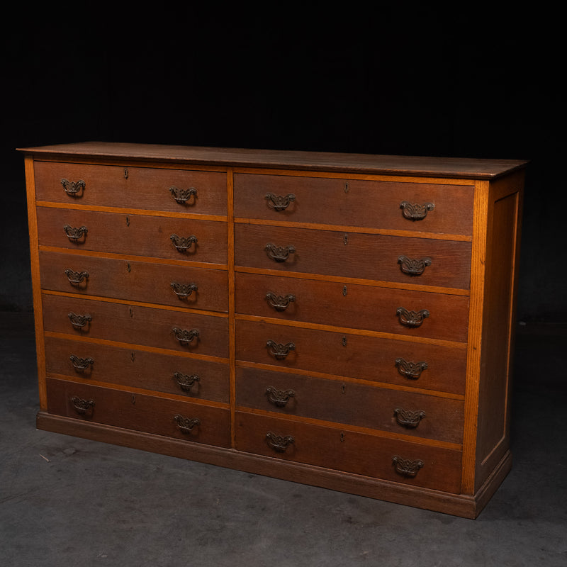 A handsome antique oak 12 drawer cabinet dating to the late 19th century, offering both practical storage and timeless character. Crafted from solid oak, the cabinet features twelve working drawers with original brass art nouveau pulls, making it ideal for organizing documents, collections, clothing or craft supplies.