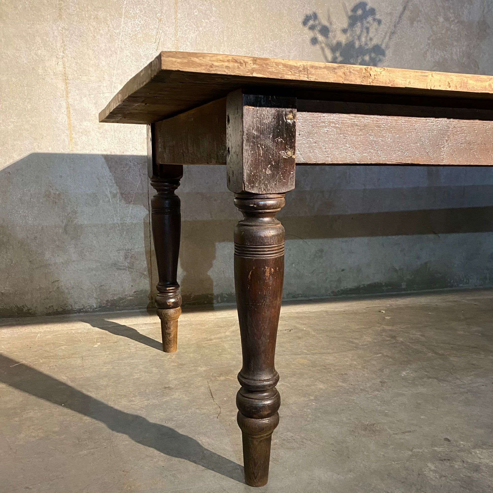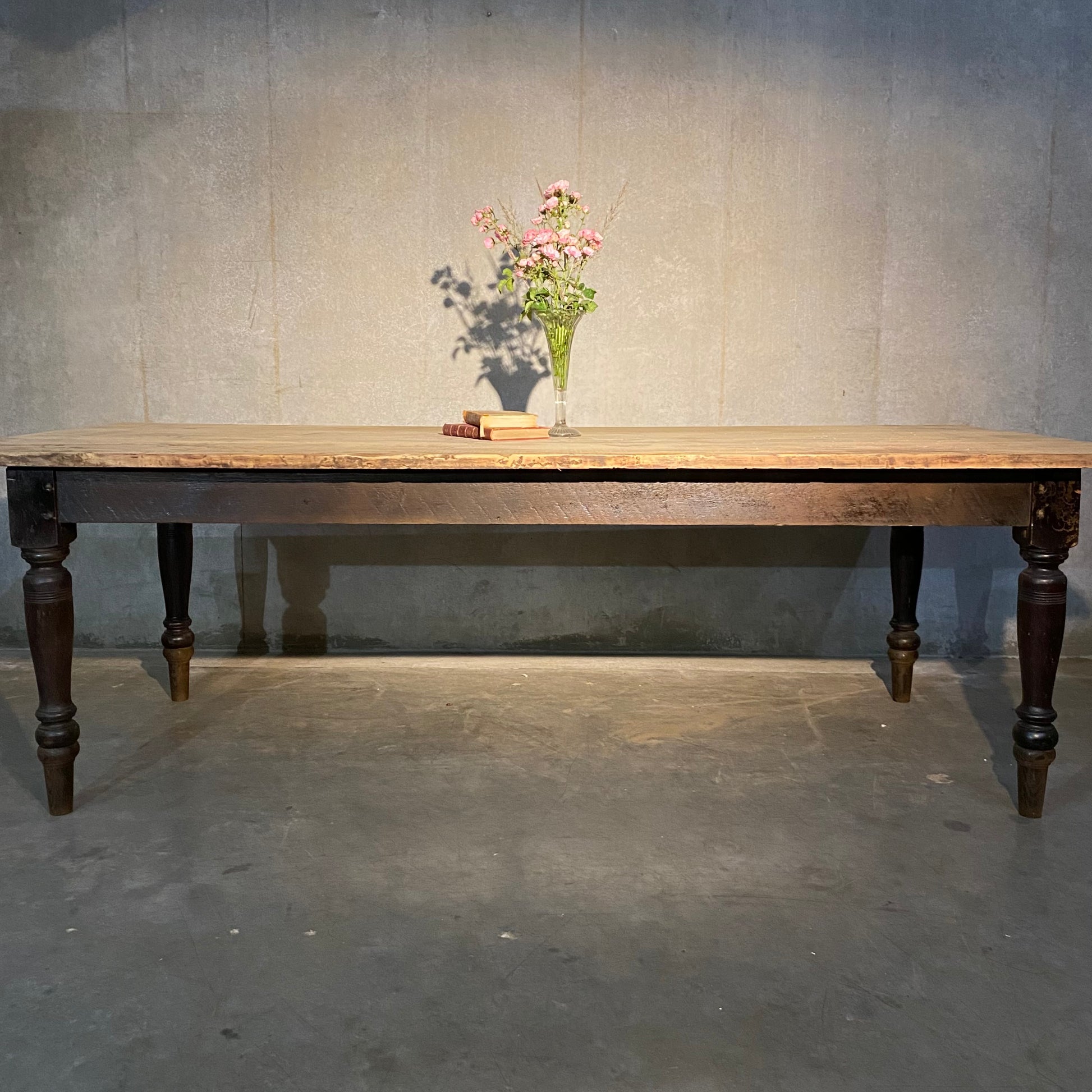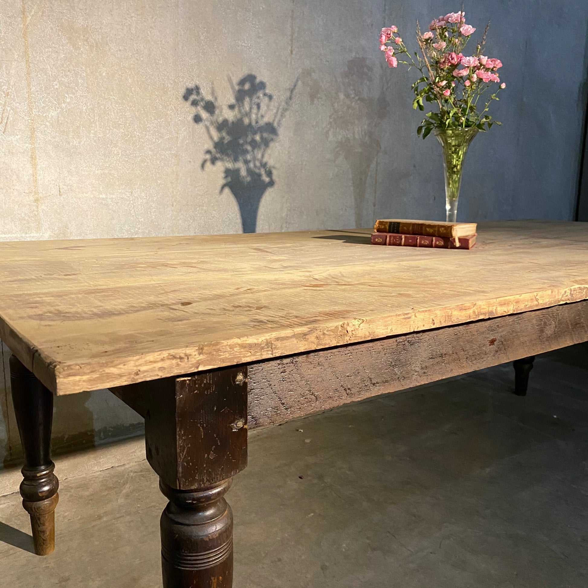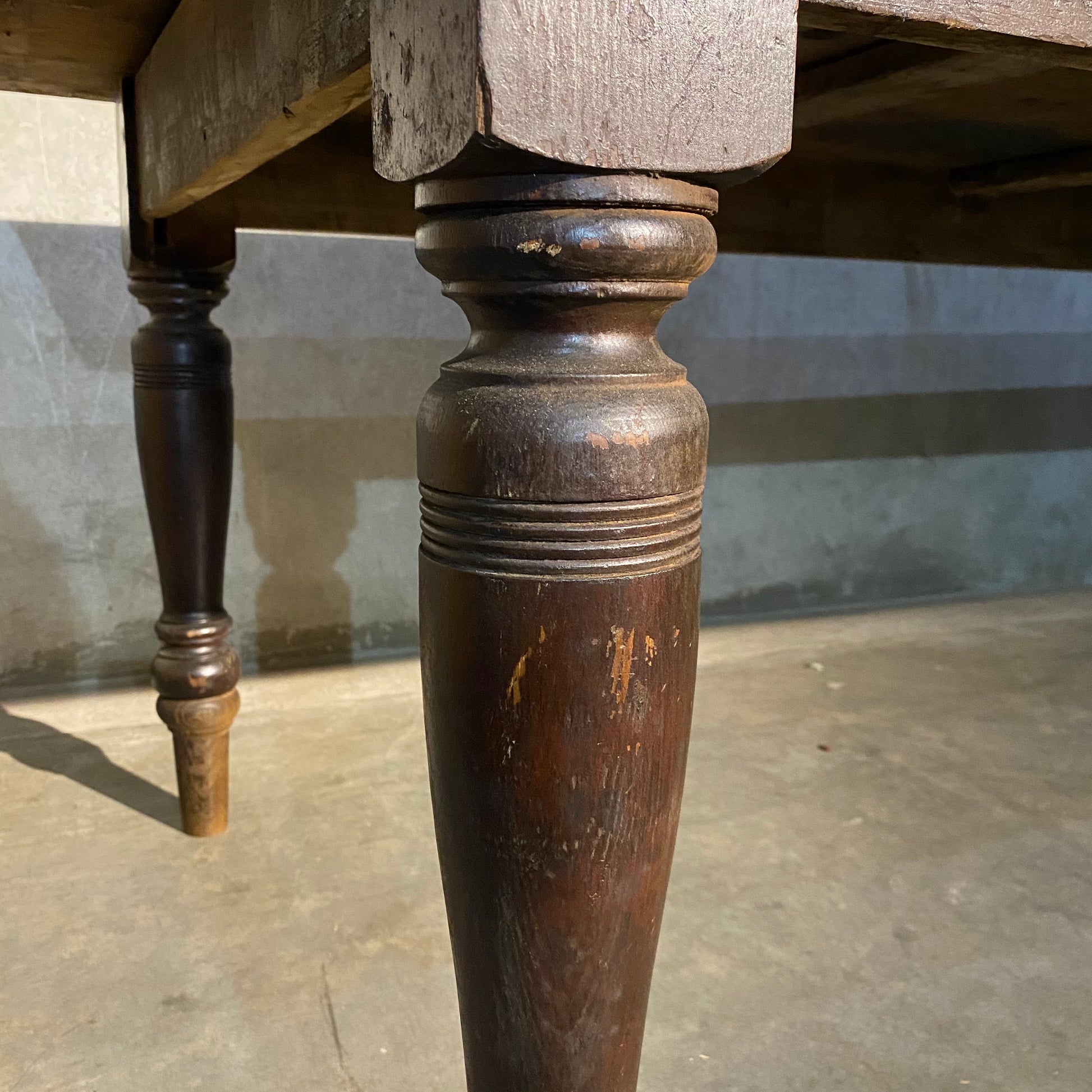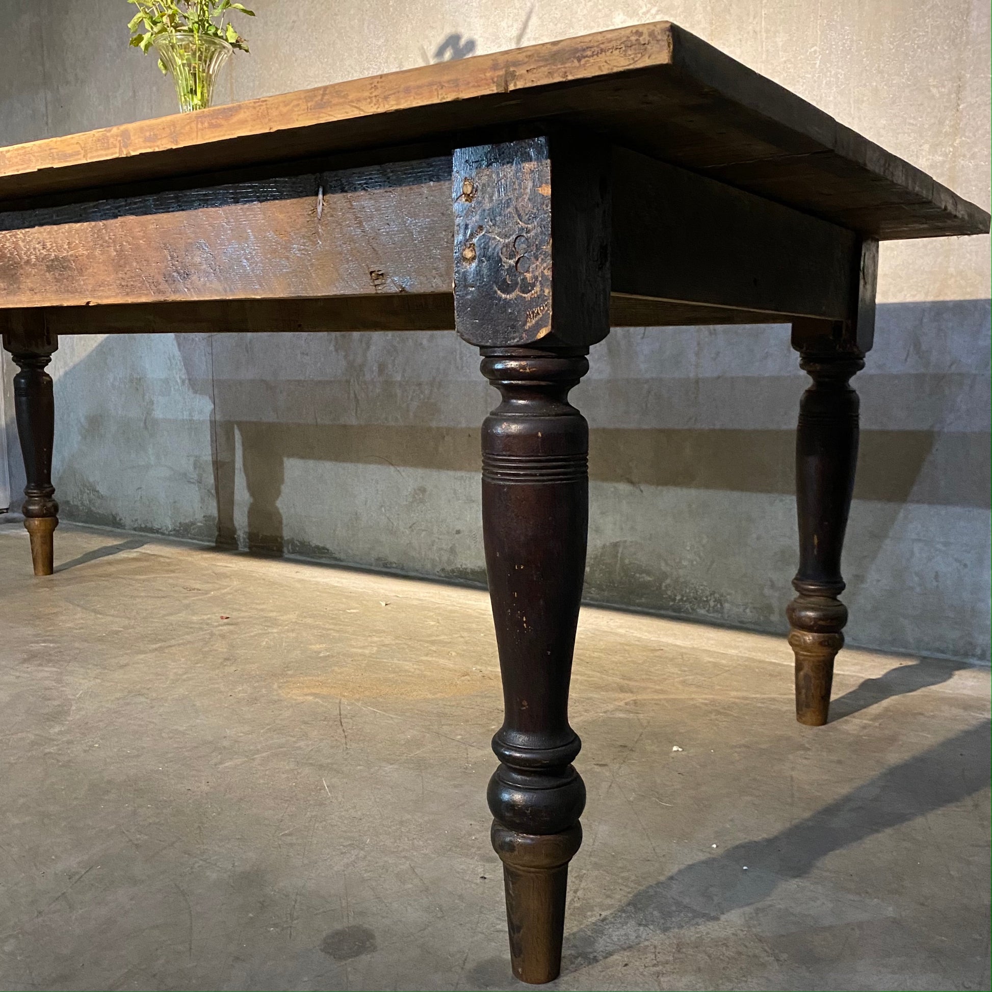A fine example of a rescue . We found this table in pieces with a great top and legs with some parts of the skirt requiring restoration . Priced accordingly this is great value for a large country table With nice u touched worn wide top. We left the item in unfinished condition .