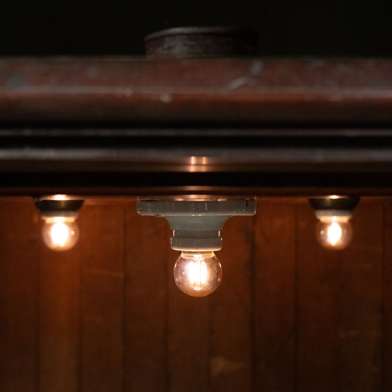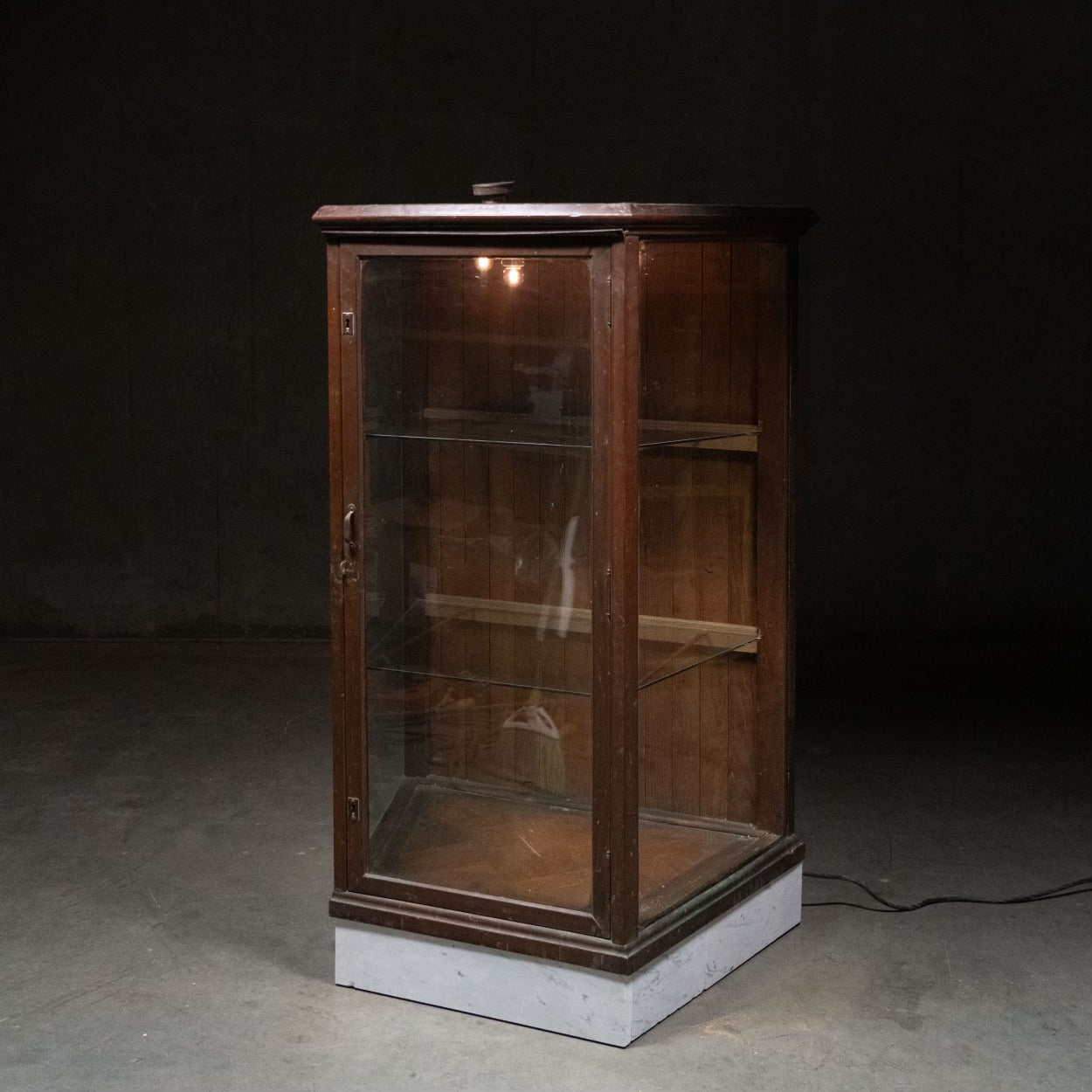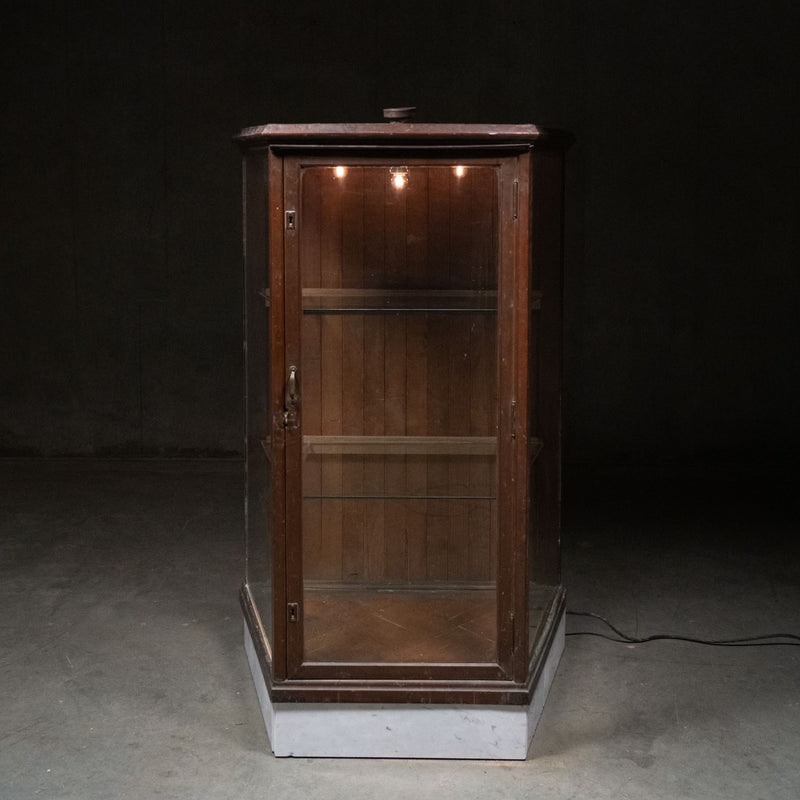 An American full clawed copper display case with marble kick and glass shelves ….this was part of the inventory of Brooklyn display case Co. and was likely used for tobacco or liquor. This piece is particularly rare because of its unique lighting within it that is still fully functioning.