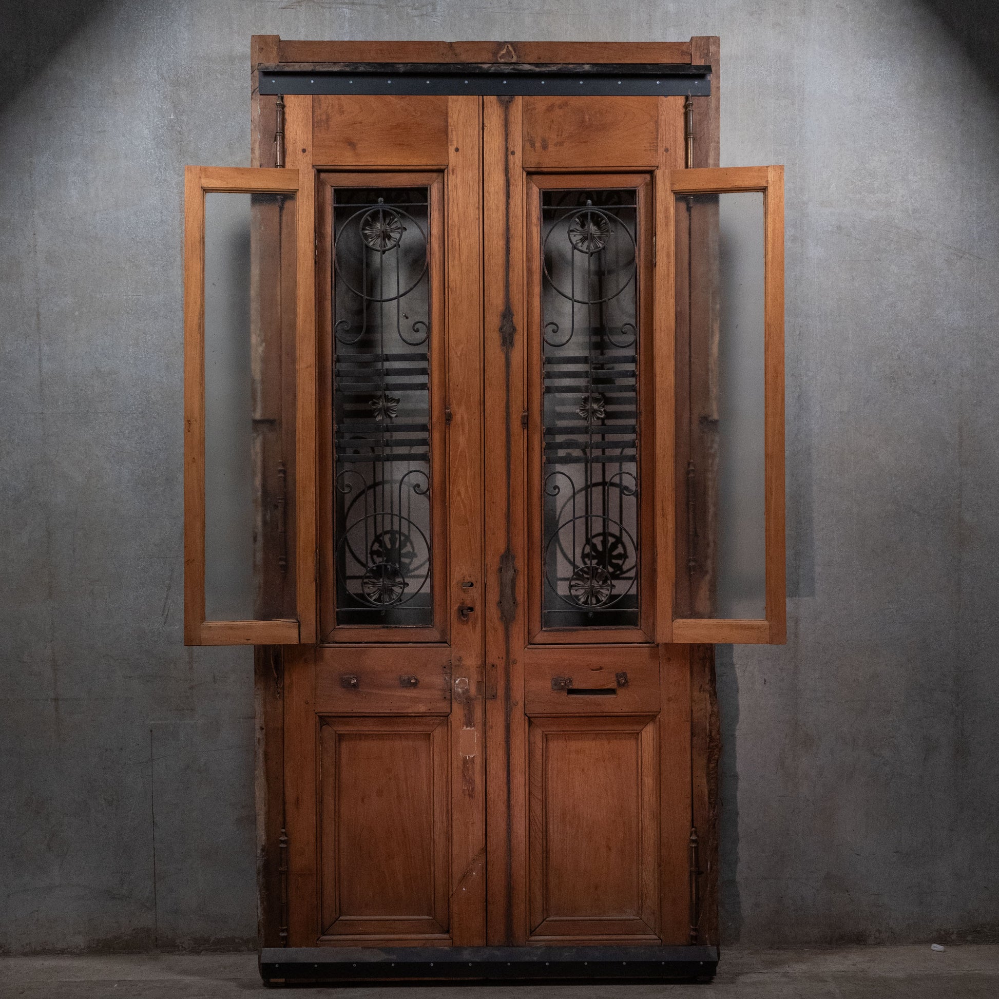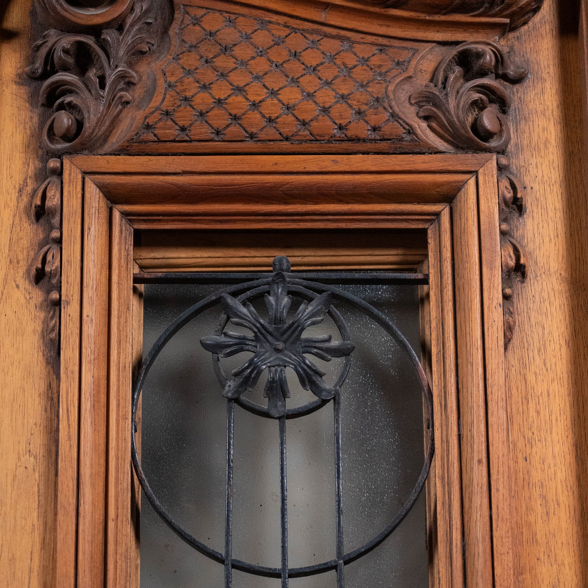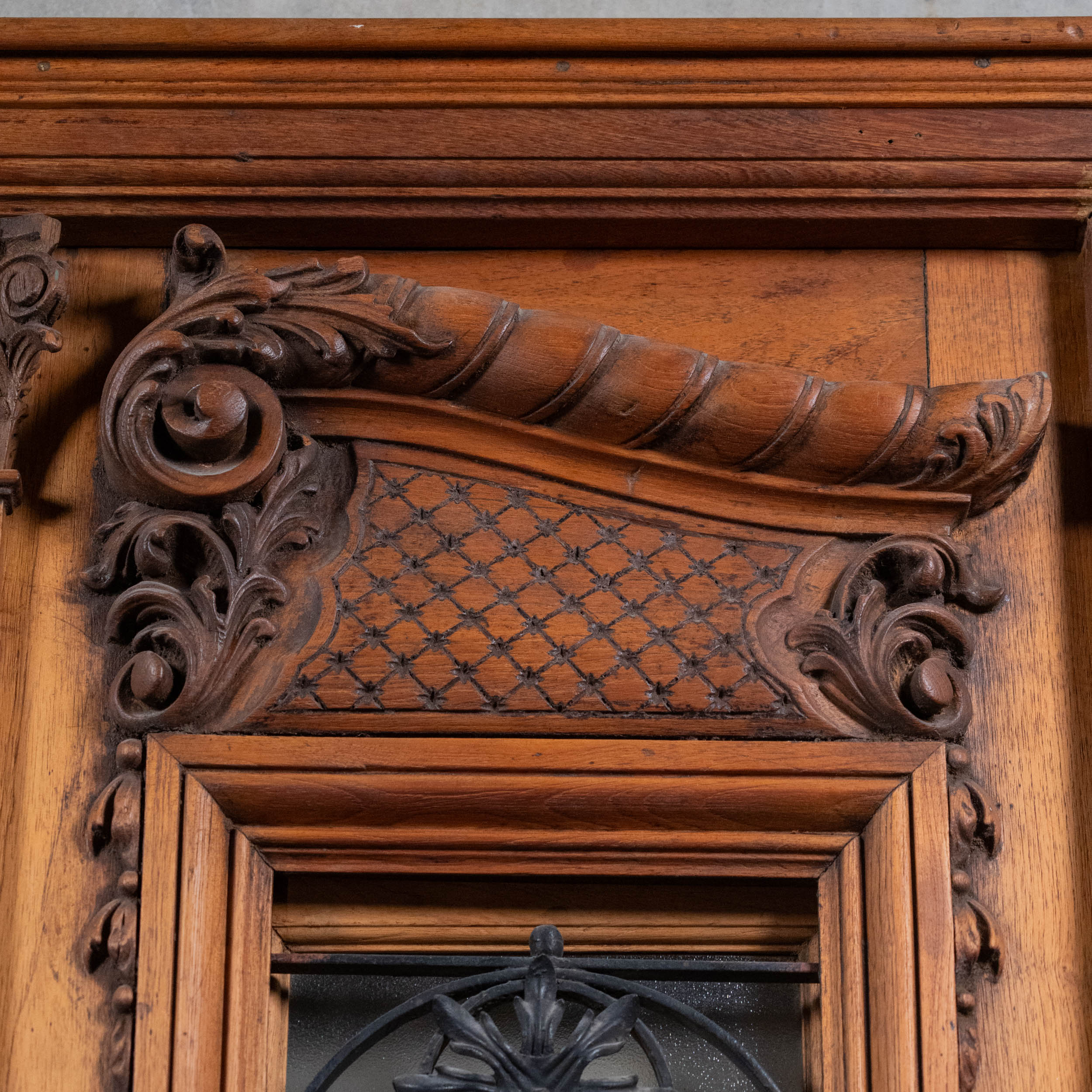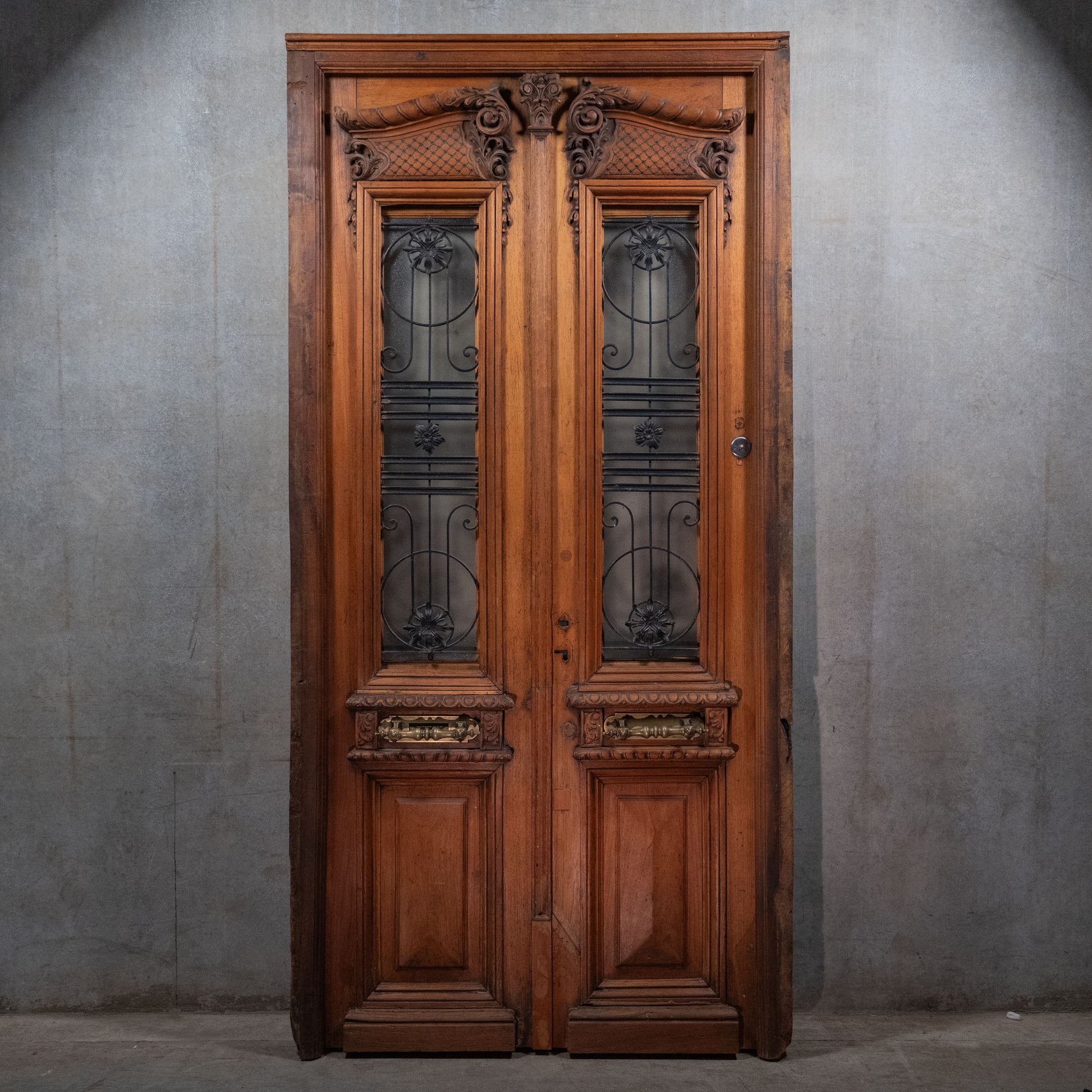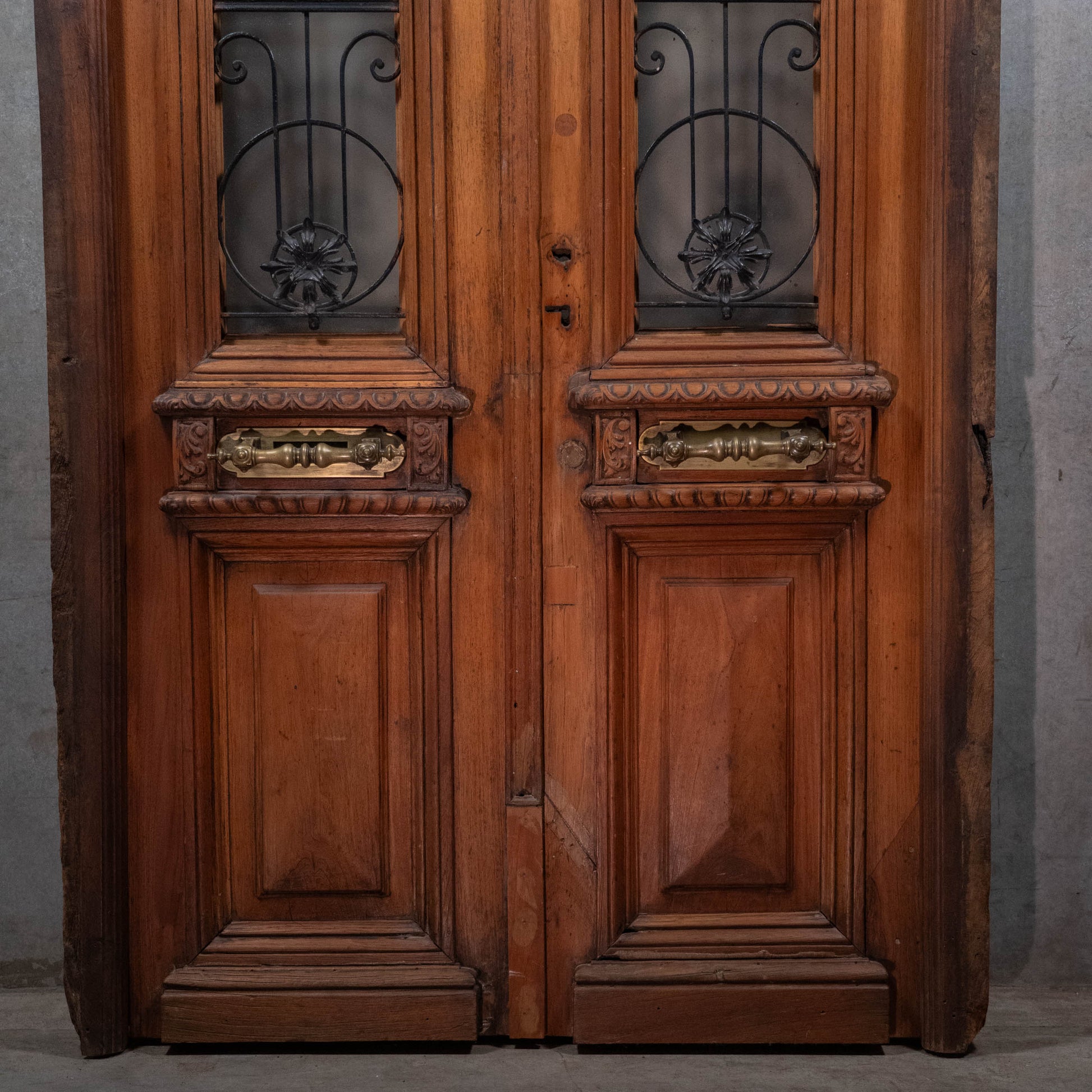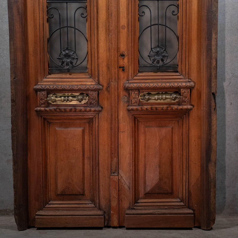 An incredible set of walnut manor or chateau doors from France. The doors rest in their original frame. Its carved details, opening window panes and original brass hinges are all in fantastic patina. A very rare find on Canadian soil.
