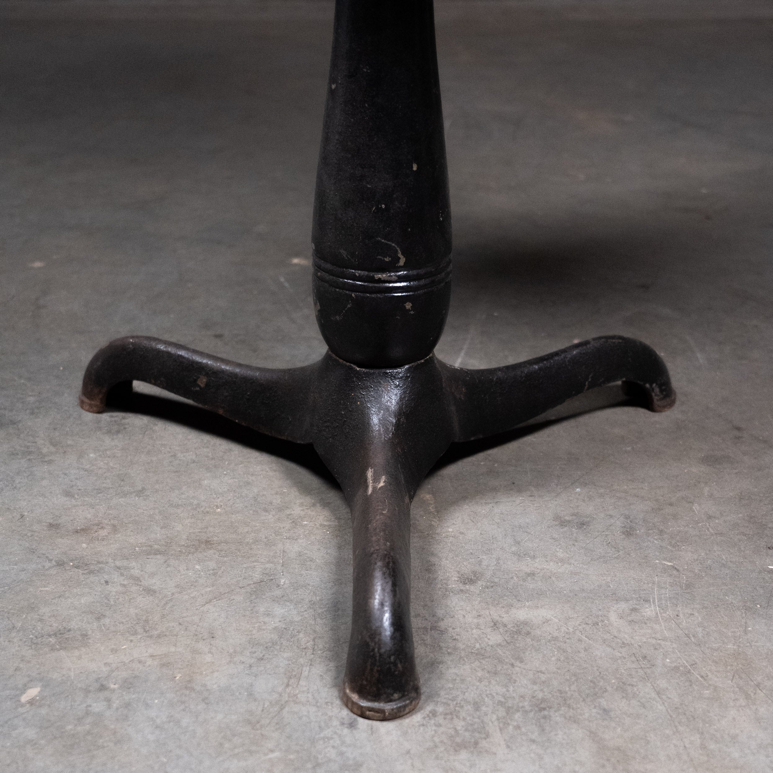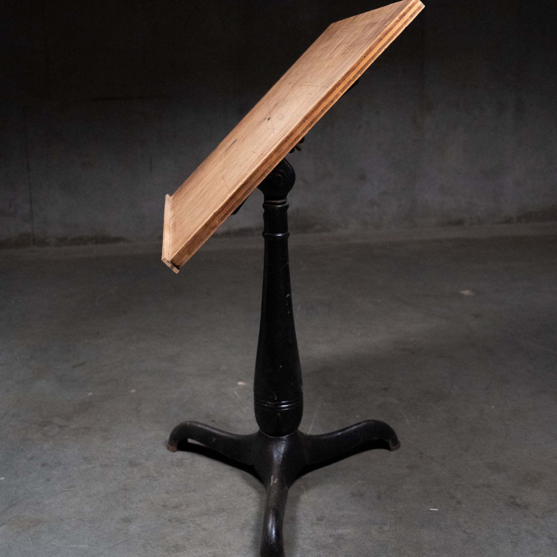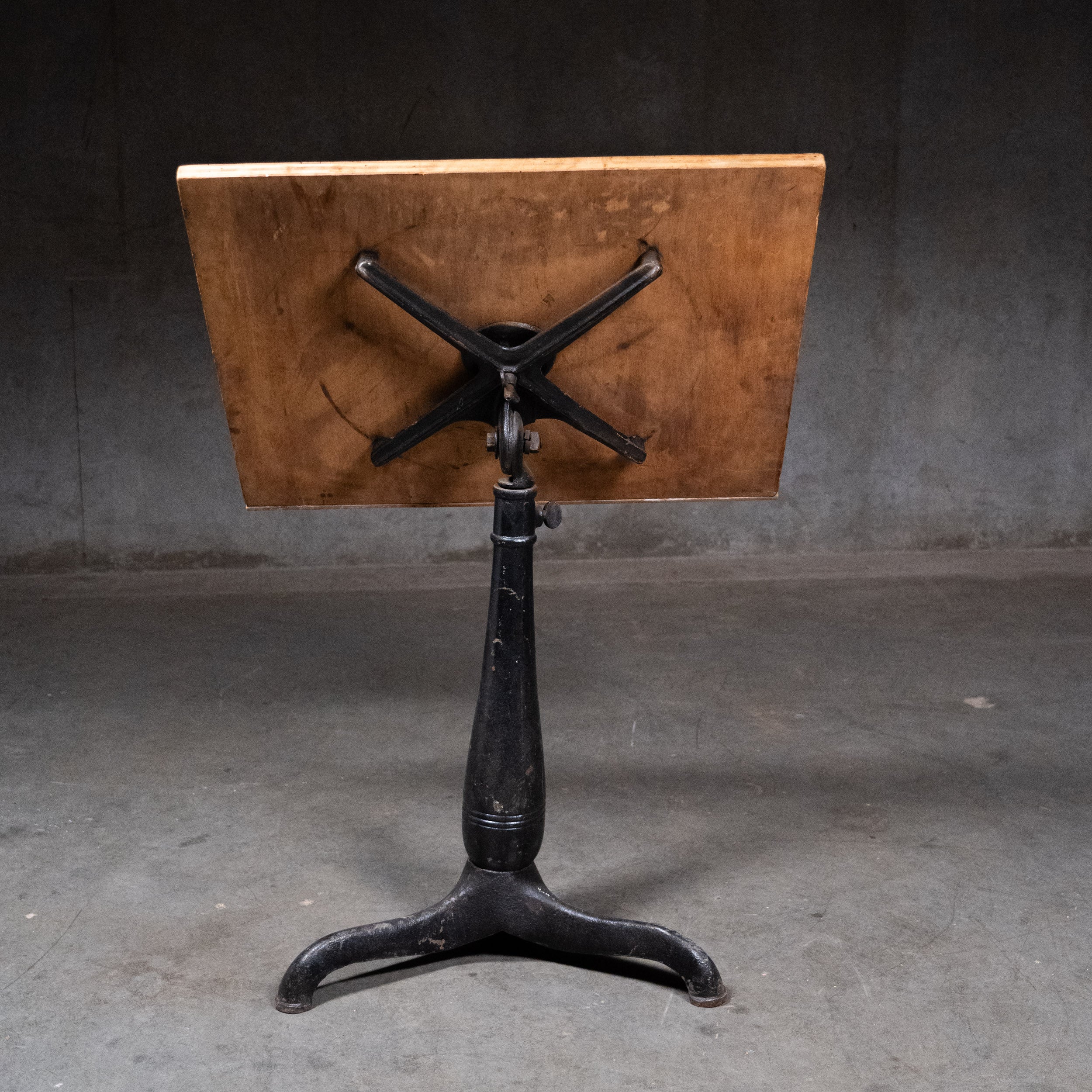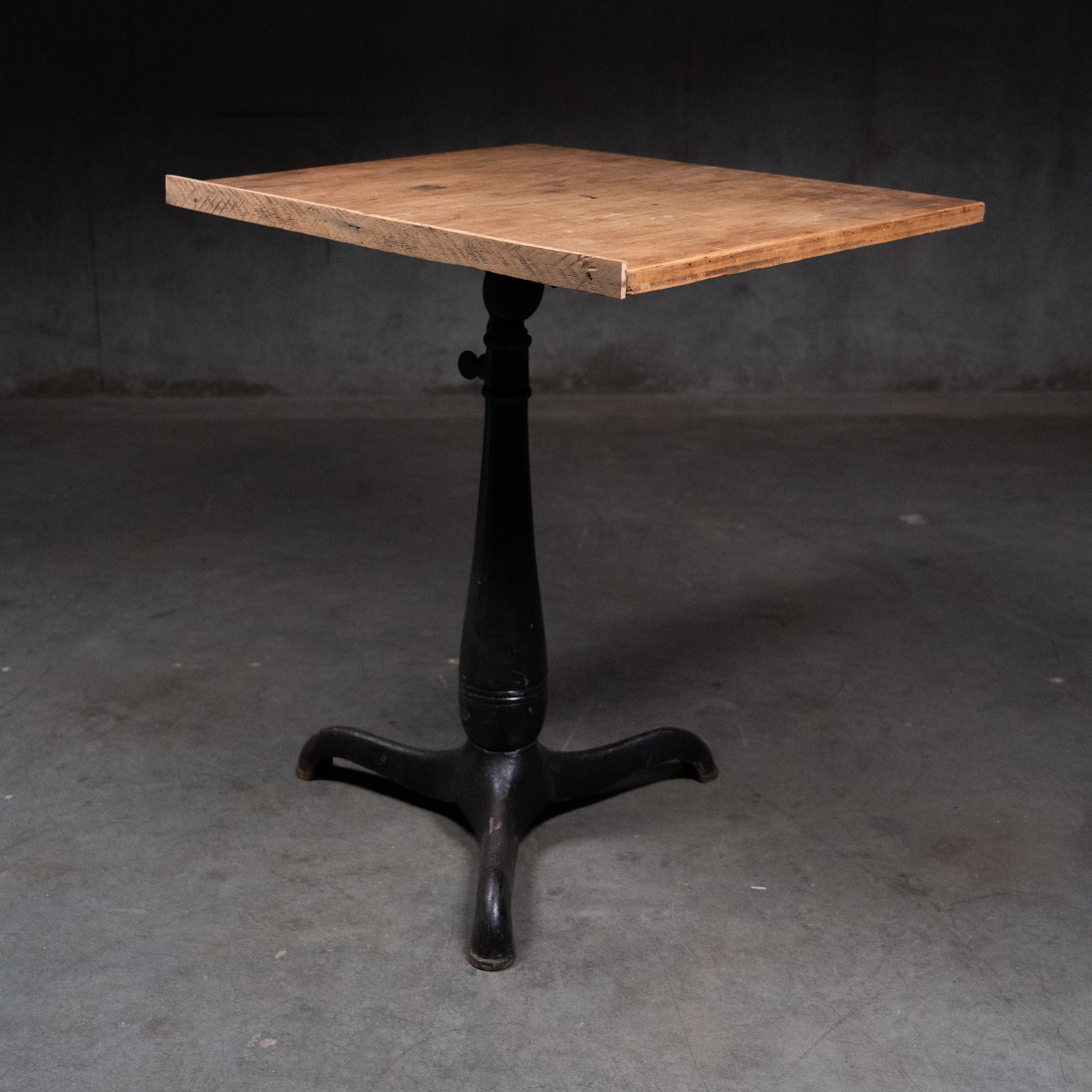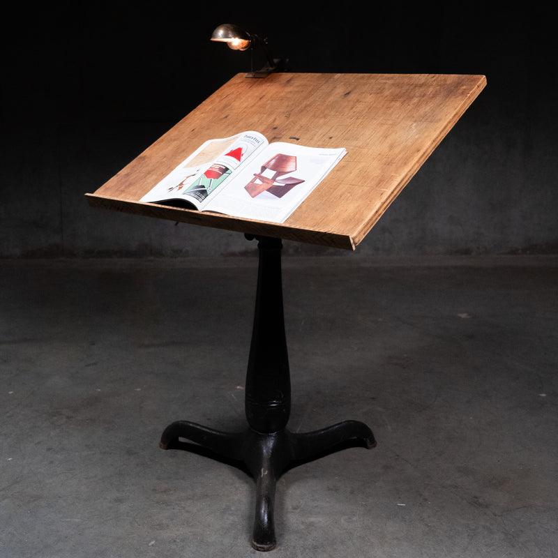 Original cast base Adjustable height drafting table with pivoting top . This would also be a great hostess stand or bar top table .