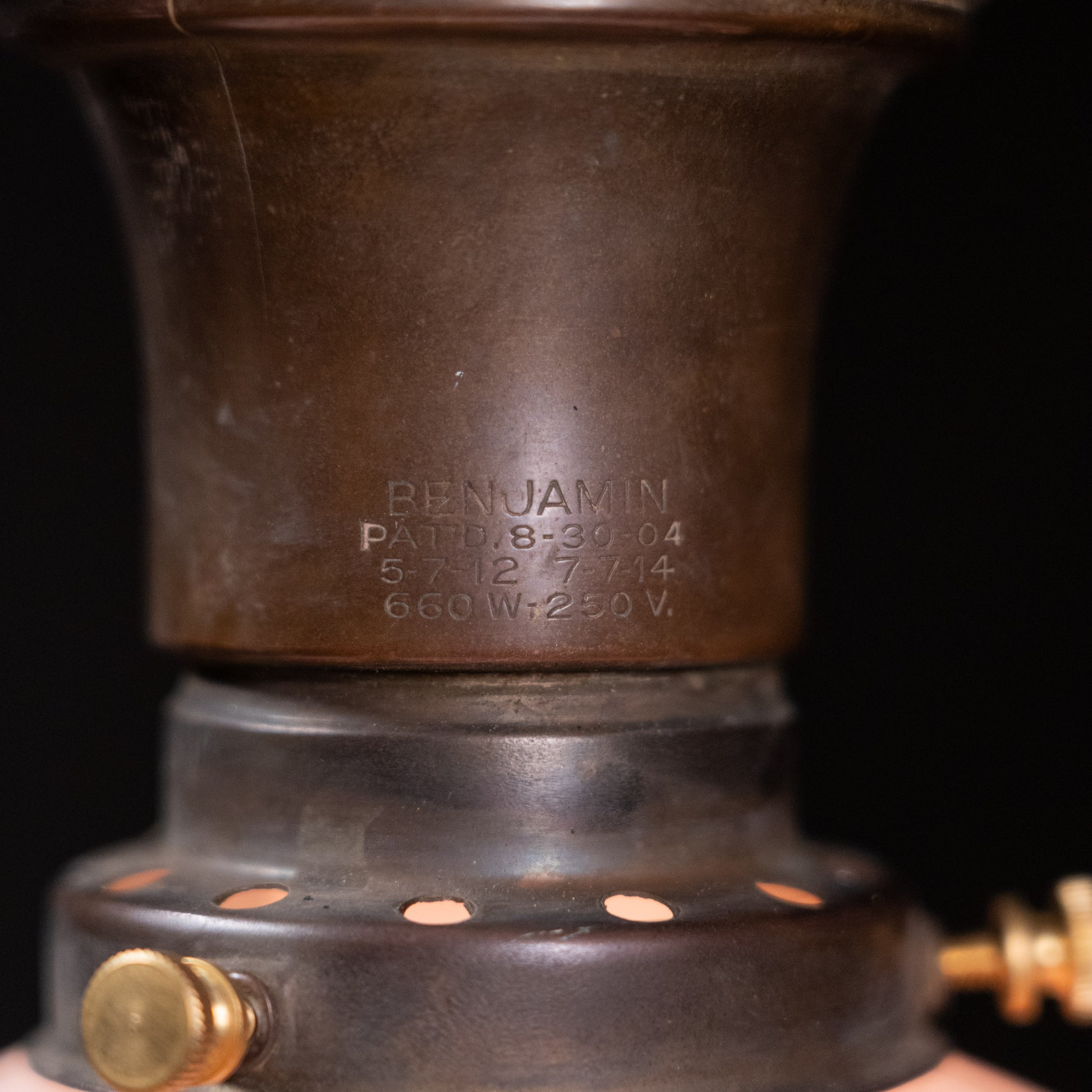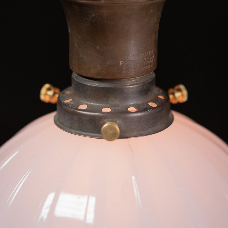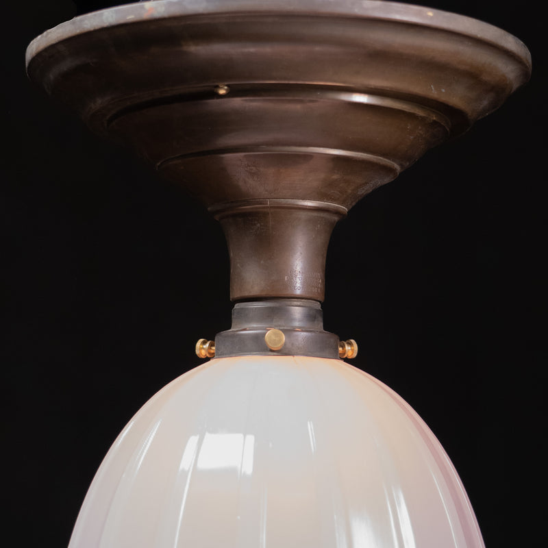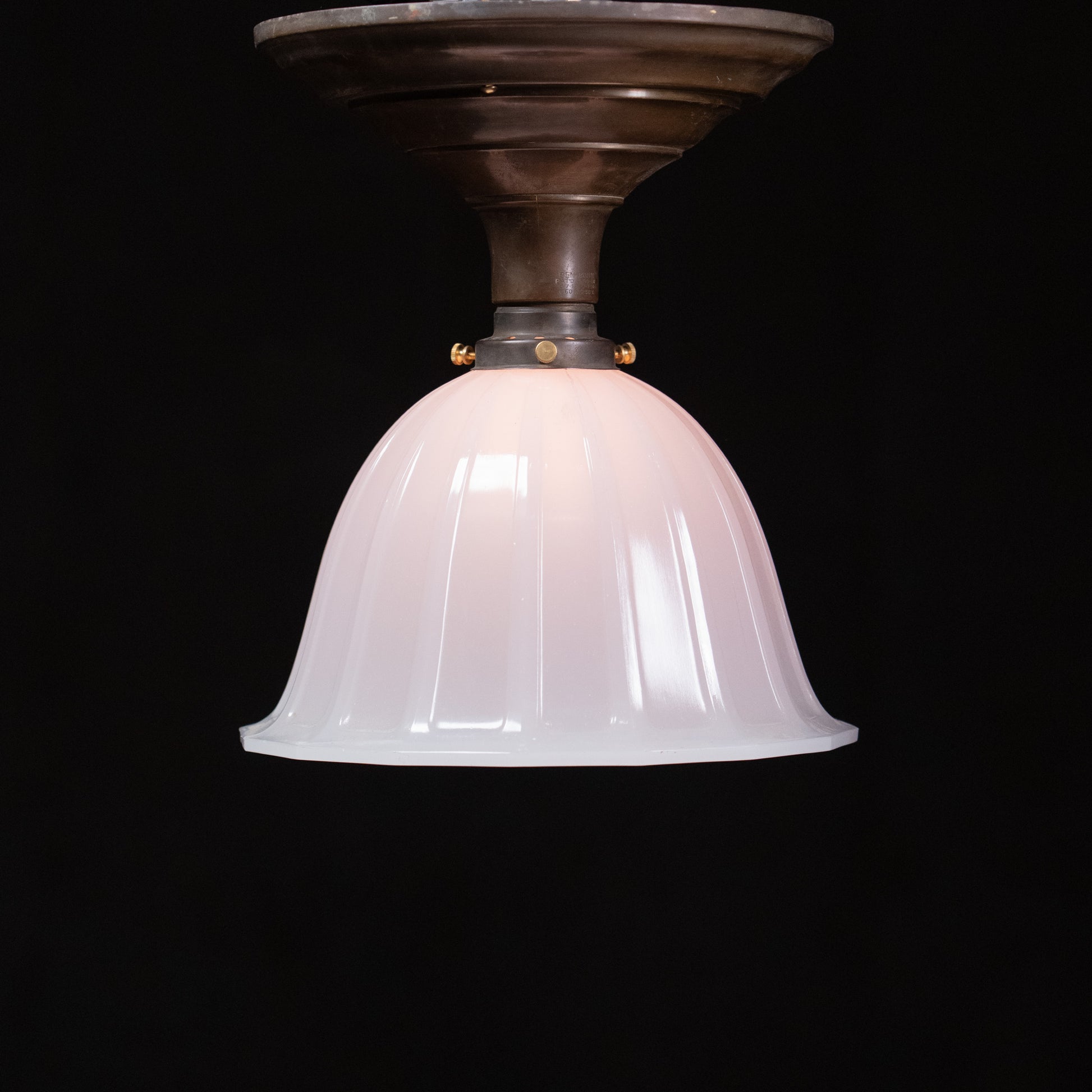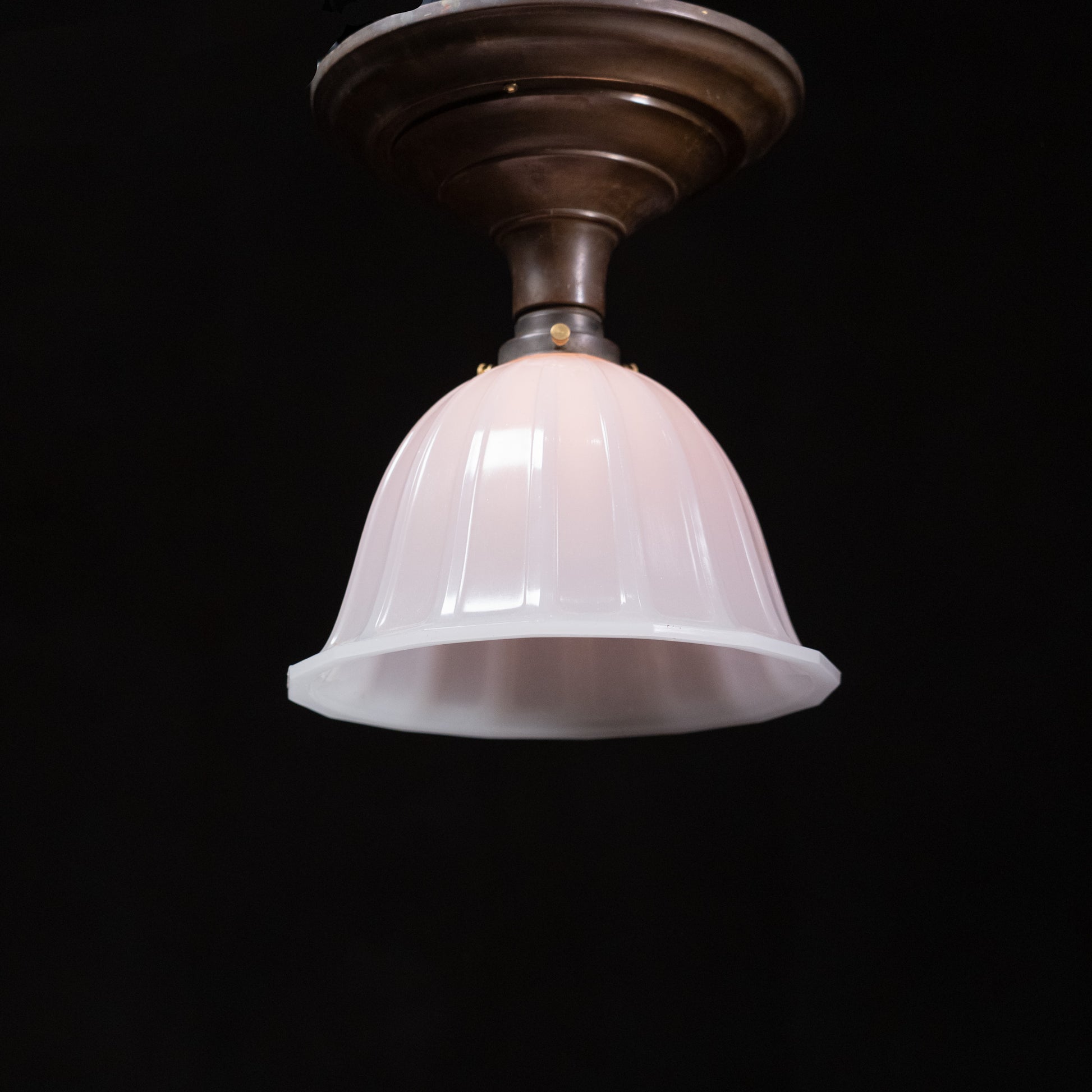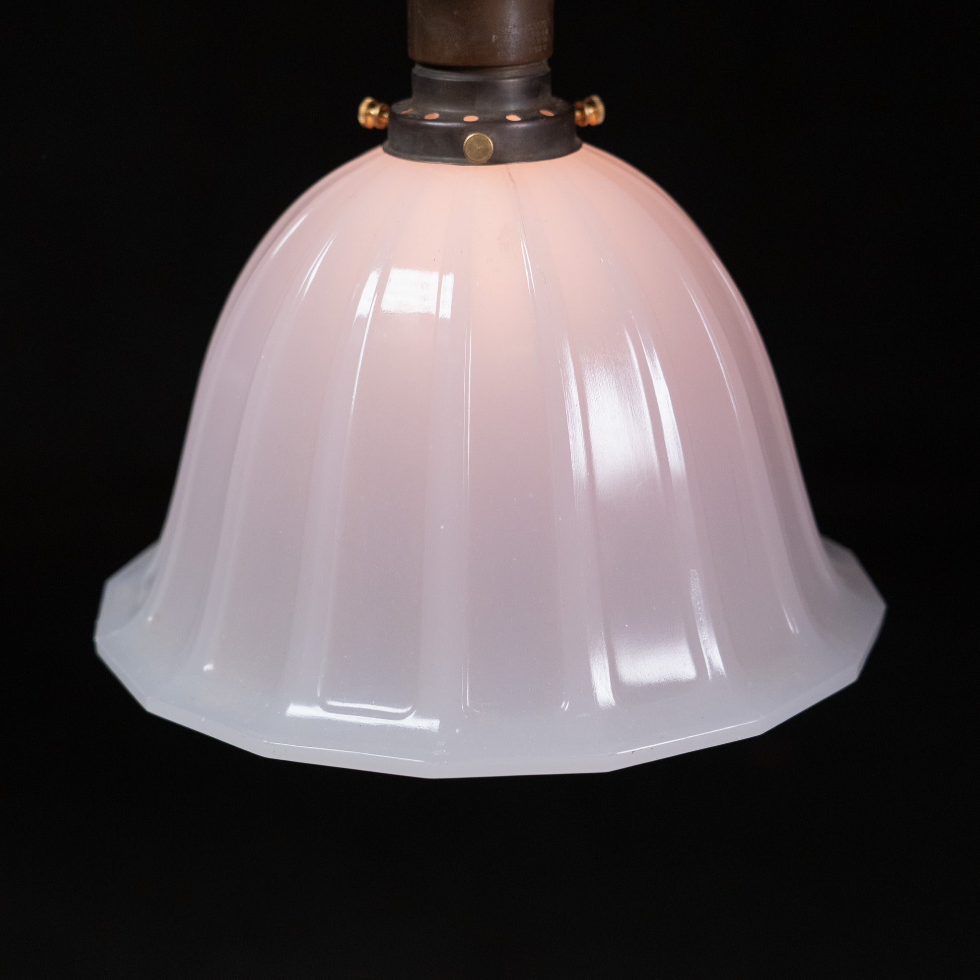 A rare gem with an early brass fitter on a unique milk glass bell shape shade. Showing nice patina and great shape. This is a one of a kind fixture.