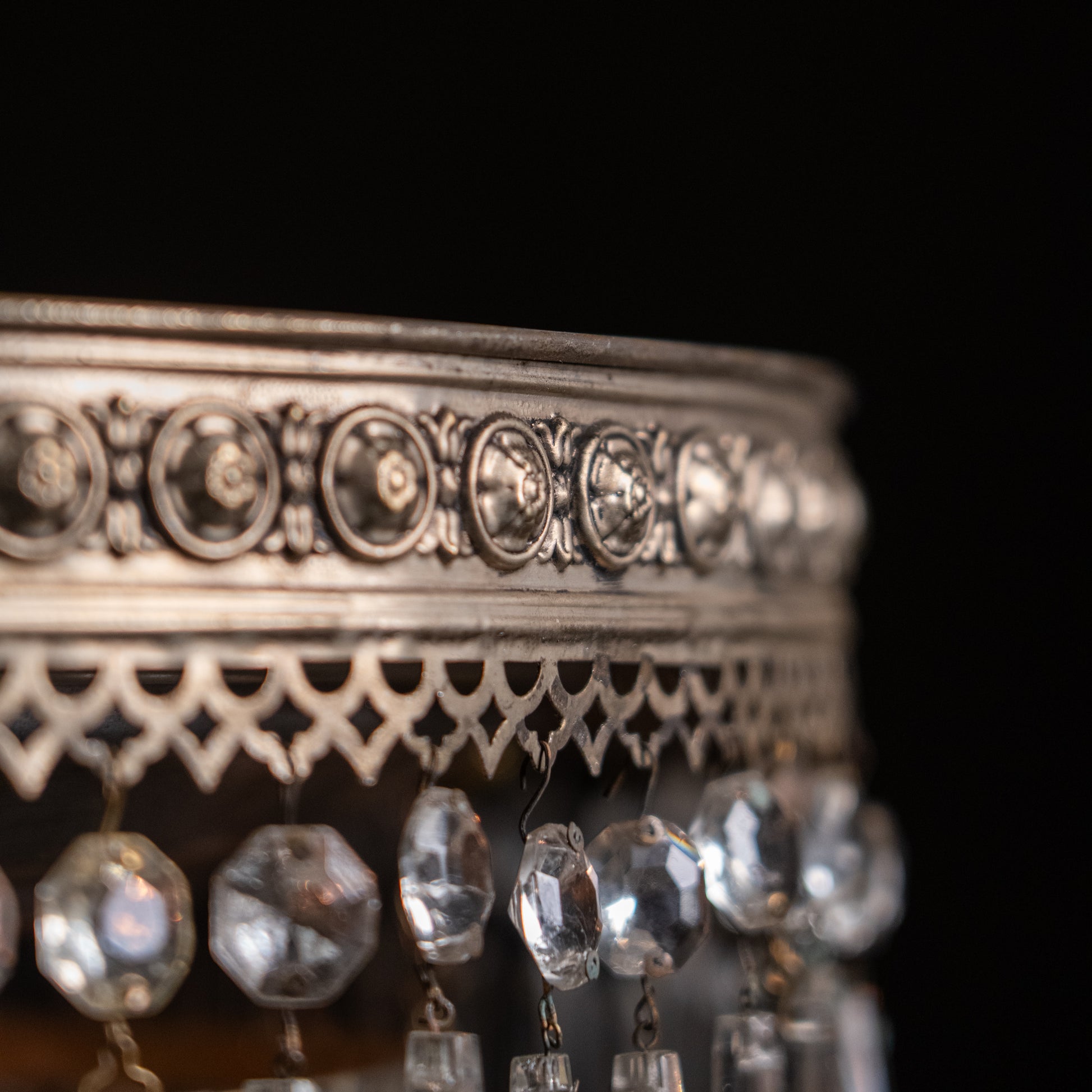 A vintage tiered “wedding cake” crystal basket chandelier dating to the mid-20th century. The fixture features cascading tiers of faceted spear prisms suspended from octagonal crystal connectors beneath a pierced metal gallery crown. A crystal ball finial completes the elegant form. Likely French in origin and crafted with Czech cut crystal, the chandelier reflects the refined Louis XVI revival style popular during the Hollywood Regency period.