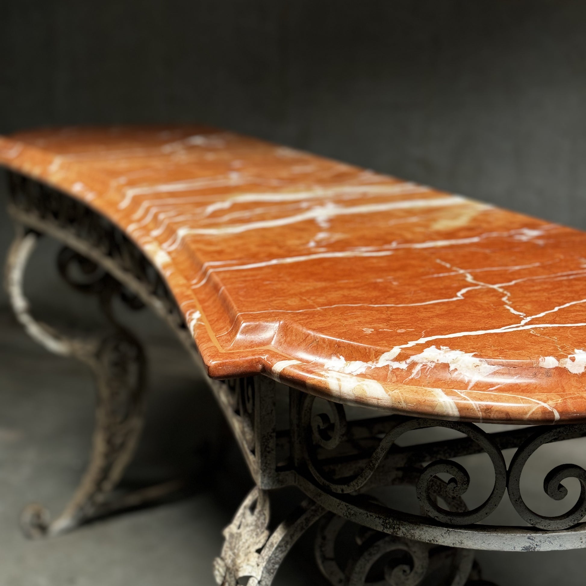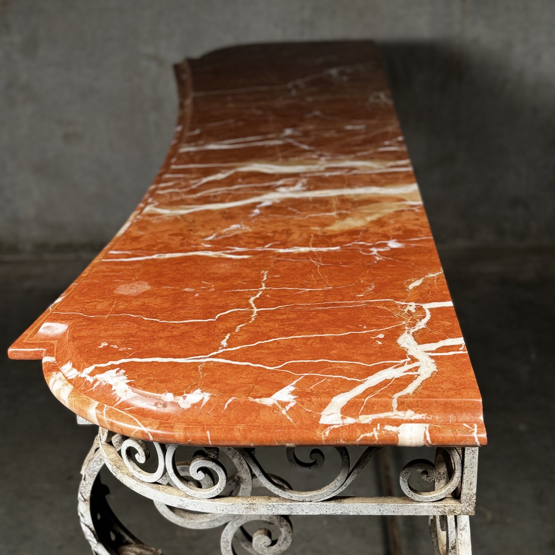 This elegant French console table features a large, high-quality design, with a beautifully scalloped solid marble top that exudes timeless sophistication. The intricate ironwork base is finely crafted, offering a striking contrast to the smooth, polished marble while providing sturdy support and a touch of artistry to the piece.