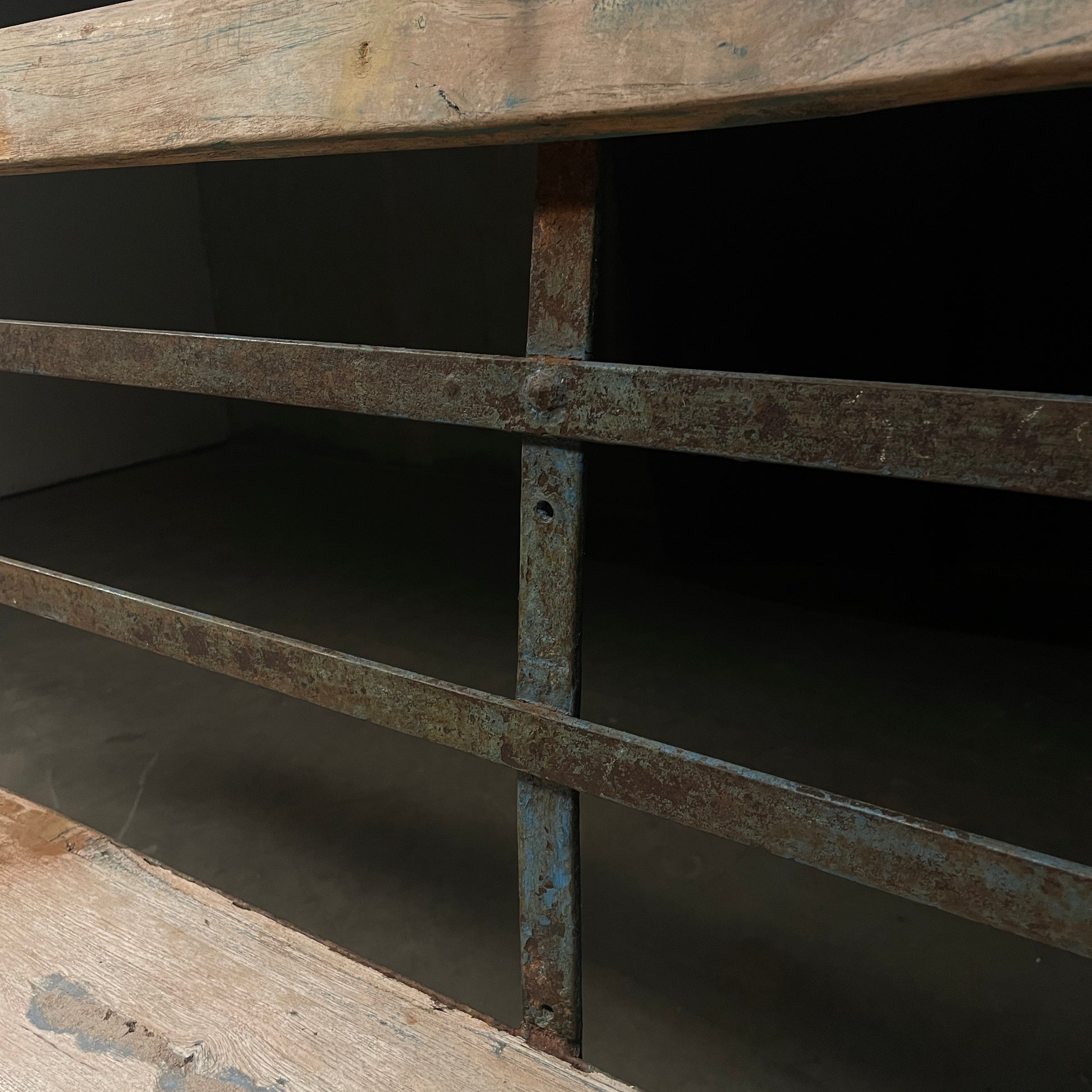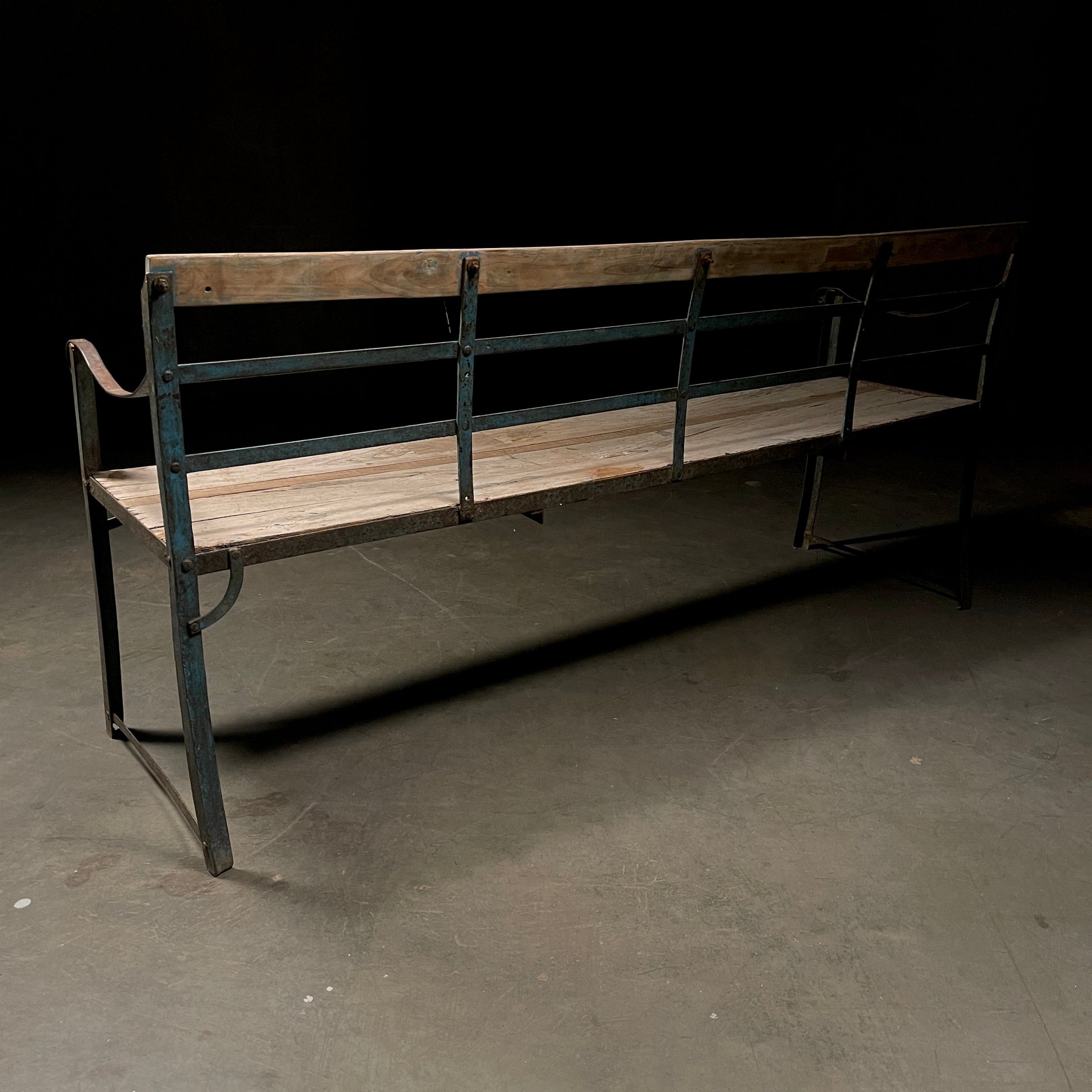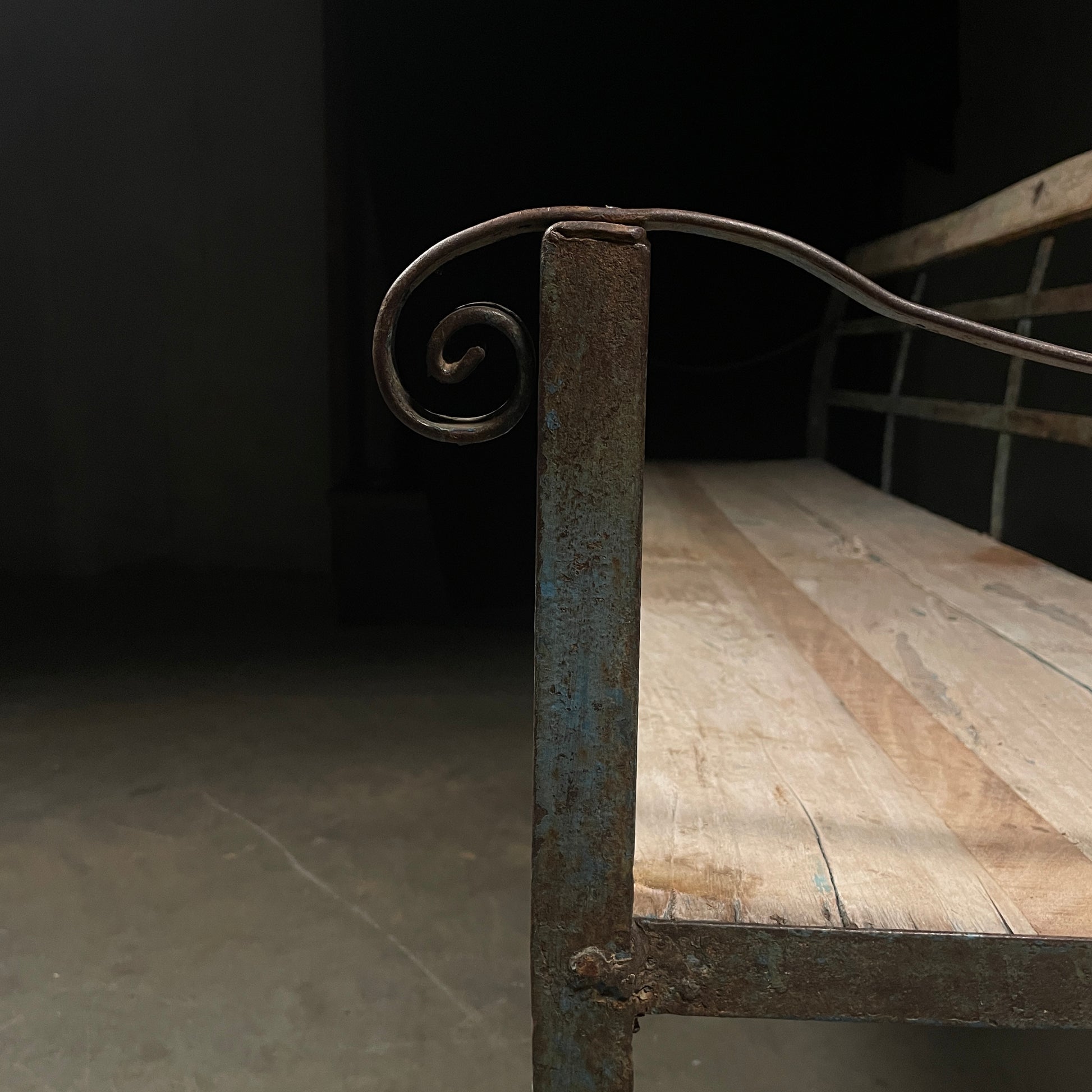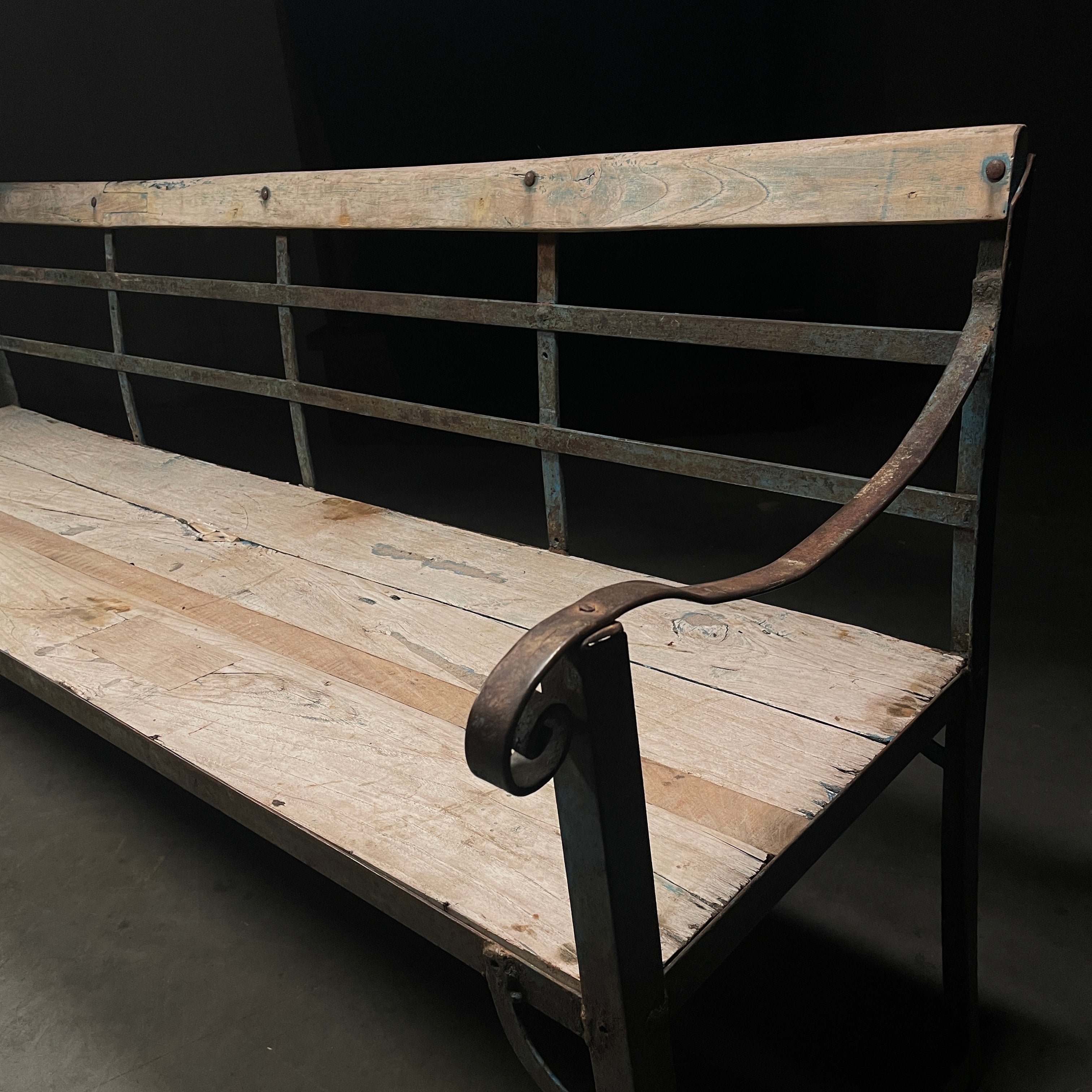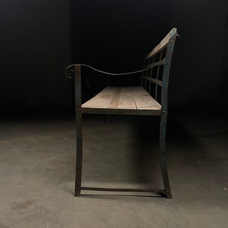 Found in France handmade iron garden porch bench in solid wood, metal frame in a great oxidized blue colour. Perfect for any garden, entry or indoor use.