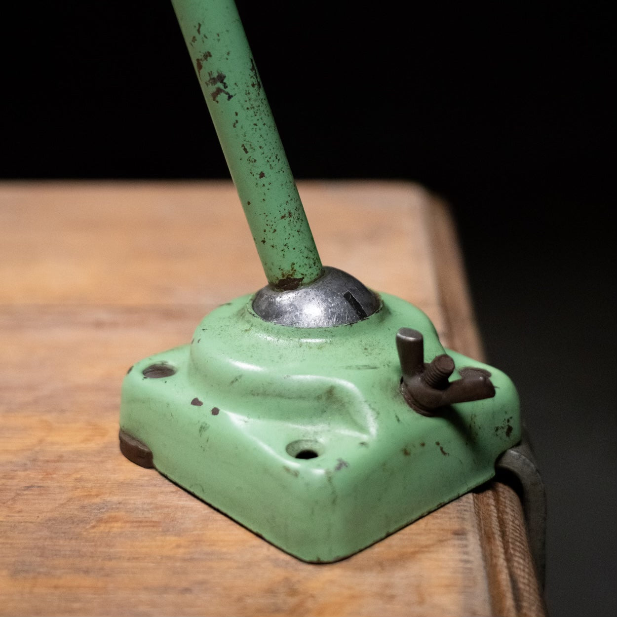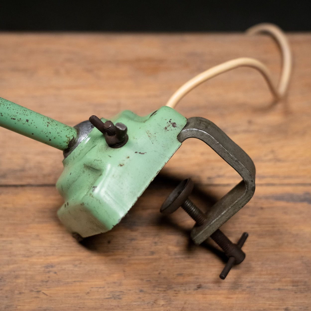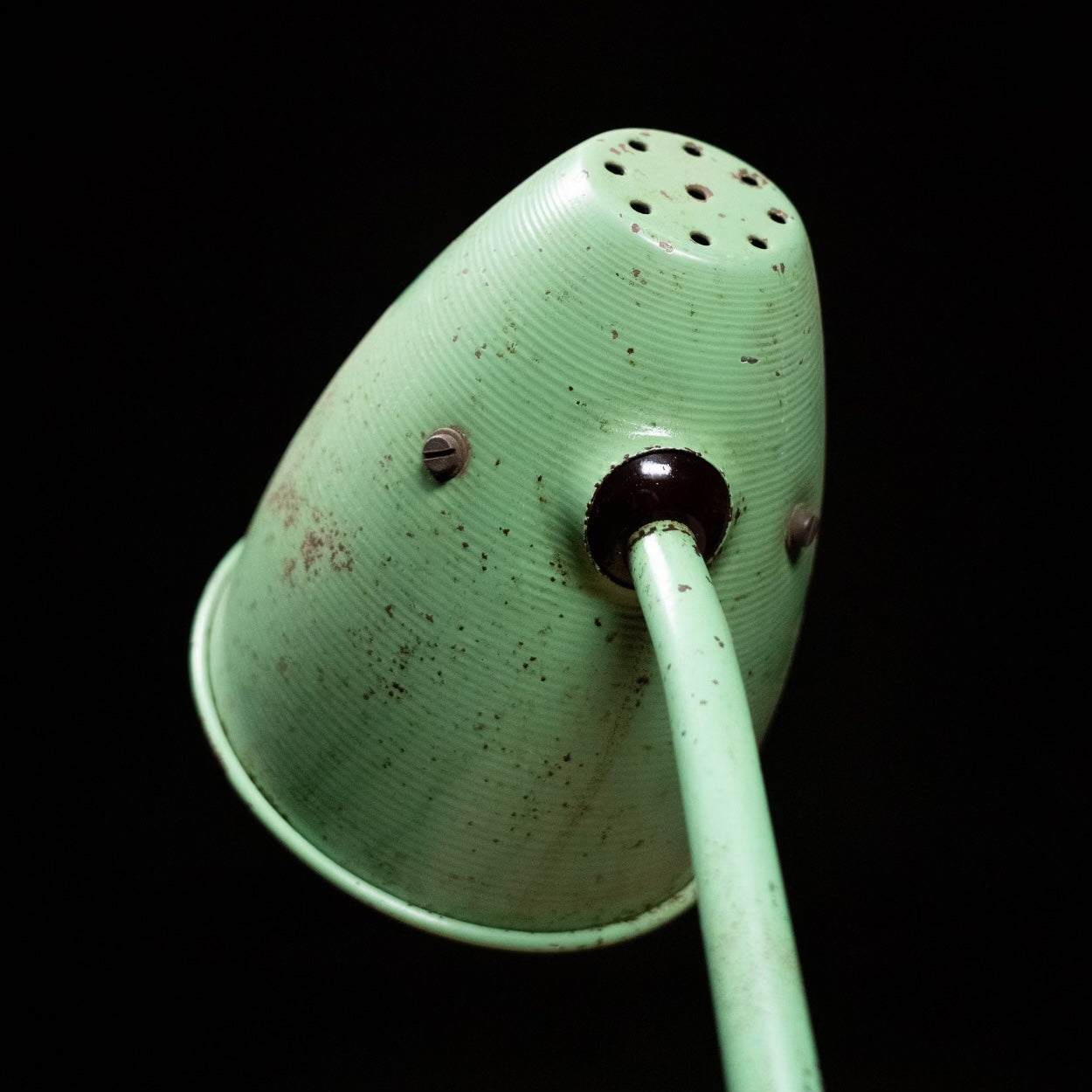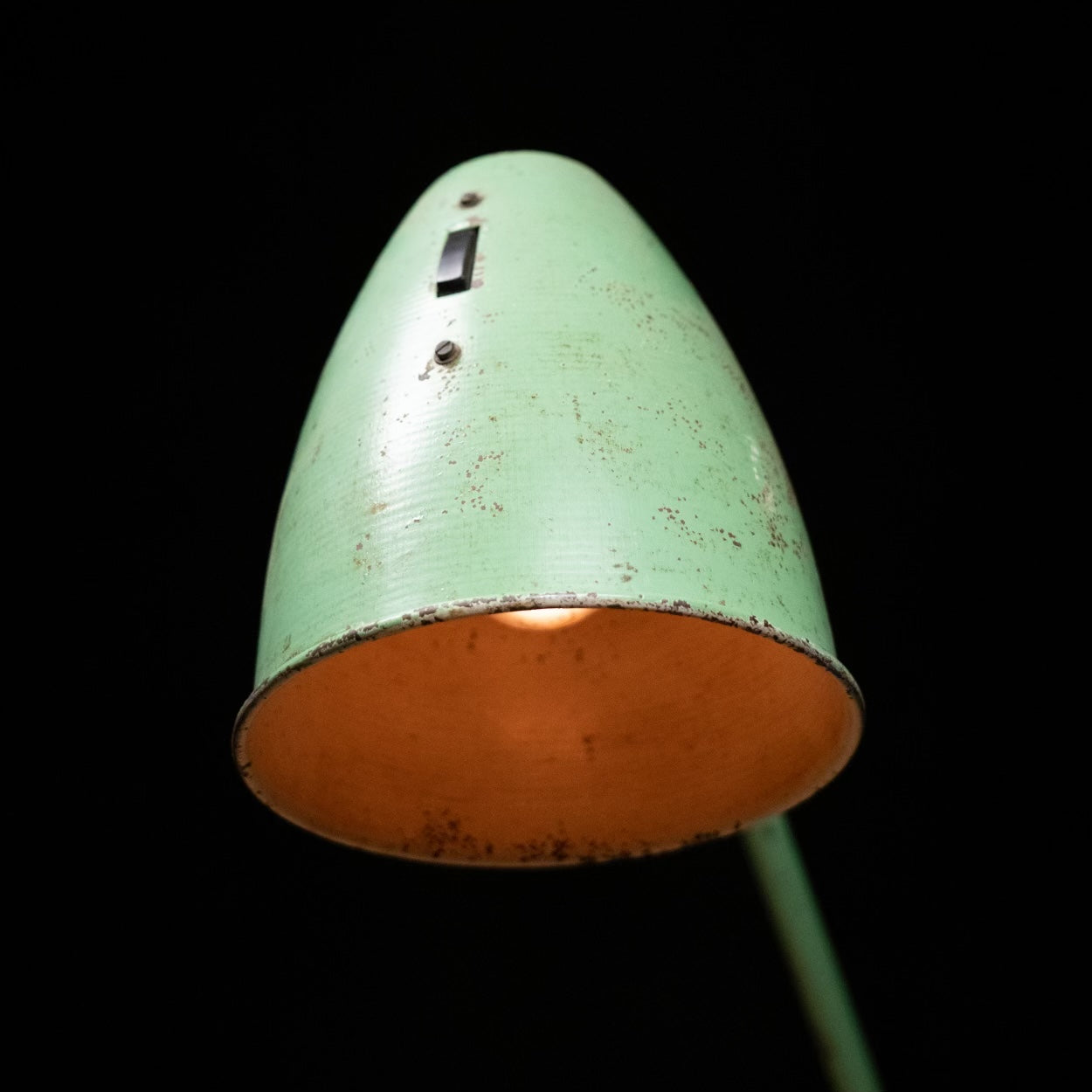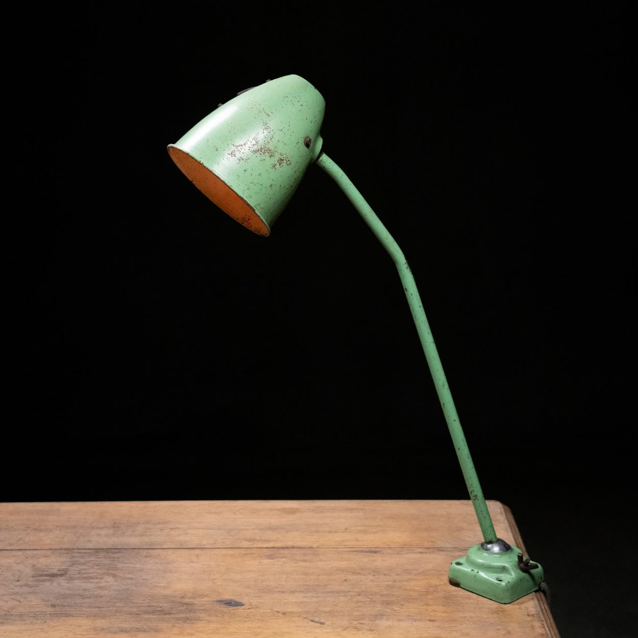 This green industrial desk lamp was made in former Czechoslovakia during the 1960s. It features an iron body with three adjustable joints. The porcelain socket reqiures E 27/ E26 light bulbs. New wire. The switch is situated directly on the shade. The weight of the lamp is 2 kg. The table mounting system .