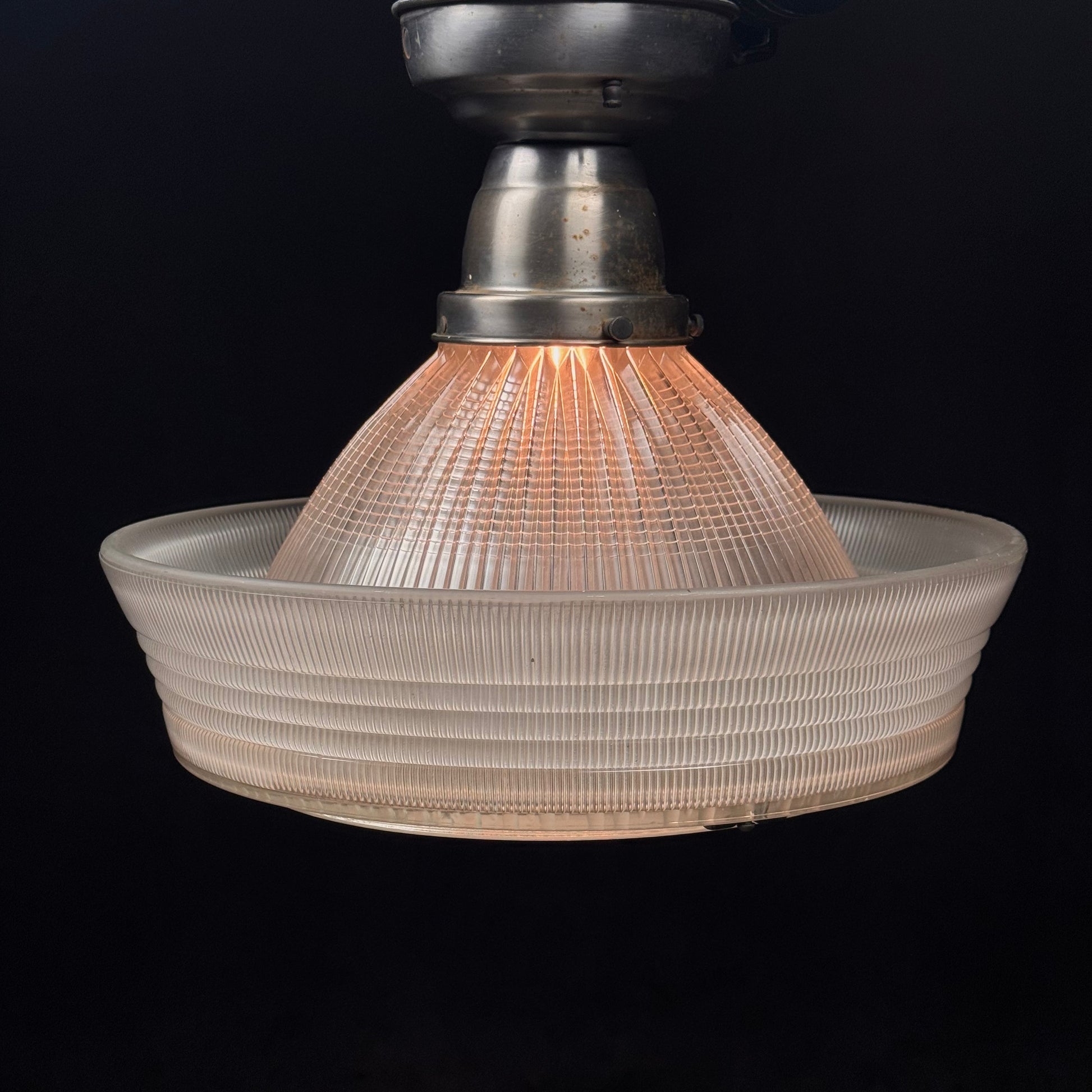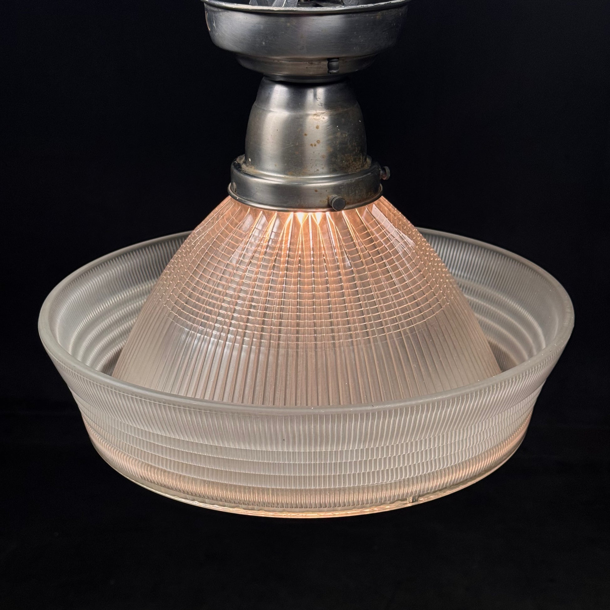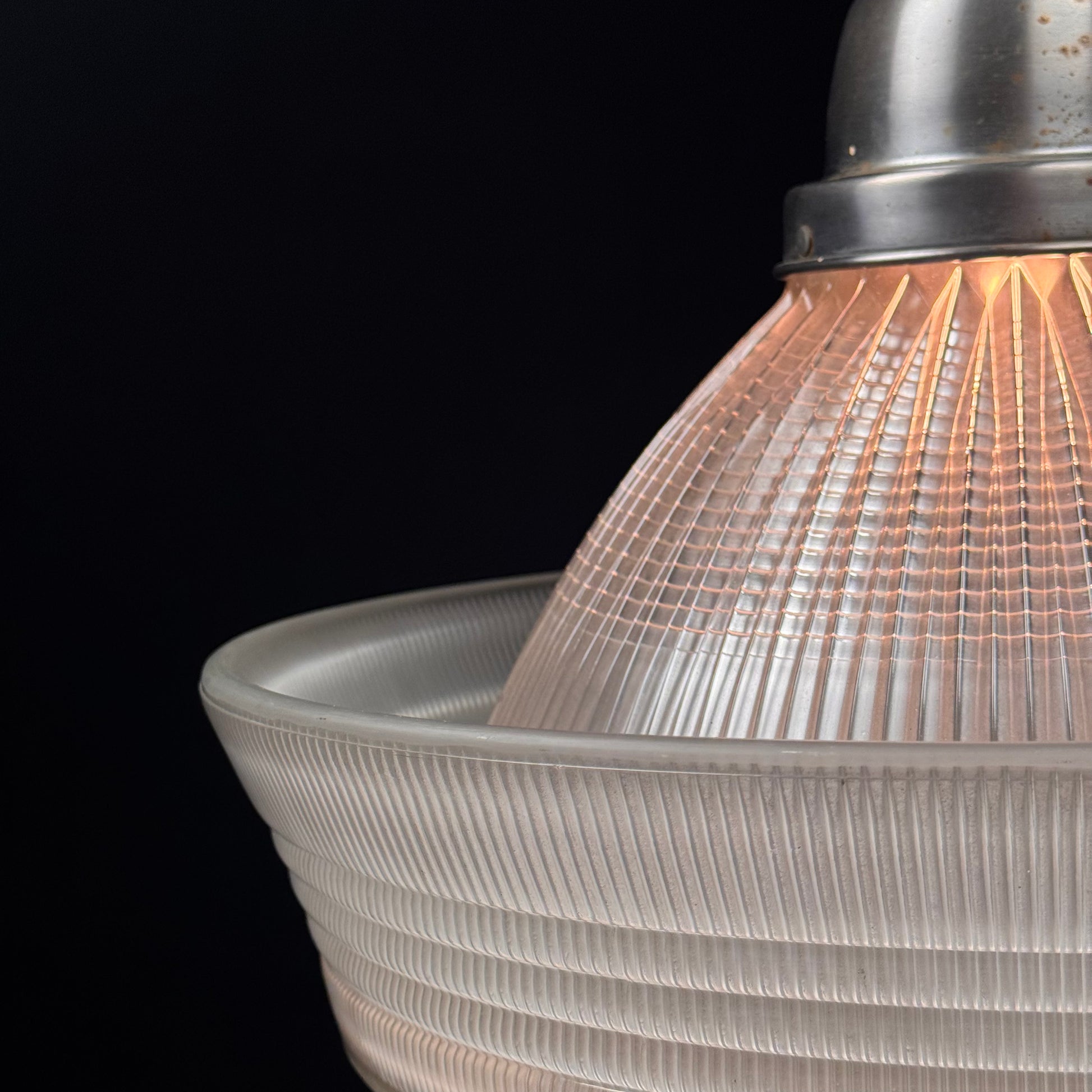 This is a uniquely designed glass lighting fixture featuring a mix of vertically and horizontally cut ridges. This combination of prism lines and circular form radiates a beautiful and bright light in any space. Most likely this fixture was produced by the USA division of Holophane. The fixture has been recently rewired and we have added fittings that meet UL certification. Very good vintage condition.