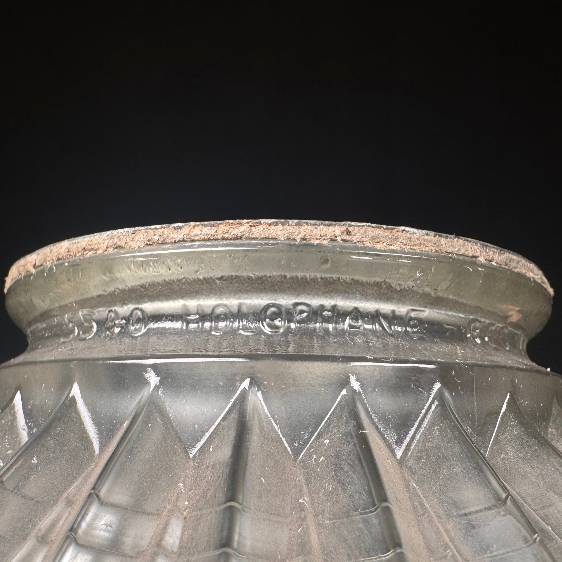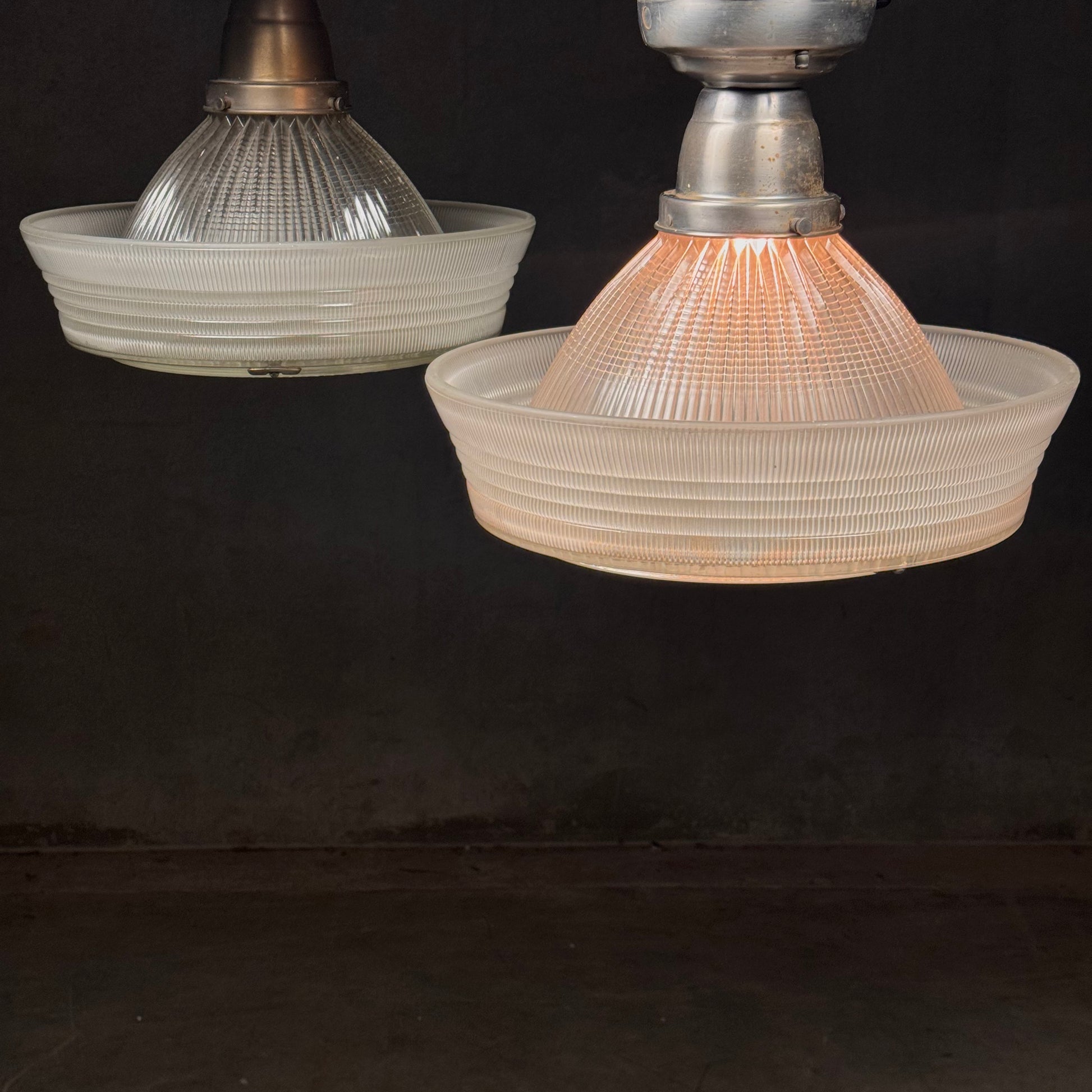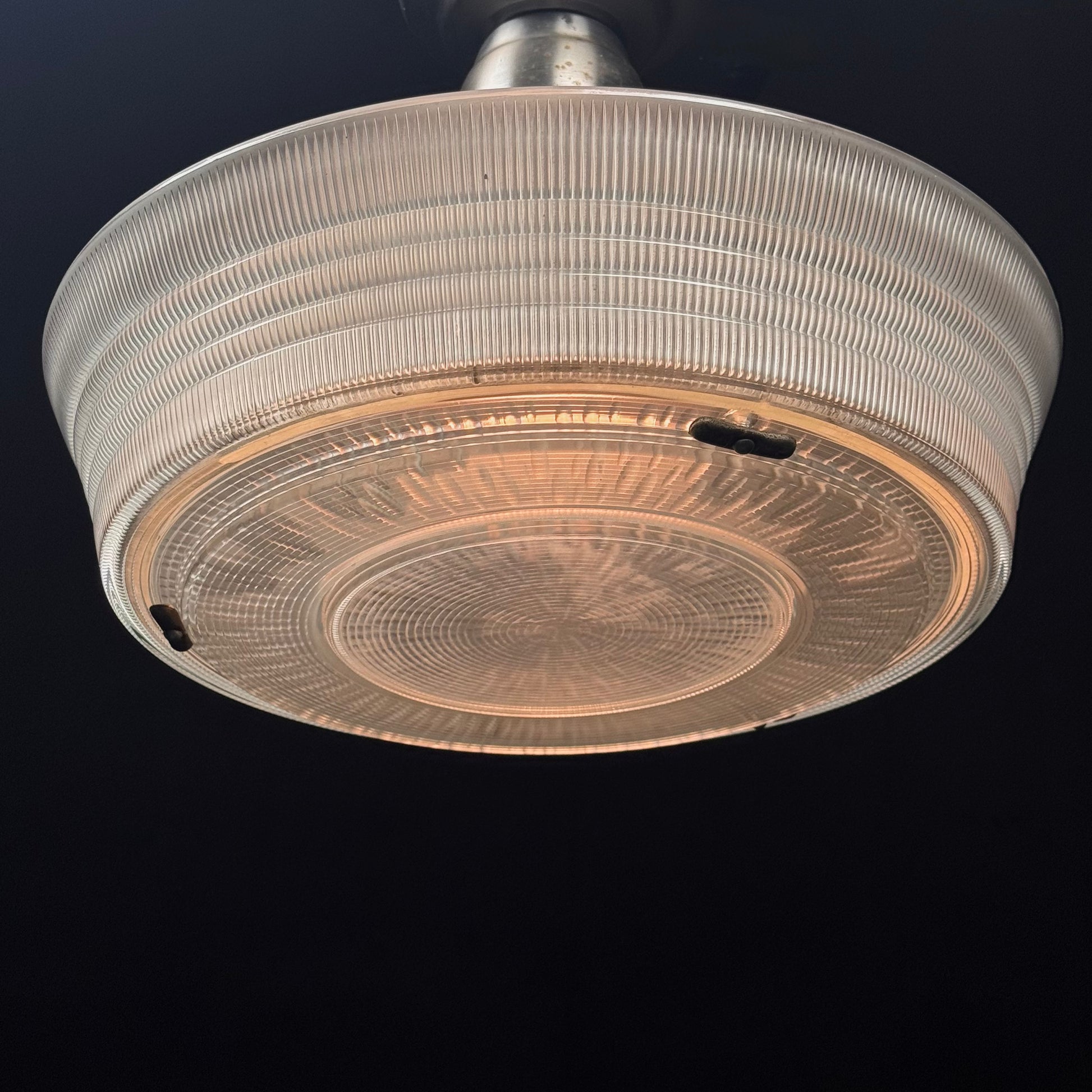 This is a uniquely designed glass lighting fixture featuring a mix of vertically and horizontally cut ridges. This combination of prism lines and circular form radiates a beautiful and bright light in any space. Most likely this fixture was produced by the USA division of Holophane. The fixture has been recently rewired and we have added fittings that meet UL certification. Very good vintage condition.
