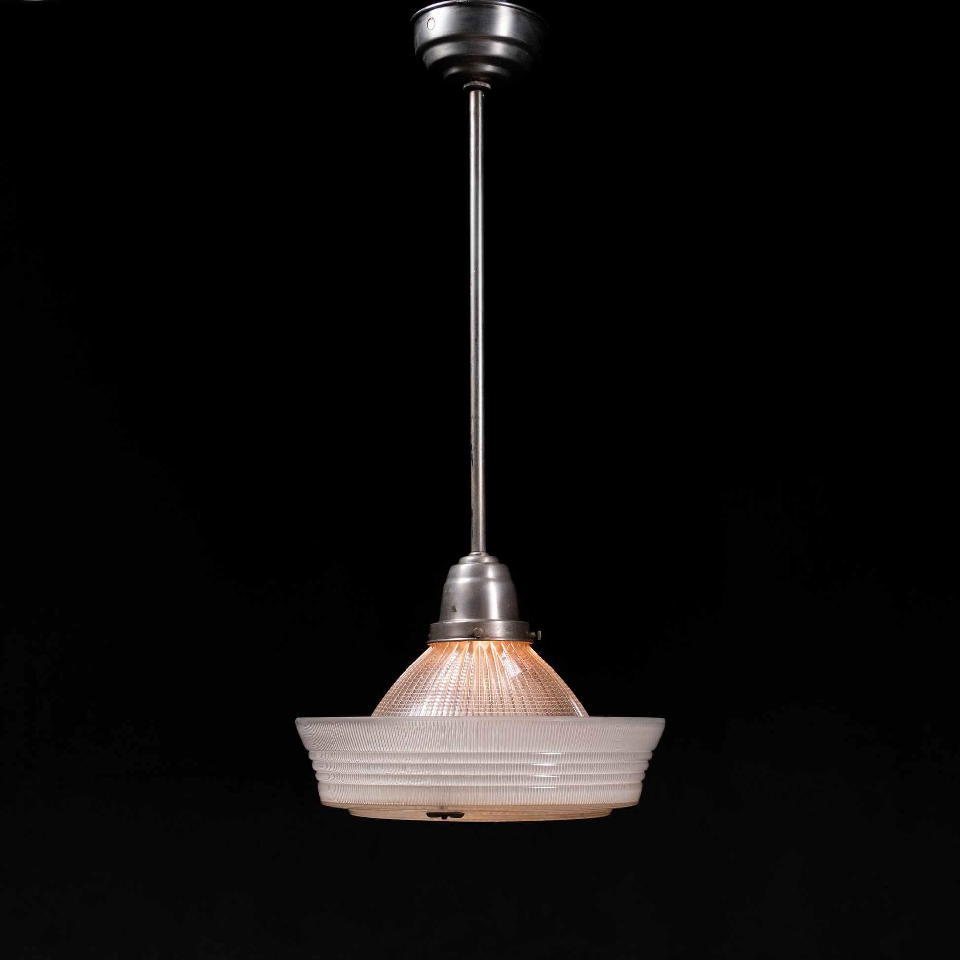 A striking vintage industrial pendant featuring a two-part prismatic glass assembly, dating from the 1930s–1950s. The upper refractor cone and lower ribbed prismatic bowl work together to diffuse light evenly, producing the warm, glare-free illumination that made Holophane-style fixtures the standard in factories, commercial buildings, and early modernist interiors.
