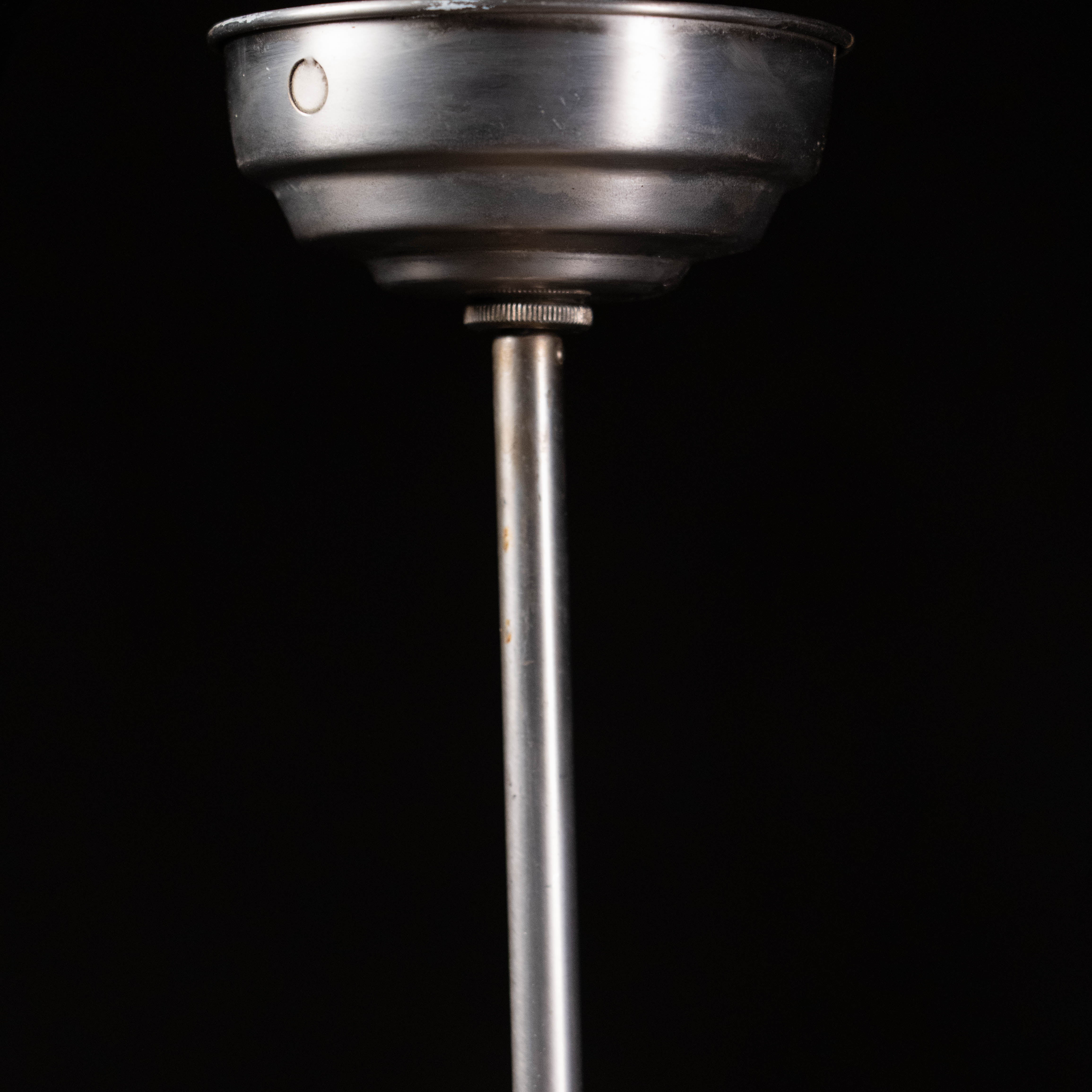 The fixture retains its original metal fitter, rod, and stepped ceiling canopy, all with beautifully aged surface character. The prismatic glass not only enhances light quality but also creates a sculptural, architectural presence — making this pendant equally suited for kitchens, studios, dining areas, retail spaces, or loft interiors.
