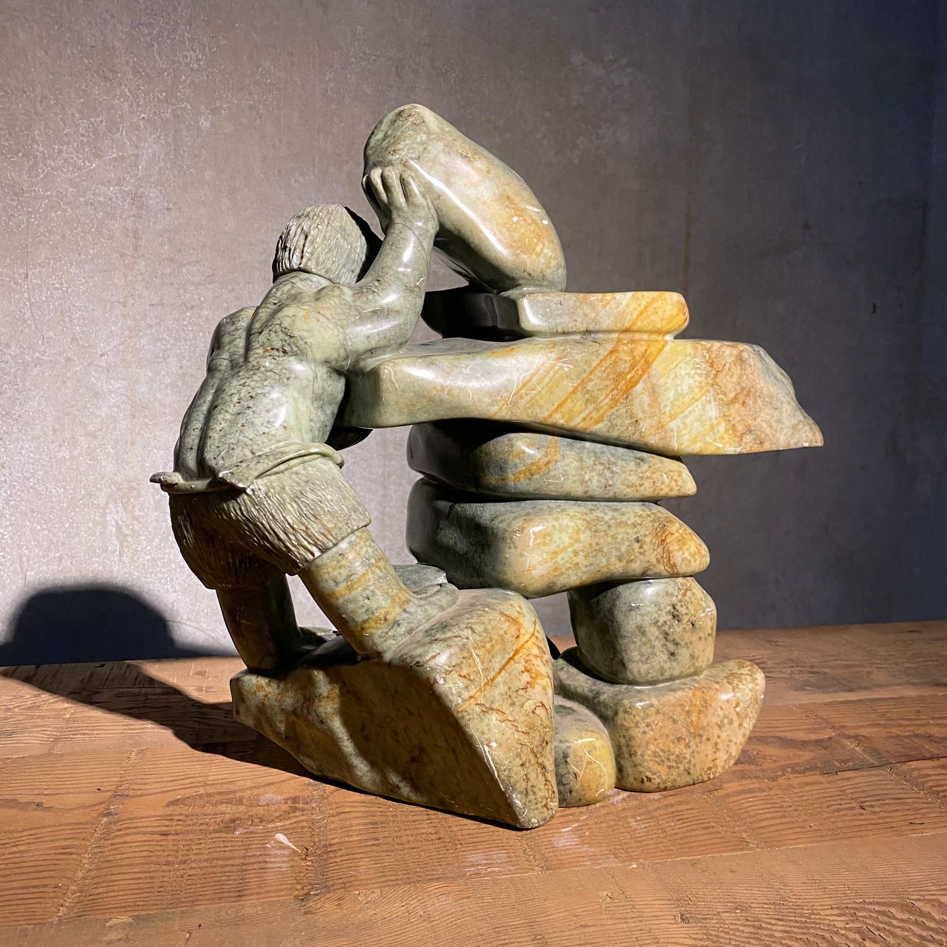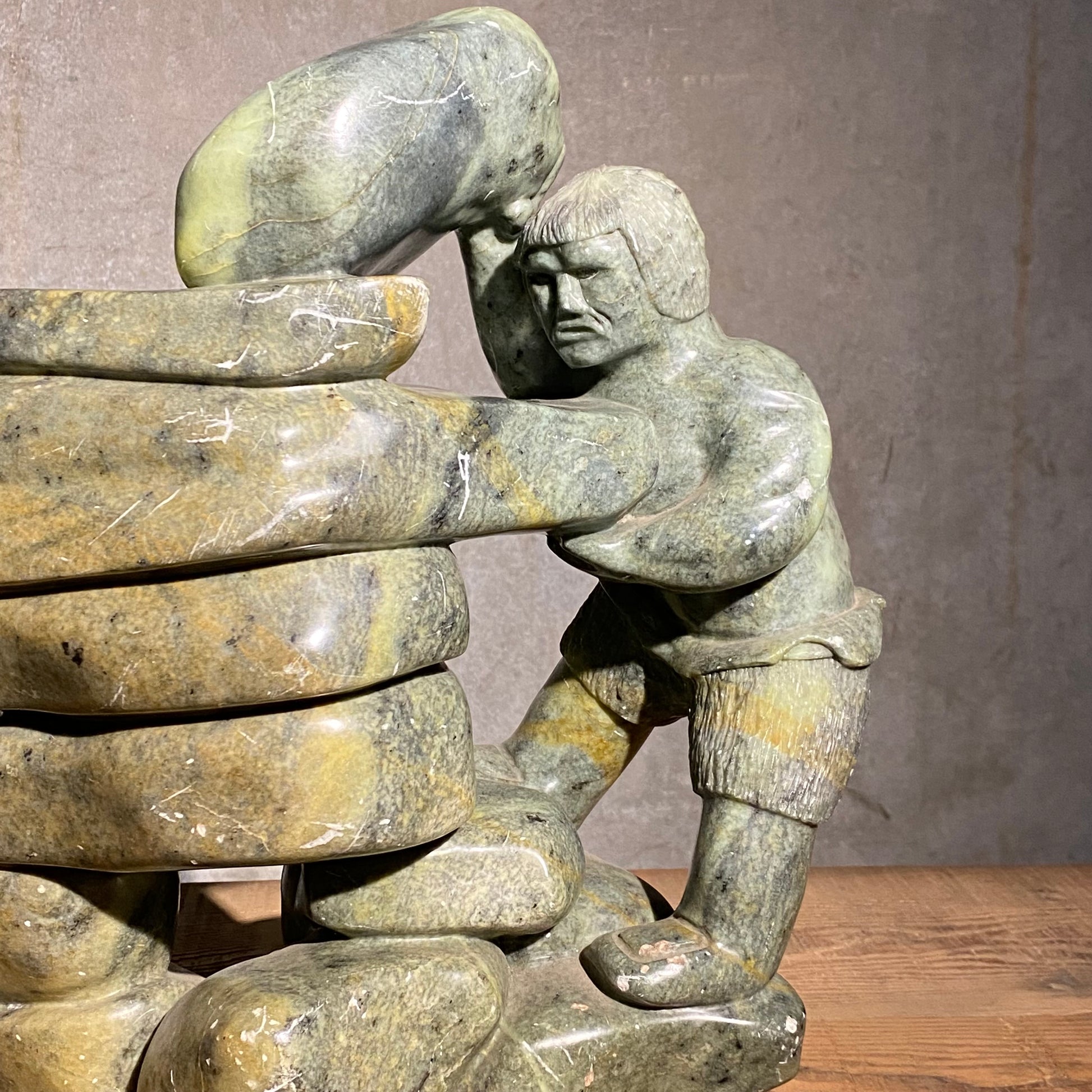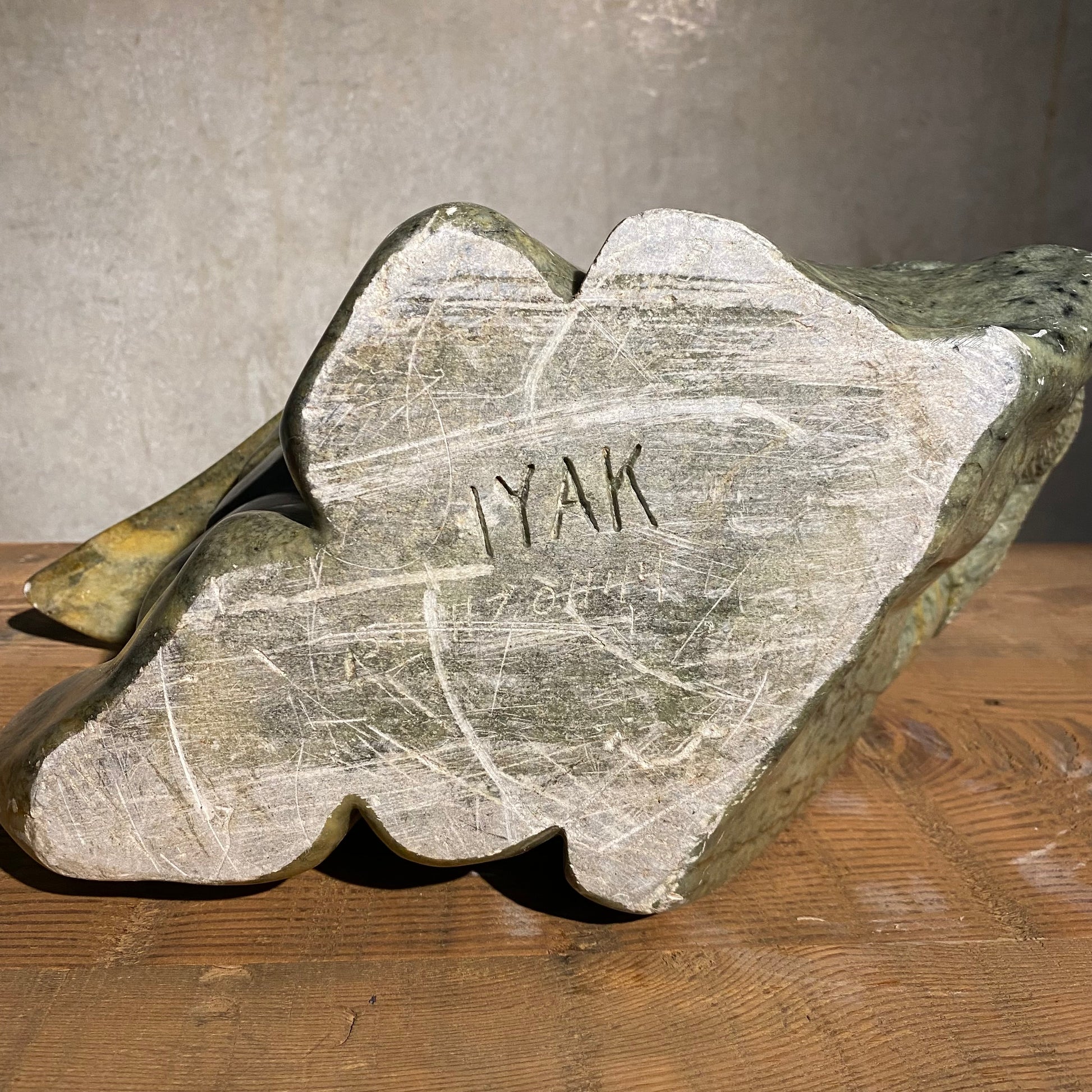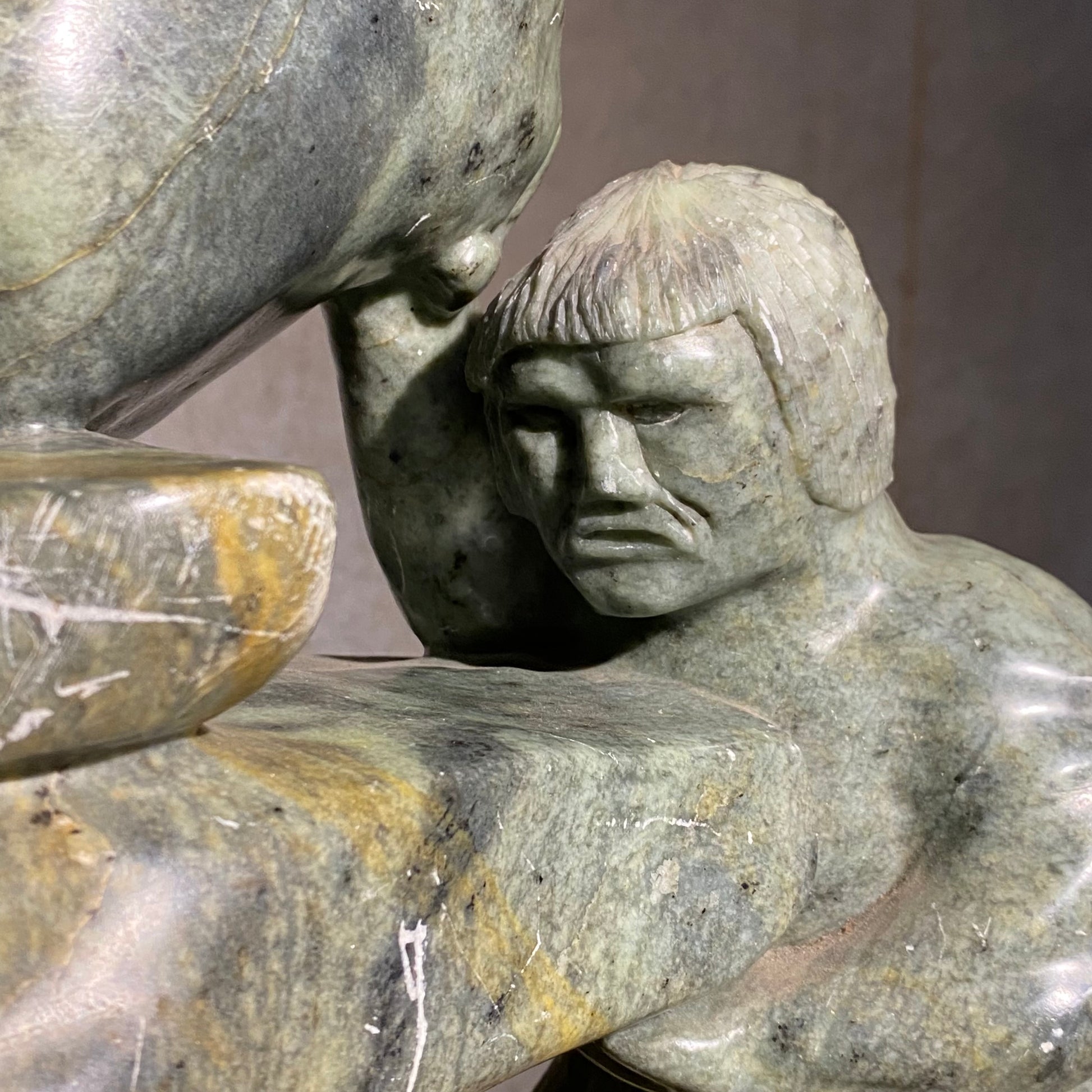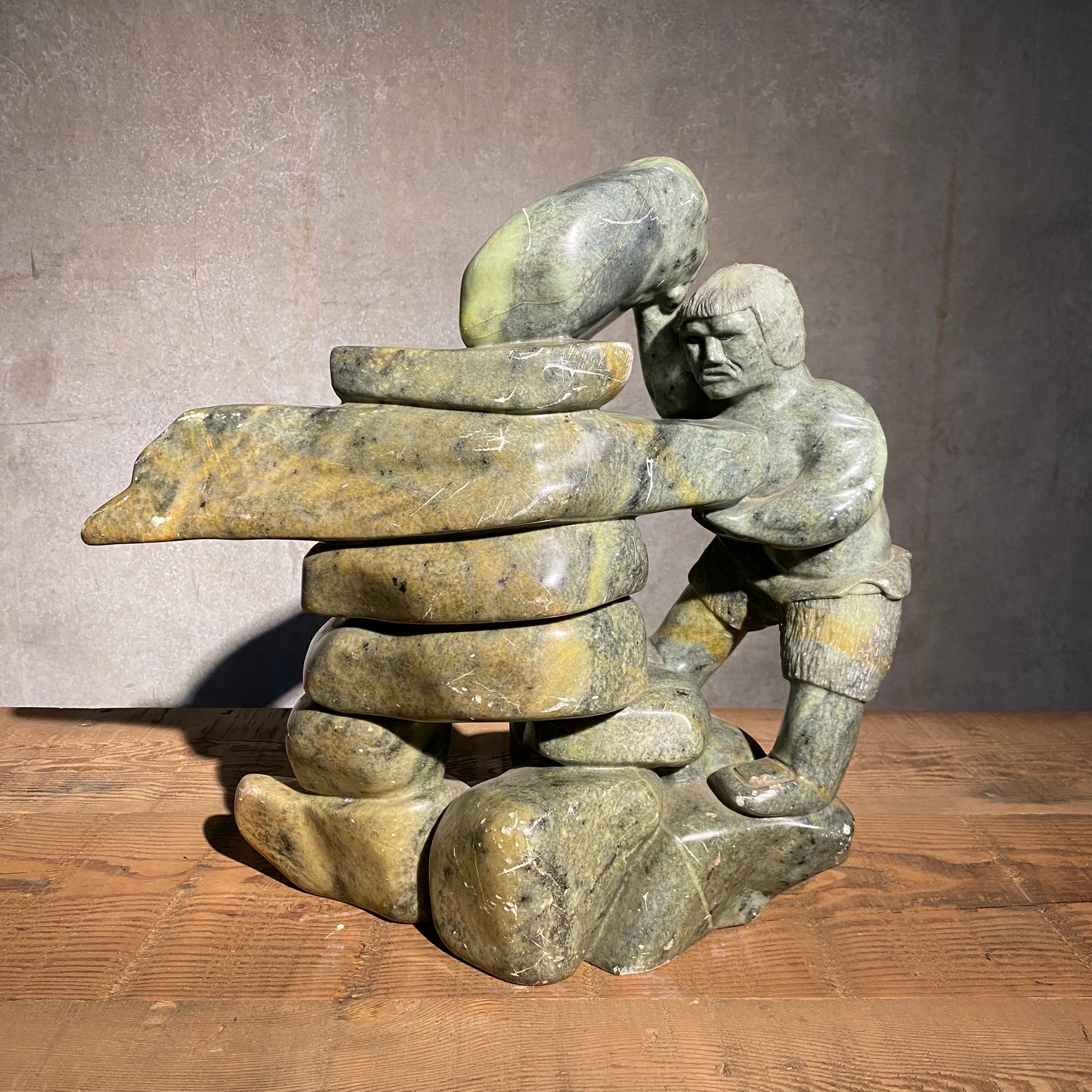 Fred Iyak Trimble is an Inuit artist who was born in 1961 and resides in Canada. He is known for his Inuit Sculptures like this beautiful full stone piece, that shows great details as well as impressive craftsmanship.
