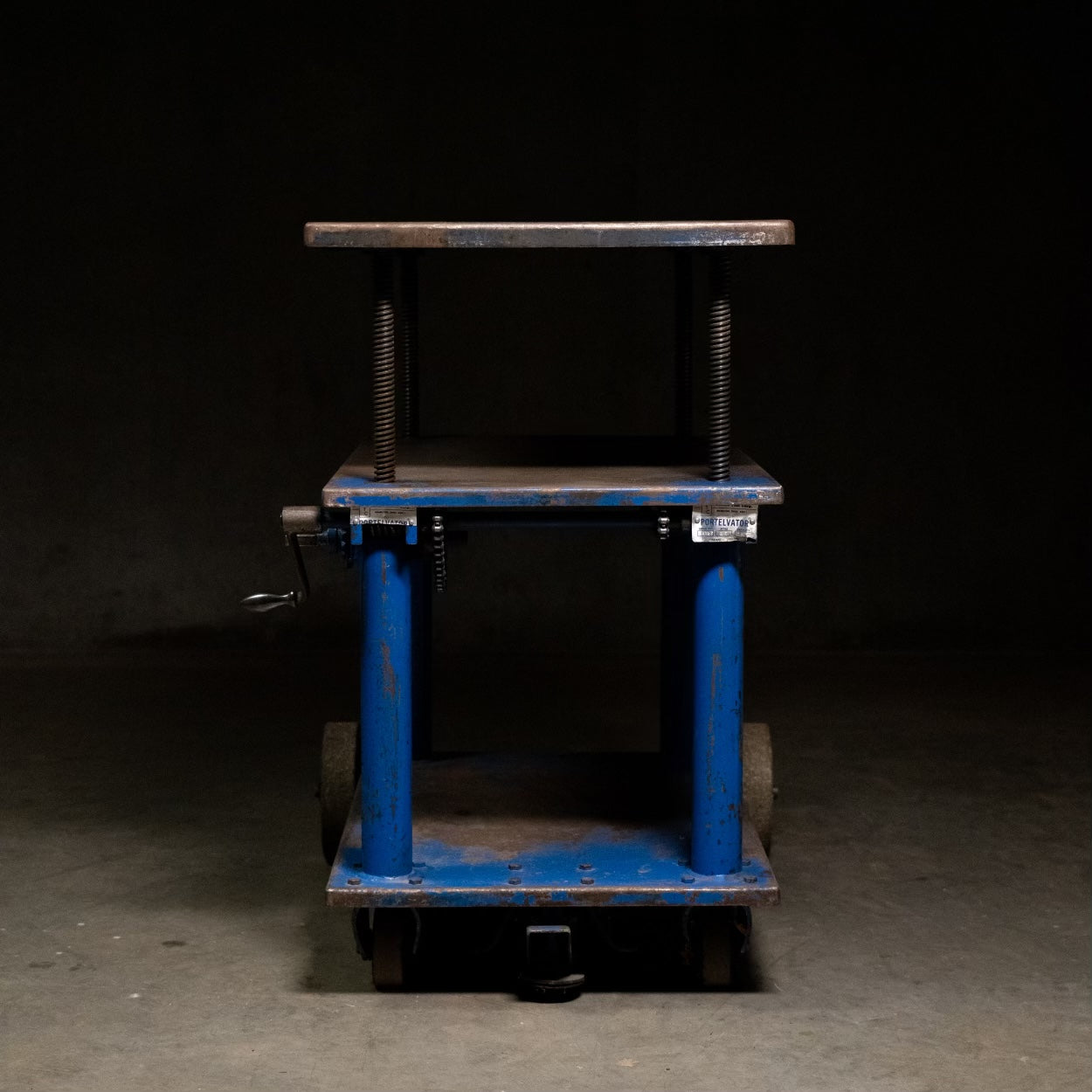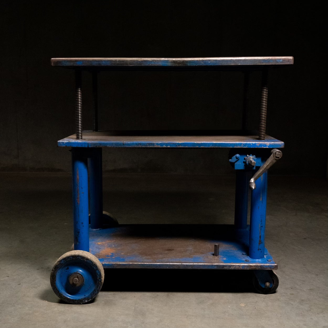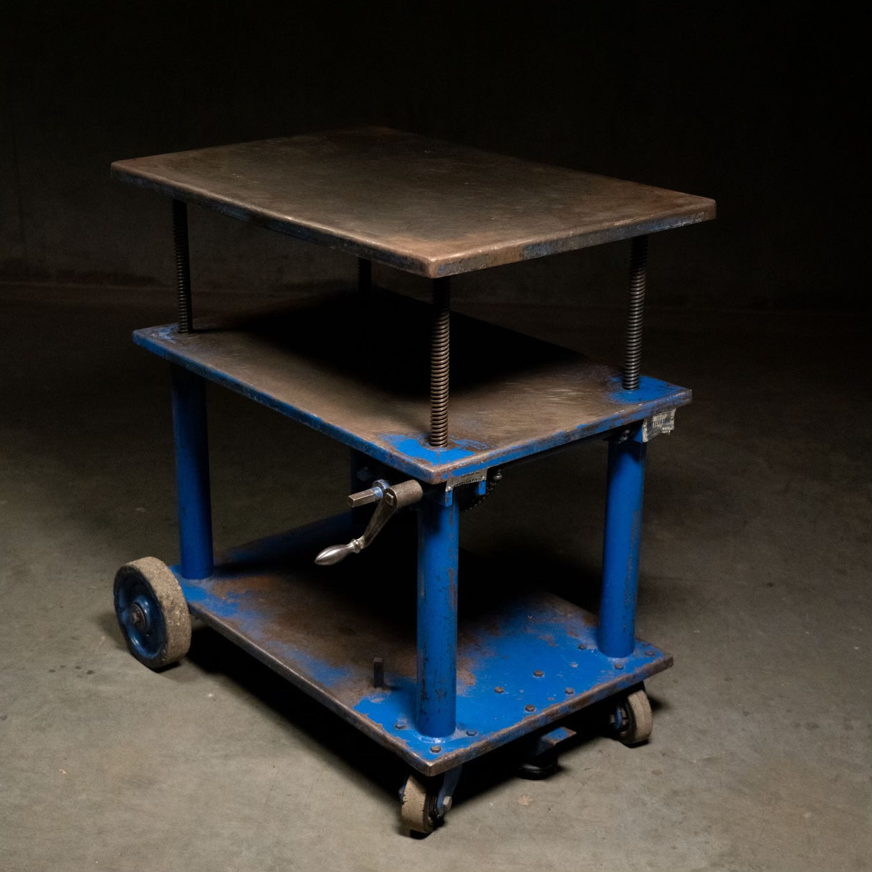Hamilton "Portelvator" industrial chain drivin cart / stand, adjustable height, 25" - 40". Ingenious mechanism, steel crank, foot break. Stabilizer, would make an amazing kitchen island / table, pedistal for sculpture, retains original patina.