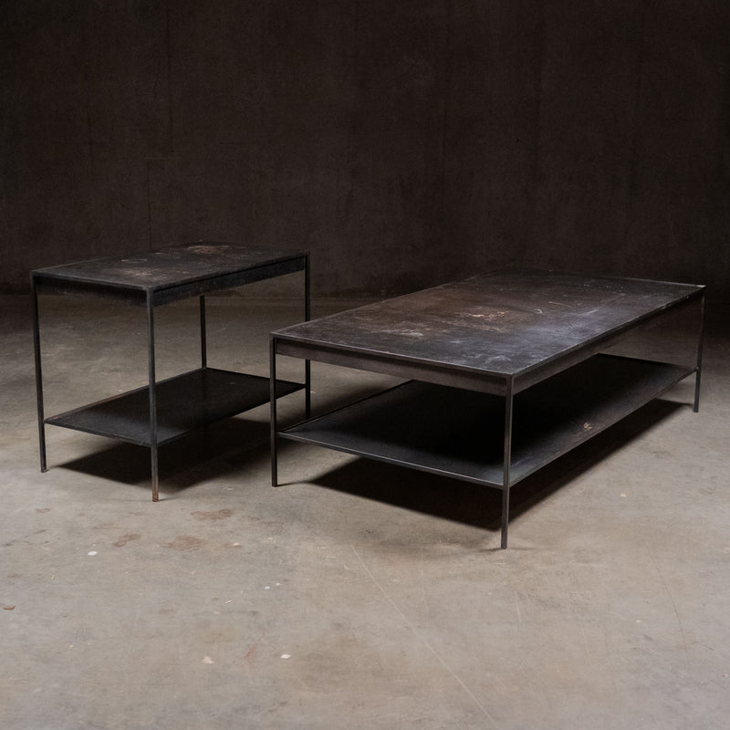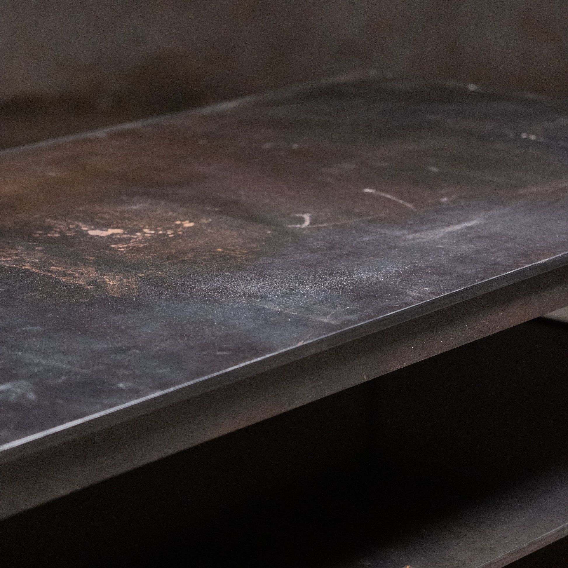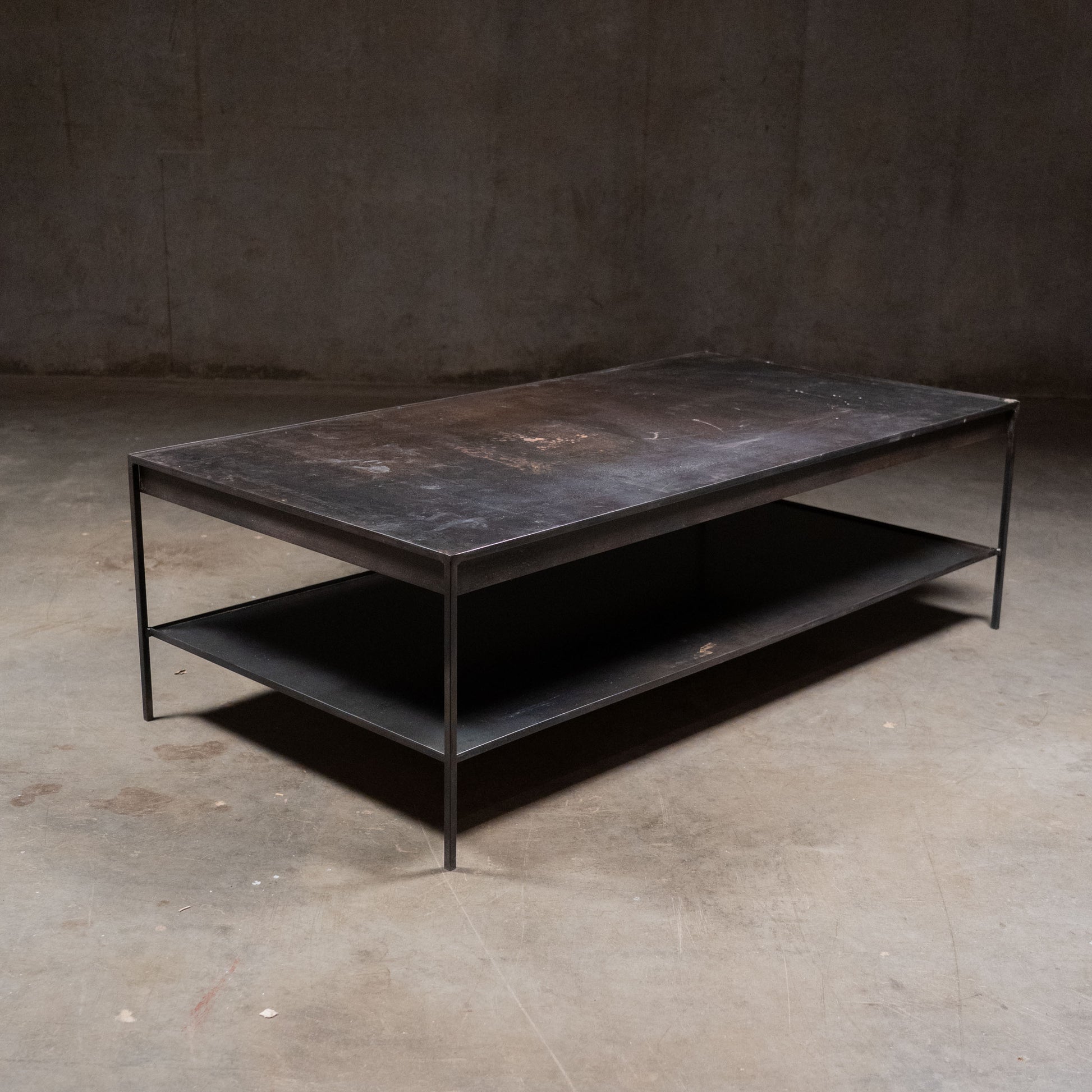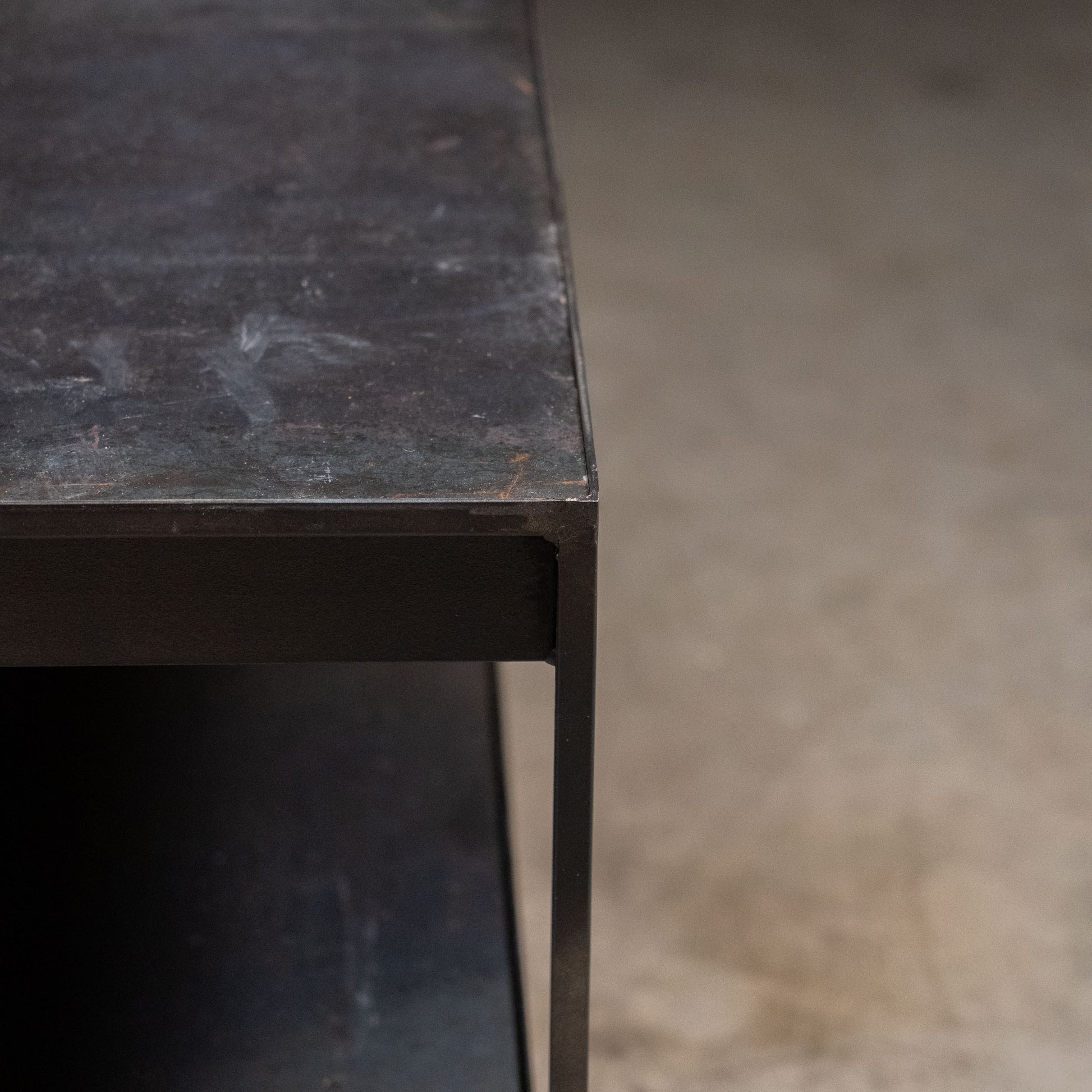 A fine bespoke one of a kind hand made sleek all steel table. We are currently working on blackened finish to remove any stain in the steel.