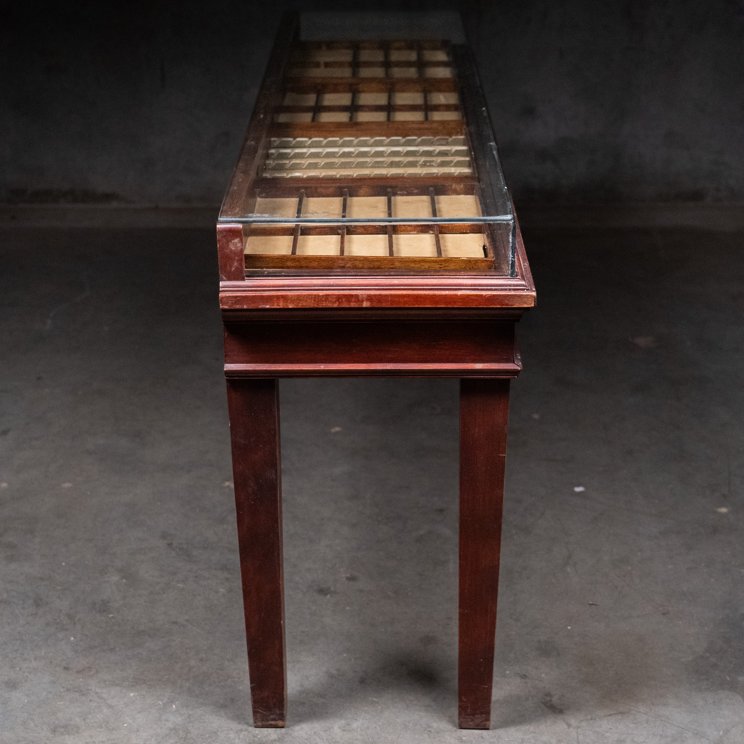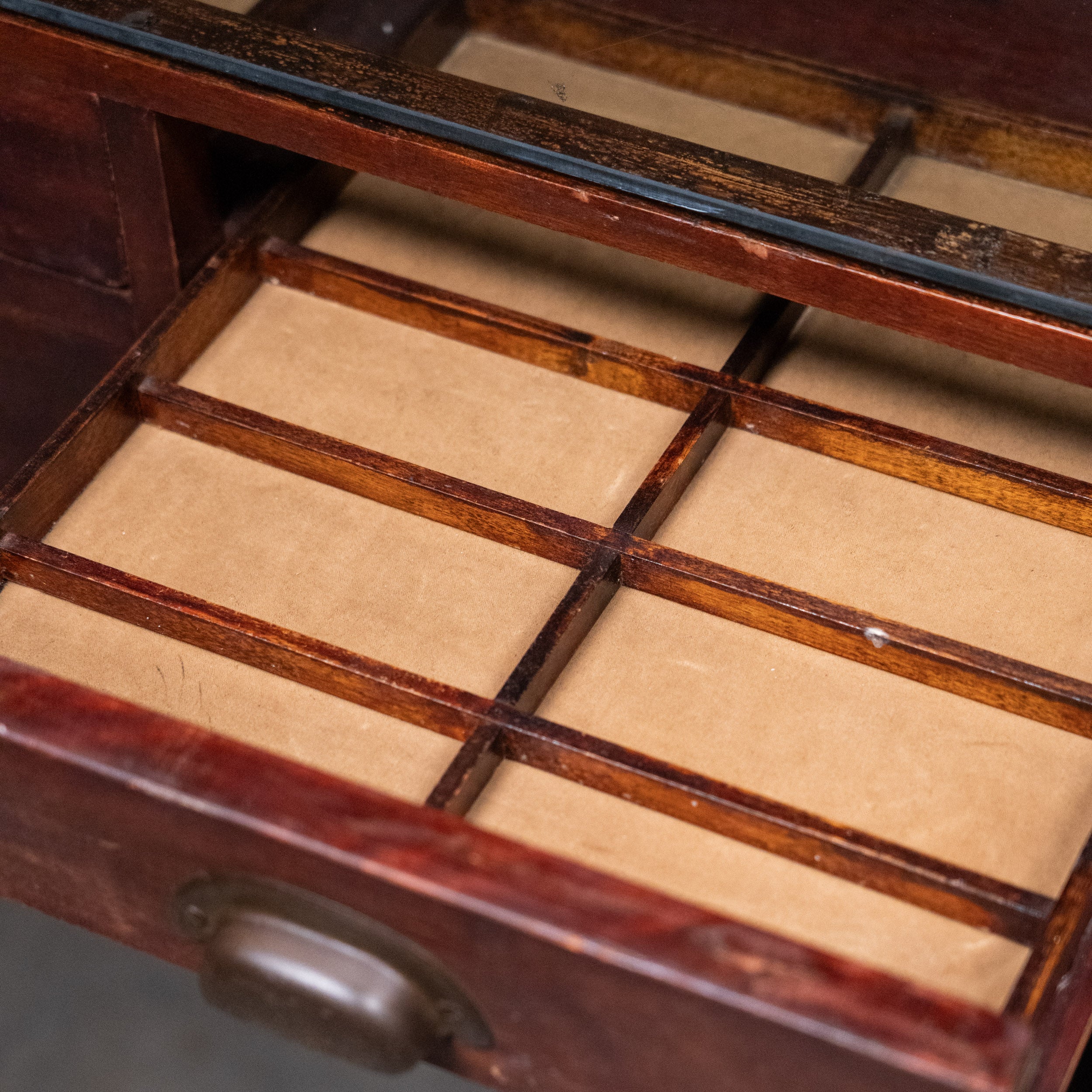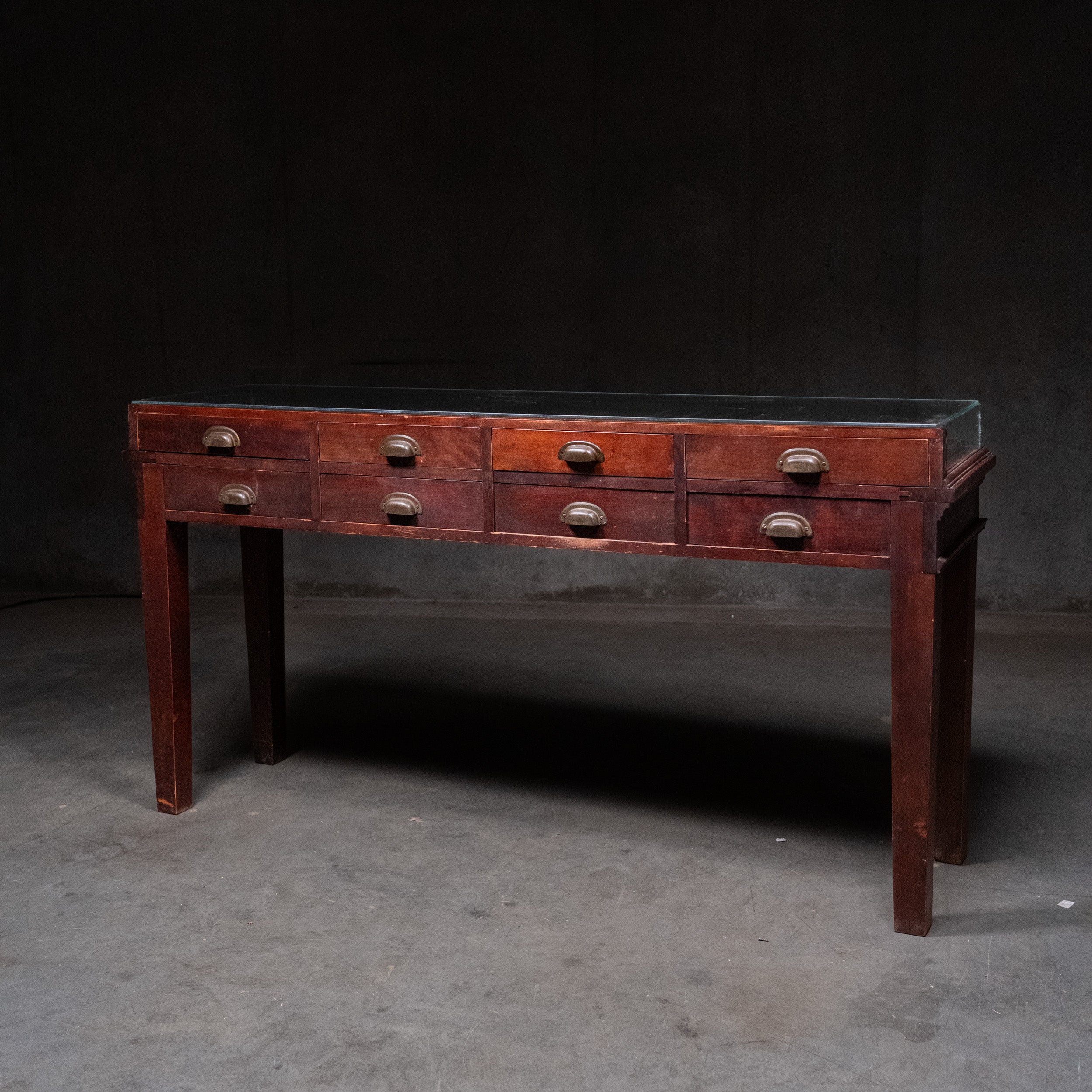 A country counter / console multi drawer fdisplay case. Retains old finish.