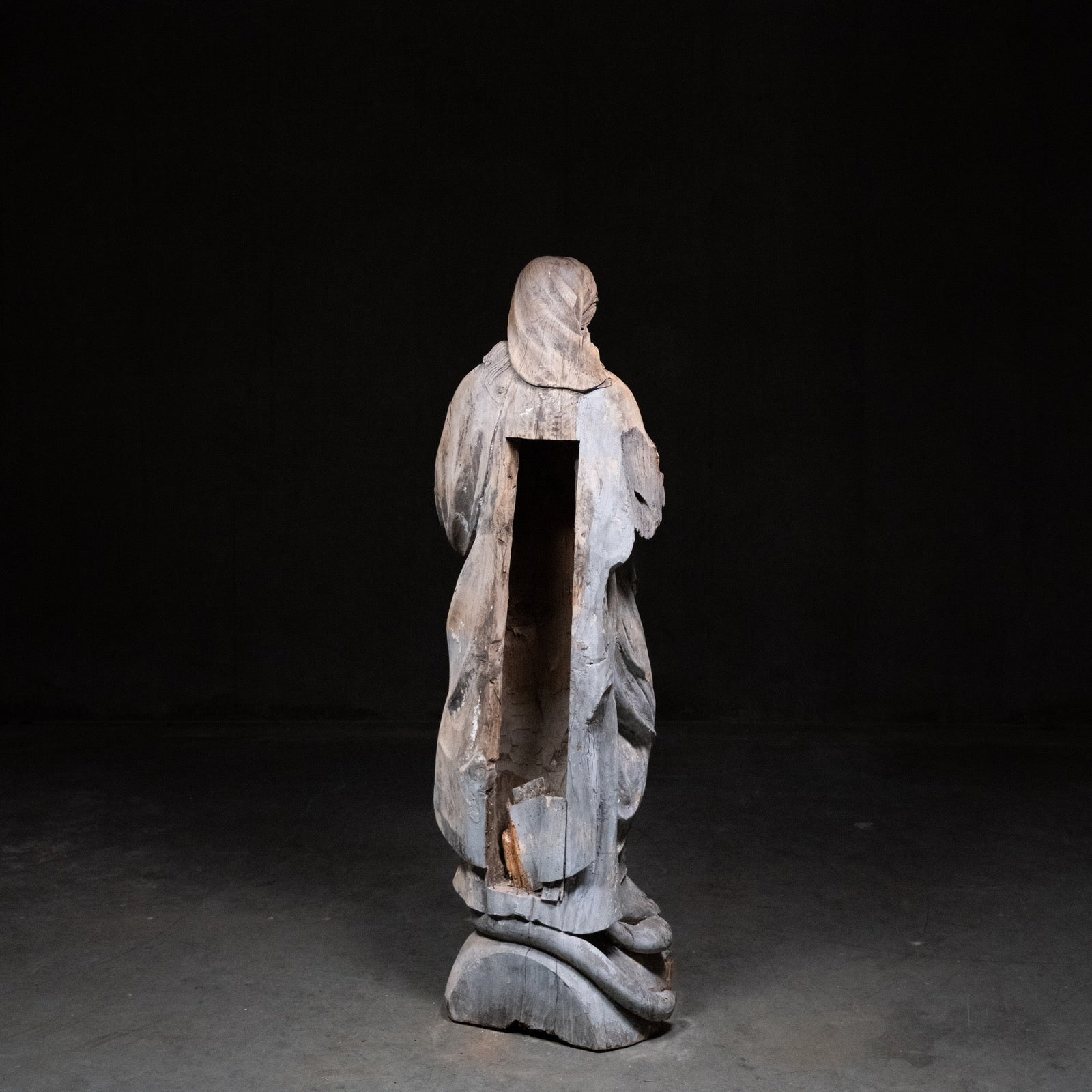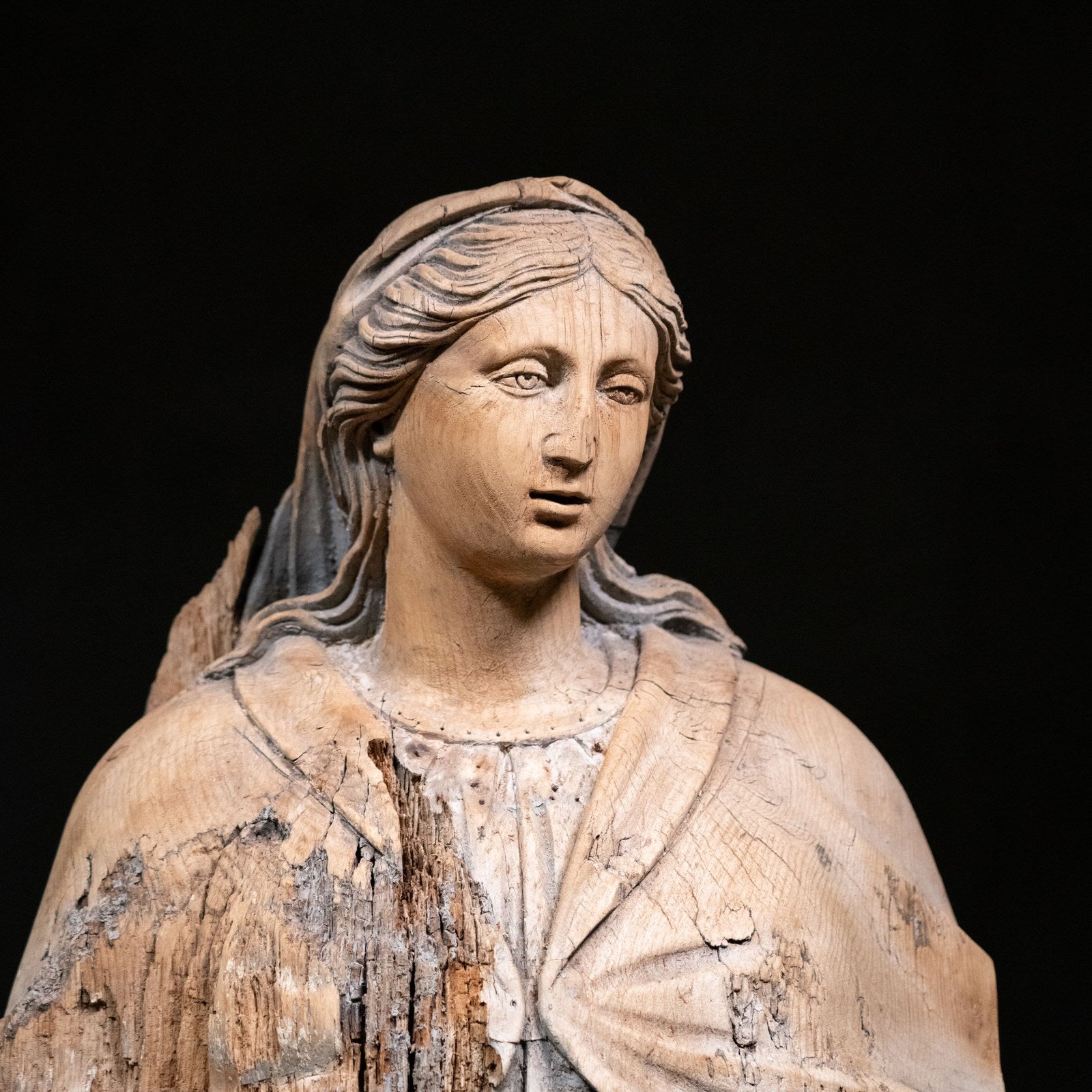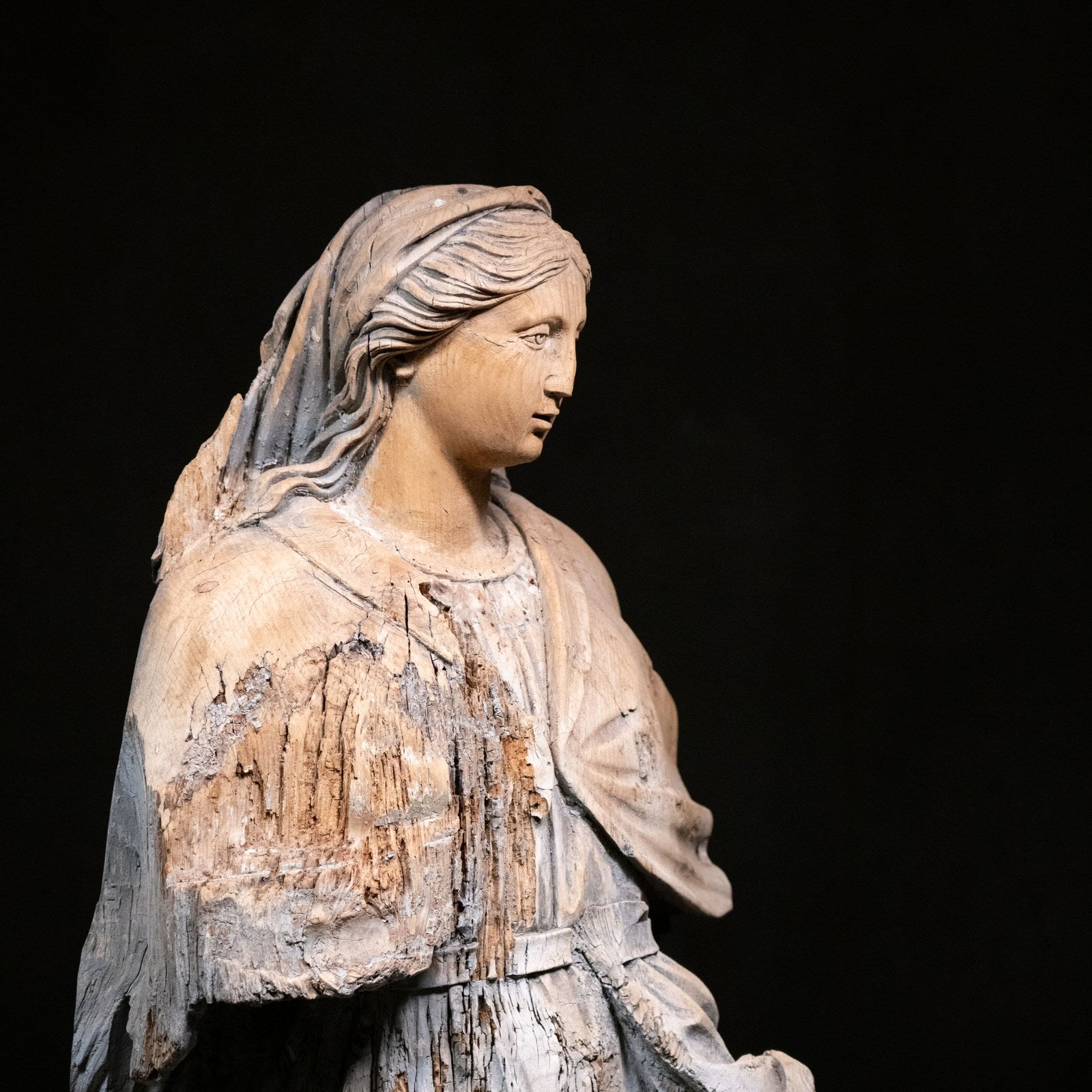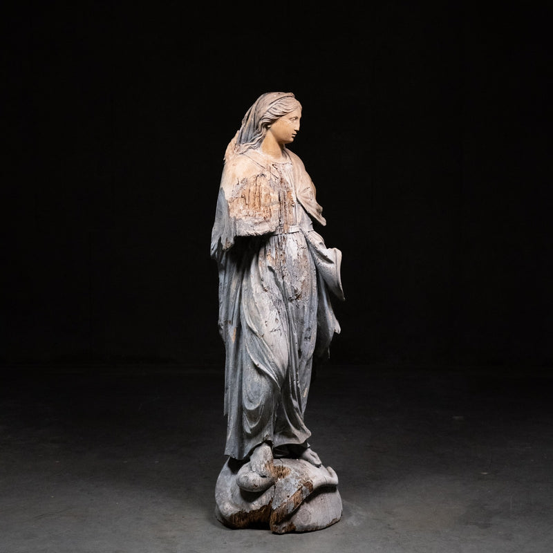 Acquired from a collector of French antiques, this statue was purchased in Lyon. This large piece retains some old colour and aged soft wood patina. This salvaged sculpture is a nice example of church art completed throughout Europe by the best craftsman available.