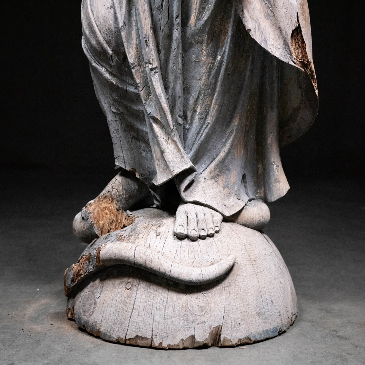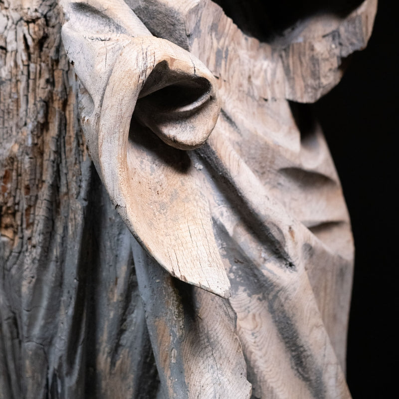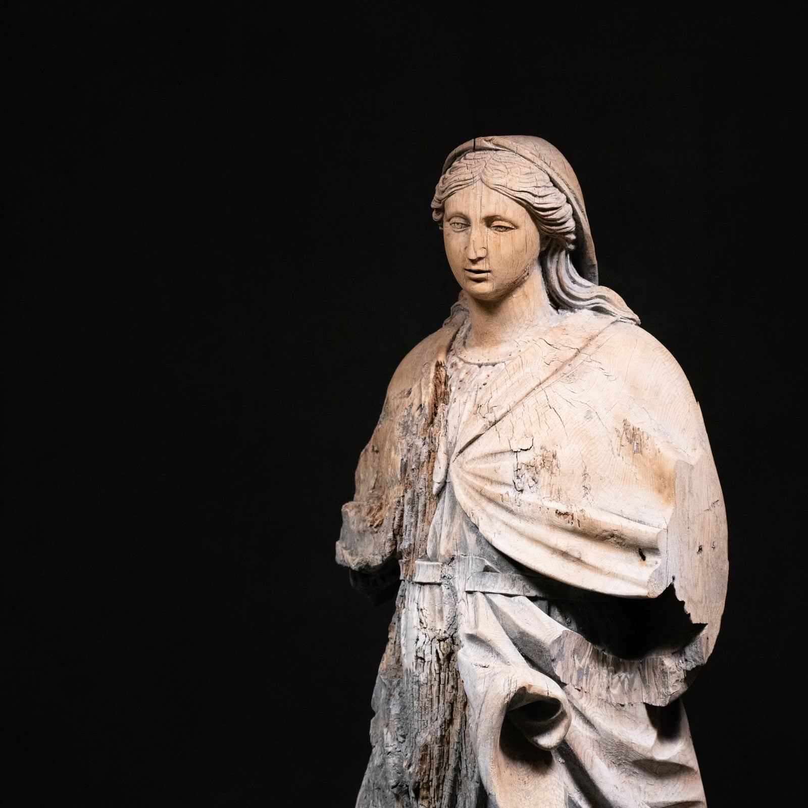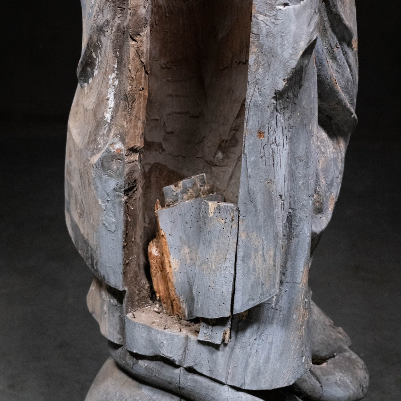 Acquired from a collector of French antiques, this statue was purchased in Lyon. This large piece retains some old colour and aged soft wood patina. This salvaged sculpture is a nice example of church art completed throughout Europe by the best craftsman available.