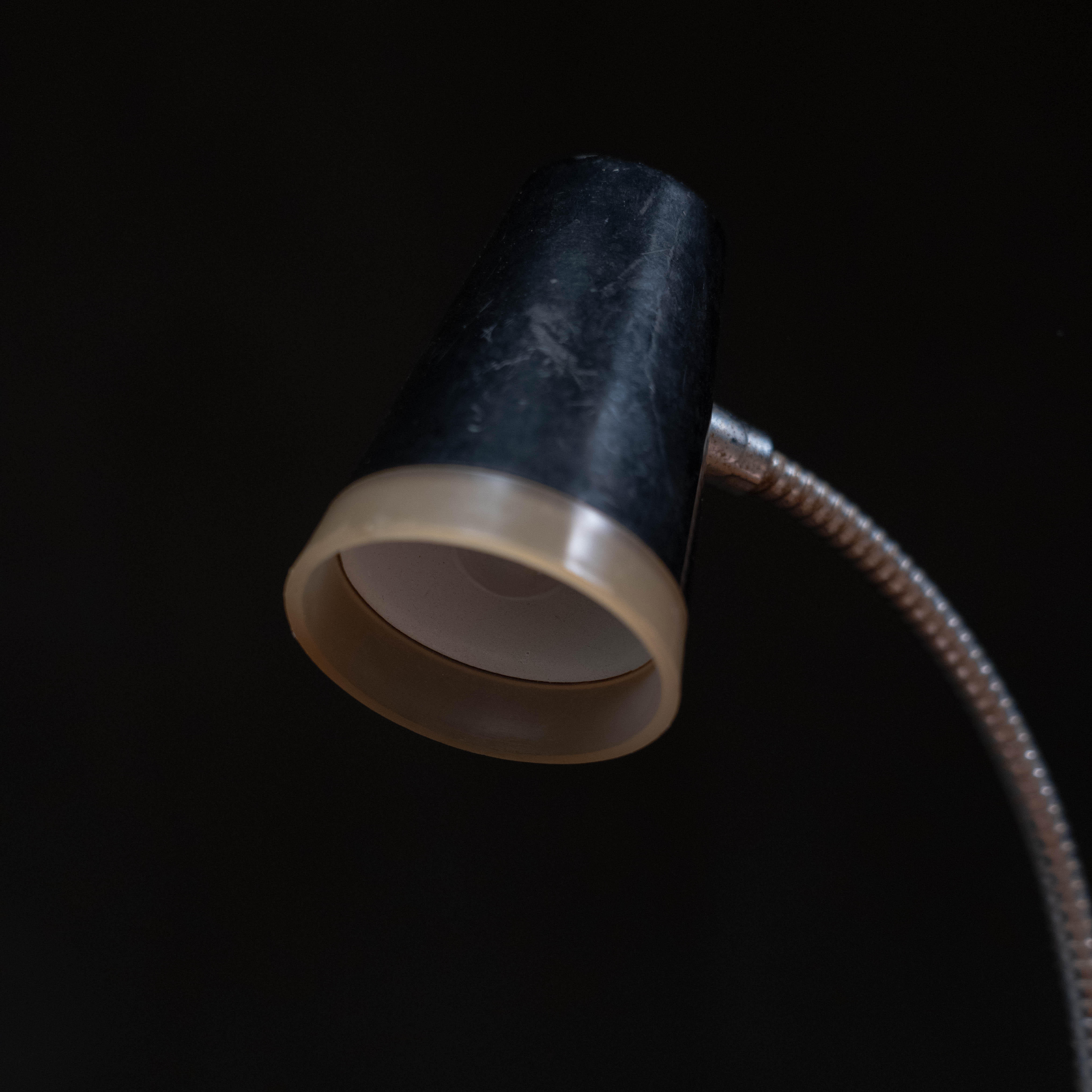This vintage 1950s black gooseneck desk lamp is a compact example of early post-war industrial design, featuring a glossy Bakelite base, chrome flexible neck, and tapered phenolic shade with its original translucent diffuser ring. Built for use in offices, workshops, and drafting rooms, it offers a focused, directional light and a footprint small enough for any desk or bedside.