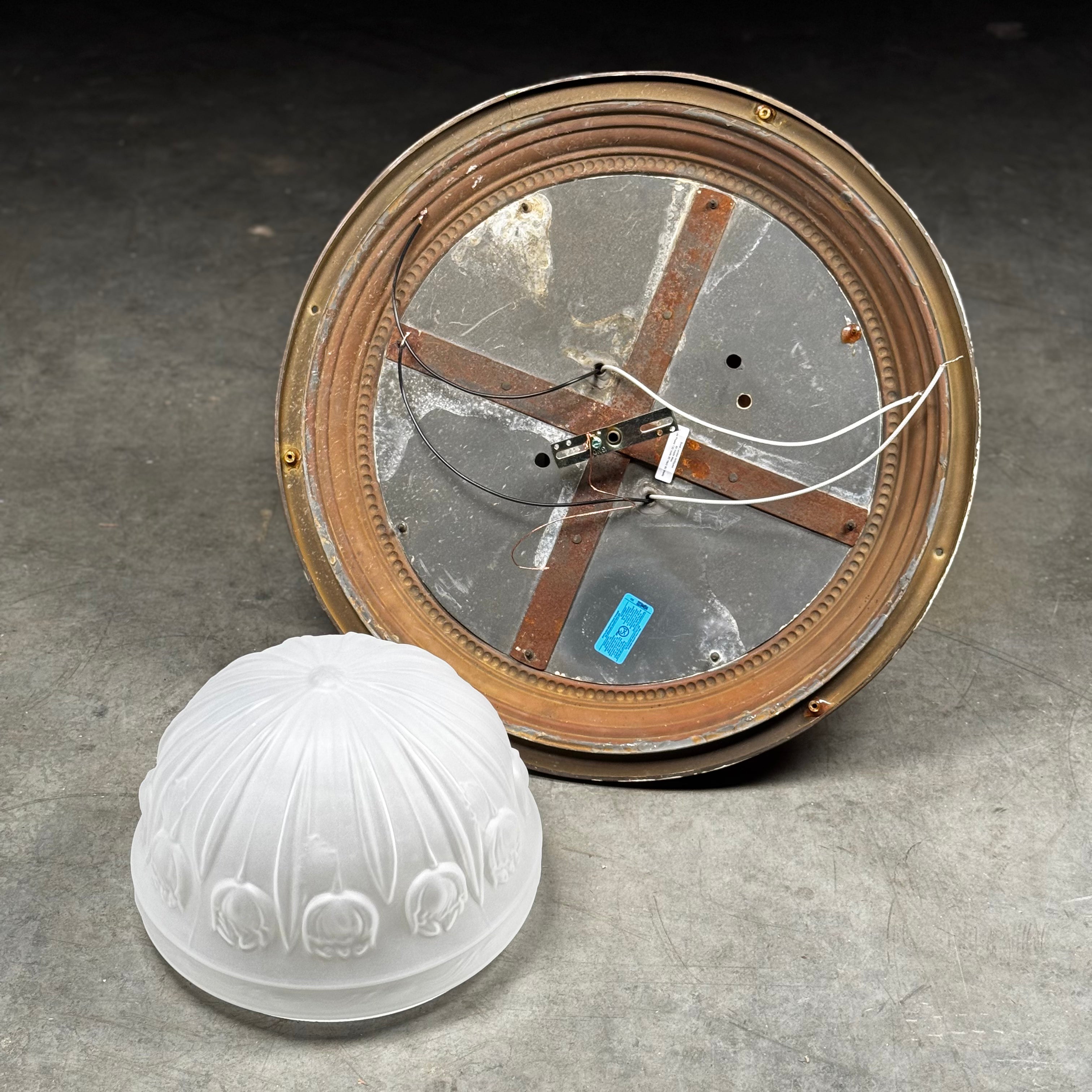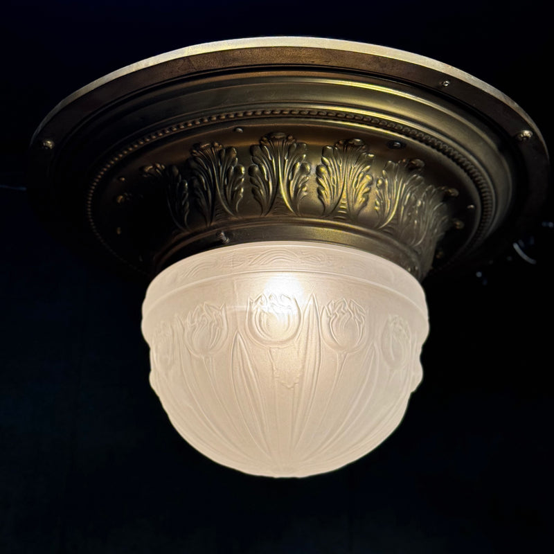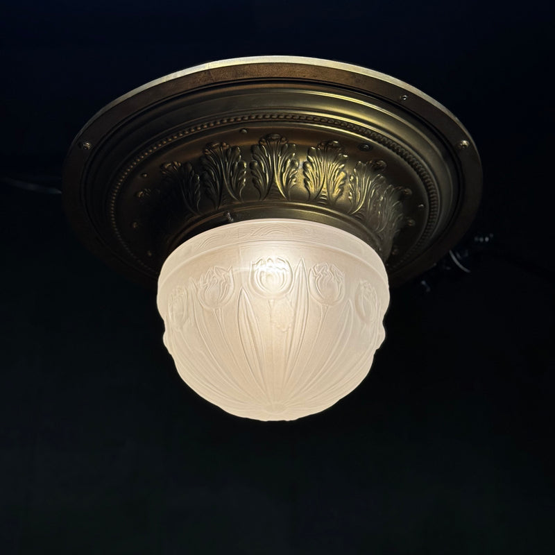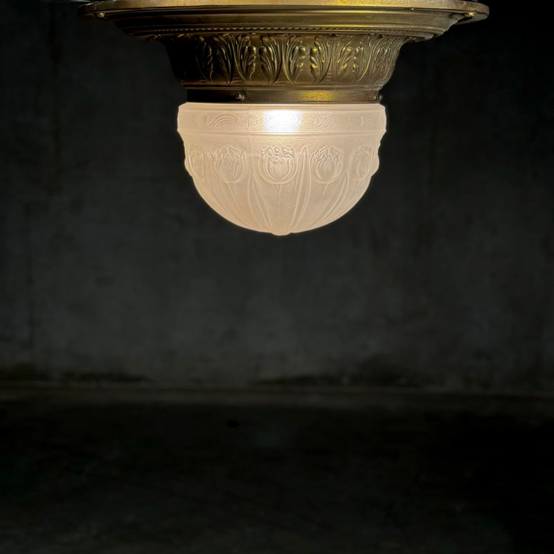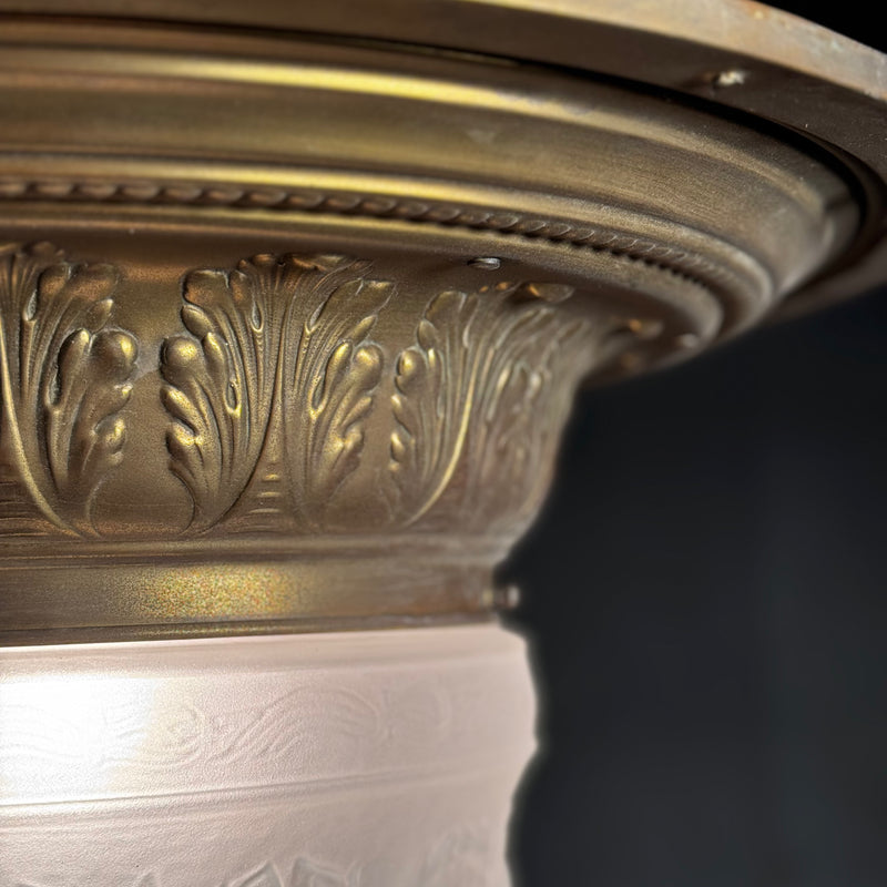 Large Etched Frosted Glass & Brass Gilded Flushmount