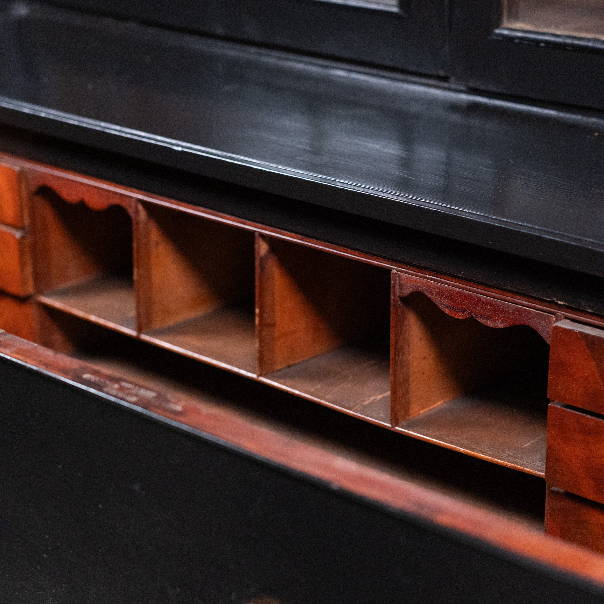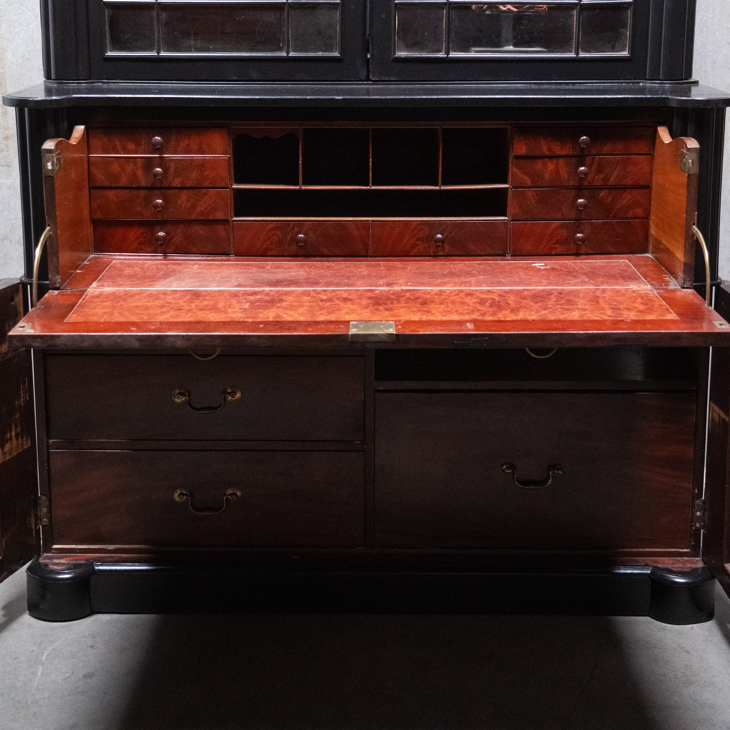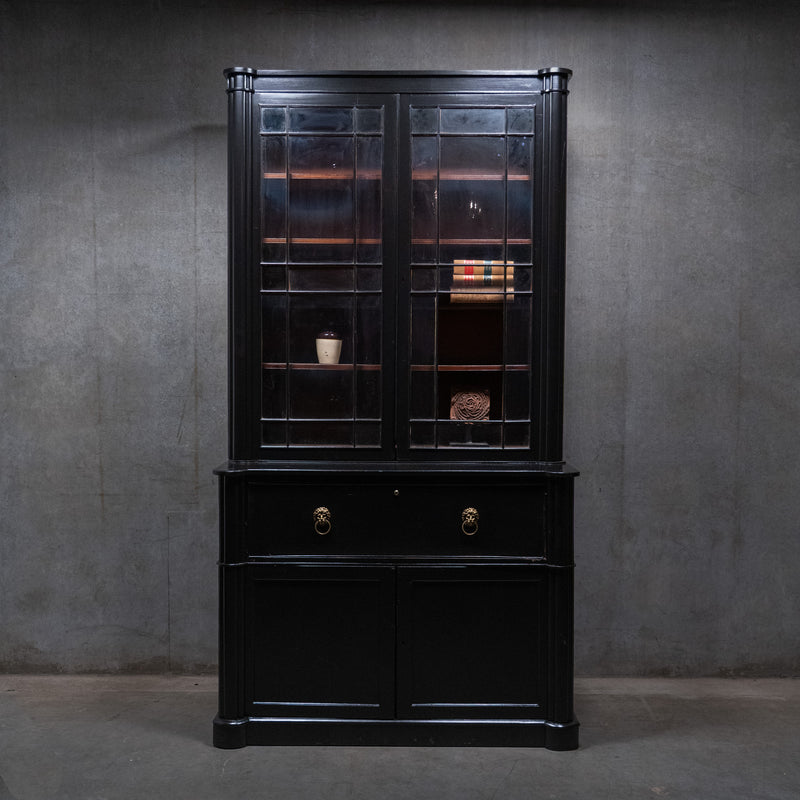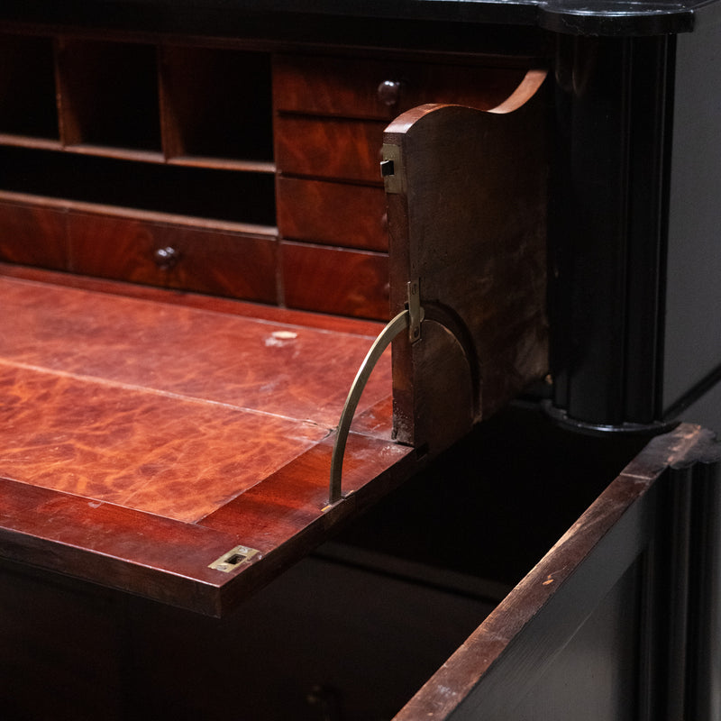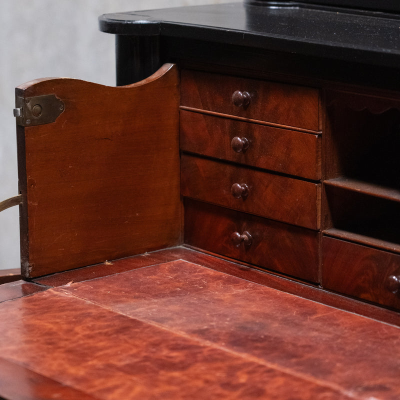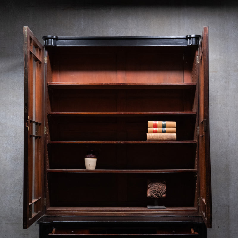 English Ebonized Secretary library Bookcase Desk – Stamped London Maker, Mahogany Interior c.1900
