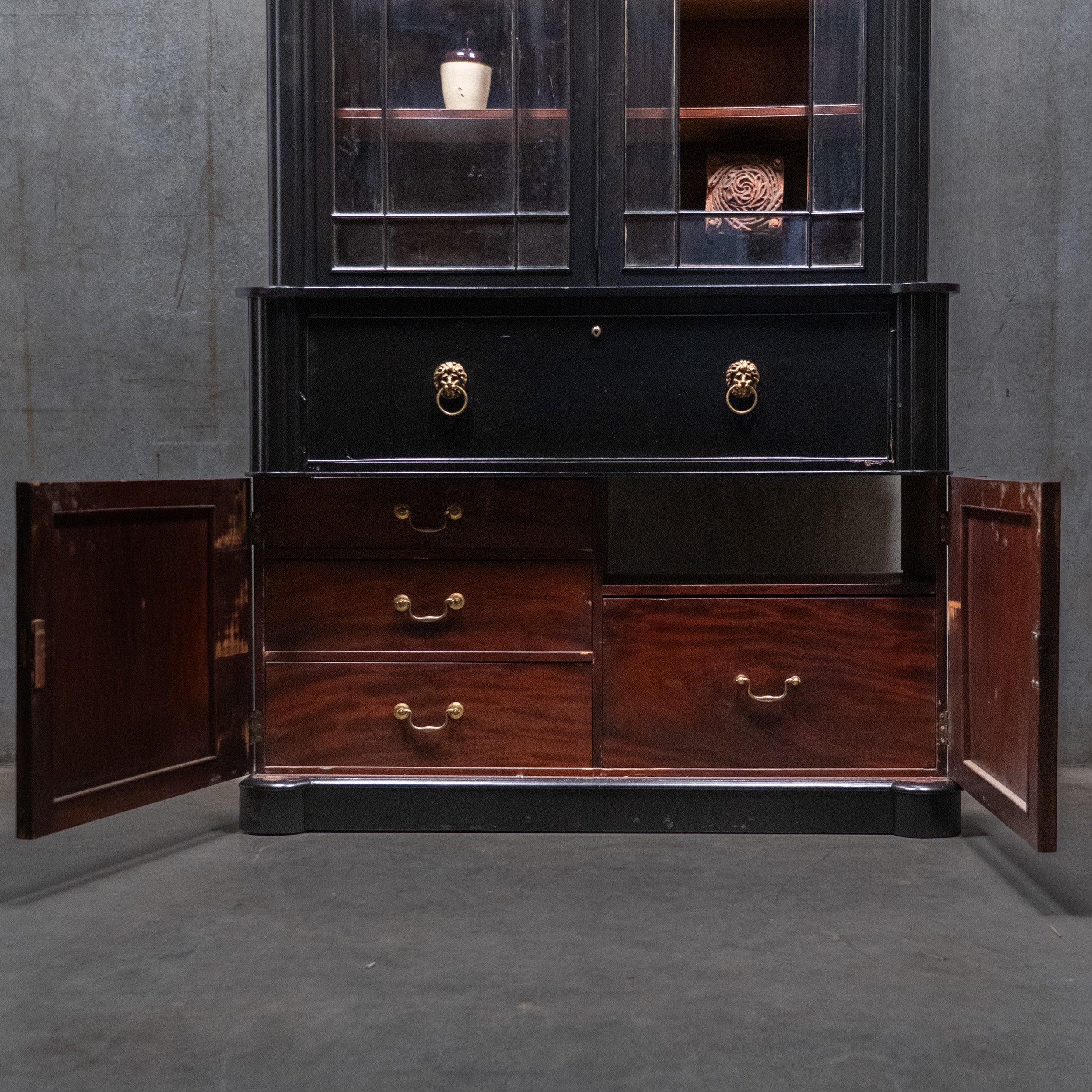 Brass lion head ring pulls and architectural proportions give the piece a strong library presence. A functional and visually striking desk suited to both period homes and modern interiors seeking contrast and character. Great library den piece.