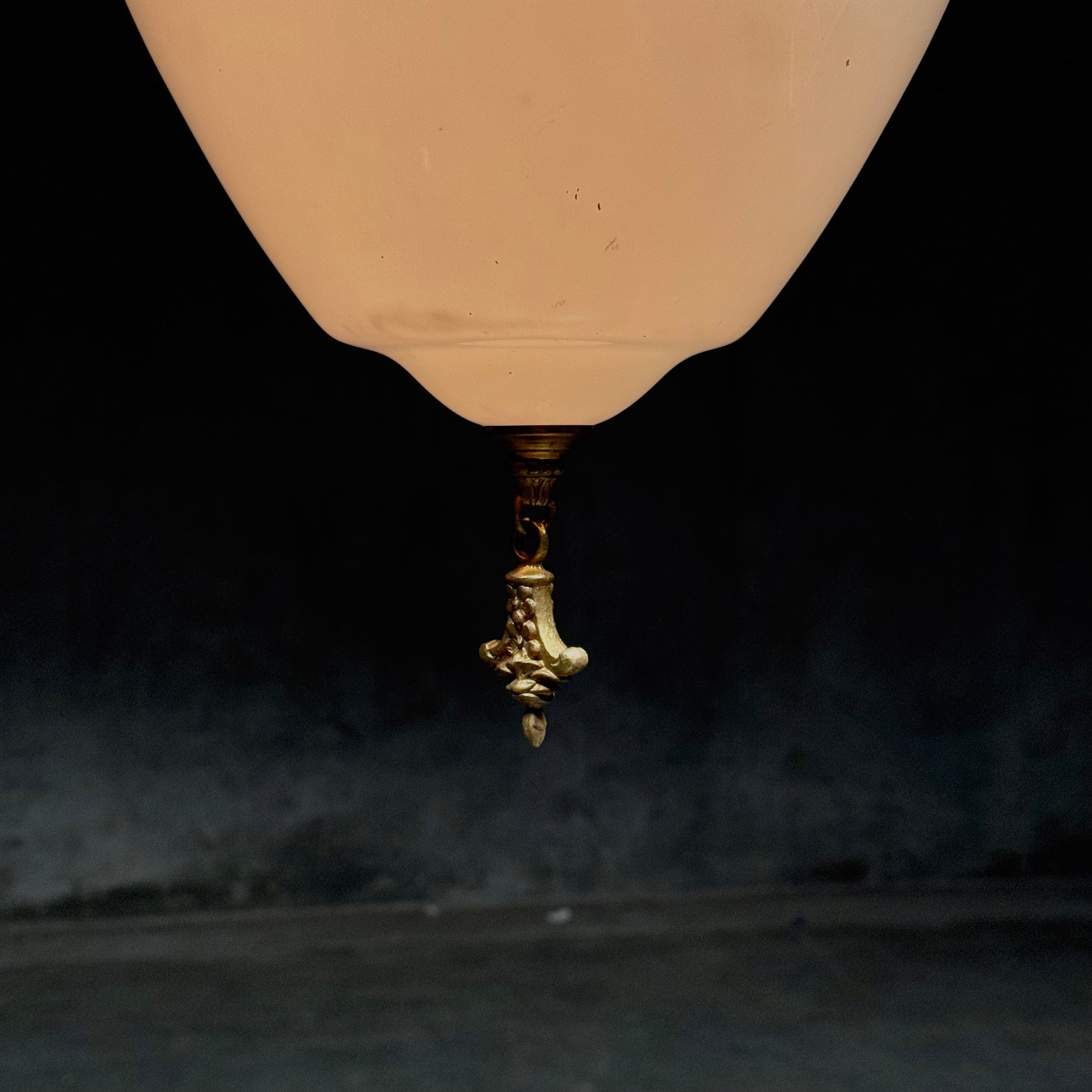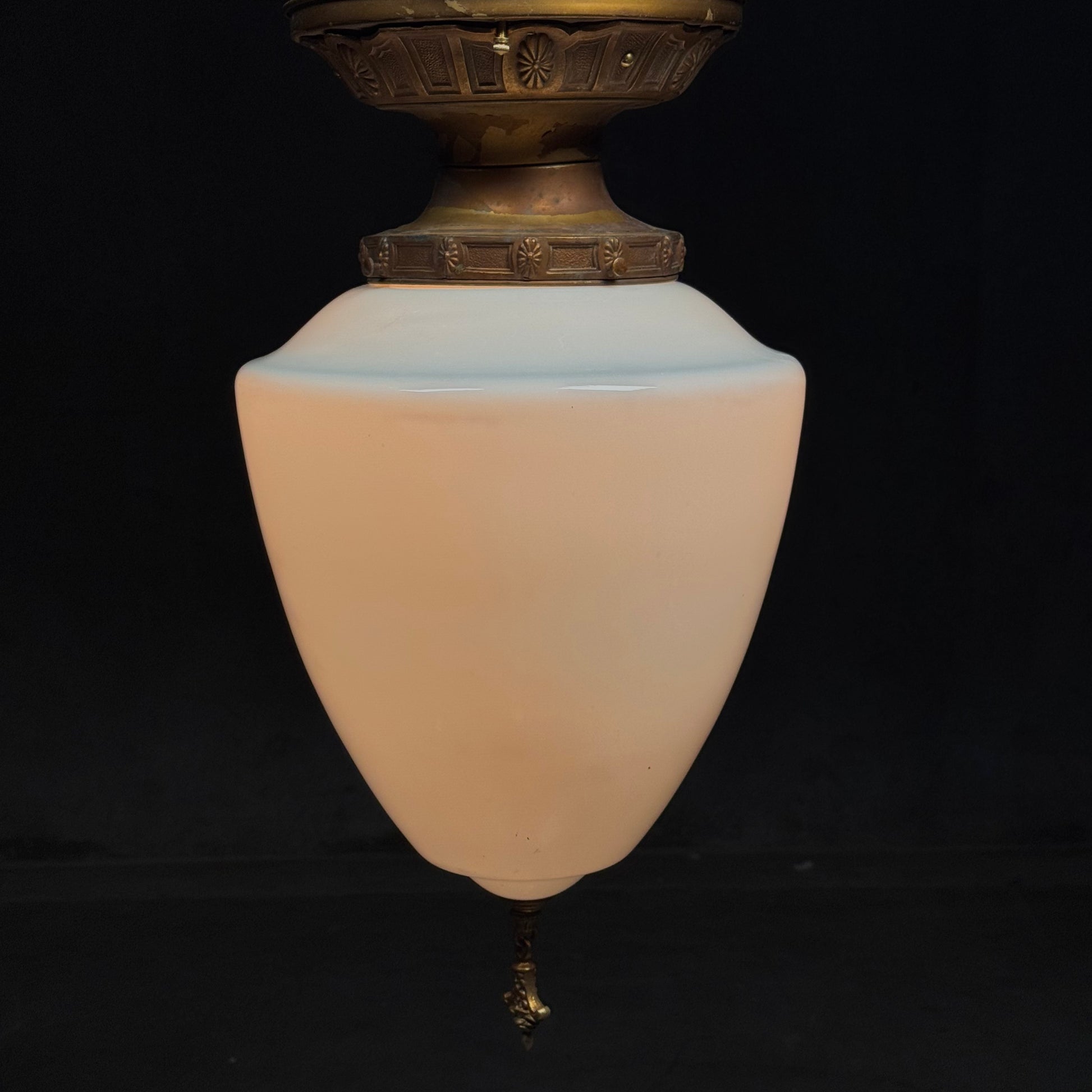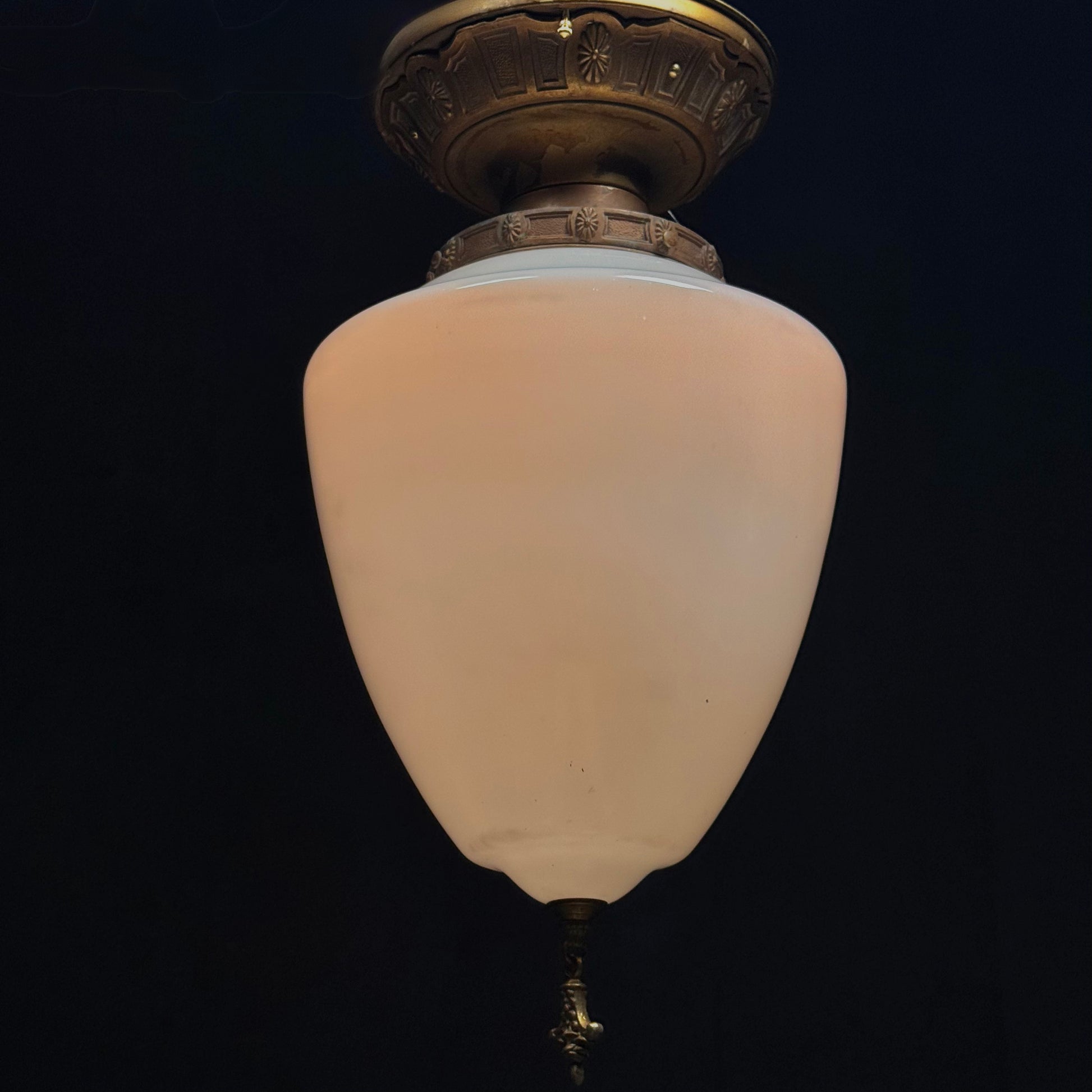 A large, heavy brass detailed, cast fitter holds a large acorn milk glass shade with detailed finial.