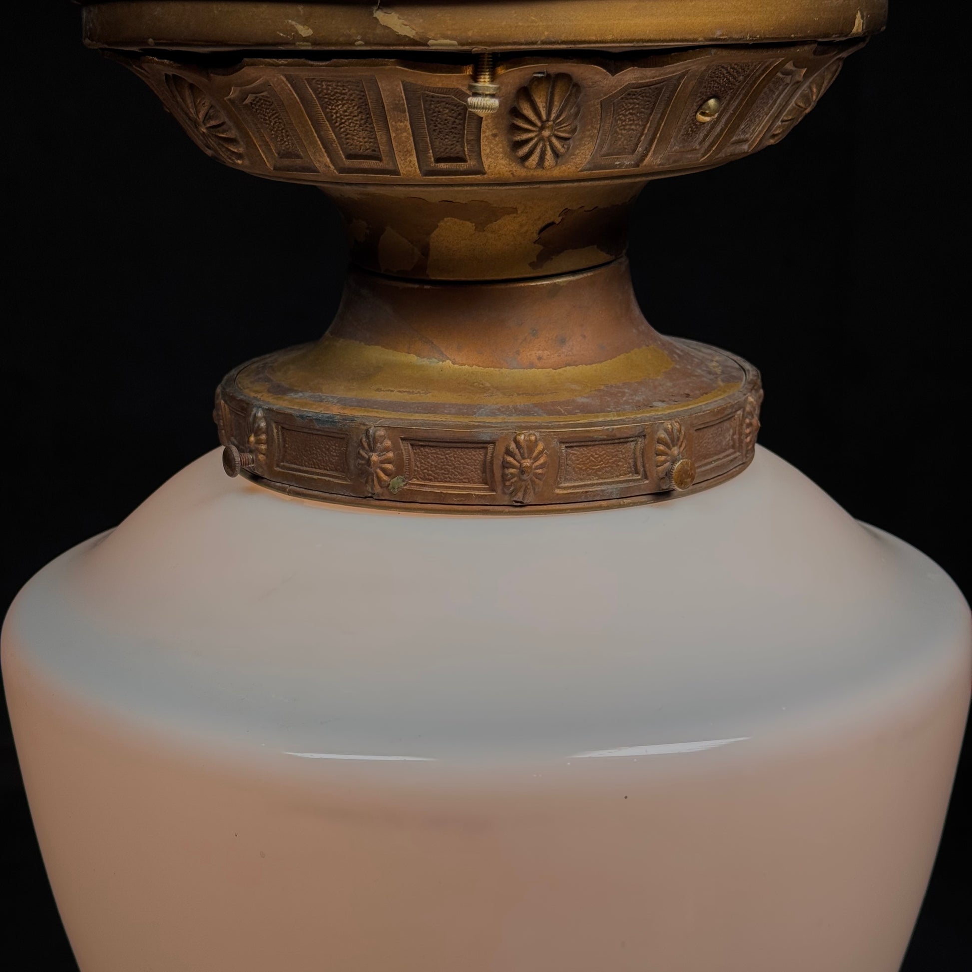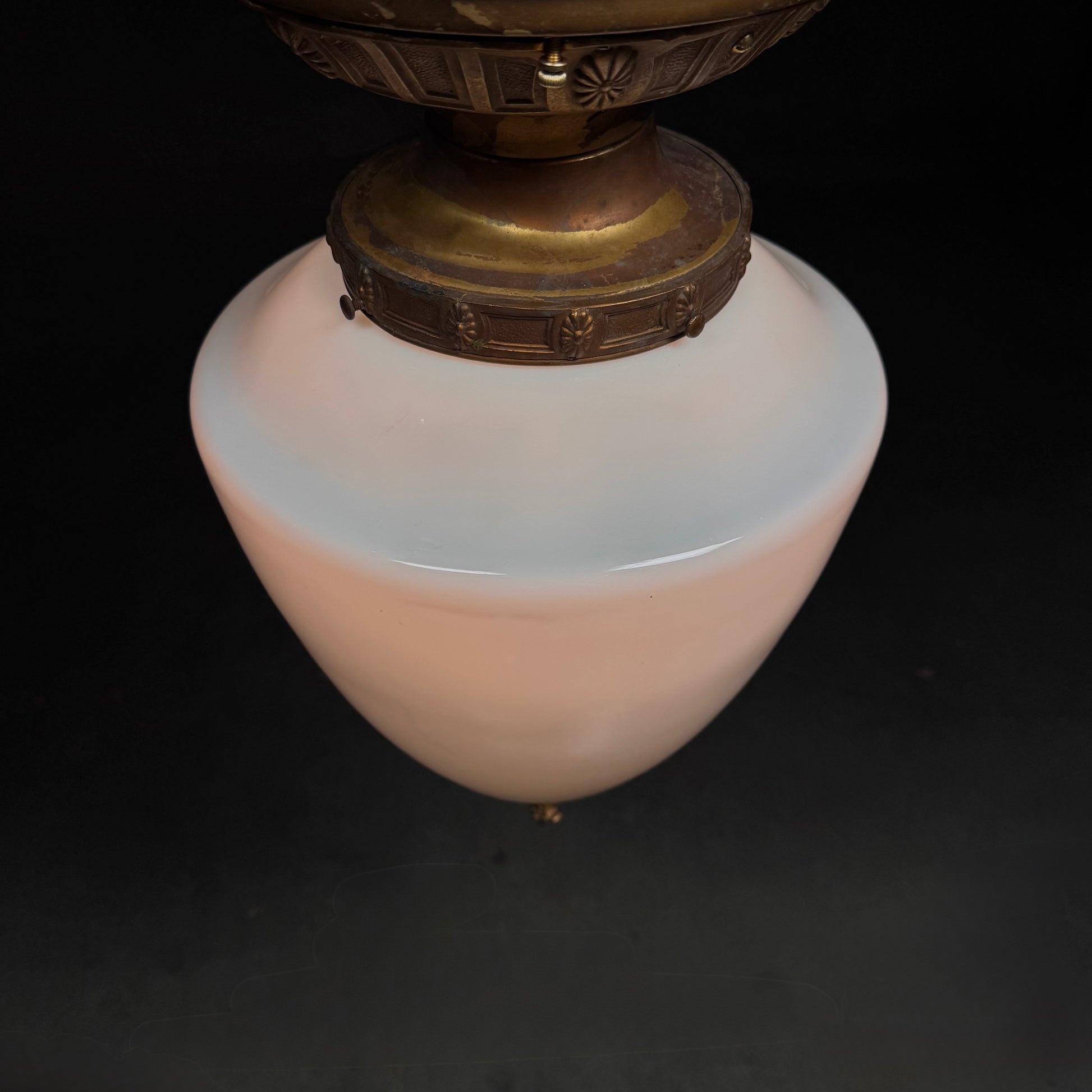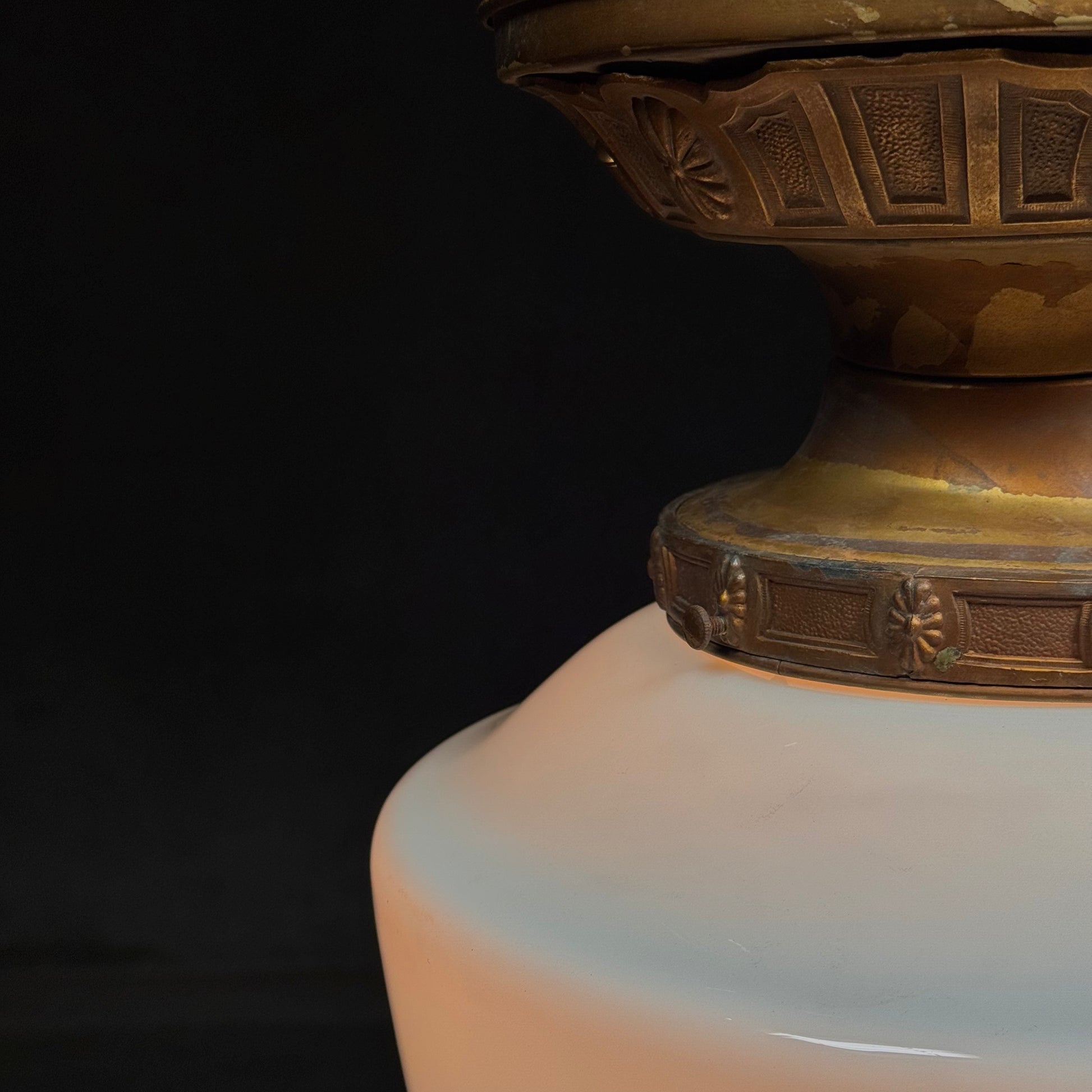 A large, heavy brass detailed, cast fitter holds a large acorn milk glass shade with detailed finial.