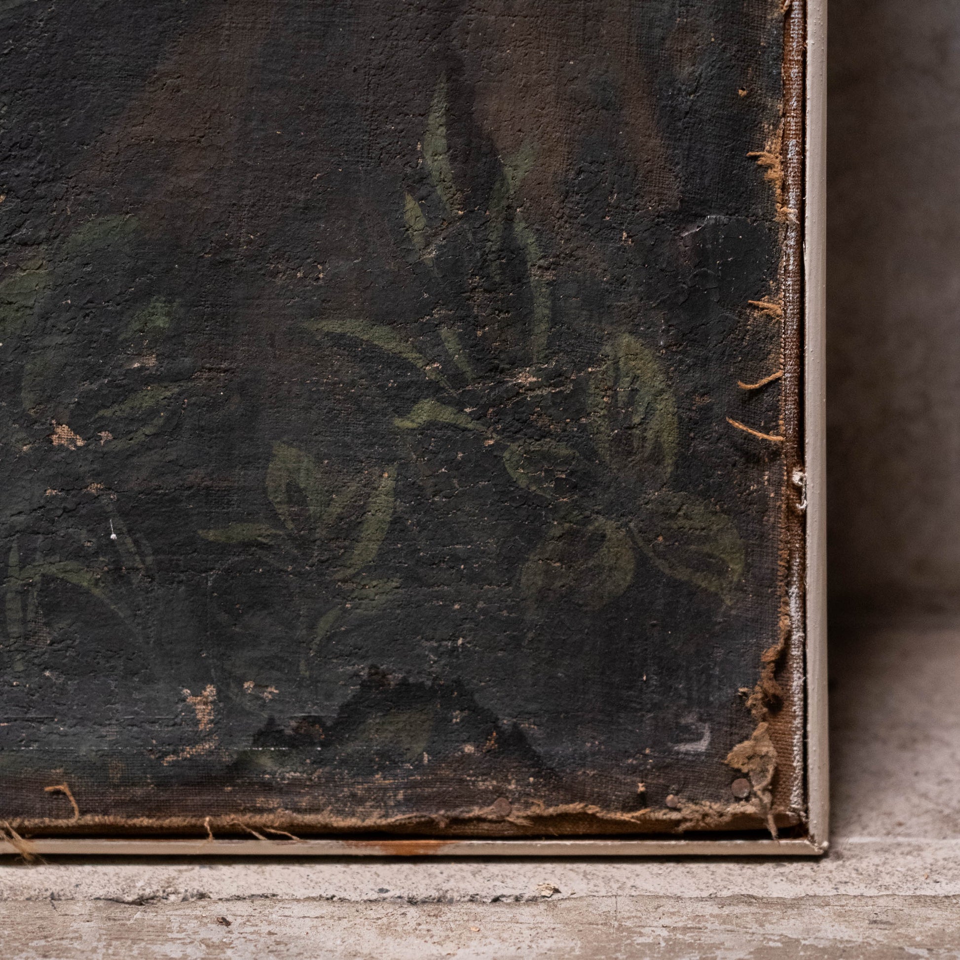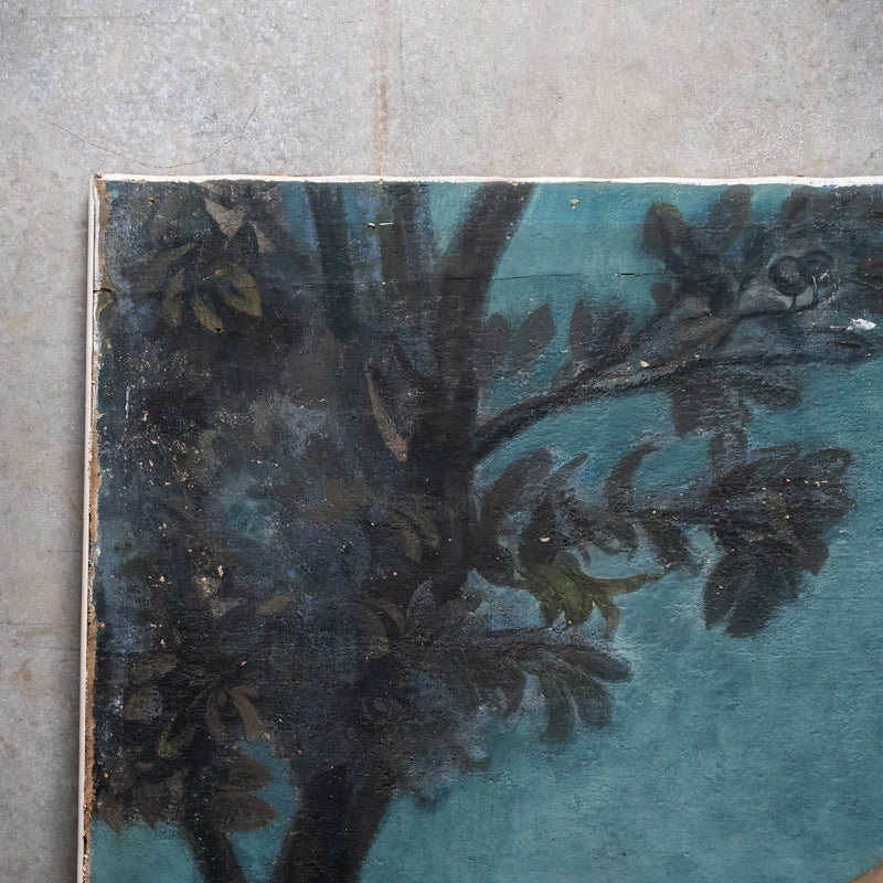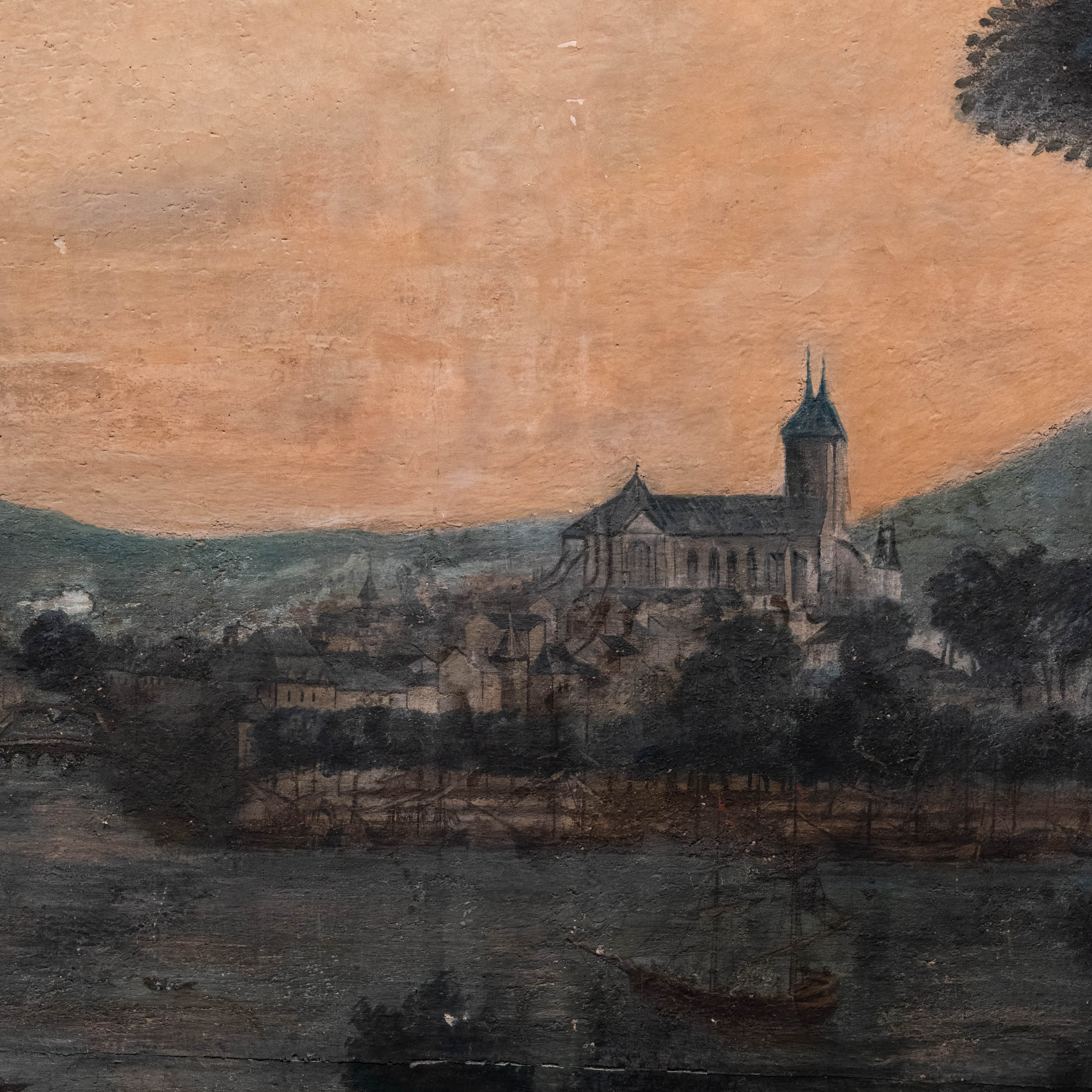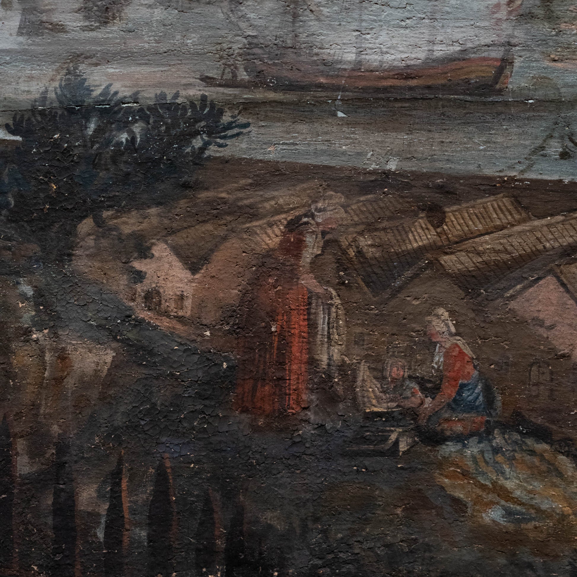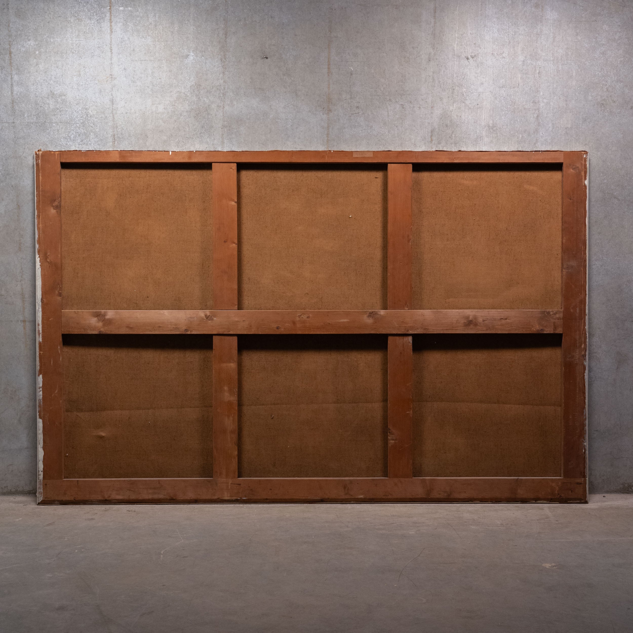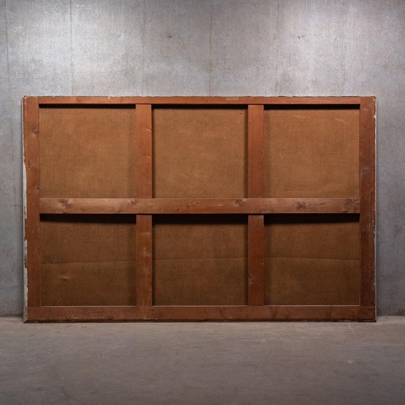 Unframed large oil on canvas, purchased in France. Lots of buildings, figures, animals and muted colours. Nice big art not easily found today.