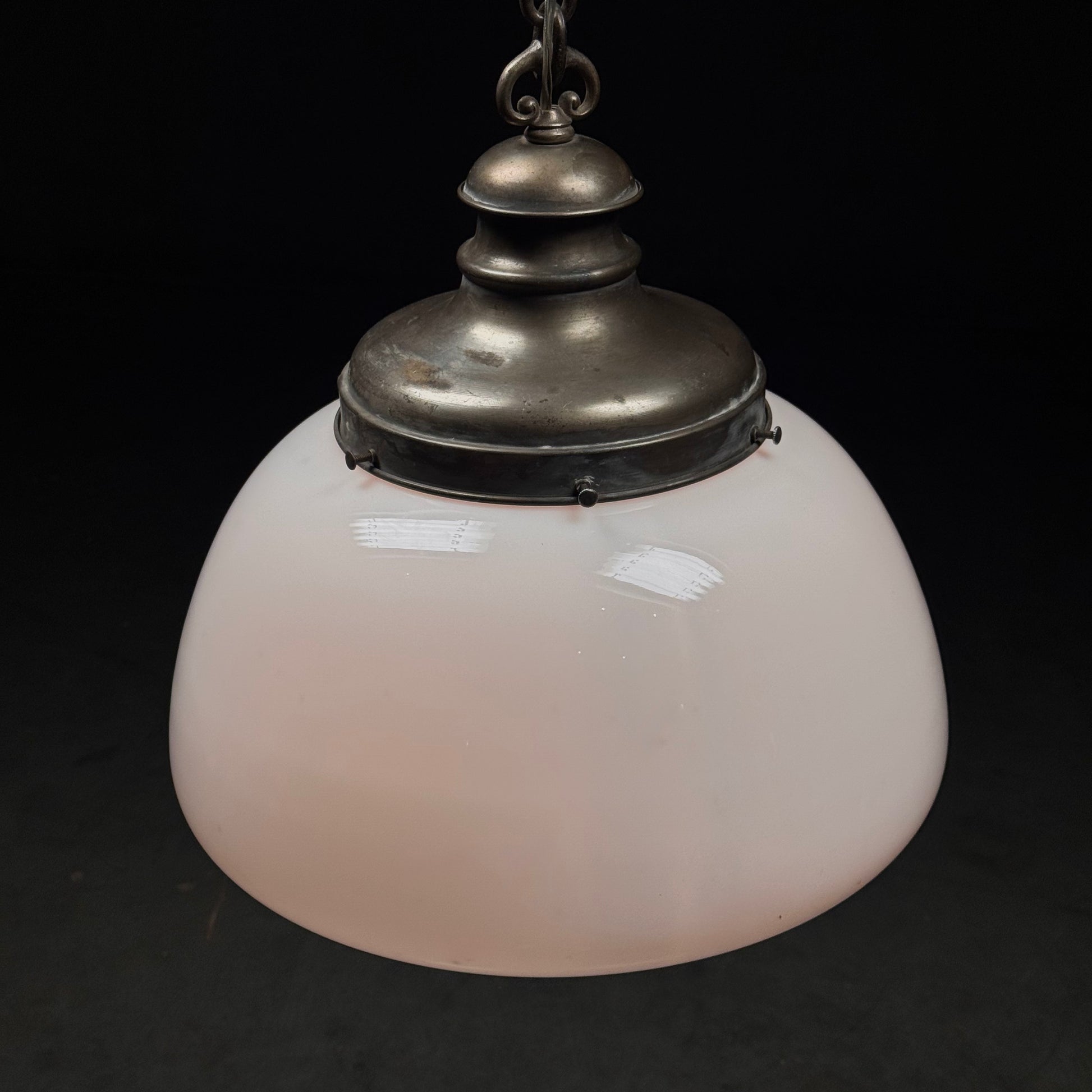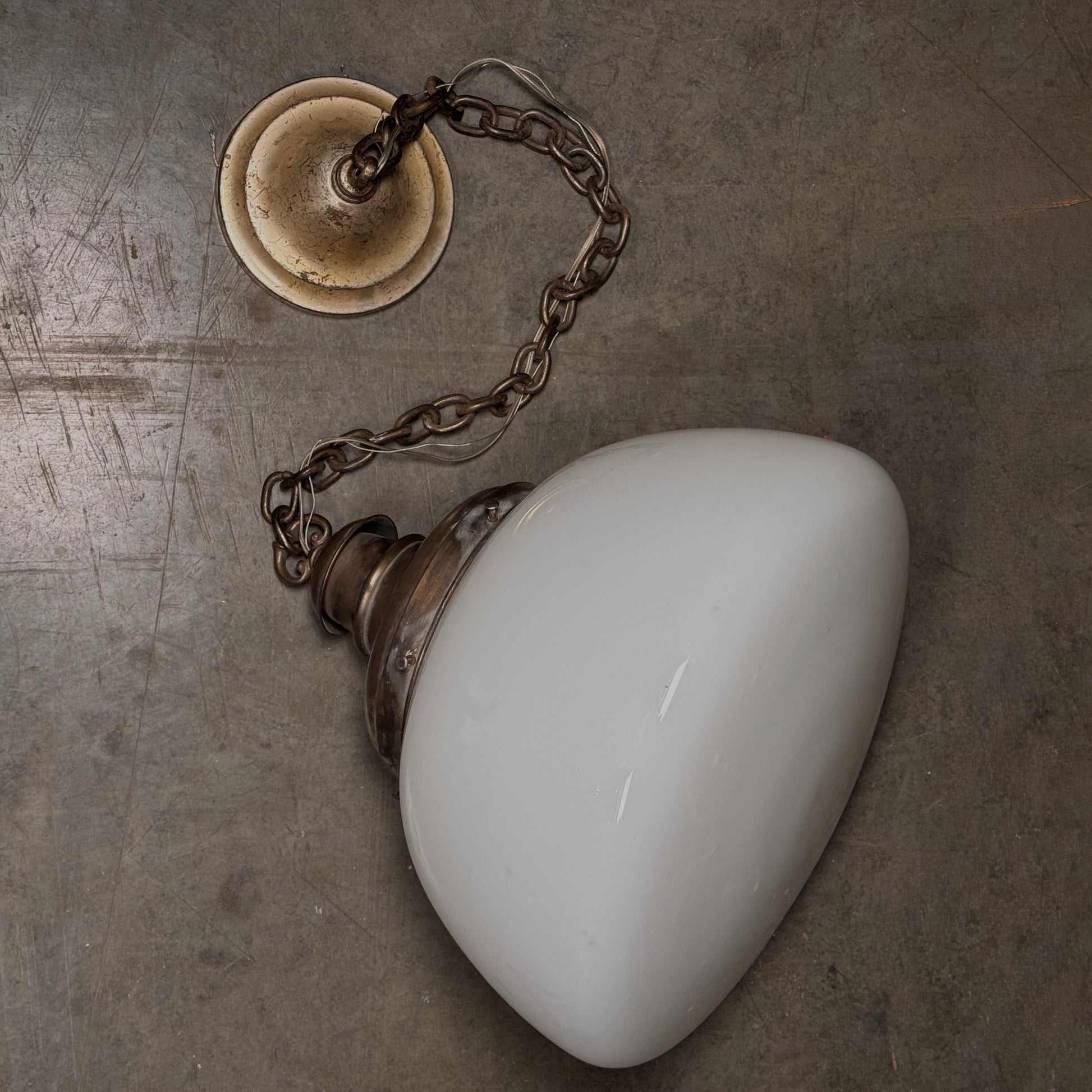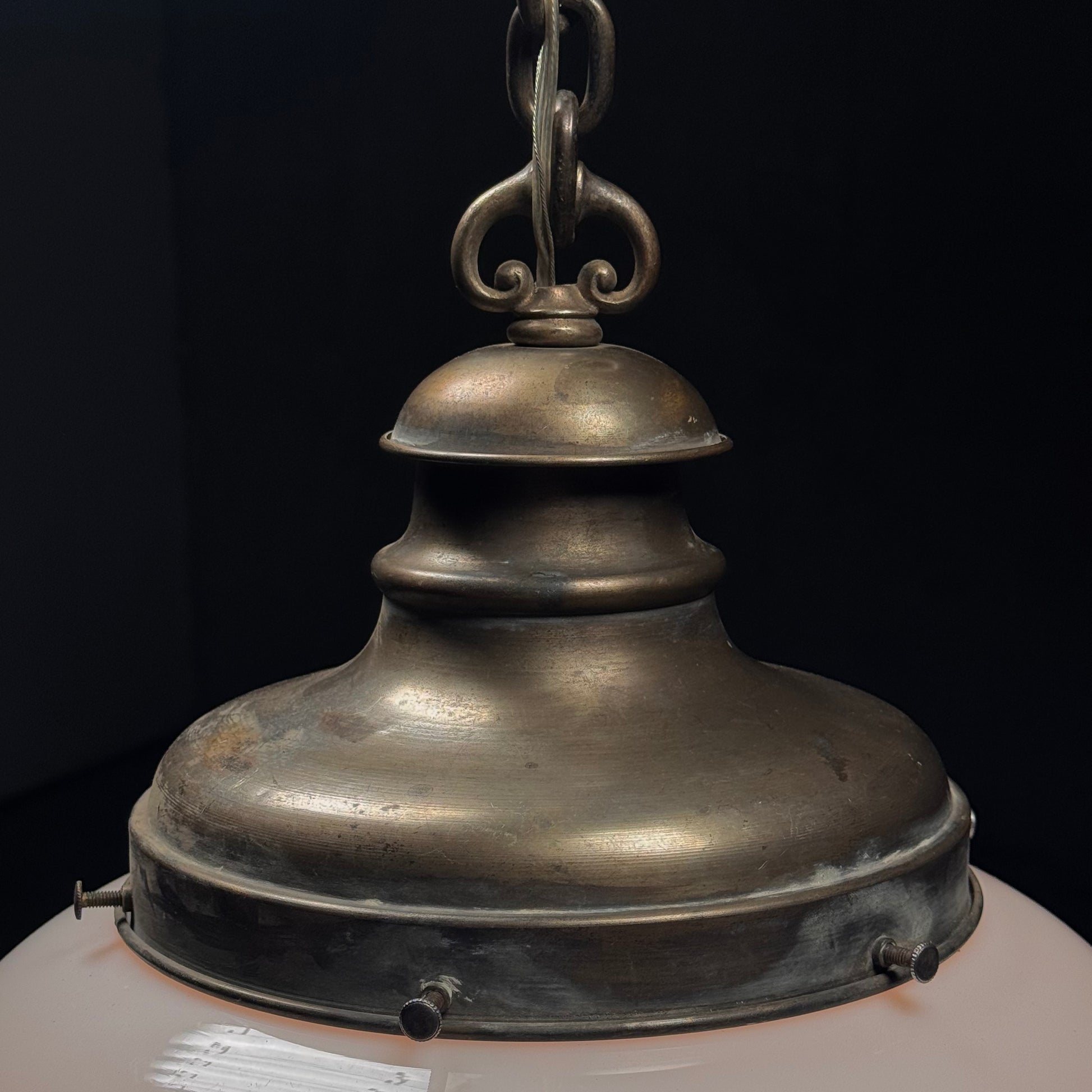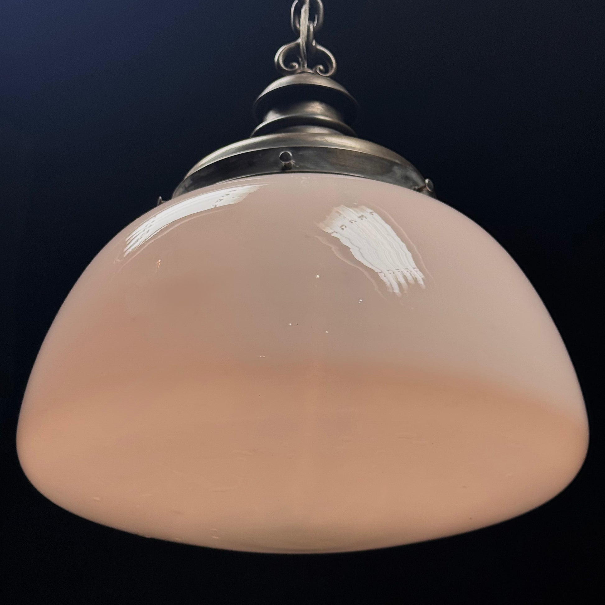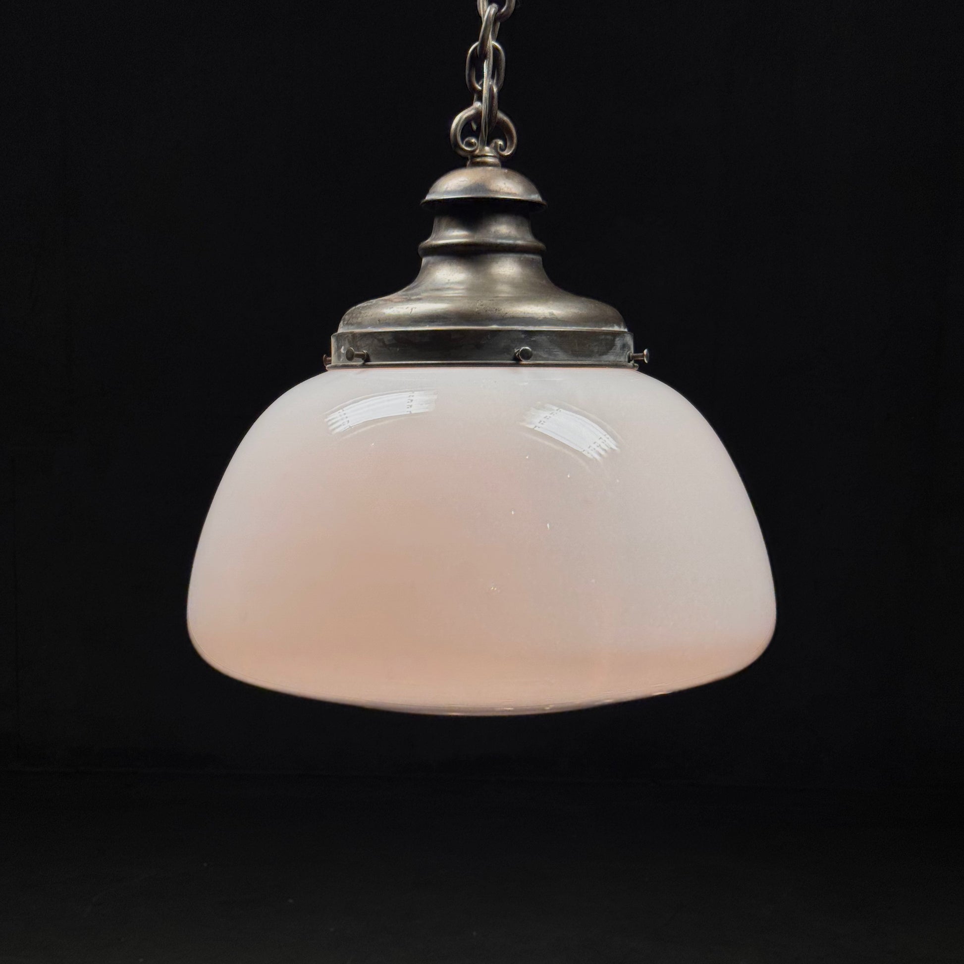 An exceptional light from a bank building in the mid west. Holds a large fitter, very nice details in this hi-end schoolhouse style light.