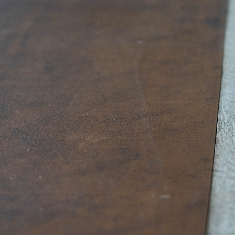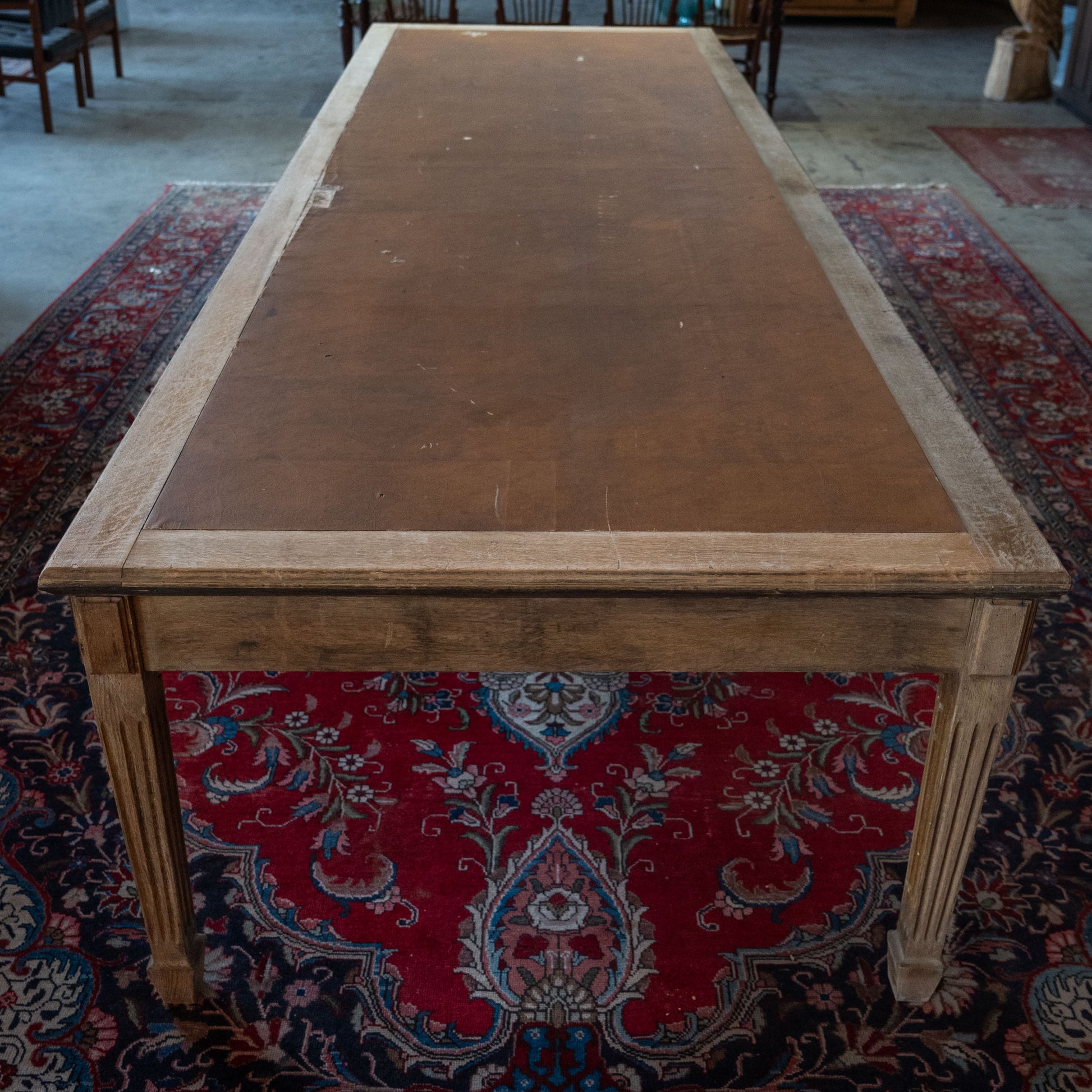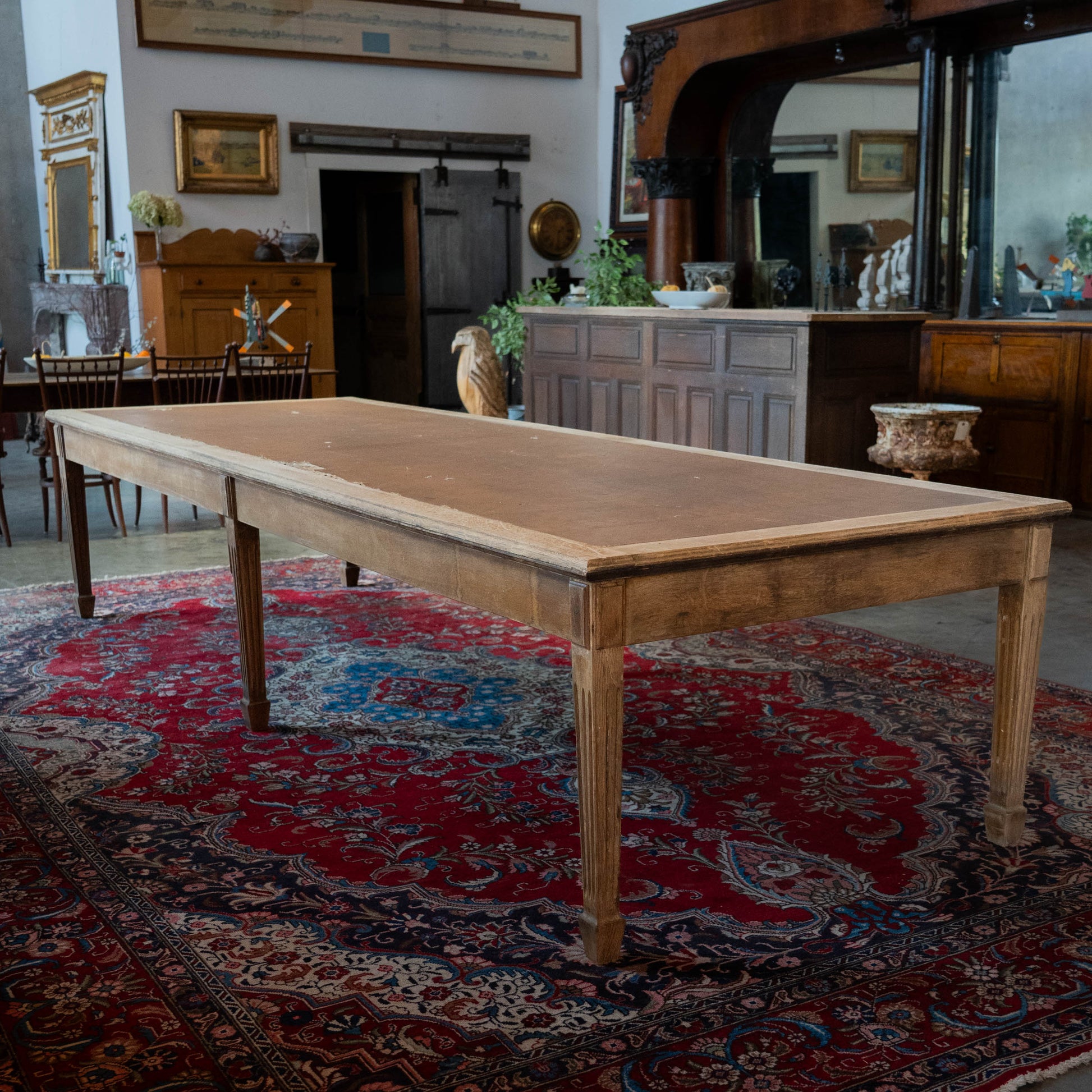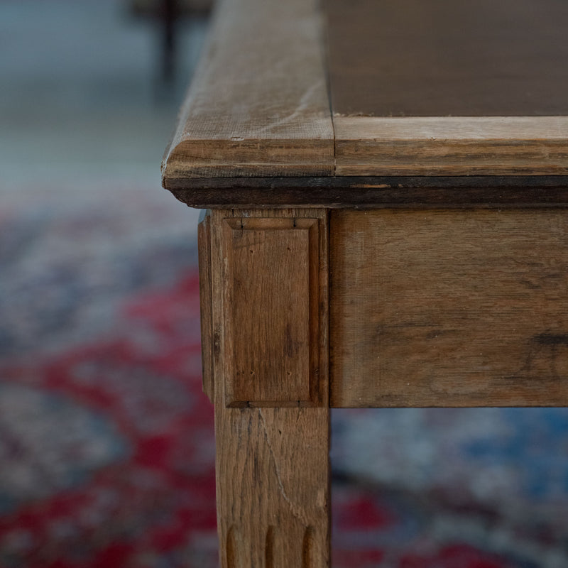 A large, wide table with carved oak details and a very worn leather top. This table offers lots of possibilities. We can remove leather and add wood or put a glass top over the leather. Great dining table or merchandising.