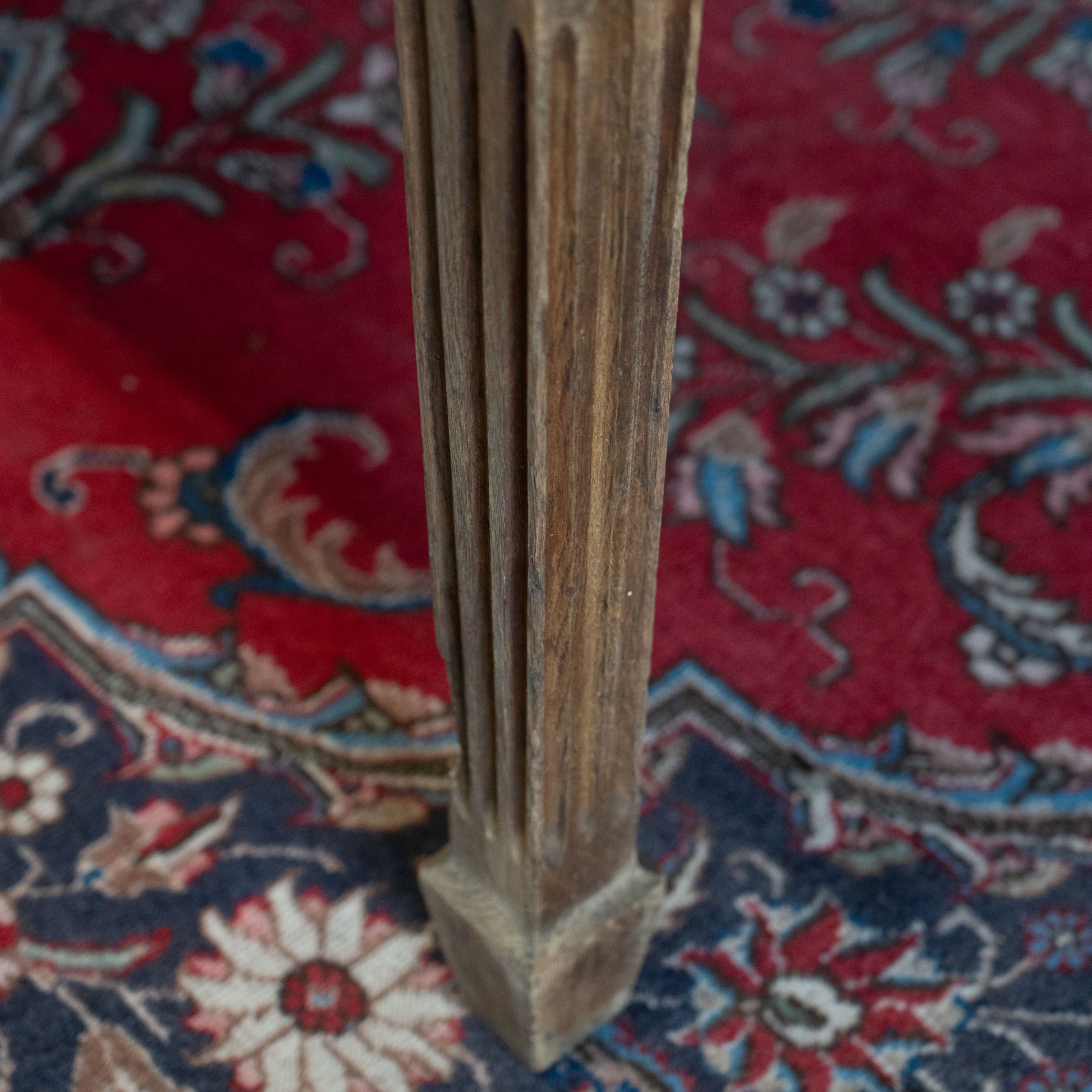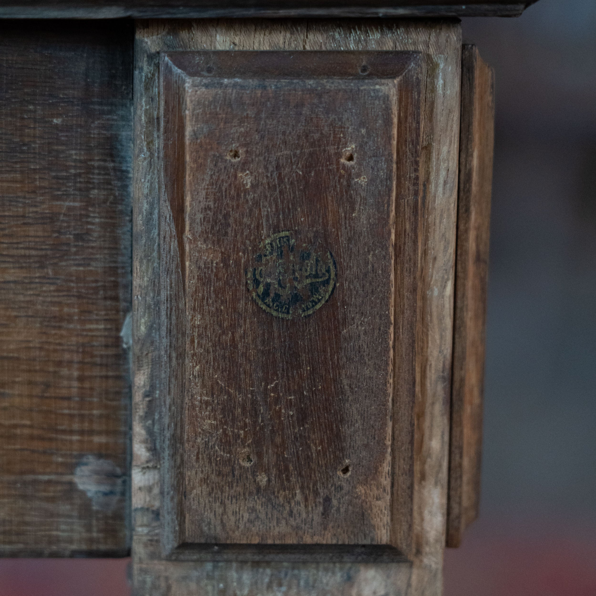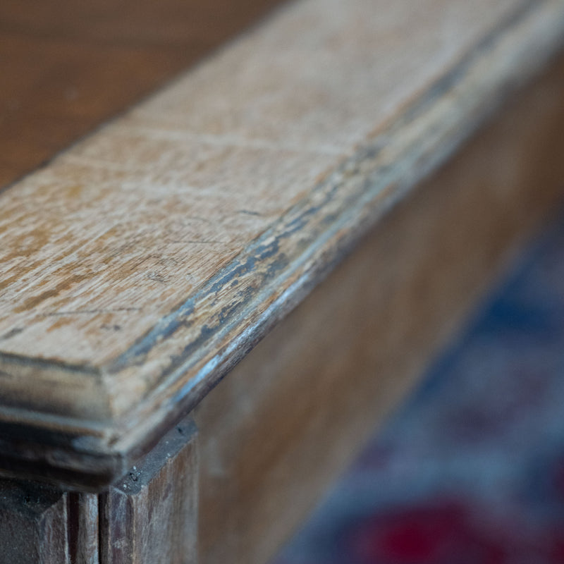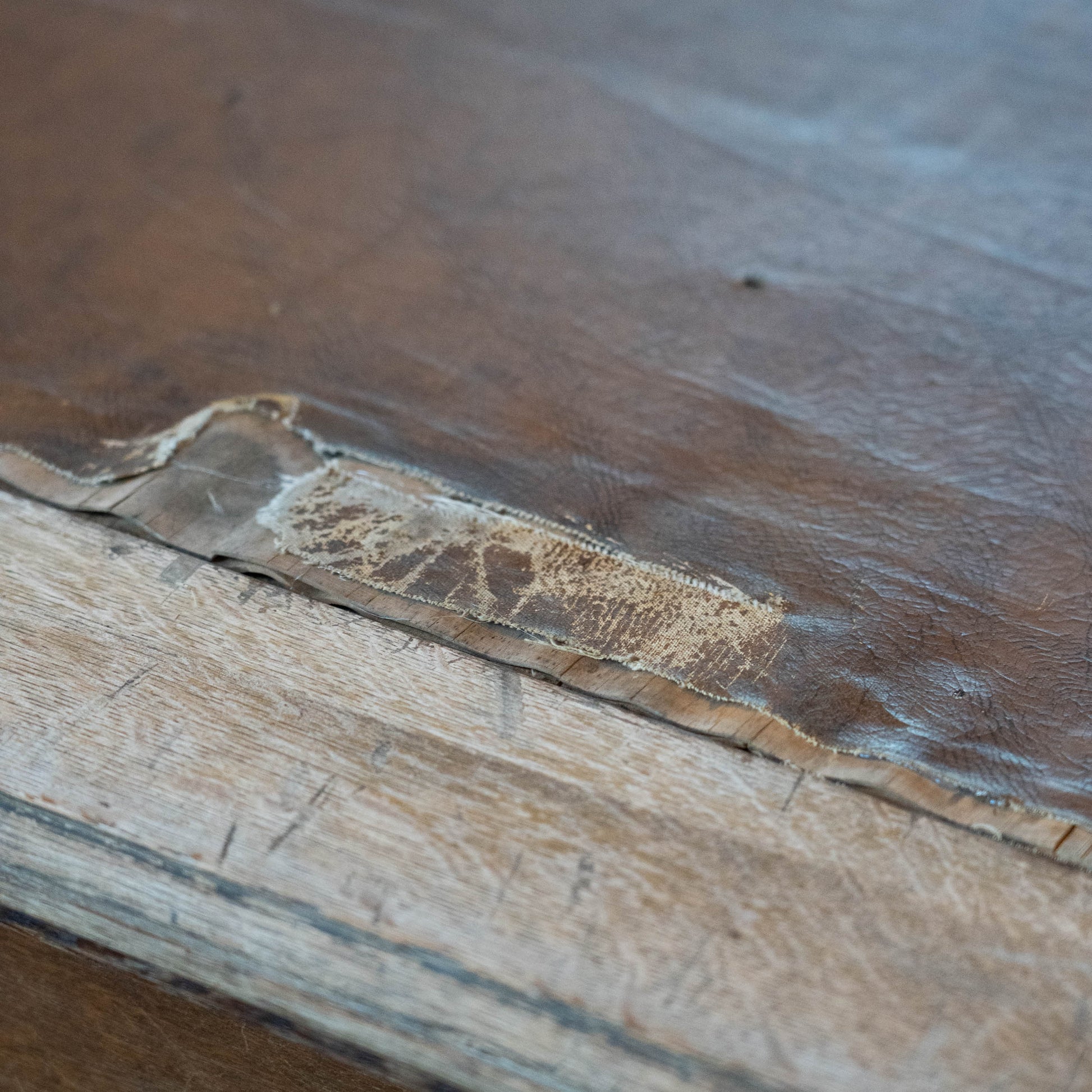 A large, wide table with carved oak details and a very worn leather top. This table offers lots of possibilities. We can remove leather and add wood or put a glass top over the leather. Great dining table or merchandising.