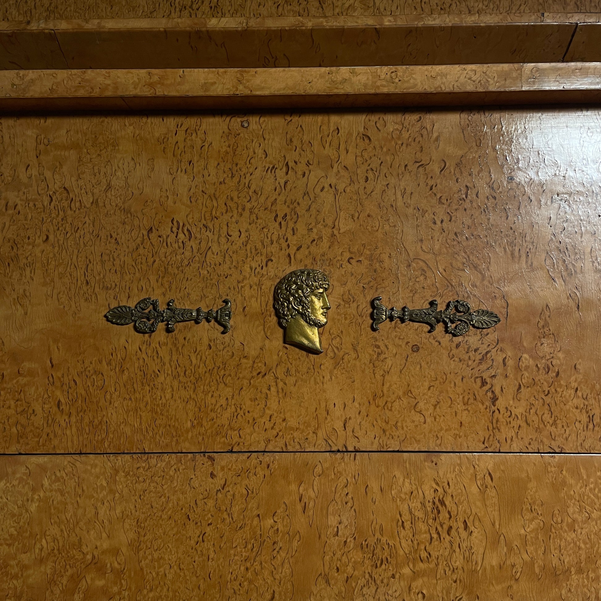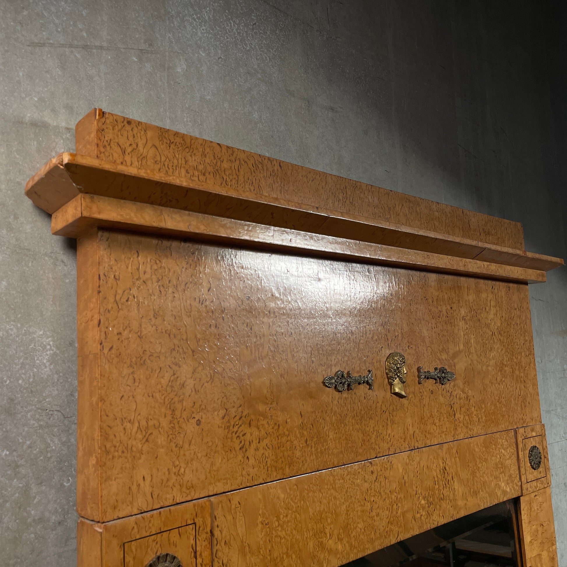 This exceptional French antique, acquired in the 1920s, showcases a strong Empire influence in its design. The quality two-piece structure retains its original beveled mirror, further highlighting its craftsmanship. Sourced from a private collection, this rare find has never been available on the open market.