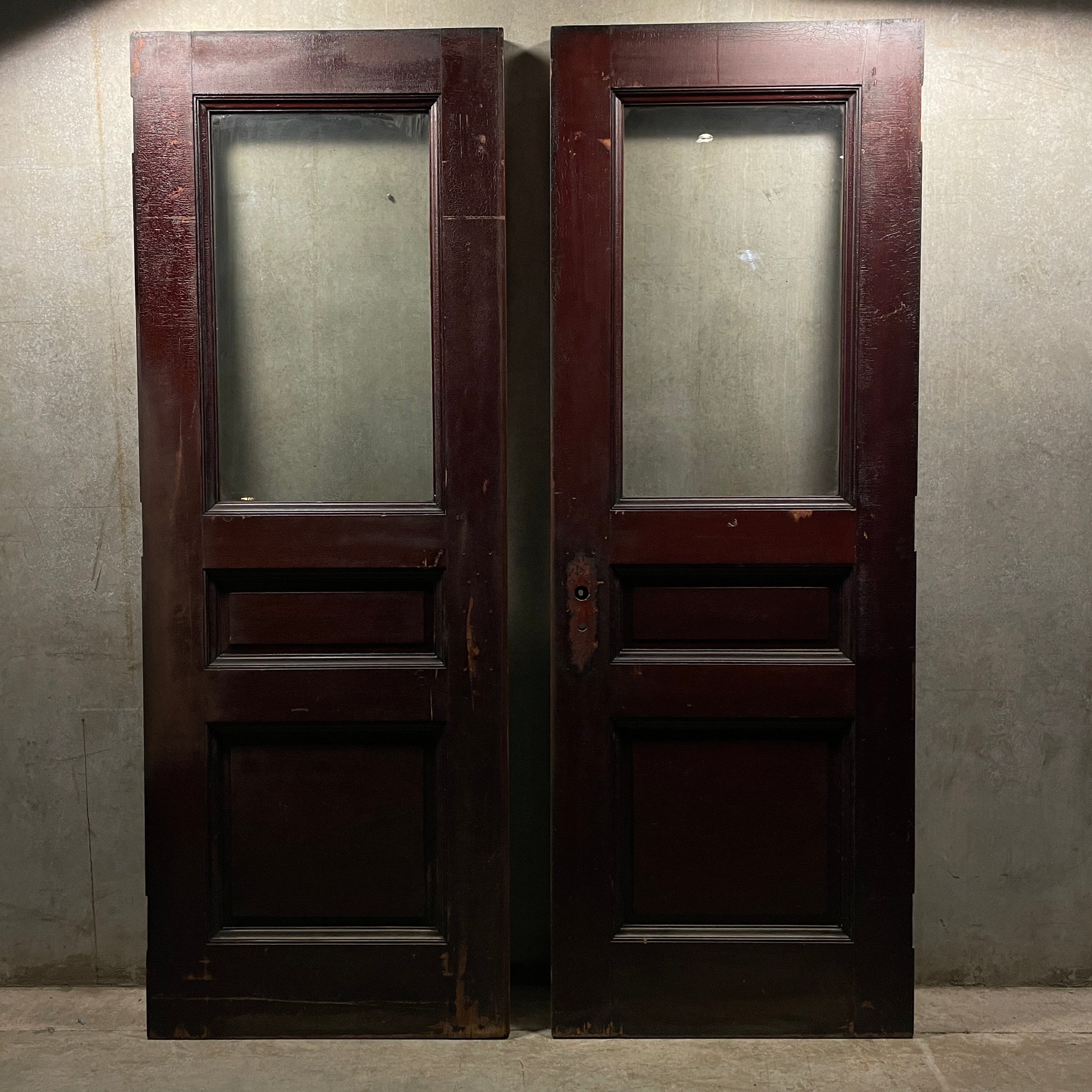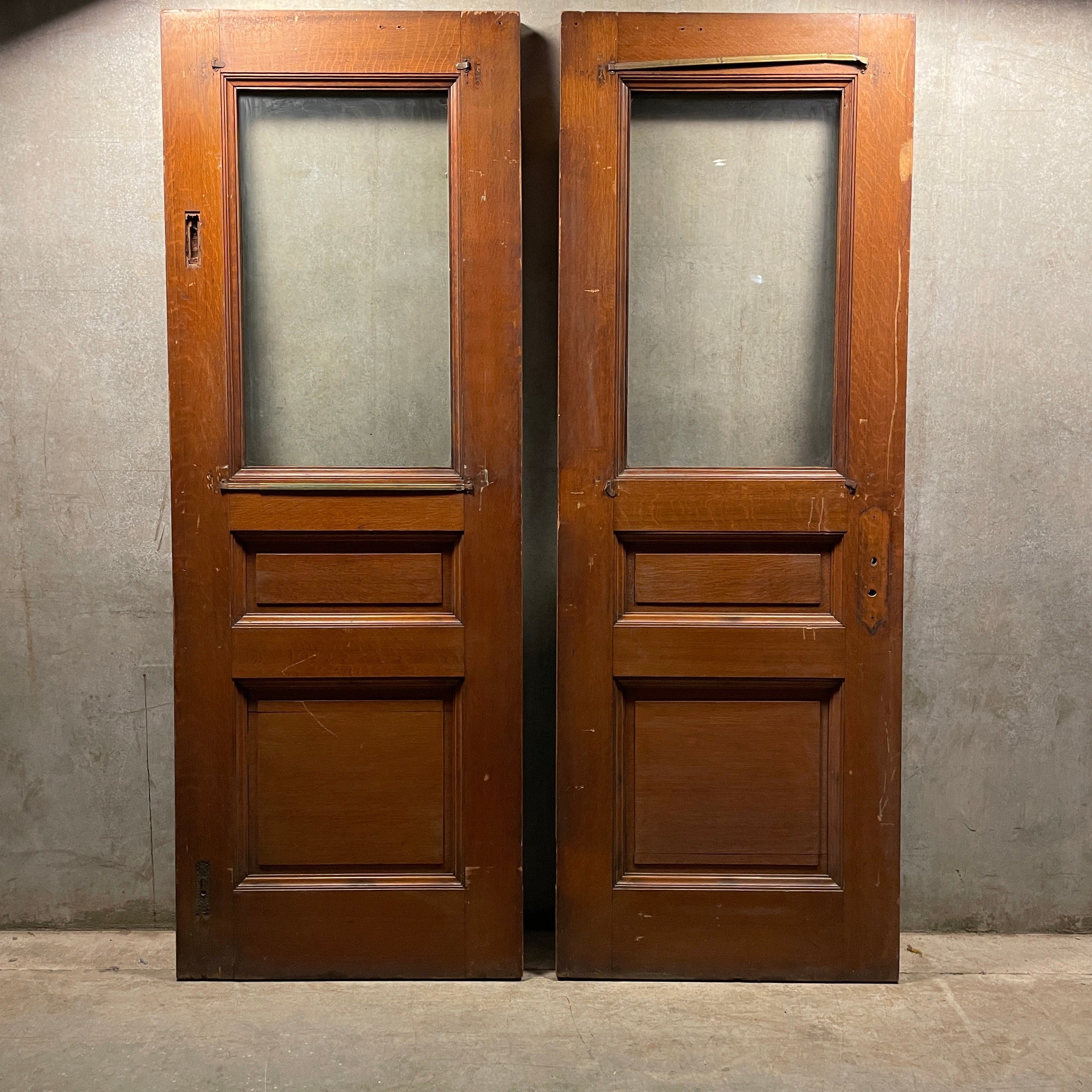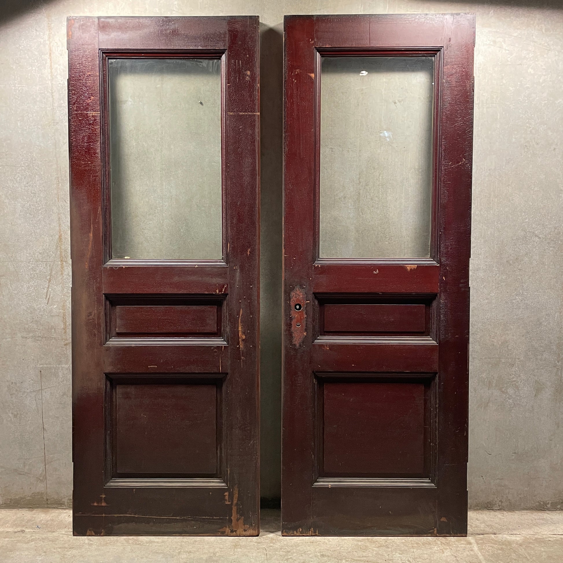 A very nice set of front doors in solid wood, multi panels, with glass. These doors are thick, 2.5- 3 inch material, almost 8 feet tall.